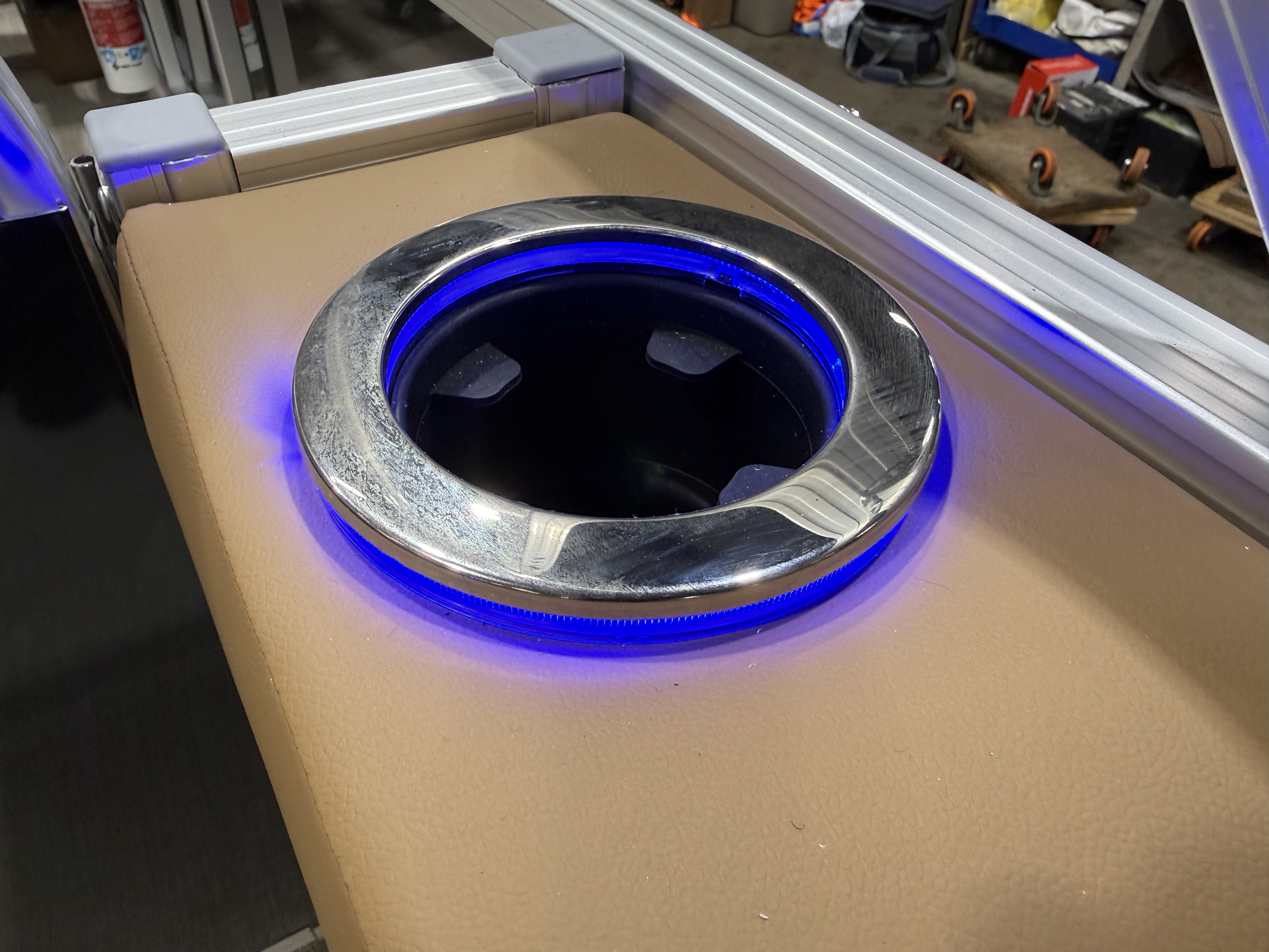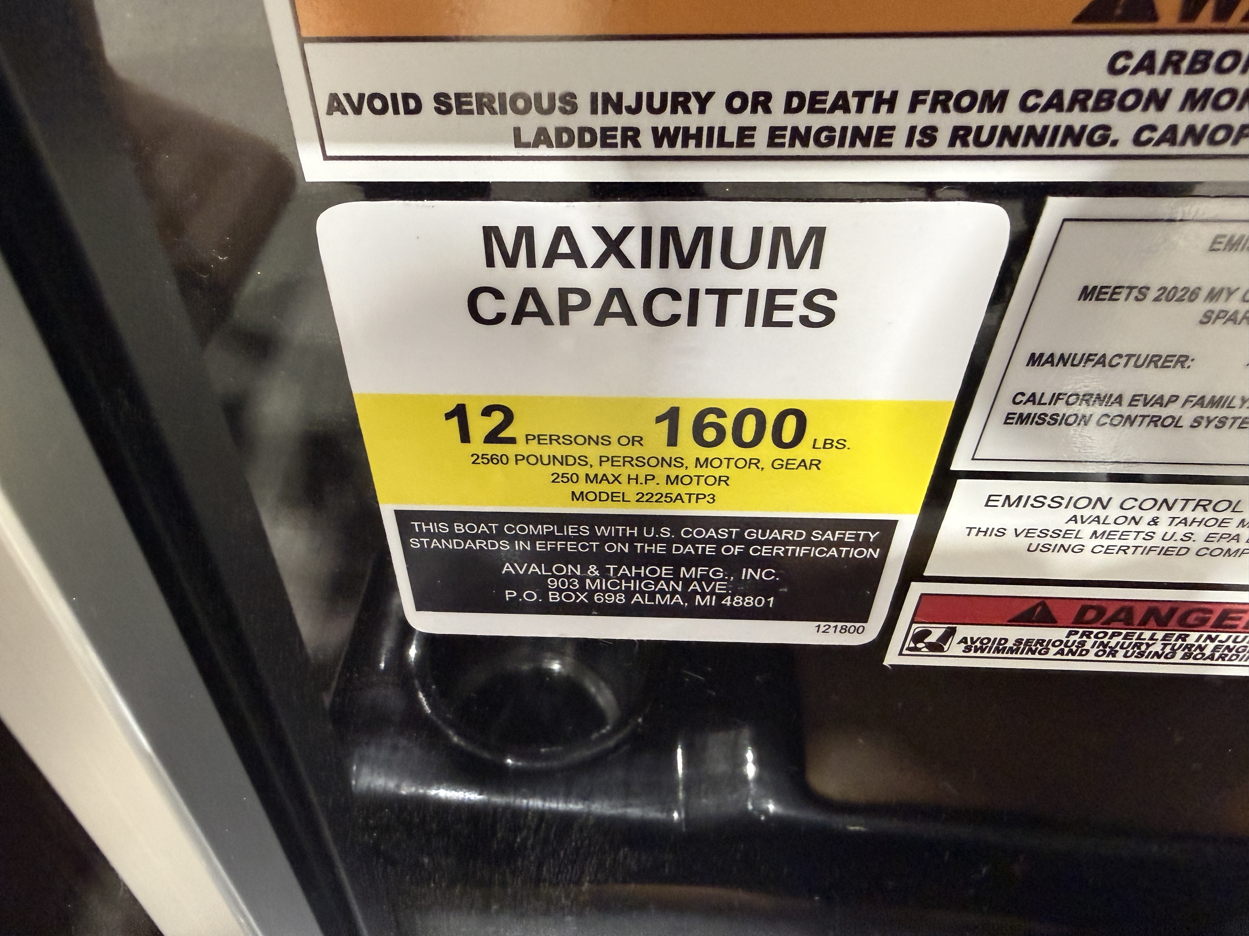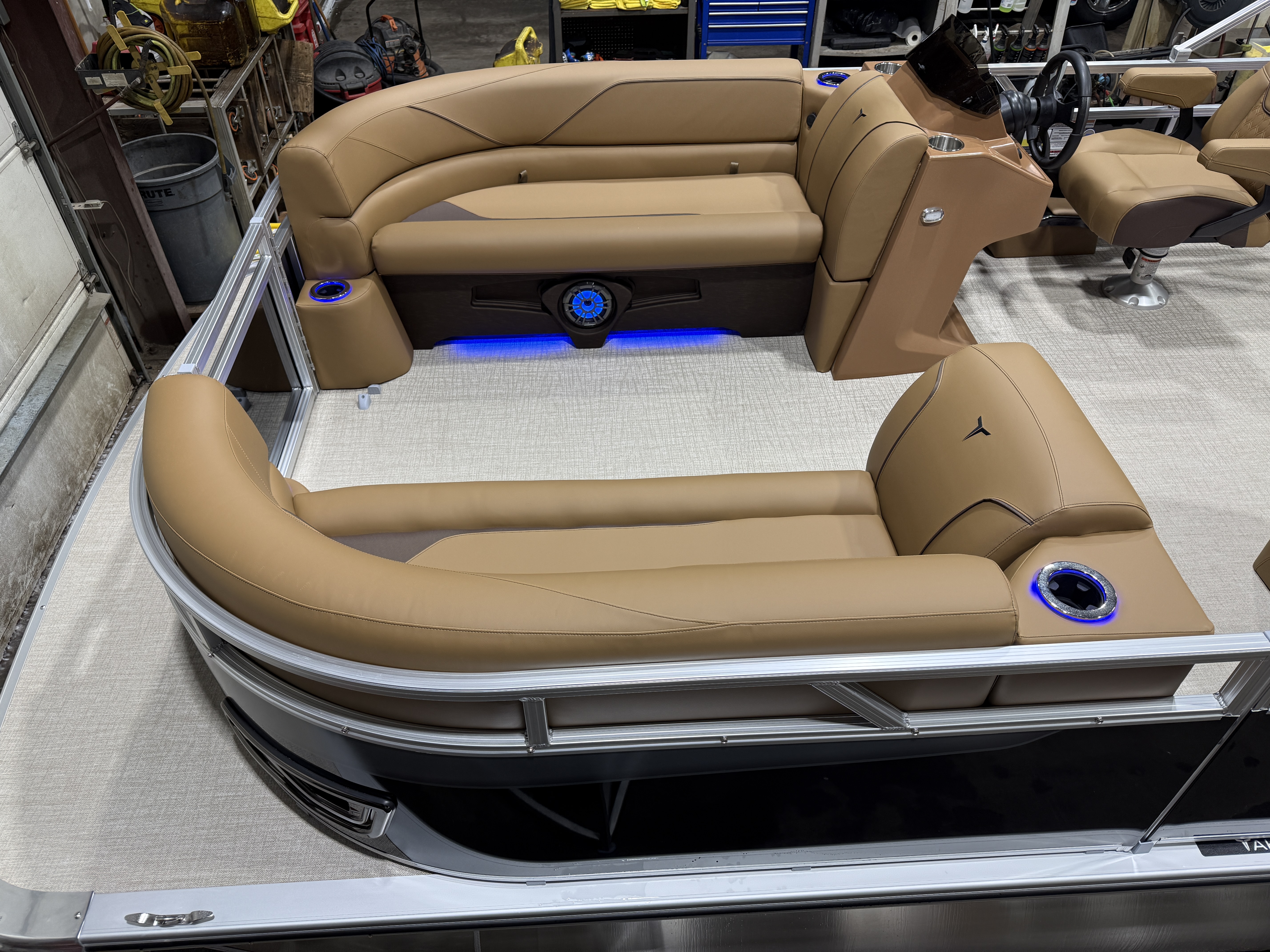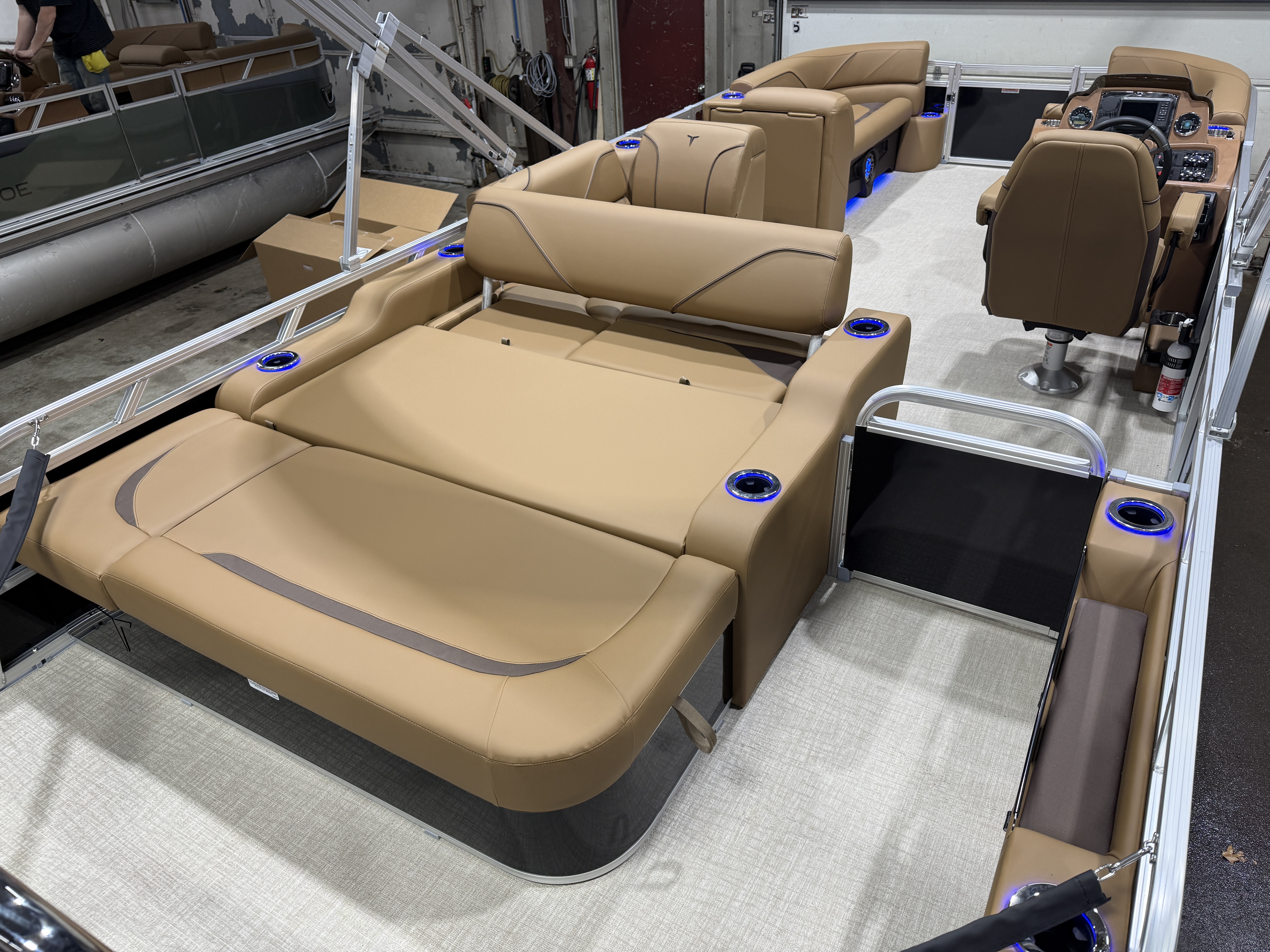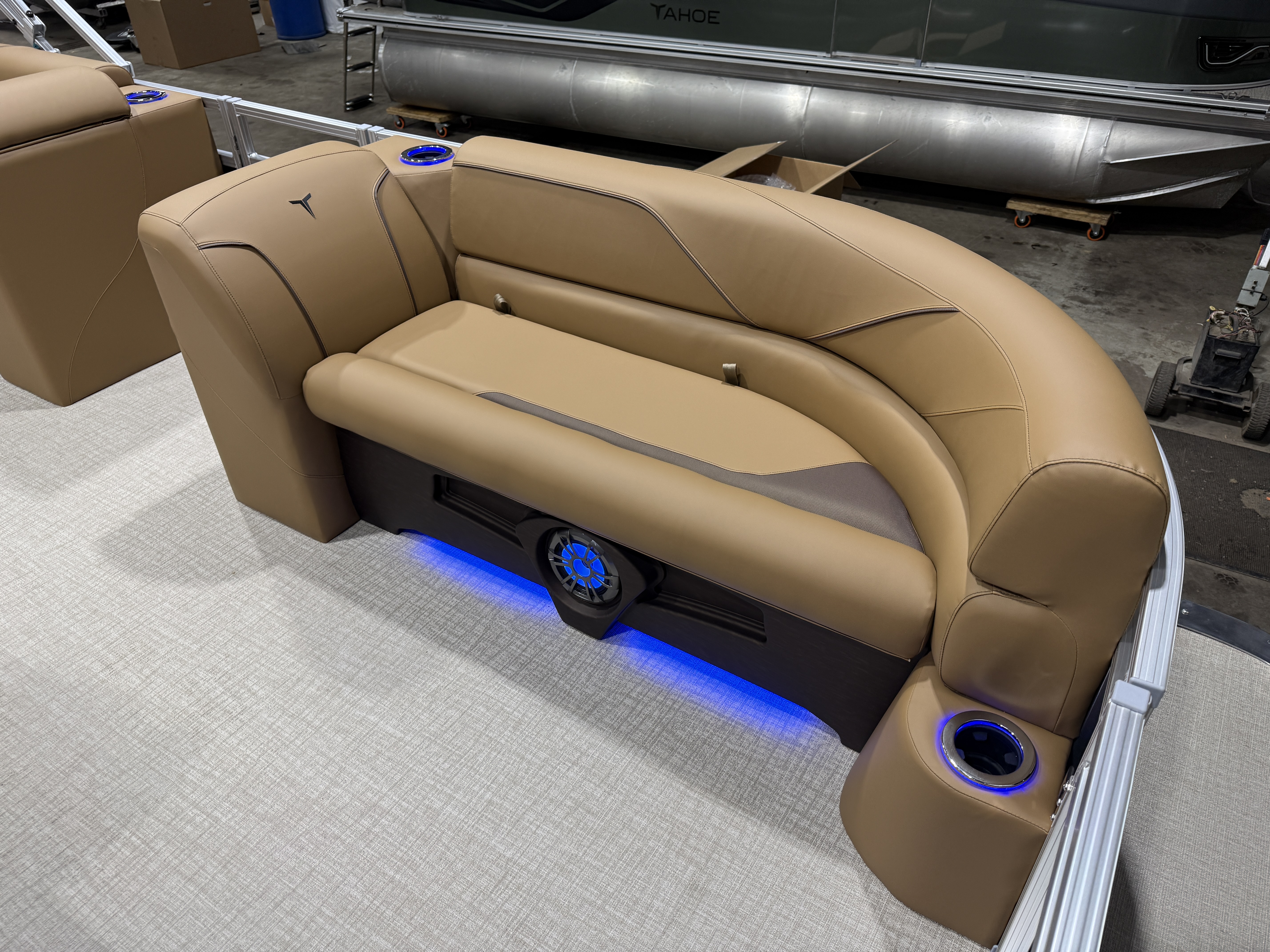 2026 Tahoe Sport 2385 Versatile Rear Bench (VRB) Swingback Tritoon Pontoon & Honda 4-Stroke EFI. This 23' Tri-Toon Platinum Edition Pontoon Has Front Chaise Lounge Seating With Storage, Wrap Around Chaise Lounge Seating With Storage, Seating That Turns Into A Bed Or Rear Facing Bench Seating, Sport Platinum Edition (Commander Reclining Captain's Chair, Garmin 52CV, LED Smoked Chrome Docklights, Polished Corner Caps, Platinum Edition Special Badging), Ski Tow Bar w/Chains, Rear Swim Deck, Riptide Vinyl Flooring, Table, Mooring Cover, Blue Ice Package (Lighted Cup Holders, Speakers & Mood Lighting), Fusion Bluetooth Radio, Multiple Cup Holders, 25" Tubes,10' Bimini Top, Gated Aft, Cognac Interior Vinyl Package, Bow & Aft USB Charging Ports, Sport Performance Package, Built-In 38 Gallon Gas Tank, Hydraulic Steering, Lifting Strakes, Aluminum Undersheeting, Ladder, On/Off Battery Switch, Built-In Trash Can, Side Storage Behind Captain's Seat, Front Deck. Rated For 12 People.