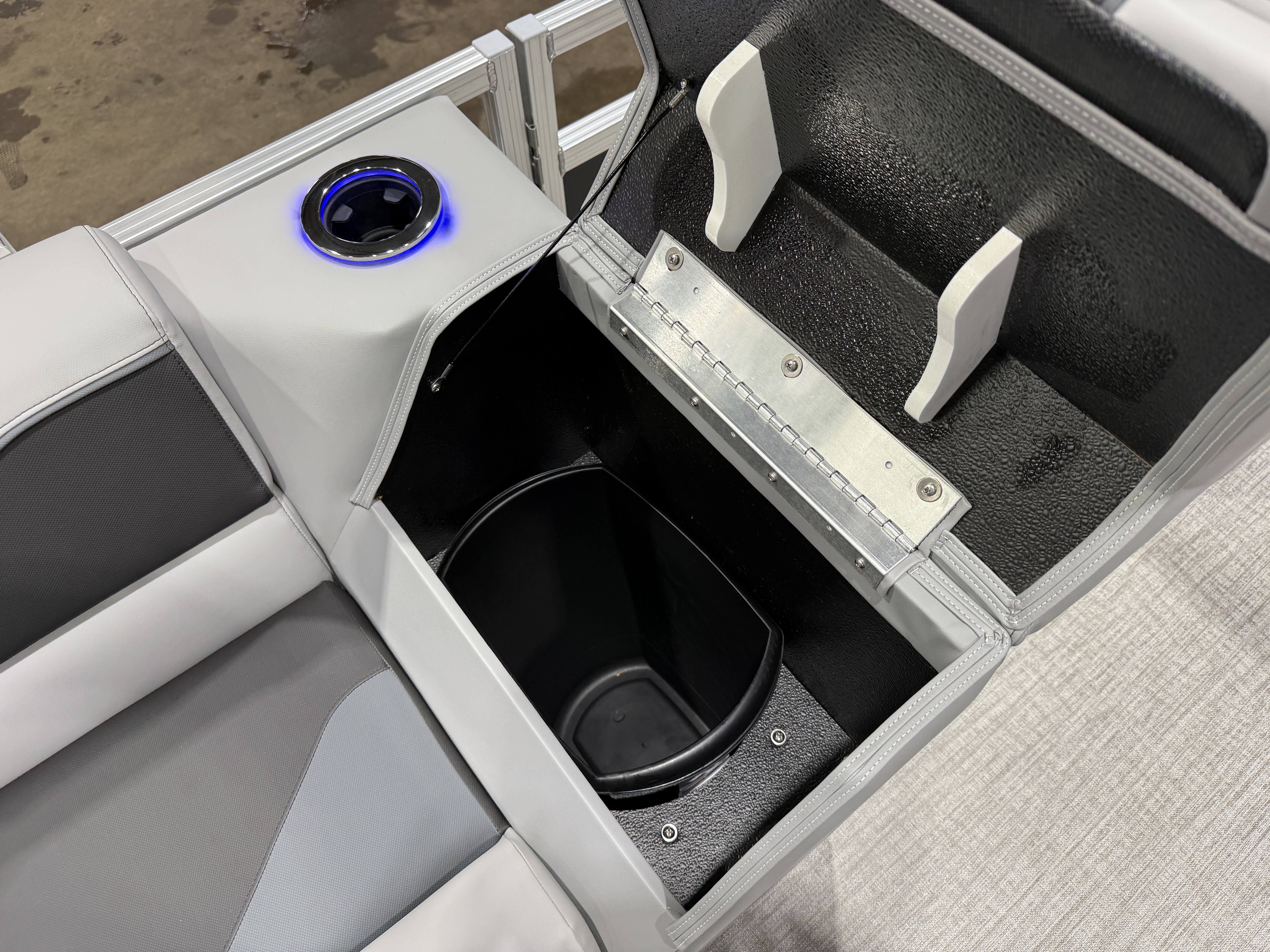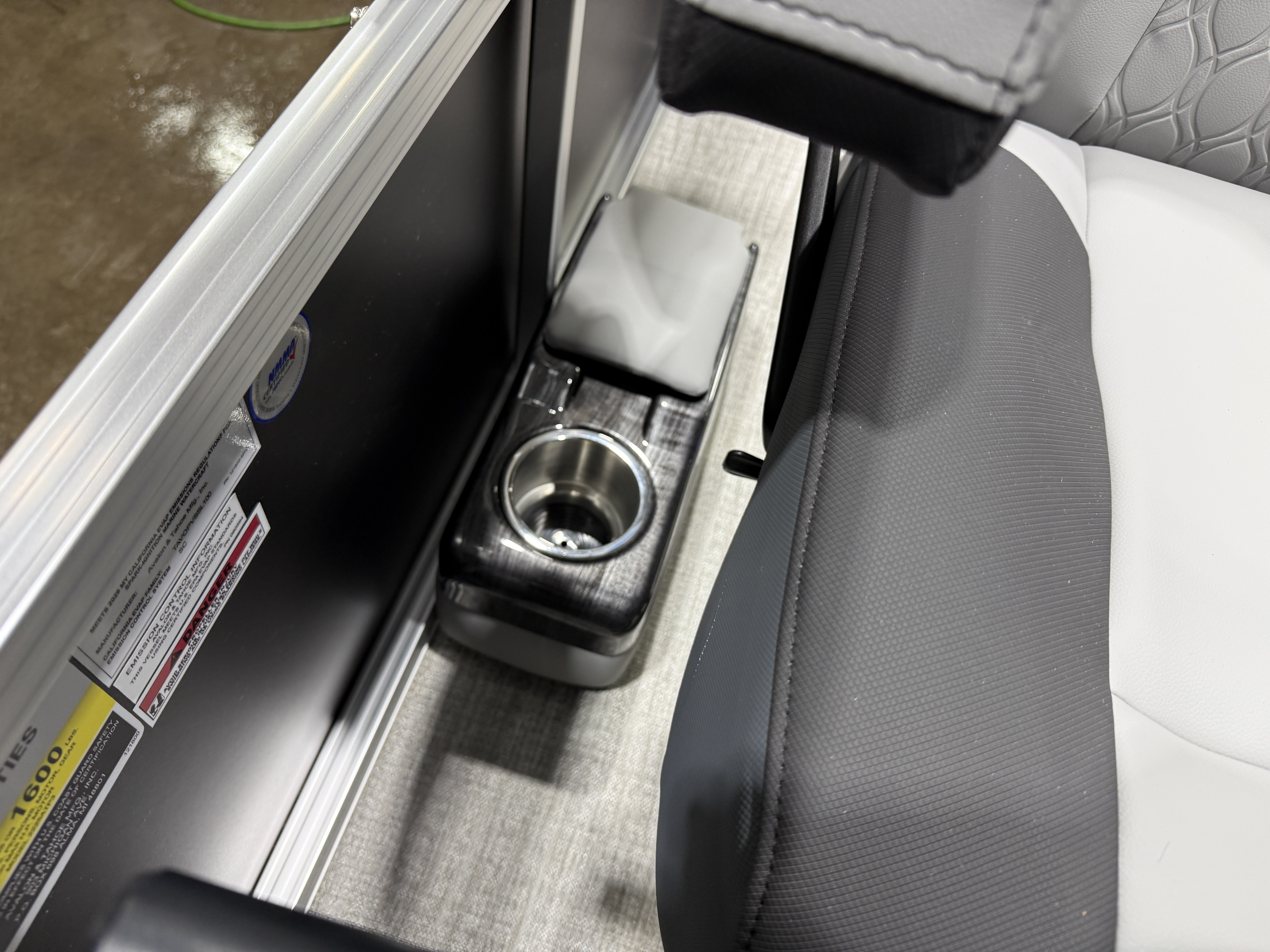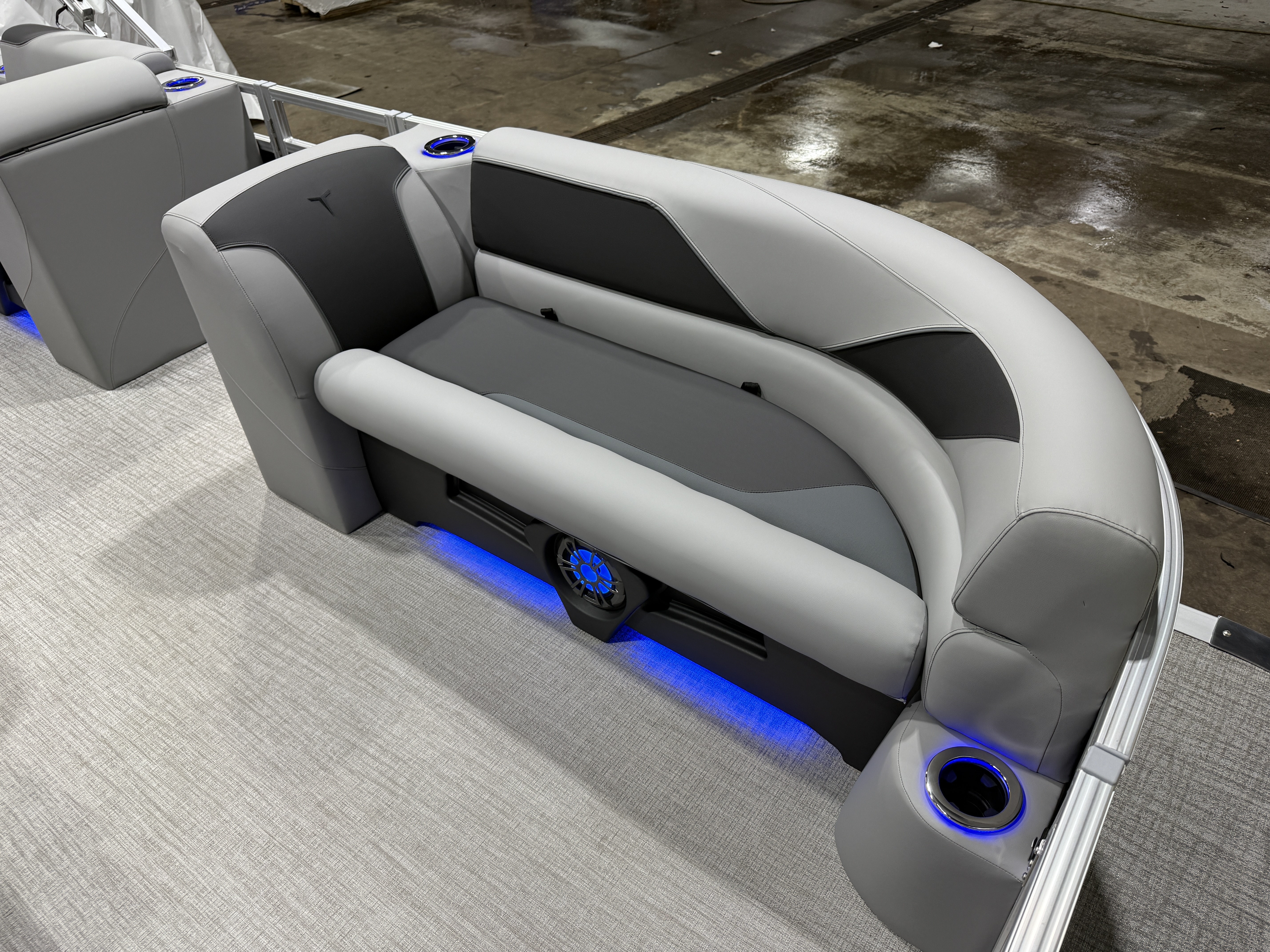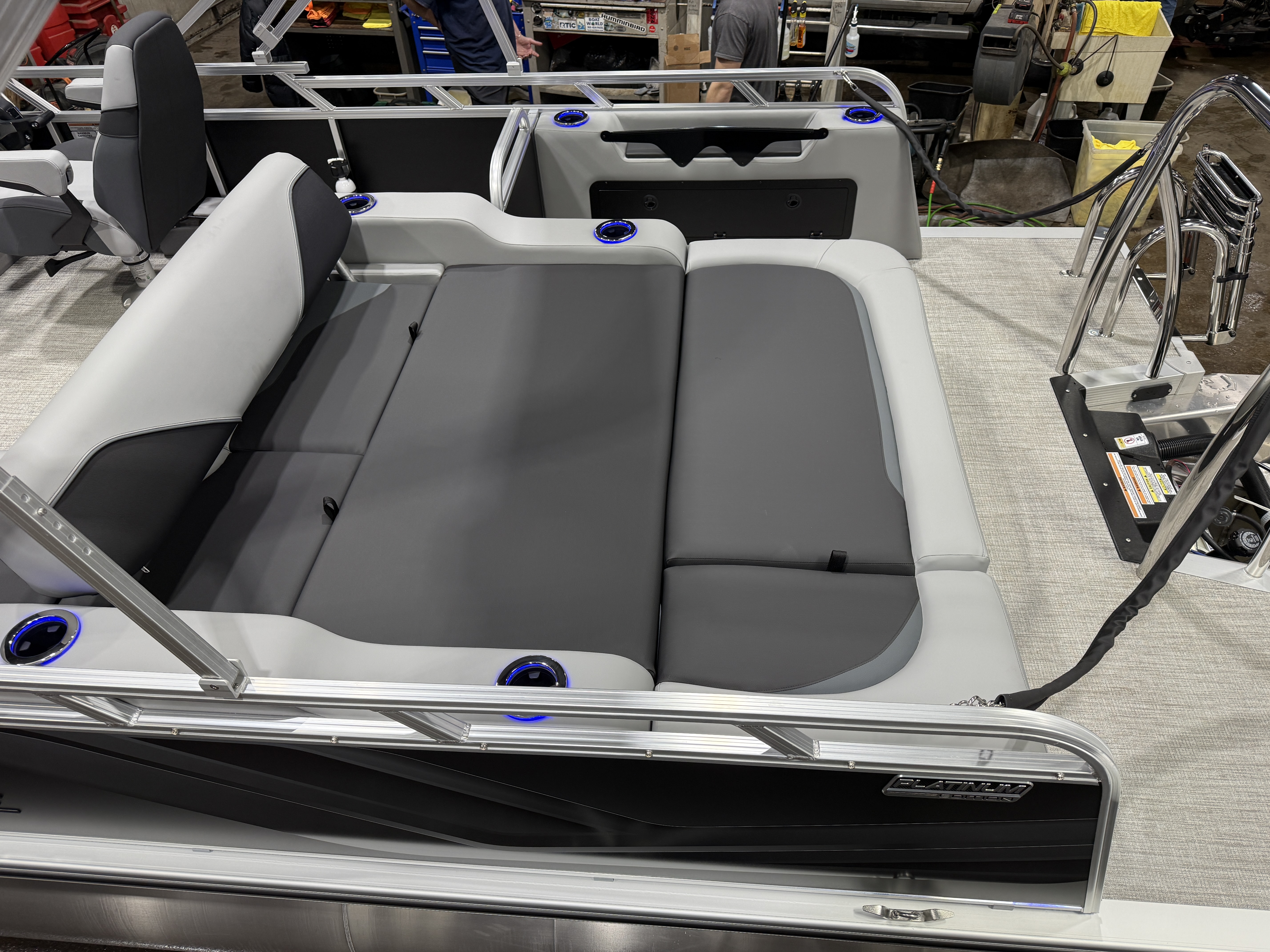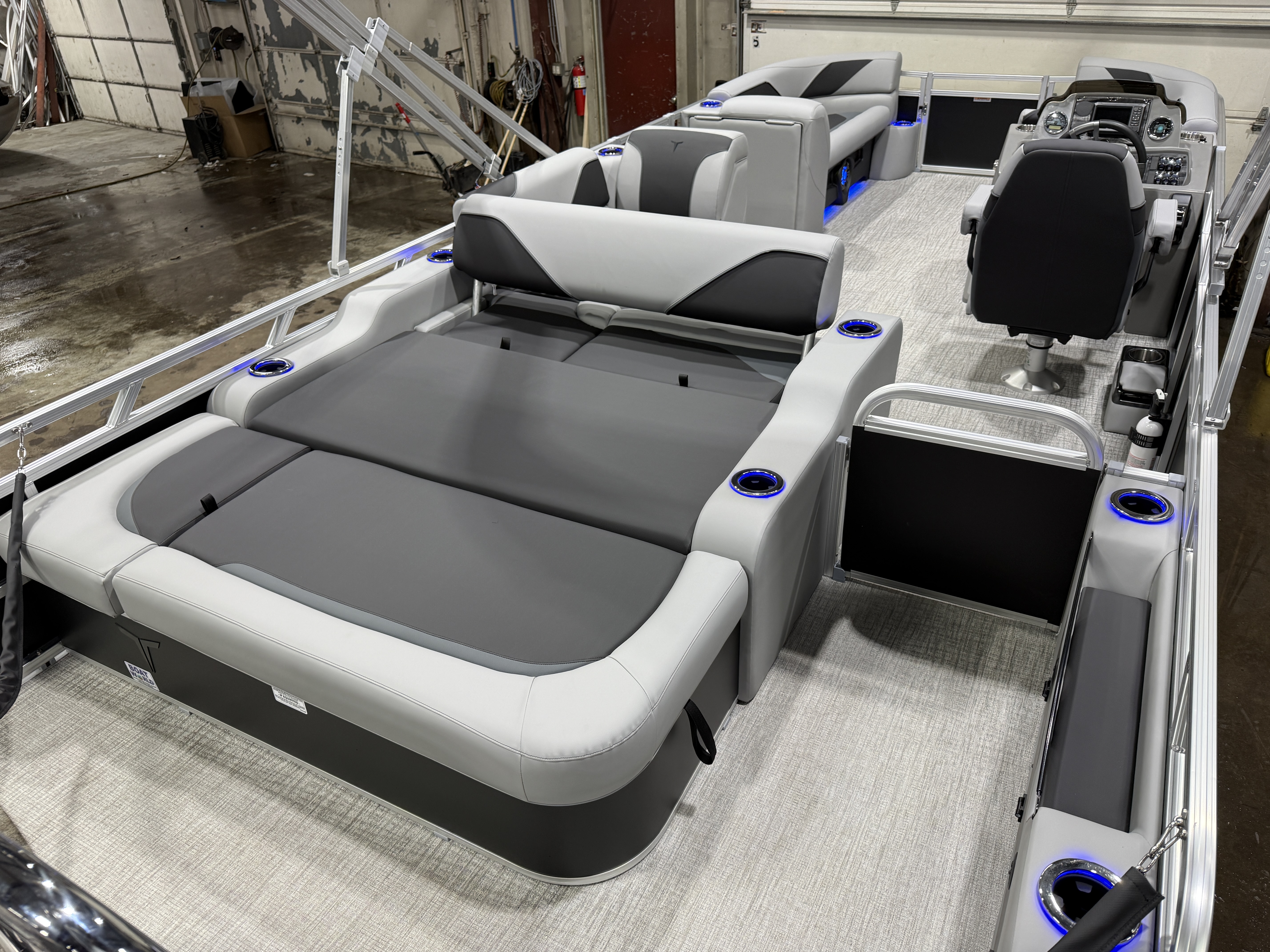 2026 Tahoe Sport 2385 Versatile Rear Bench (VRB) Swingback Tritoon Pontoon & Honda 4-Stroke EFI. This 23' Tri-Toon Platinum Edition Pontoon Has Front Chaise Lounge Seating With Storage, Wrap Around Chaise Lounge Seating With Storage, Seating That Turns Into A Bed Or Rear Facing Bench Seating, Sport Platinum Edition (Commander Reclining Captain's Chair, Garmin 52CV, LED Smoked Chrome Docklights, Polished Corner Caps, Platinum Edition Special Badging), Ski Tow Bar w/Chains, Rear Swim Deck, Riptide Vinyl Flooring, Table, Mooring Cover, Blue Ice Package (Lighted Cup Holders, Speakers & Mood Lighting), Fusion Bluetooth Radio, Multiple Cup Holders, 25" Tubes,10' Bimini Top, Gated Aft, Graphite Interior Package w/Kool Fab Black & Charcoal Accent, Bow & Aft USB Charging Ports, Sport Performance Package, Built-In 38 Gallon Gas Tank, Hydraulic Steering, Lifting Strakes, Aluminum Undersheeting, Ladder, On/Off Battery Switch, Built-In Trash Can, Side Storage Behind Captain's Seat, Front Deck. Rated For 12 People.