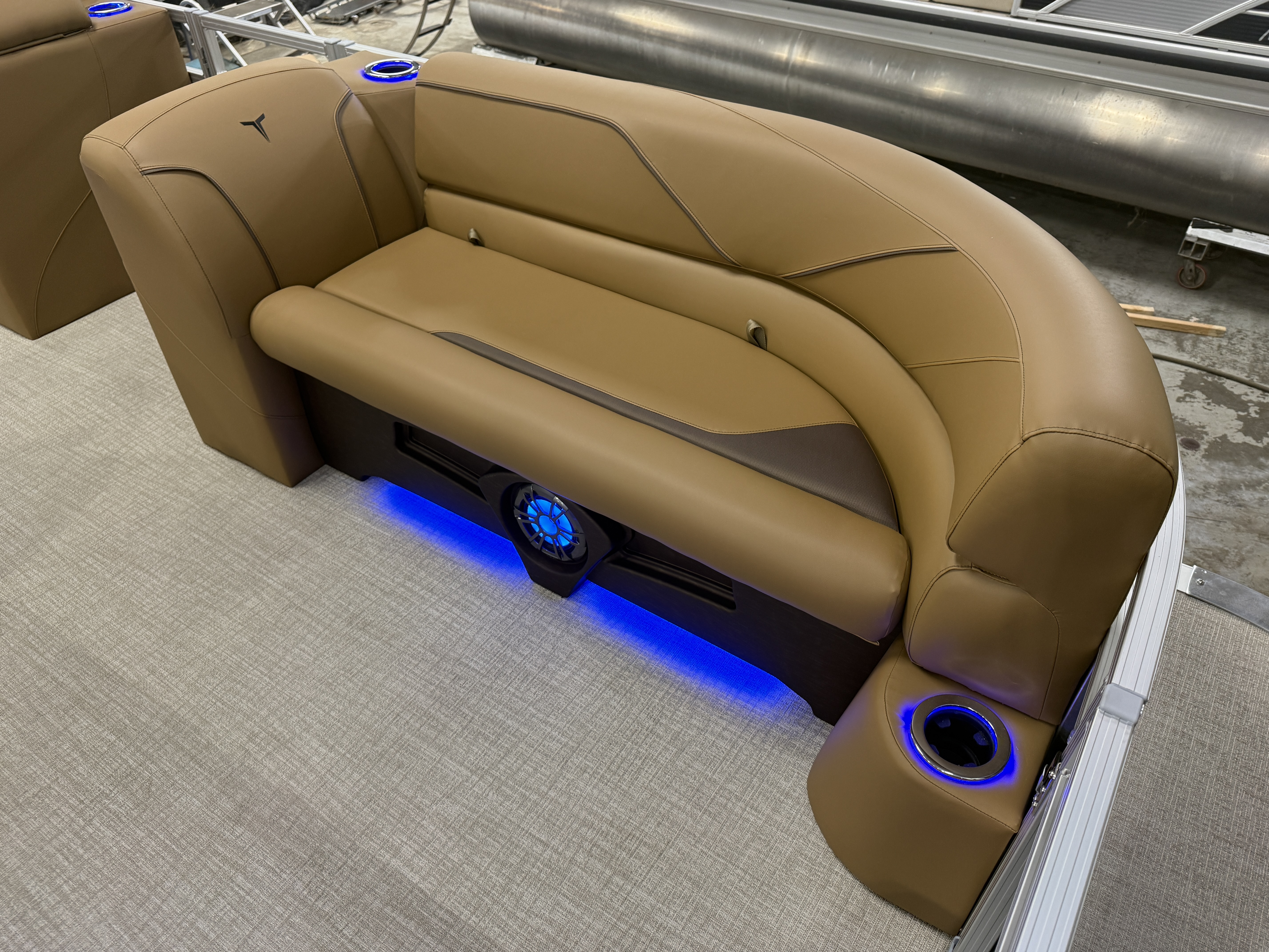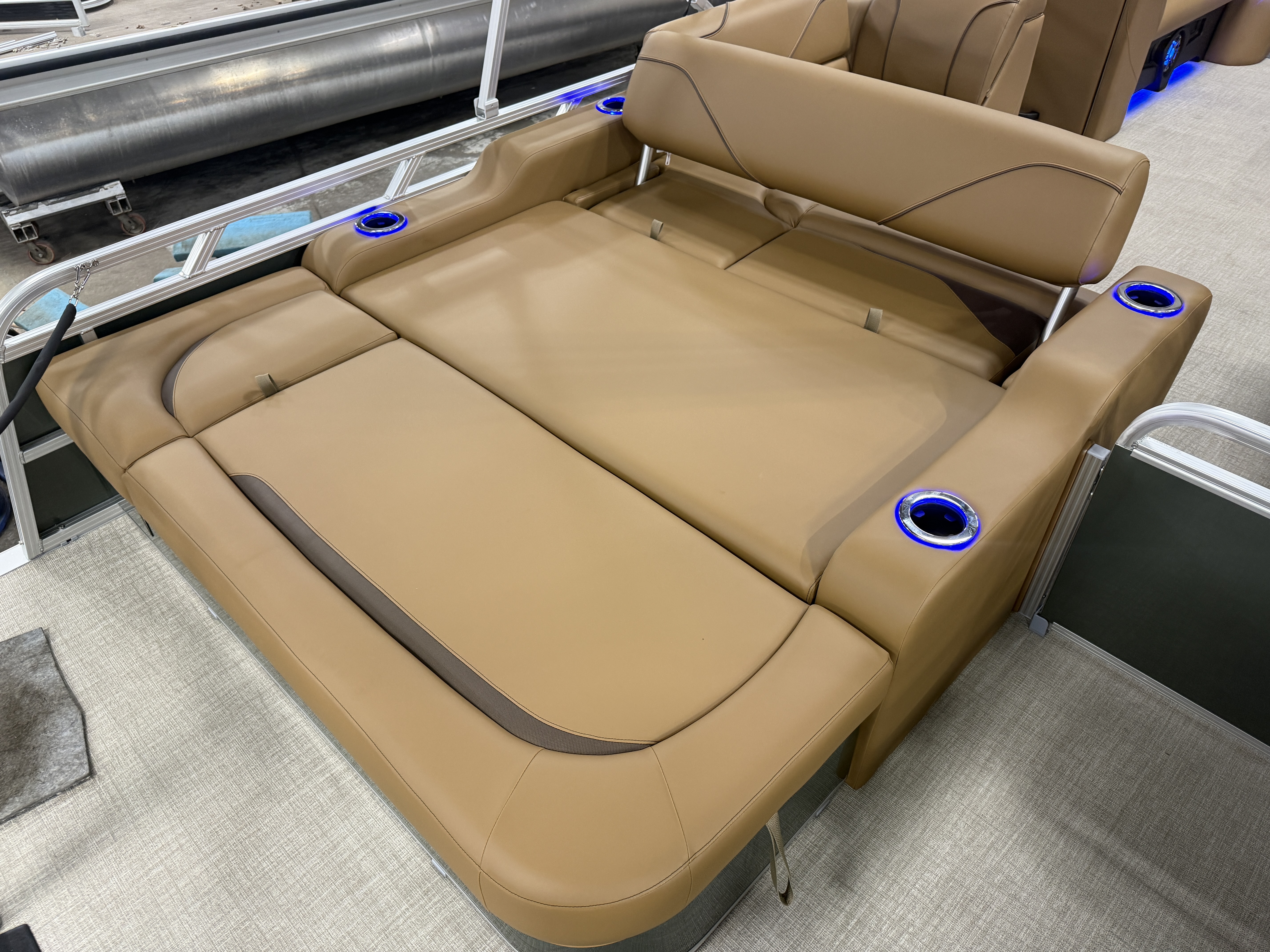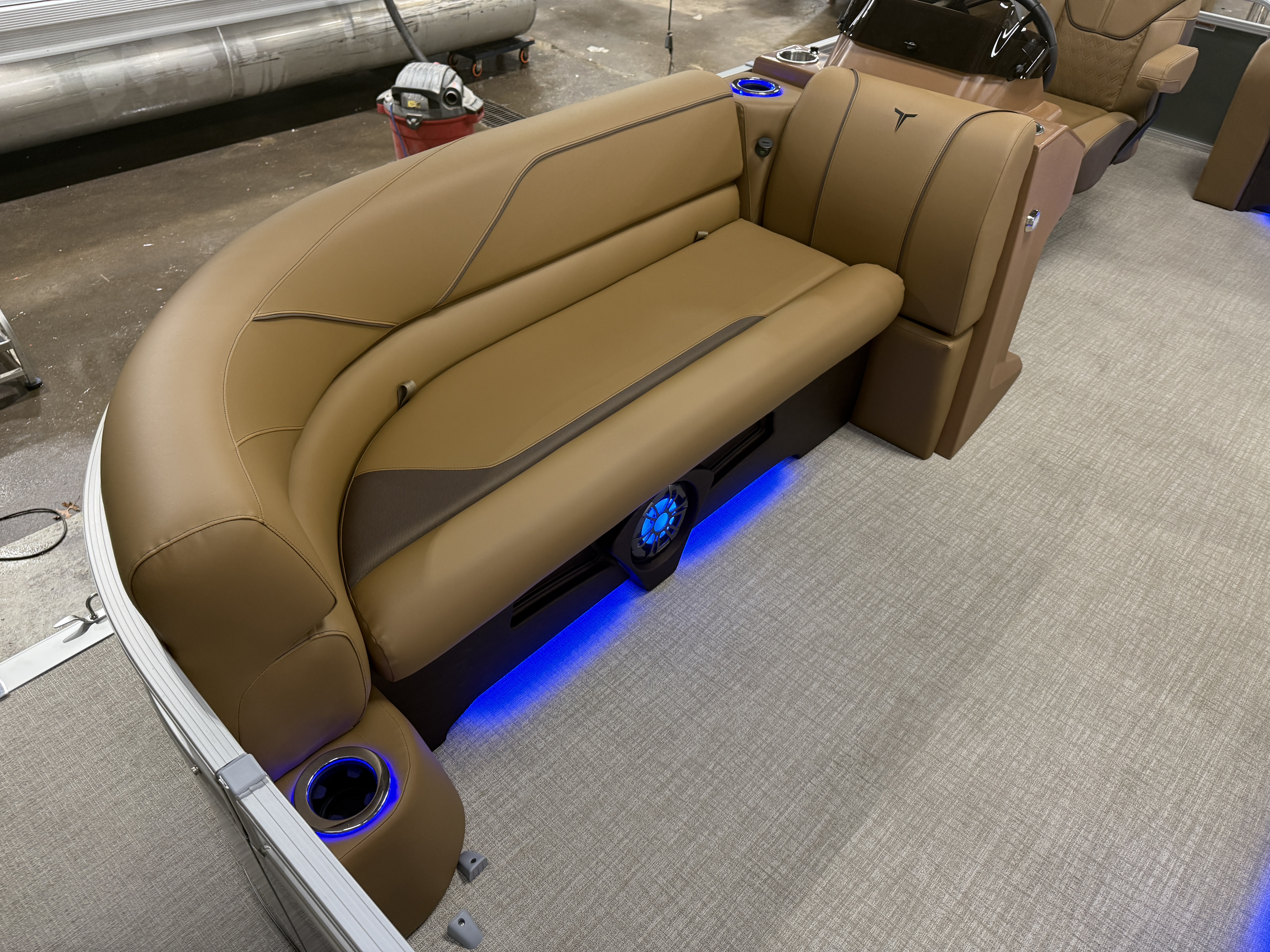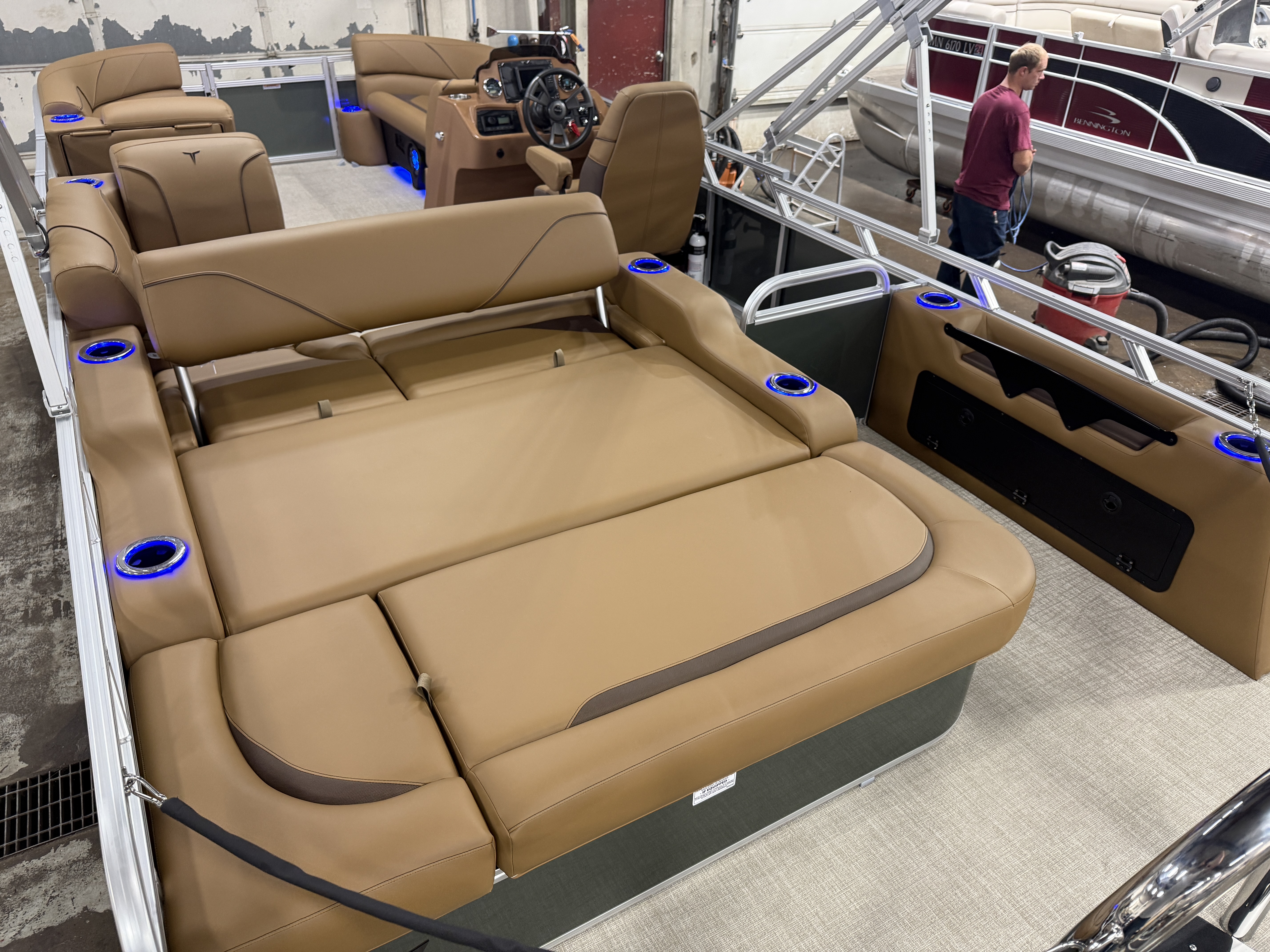 2026 Tahoe Sport 2385 Versatile Rear Bench (VRB) Swingback Tritoon Pontoon & Honda 200HP 4-Stroke EFI. This Tri-Toon Platinum Edition Pontoon Has Front Chaise Lounge Seating With Storage, Wrap Around Chaise Lounge Seating With Storage, Seating That Turns Into A Bed Or Rear Facing Bench Seating, Sport Platinum Edition (Commander Reclining Captain's Chair, Garmin 52CV, LED Smoked Chrome Docklights, Polished Corner Caps, Platinum Edition Special Badging), Ski Tow Bar w/Chains, Rear Swim Deck, Riptide Vinyl Flooring, Table, Mooring Cover, Blue Ice Package (Lighted Cup Holders, Speakers & Mood Lighting), Fusion Bluetooth Radio, Multiple Cup Holders, 25" Tubes,10' Bimini Top, Gated Aft, Cognac Interior Package, Bow & Aft USB Charging Ports, Sport Performance Package, Built-In 38 Gallon Gas Tank, Hydraulic Steering, Lifting Strakes, Aluminum Undersheeting, Ladder, On/Off Battery Switch, Built-In Trash Can, Side Storage Behind Captain's Seat, Front Deck. Rated For 12 People.