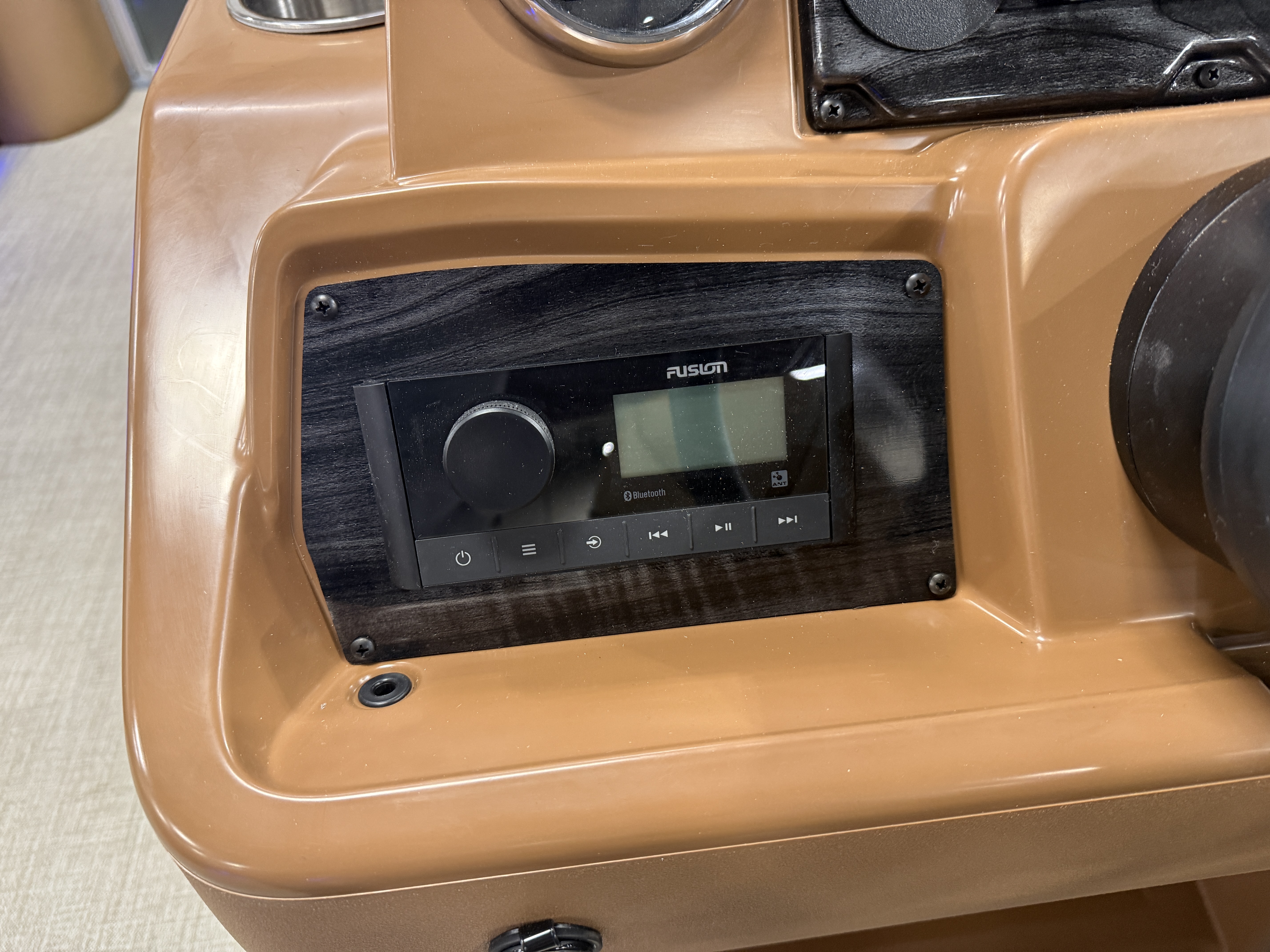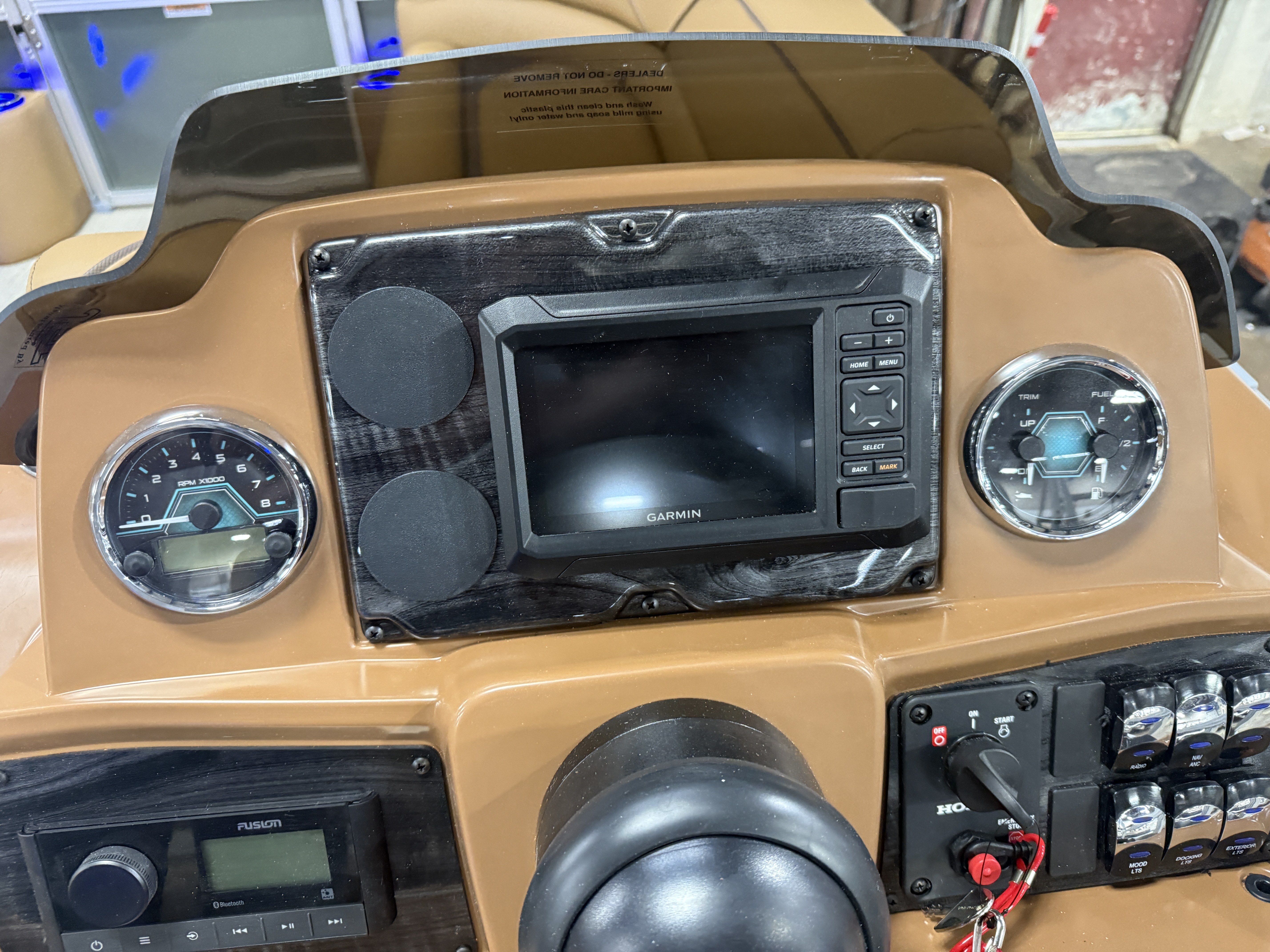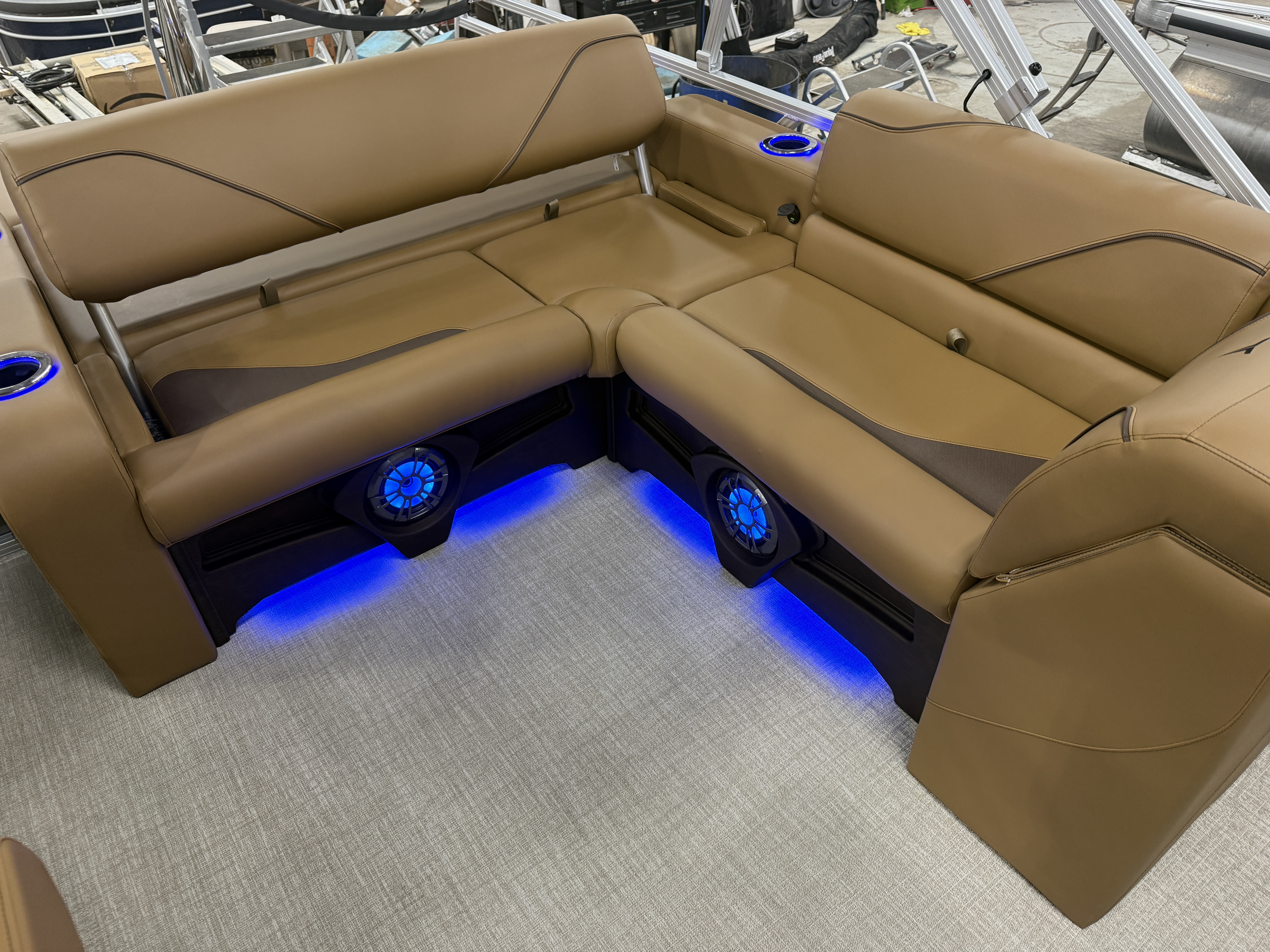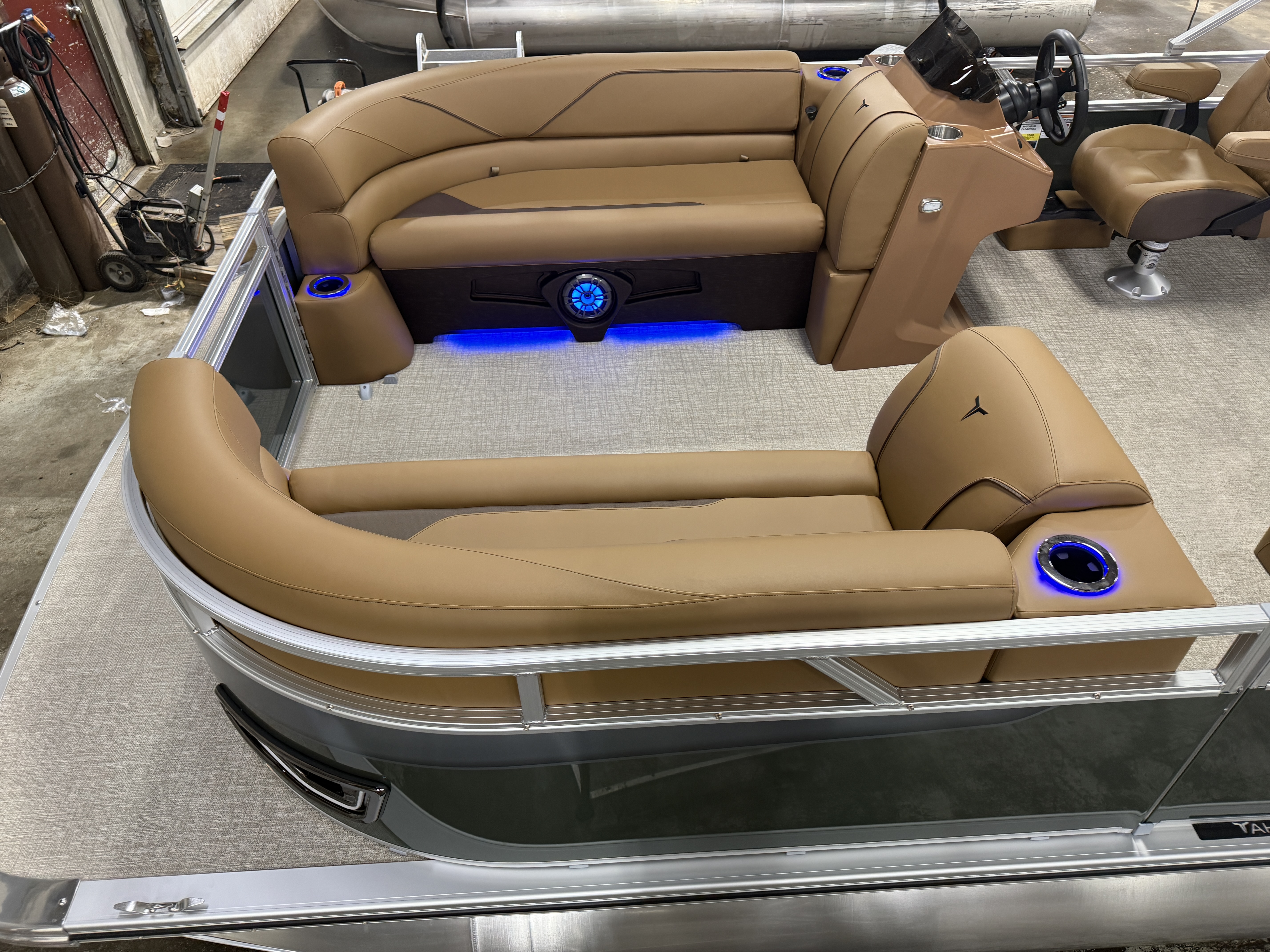 2026 Tahoe Sport 2385 Versatile Rear Bench (VRB) Swingback Tritoon Pontoon & Honda 200HP 4-Stroke EFI. This Tri-Toon Platinum Edition Pontoon Has Front Chaise Lounge Seating With Storage, Wrap Around Chaise Lounge Seating With Storage, Seating That Turns Into A Bed Or Rear Facing Bench Seating, Sport Platinum Edition (Commander Reclining Captain's Chair, Garmin 52CV, LED Smoked Chrome Docklights, Polished Corner Caps, Platinum Edition Special Badging), Ski Tow Bar w/Chains, Rear Swim Deck, Riptide Vinyl Flooring, Table, Mooring Cover, Blue Ice Package (Lighted Cup Holders, Speakers & Mood Lighting), Fusion Bluetooth Radio, Multiple Cup Holders, 25" Tubes,10' Bimini Top, Gated Aft, Cognac Interior Package, Bow & Aft USB Charging Ports, Sport Performance Package, Built-In 38 Gallon Gas Tank, Hydraulic Steering, Lifting Strakes, Aluminum Undersheeting, Ladder, On/Off Battery Switch, Built-In Trash Can, Side Storage Behind Captain's Seat, Front Deck. Rated For 12 People.