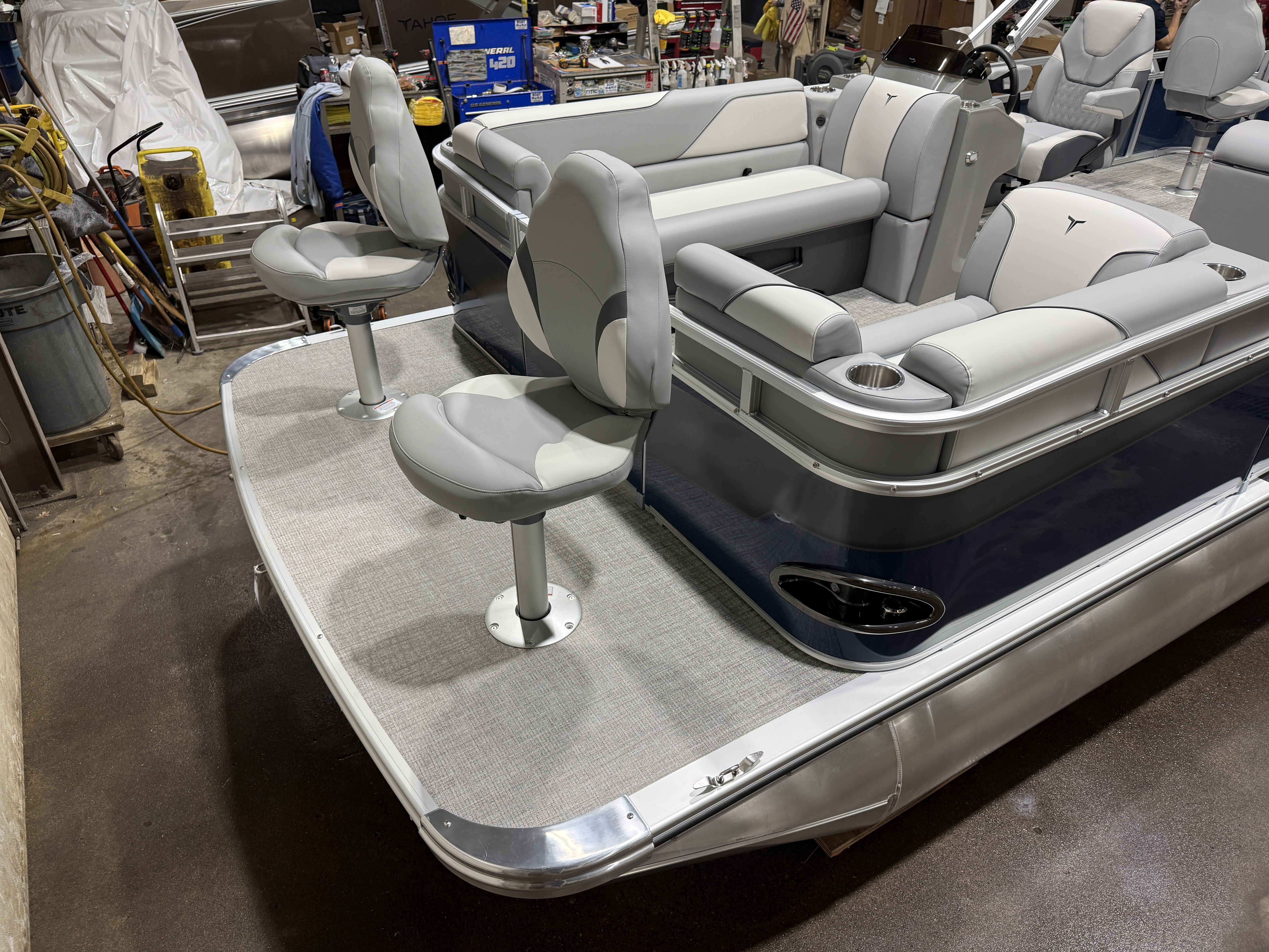 2026 Tahoe Sport 23E80 Fish & Cruise Pontoon & Honda 4-Stroke EFI. This 23' Metallic Blue Walls Fishing Pontoon Has A Front 2FT Bow Deck Extension With Two Fishing Seats & Seat Covers, Front Chaise Lounge Seating With Storage, Wrap Around Chaise Lounge Seating With More Storage, Reclining Commander's Captain's Seat With Slider, Two Rear Fishing Seats, Multiple Cup Holders, Sport Platinum Edition (Garmin 52CV GPS Depth Finder, 90 Degree Smoked Chrome Docklights, Polished Corner Caps, Platinum Edition Special Badging), Graphite Interior Vinyl Package w/Charcoal Accent, Charcoal Seat Cladding, Tilt Steering, Riptide Vinyl Flooring, 25" Tubes, Built In 25 Gas Tank, Trash Can In Lounge Arm, LED Nav Lights, 10' Bimini Top, Bluetooth Radio w/4 Speakers, Rear Live Well, Rod Holders, New Battery, Rear 4 Step Ladder, Rear Deck, Playpen Cover, Greywood Rectangle Table. Rated For 11 People.
