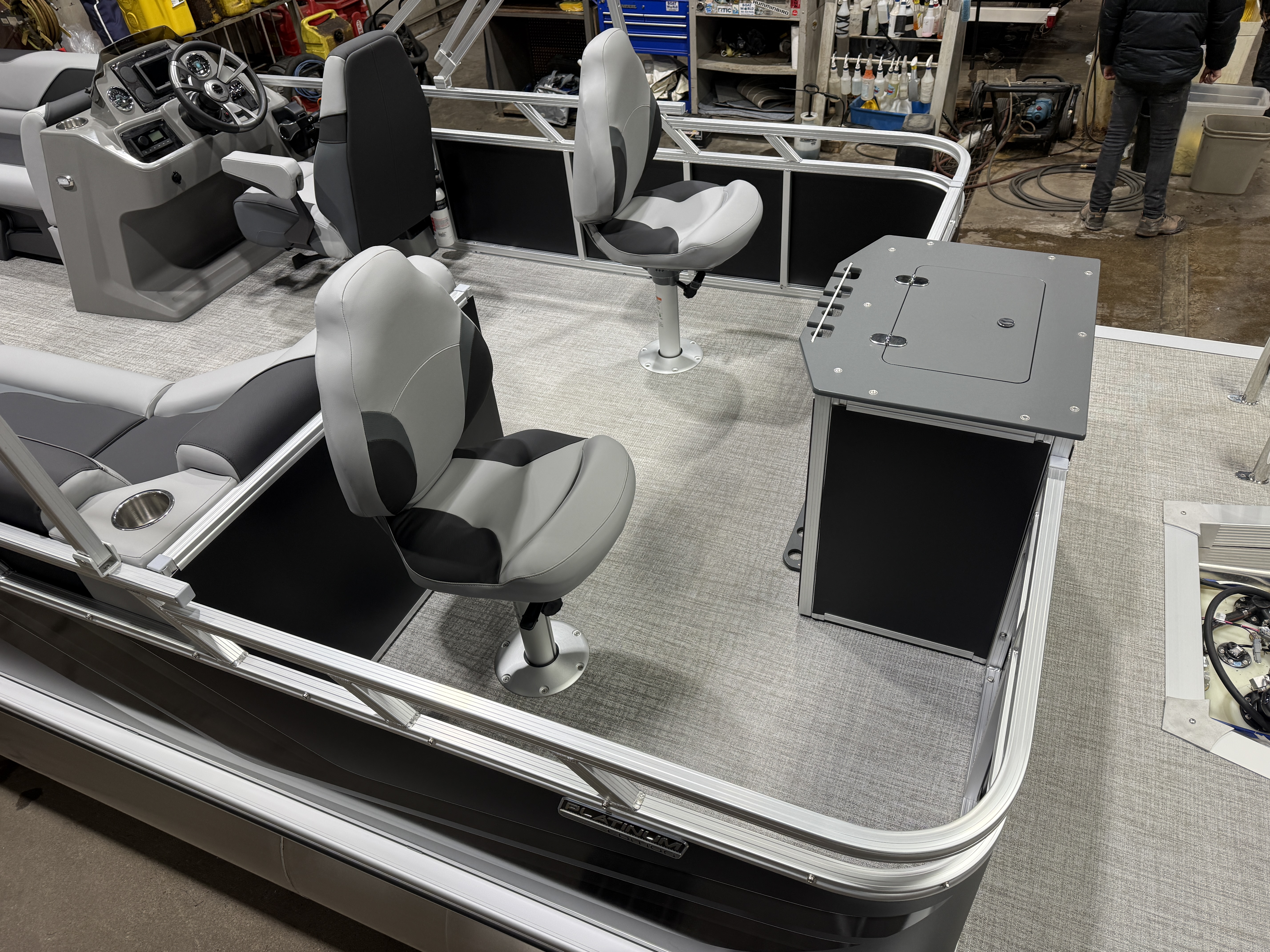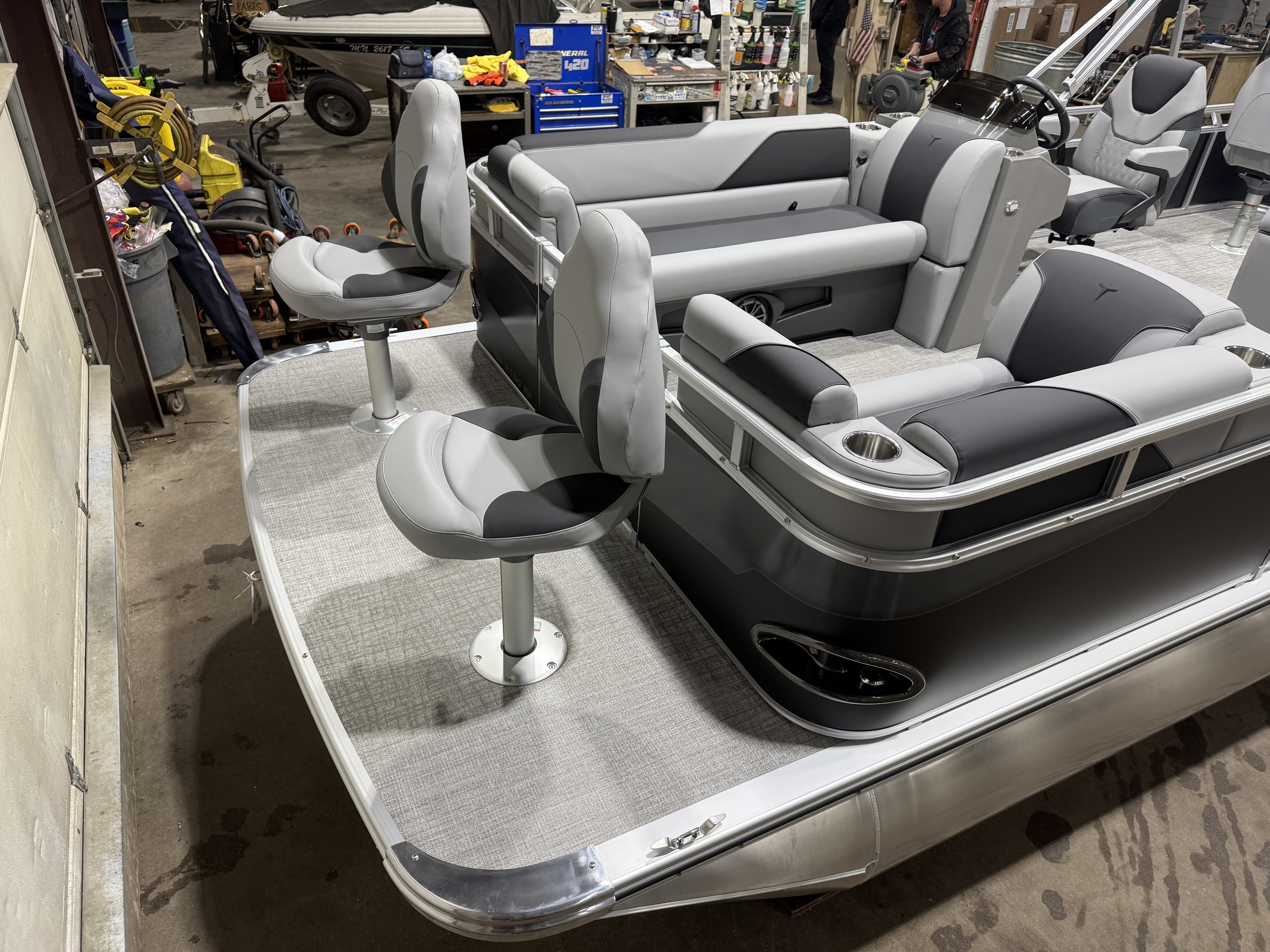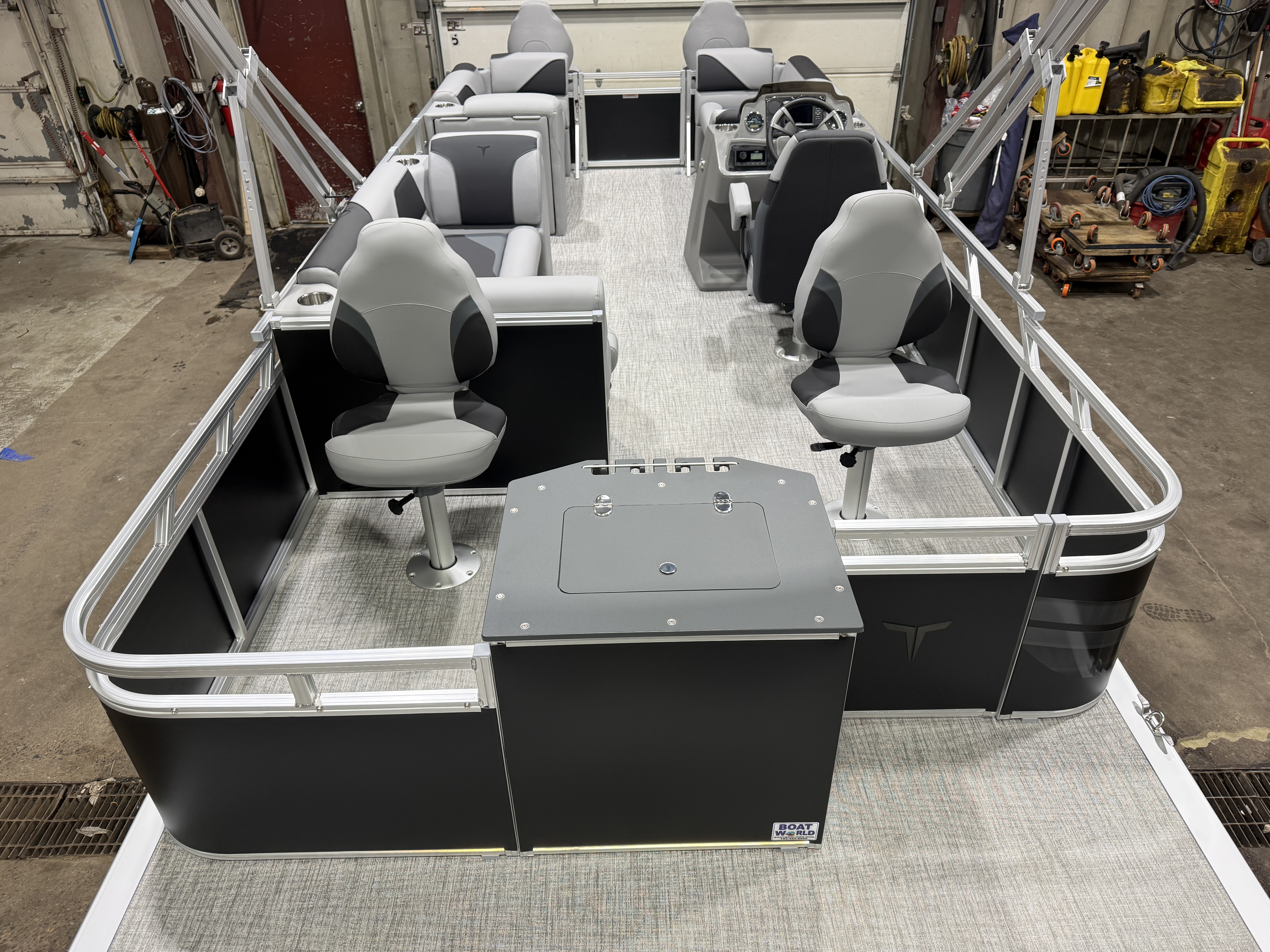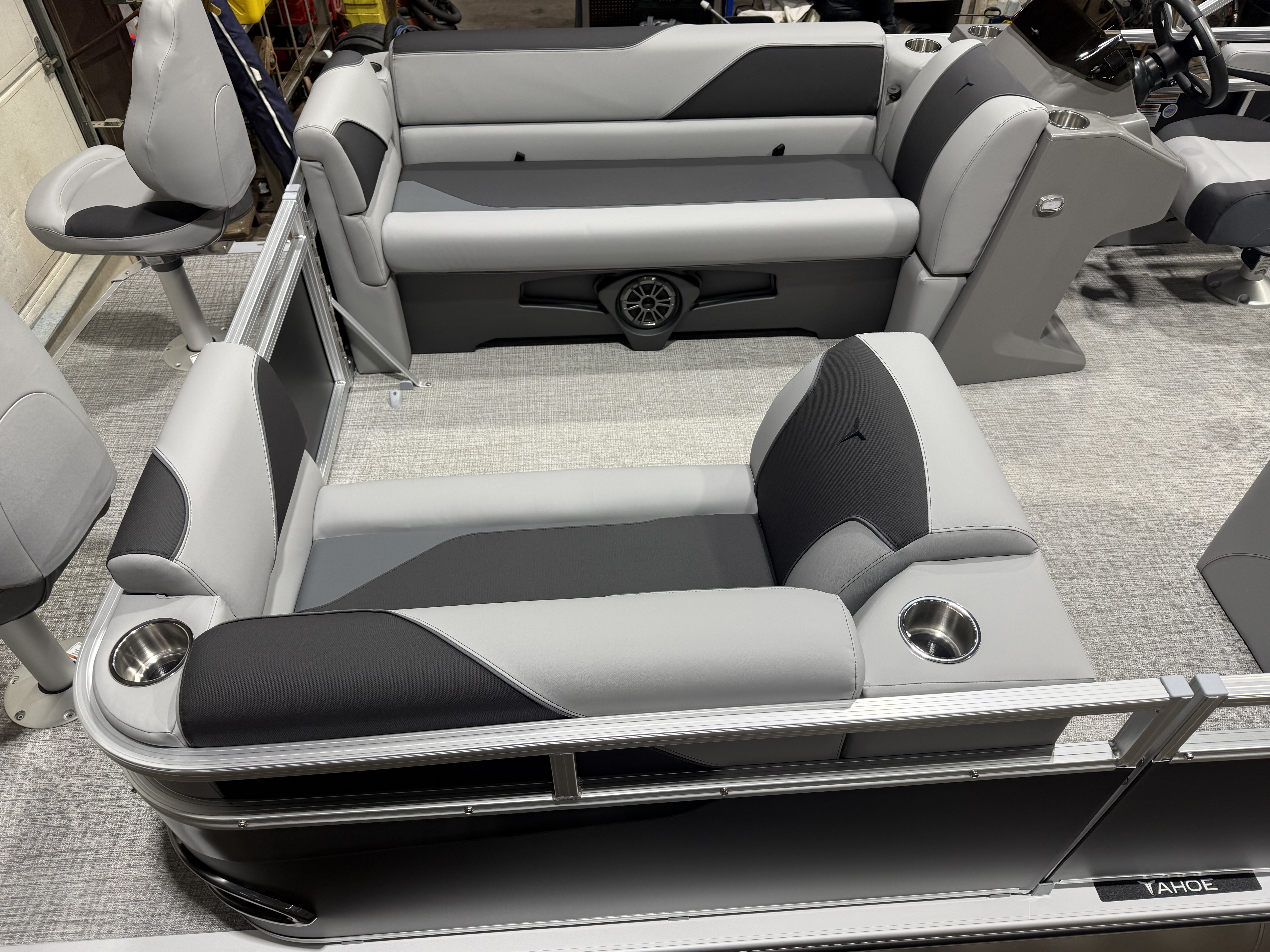 2026 Tahoe Sport 23E80 Fish & Cruise Pontoon & Honda 4-Stroke EFI. This 23' Matte Black Walls Fishing Pontoon Has A Front 2FT Bow Deck Extension With Two Fishing Seats & Seat Covers, Front Chaise Lounge Seating With Storage, Wrap Around Chaise Lounge Seating With More Storage, Reclining Commander's Captain's Seat With Slider, Two Rear Fishing Seats, Multiple Cup Holders, Sport Platinum Edition (Garmin 52CV GPS Depth Finder, 90 Degree Smoked Chrome Docklights, Polished Corner Caps, Platinum Edition Special Badging), Graphite Interior Vinyl Package w/Koolfab Black & Charcoal Accent, Charcoal Seat Cladding, Tilt Steering, Riptide Vinyl Flooring, 25" Tubes, Built In 25 Gas Tank, Trash Can In Lounge Arm, LED Nav Lights, 10' Bimini Top, Bluetooth Radio w/4 Speakers, Rear Live Well, Rod Holders, New Battery, Rear 4 Step Ladder, Rear Deck, Playpen Cover, Greywood Rectangle Table. Rated For 11 People.