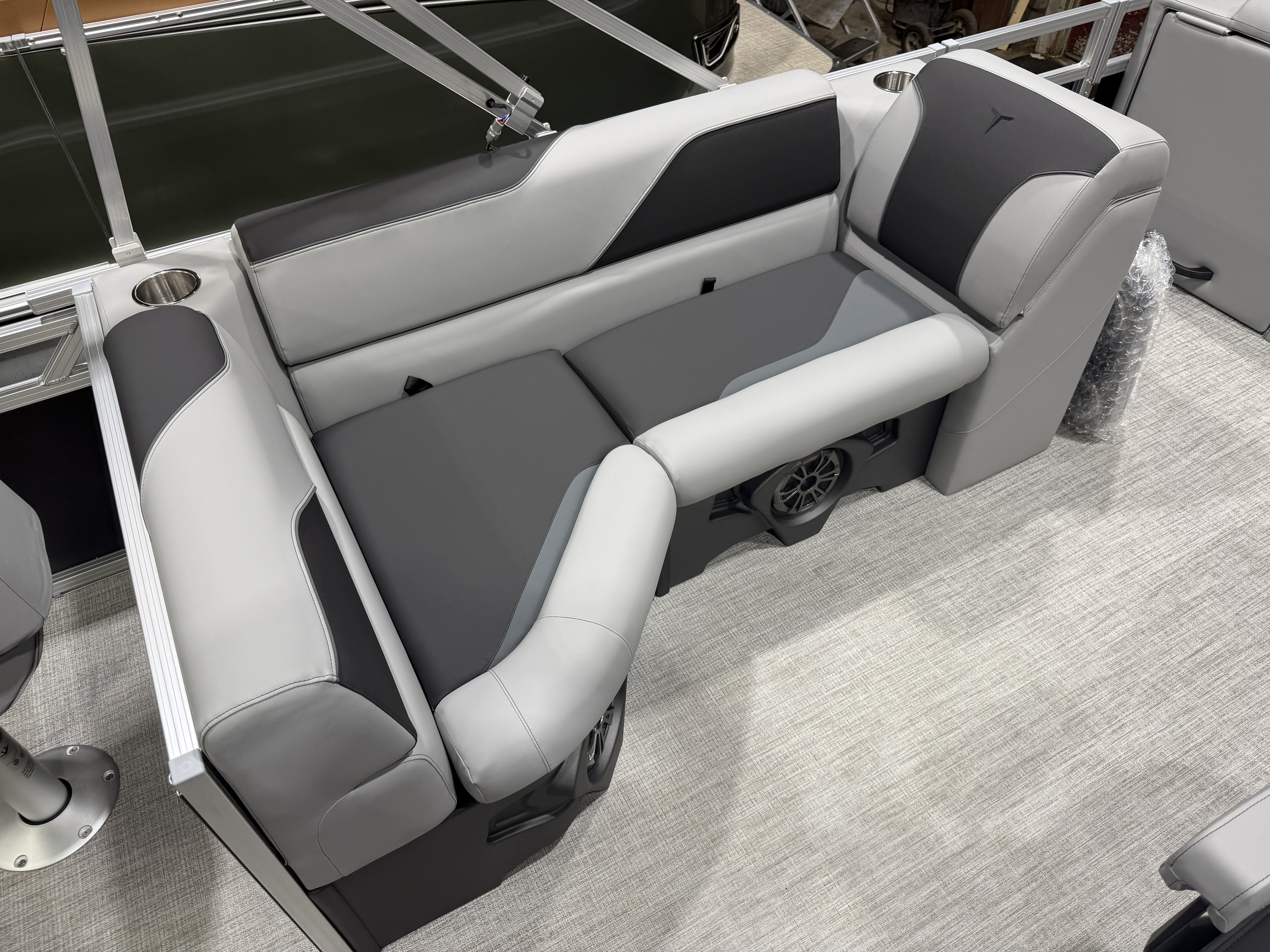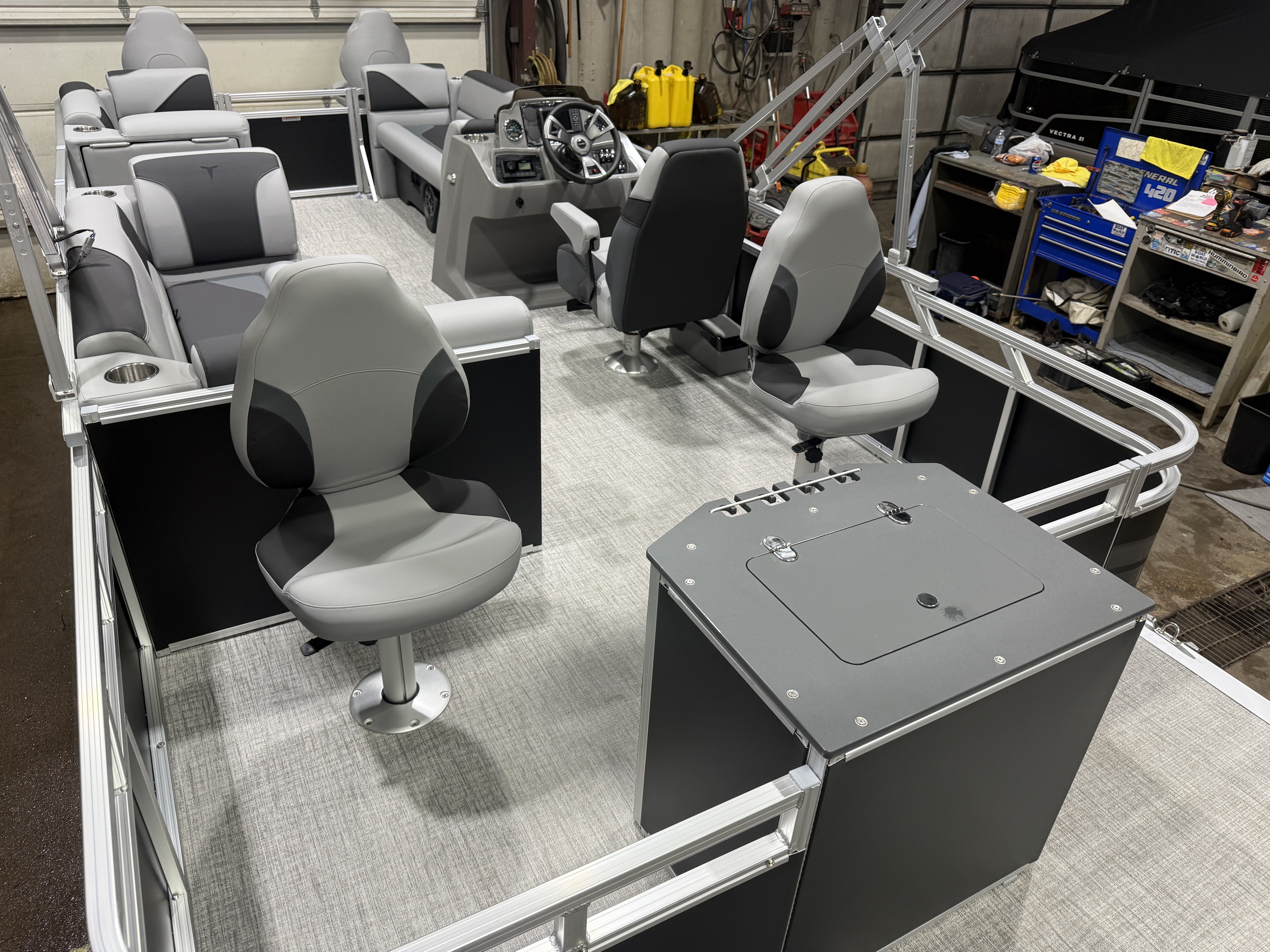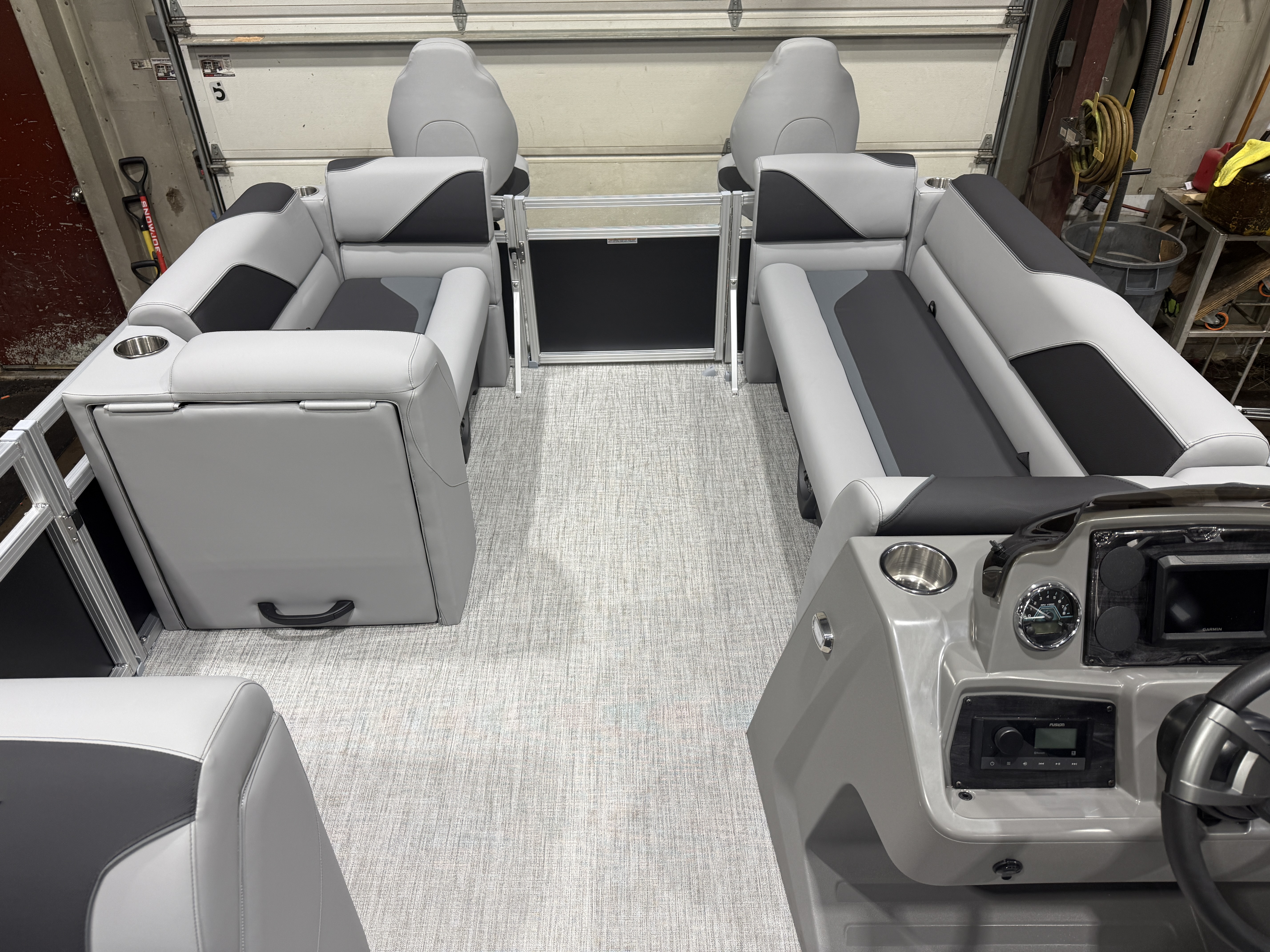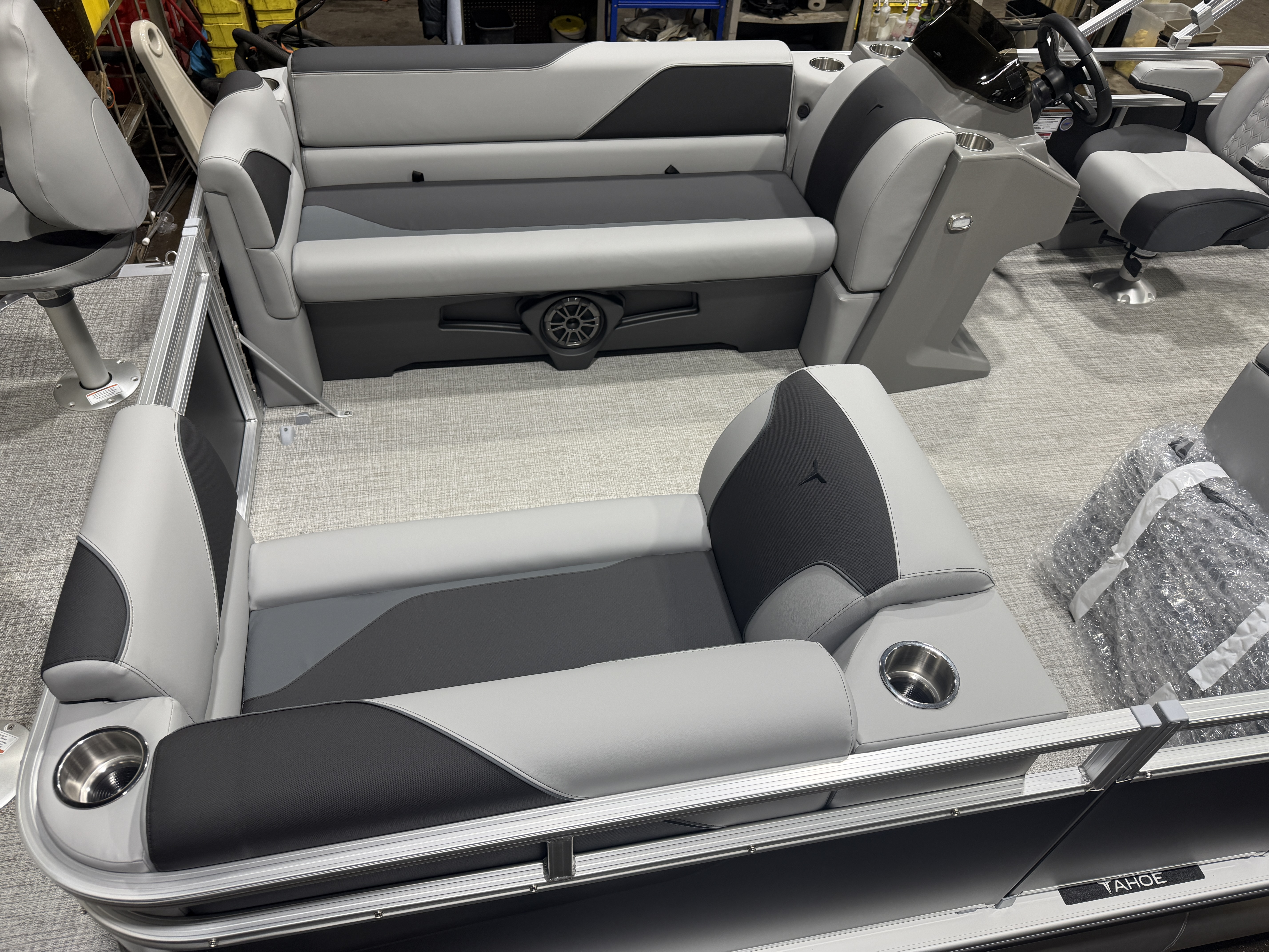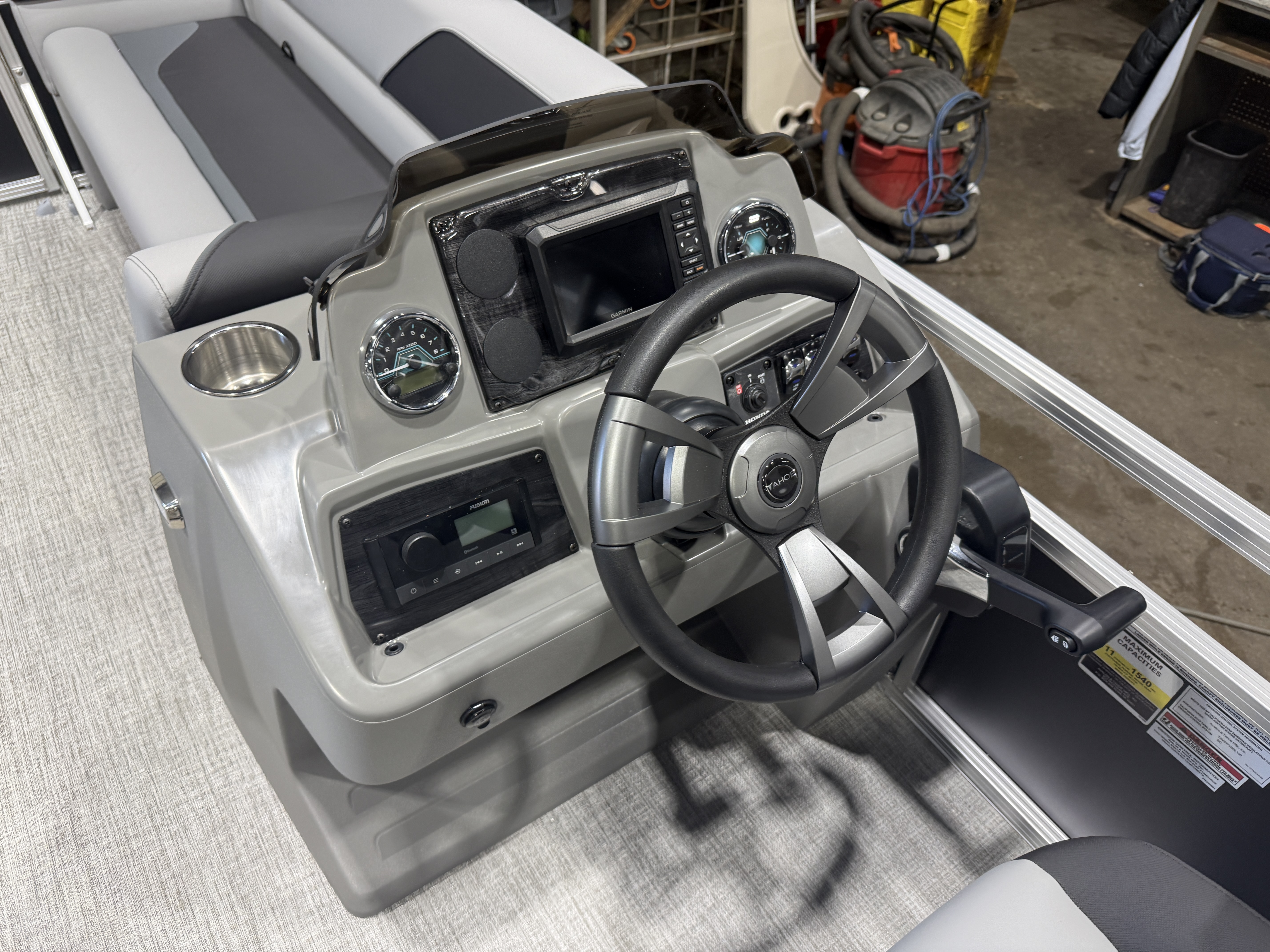 2026 Tahoe Sport 23E80 Fish & Cruise Pontoon & Honda 4-Stroke EFI. This 23' Matte Black Walls Fishing Pontoon Has A Front 2FT Bow Deck Extension With Two Fishing Seats & Seat Covers, Front Chaise Lounge Seating With Storage, Wrap Around Chaise Lounge Seating With More Storage, Reclining Commander's Captain's Seat With Slider, Two Rear Fishing Seats, Multiple Cup Holders, Sport Platinum Edition (Garmin 52CV GPS Depth Finder, 90 Degree Smoked Chrome Docklights, Polished Corner Caps, Platinum Edition Special Badging), Graphite Interior Vinyl Package w/Charcoal Accent, Charcoal Seat Cladding, Tilt Steering, Riptide Vinyl Flooring, 25" Tubes, Built In 25 Gas Tank, Trash Can In Lounge Arm, LED Nav Lights, 10' Bimini Top, Bluetooth Radio w/4 Speakers, Rear Live Well, Rod Holders, New Battery, Rear 4 Step Ladder, Rear Deck, Playpen Cover, Greywood Rectangle Table. Rated For 11 People.