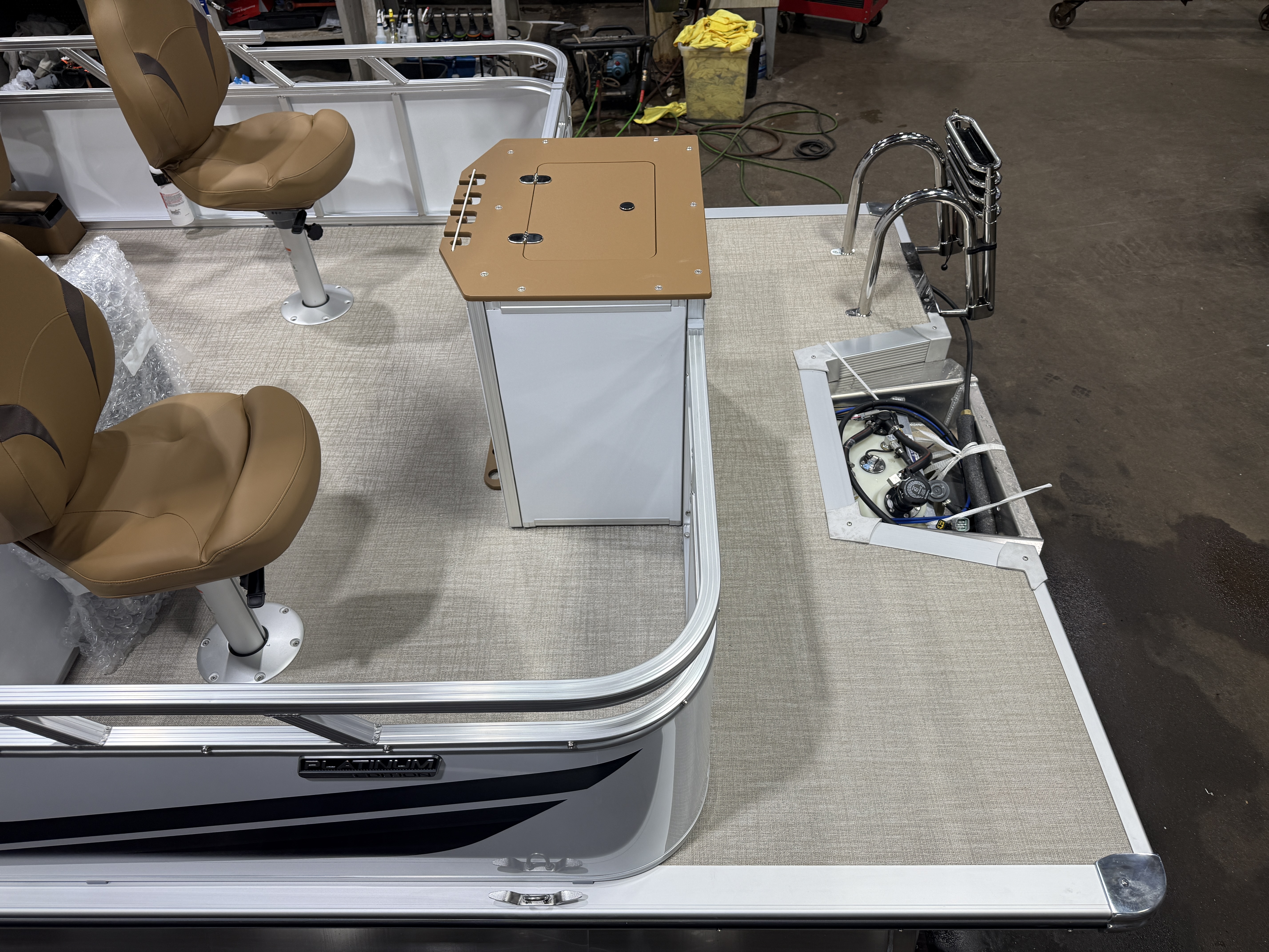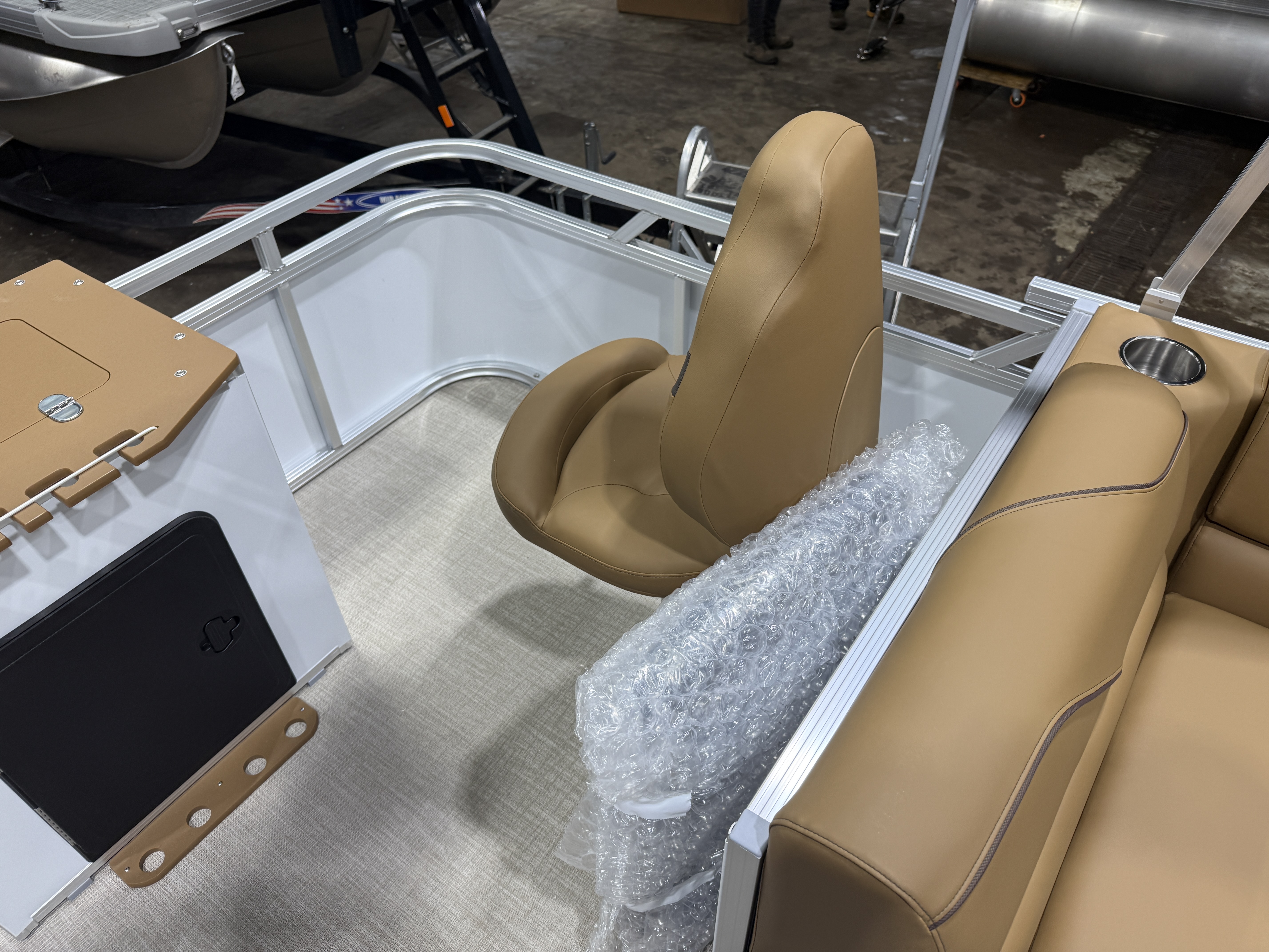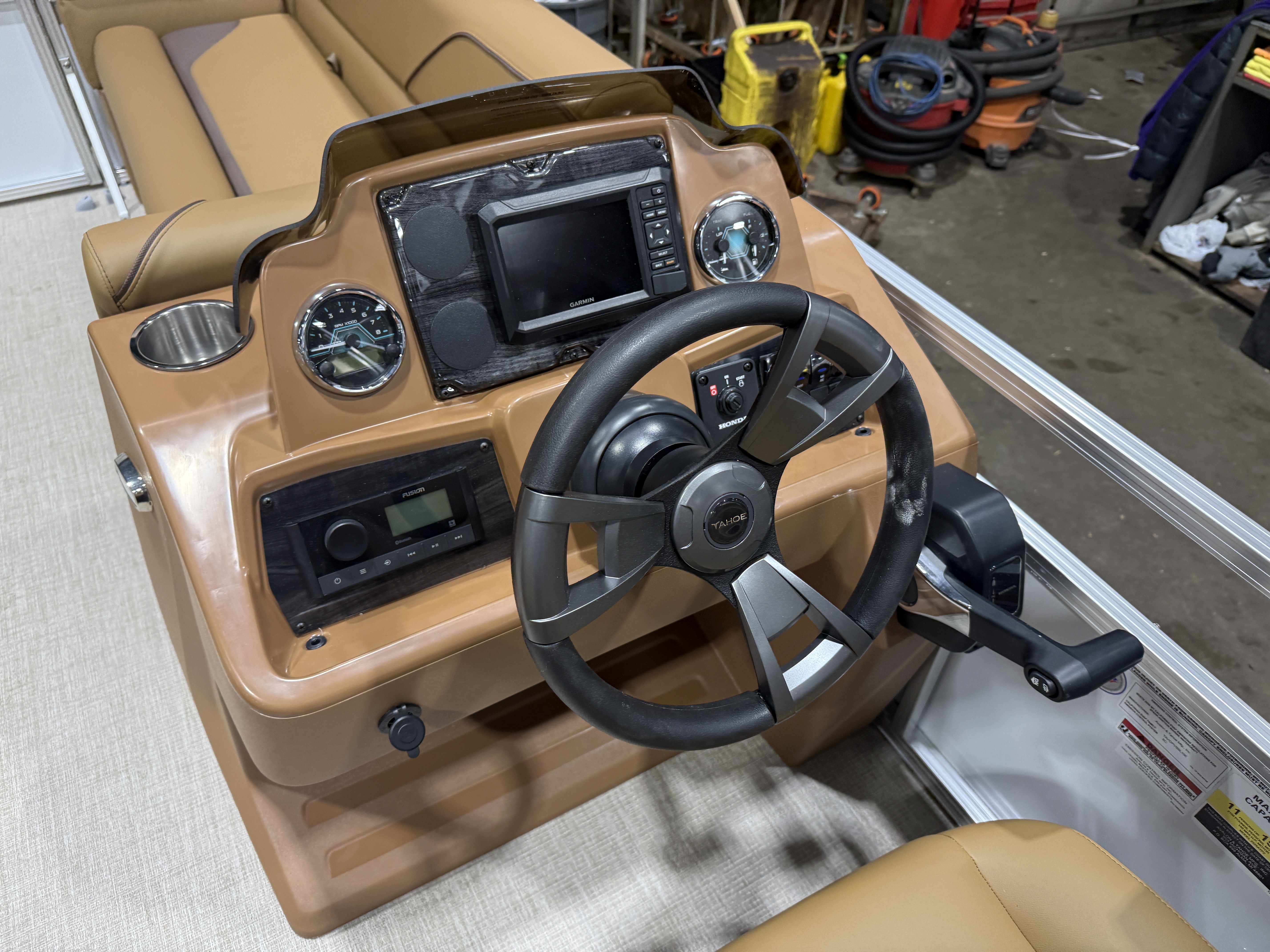 2026 Tahoe Sport 23E80 Fish & Cruise Pontoon & Honda 4-Stroke EFI. This 23' Fishing Pontoon Has A Front 2FT Bow Deck Extension With Two Fishing Seats & Seat Covers, Front Chaise Lounge Seating With Storage, Wrap Around Chaise Lounge Seating With More Storage, Reclining Commander's Captain's Seat With Slider, Two Rear Fishing Seats, Multiple Cup Holders, Sport Platinum Edition (Garmin 52CV GPS Depth Finder, 90 Degree Smoked Chrome Docklights, Polished Corner Caps, Platinum Edition Special Badging), Cognac Interior Vinyl Package w/Expresso Accent, Brushed Bronze Seat Cladding, Tilt Steering, Riptide Vinyl Flooring, 25" Tubes, Built In 25 Gas Tank, Trash Can In Lounge Arm, LED Nav Lights, 10' Bimini Top, Bluetooth Radio w/4 Speakers, Rear Live Well, Rod Holders, New Battery, Rear 4 Step Ladder, Rear Deck, Playpen Cover, Greywood Rectangle Table. Rated For 11 People.