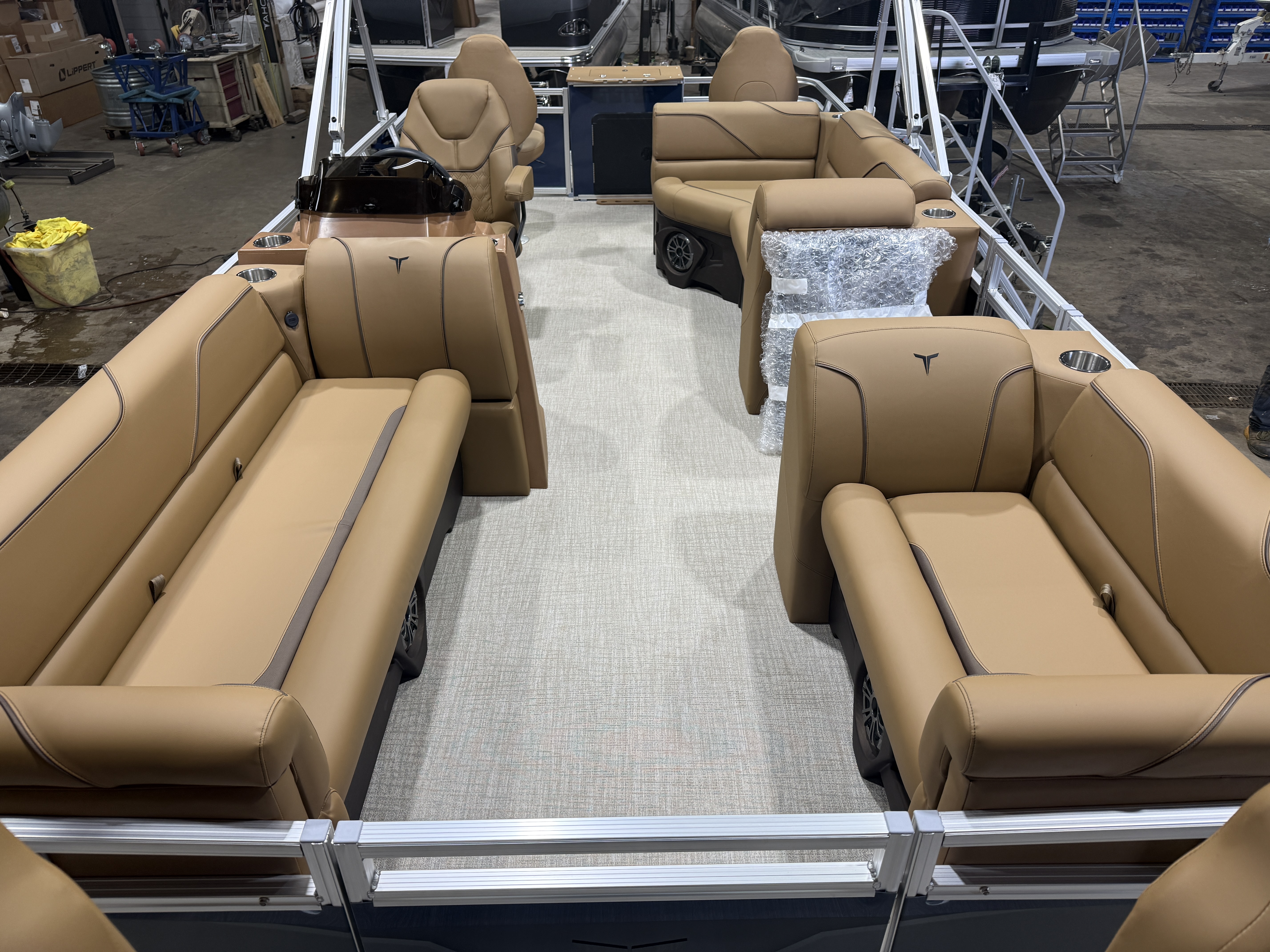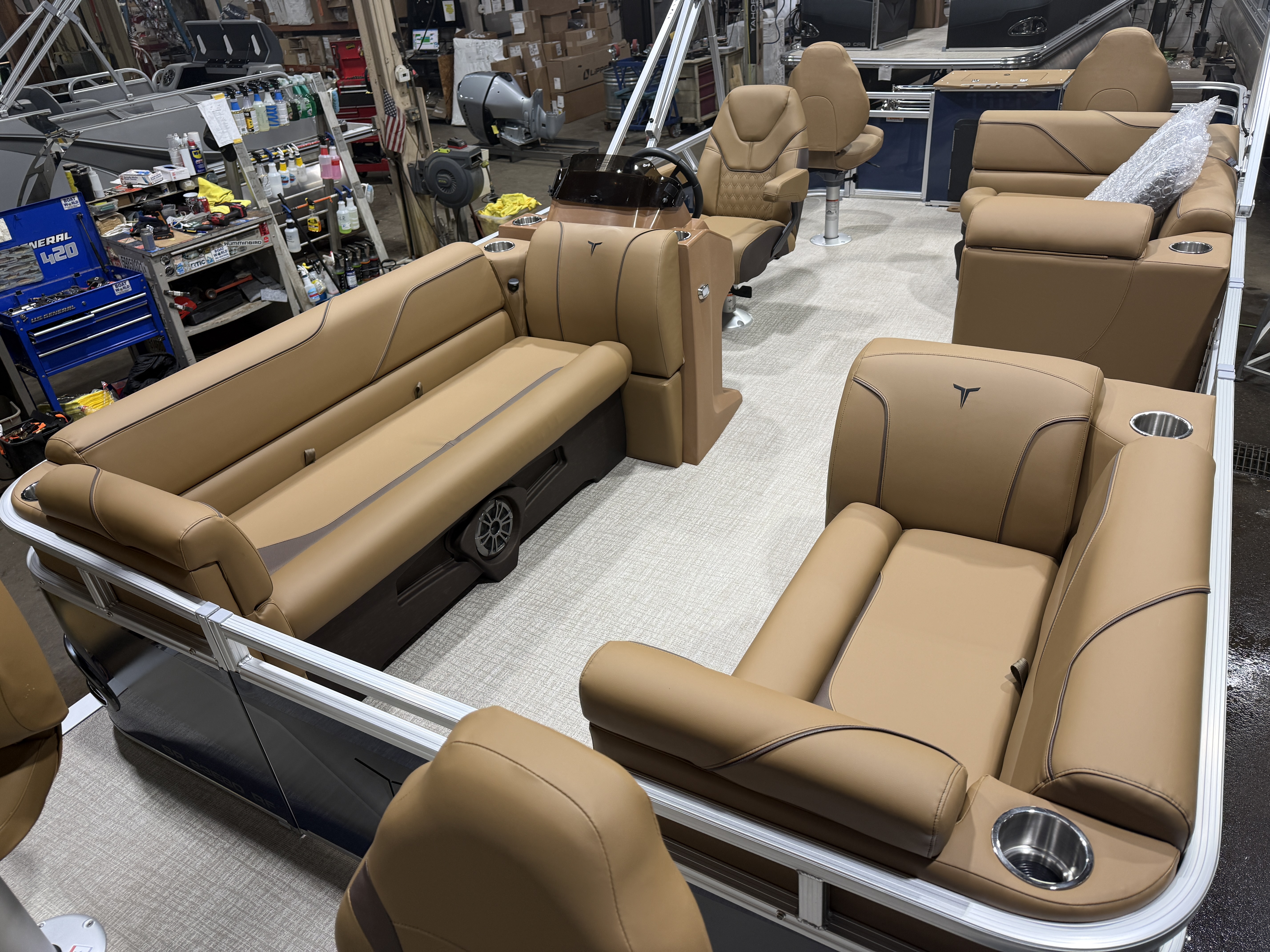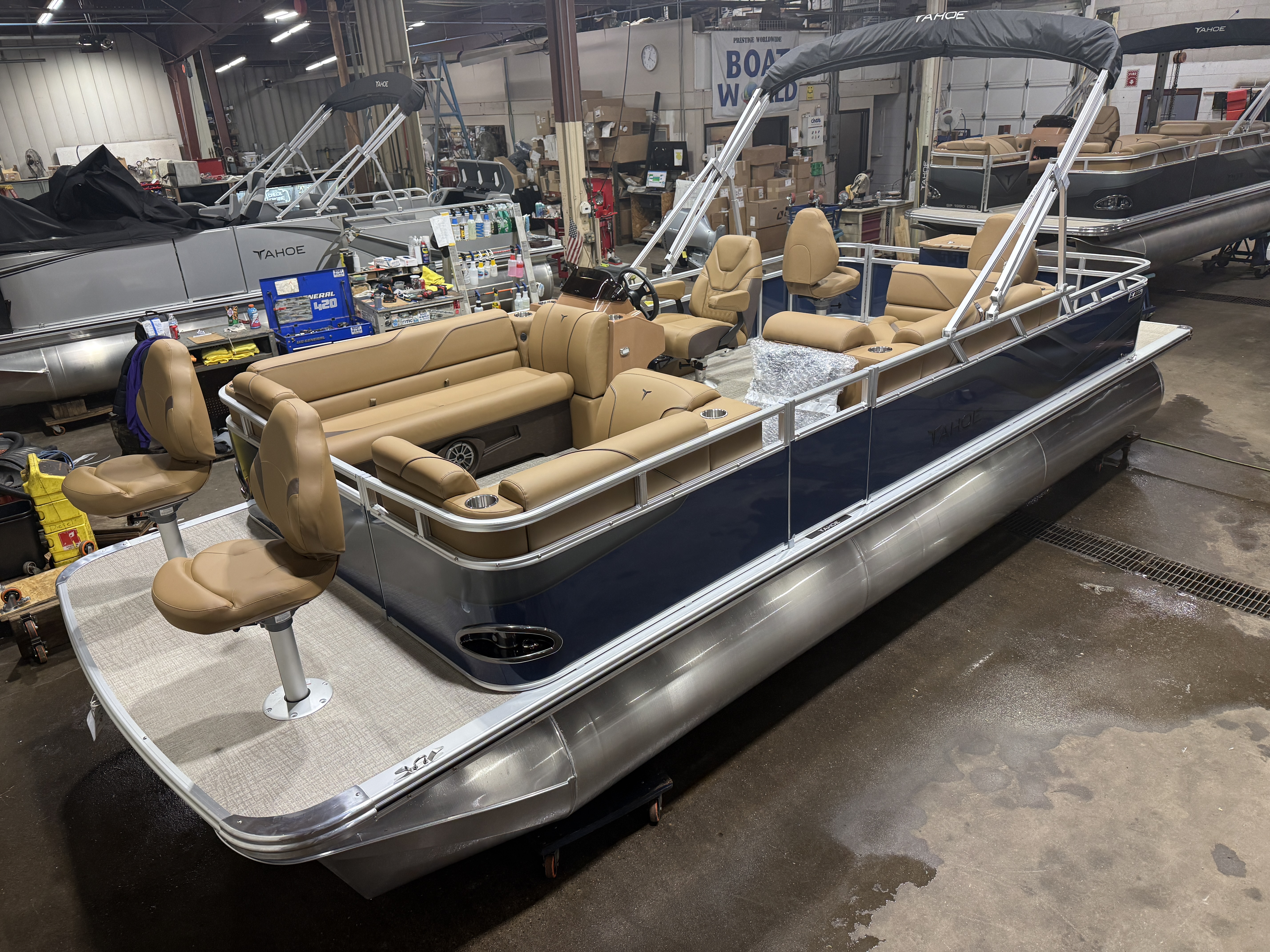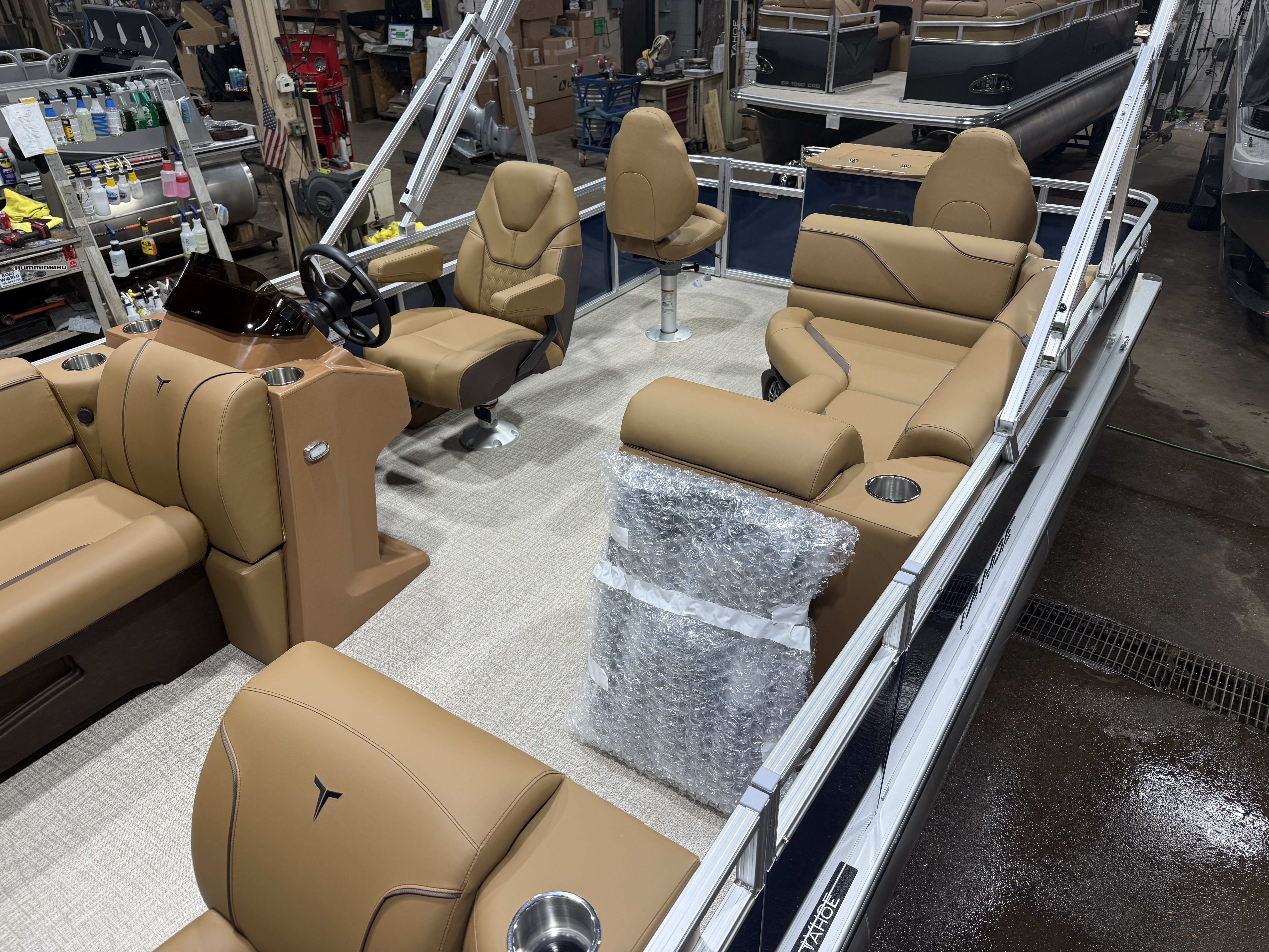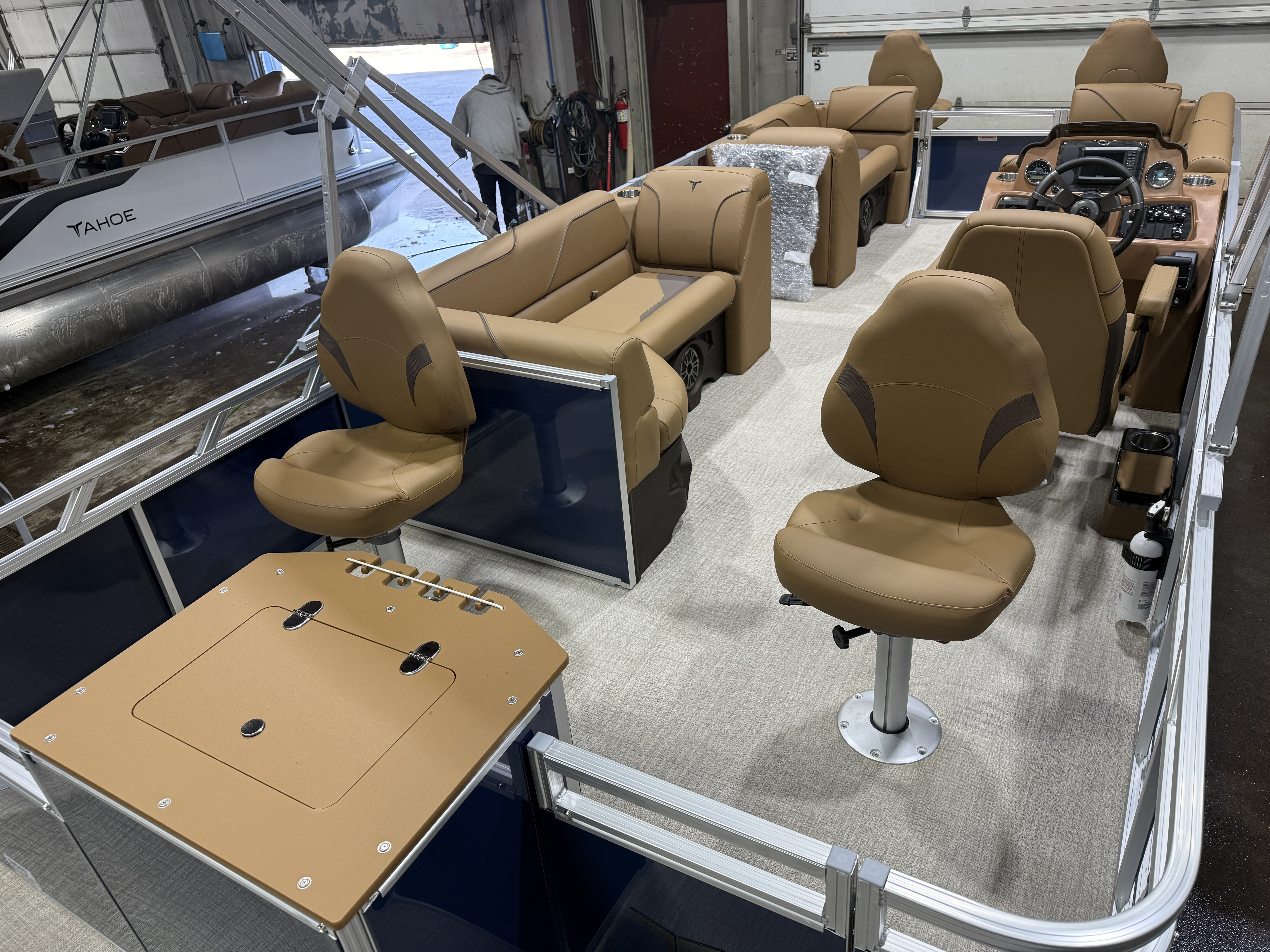 2026 Tahoe Sport 23E80 Fish & Cruise Pontoon & Honda 4-Stroke EFI. This 23' Fishing Pontoon Has A Front 2FT Bow Deck Extension With Two Fishing Seats & Seat Covers, Front Chaise Lounge Seating With Storage, Wrap Around Chaise Lounge Seating With More Storage, Reclining Commander's Captain's Seat With Slider, Two Rear Fishing Seats, Multiple Cup Holders, Sport Platinum Edition (Garmin 52CV GPS Depth Finder, 90 Degree Smoked Chrome Docklights, Polished Corner Caps, Platinum Edition Special Badging), Cognac Interior Vinyl Package w/Expresso Accent, Brushed Bronze Seat Cladding, Tilt Steering, Riptide Vinyl Flooring, 25" Tubes, Built In 25 Gas Tank, Trash Can In Lounge Arm, LED Nav Lights, 10' Bimini Top, Bluetooth Radio w/4 Speakers, Rear Live Well, Rod Holders, New Battery, Rear 4 Step Ladder, Rear Deck, Playpen Cover, Greywood Rectangle Table. Rated For 11 People.