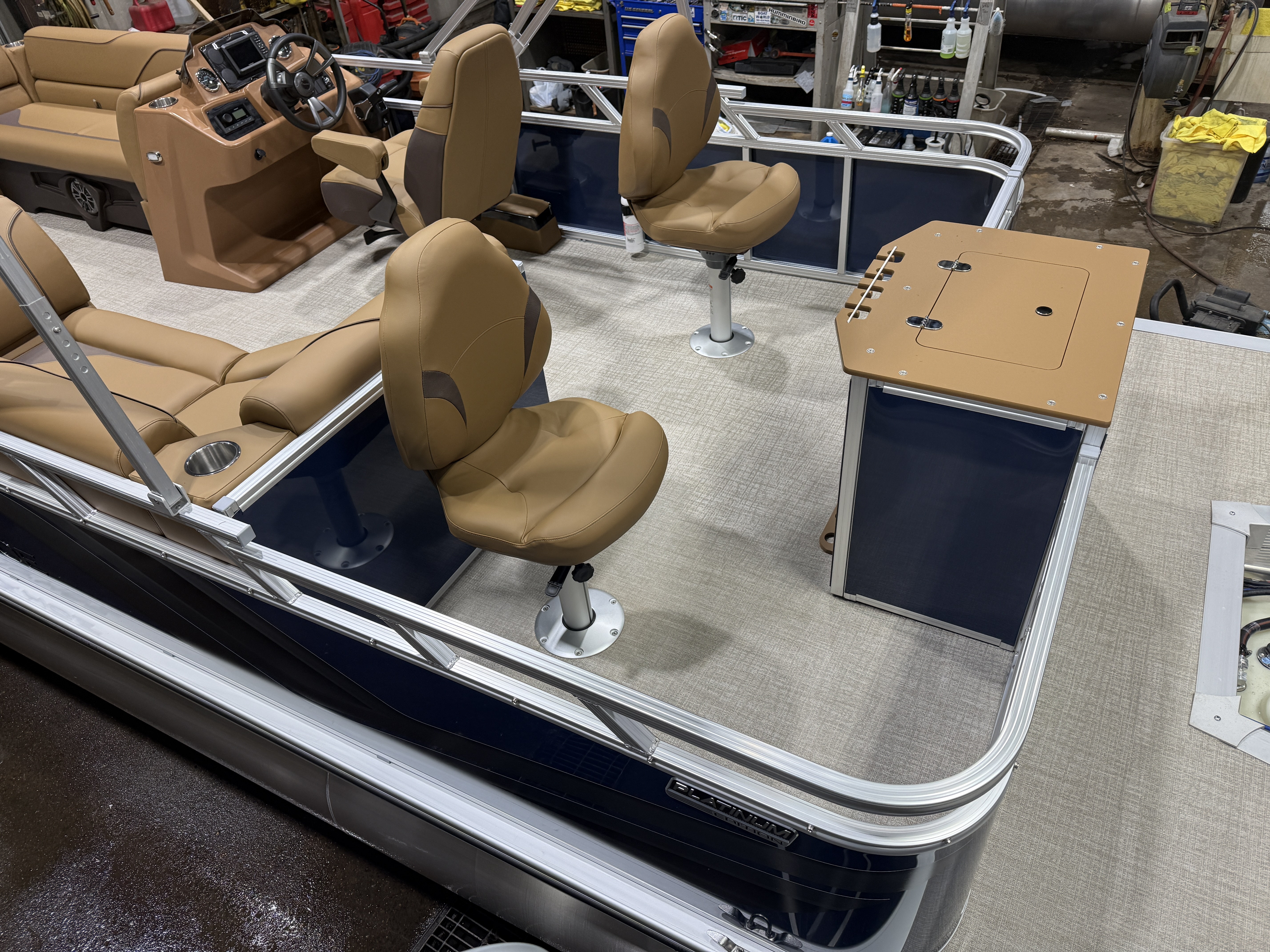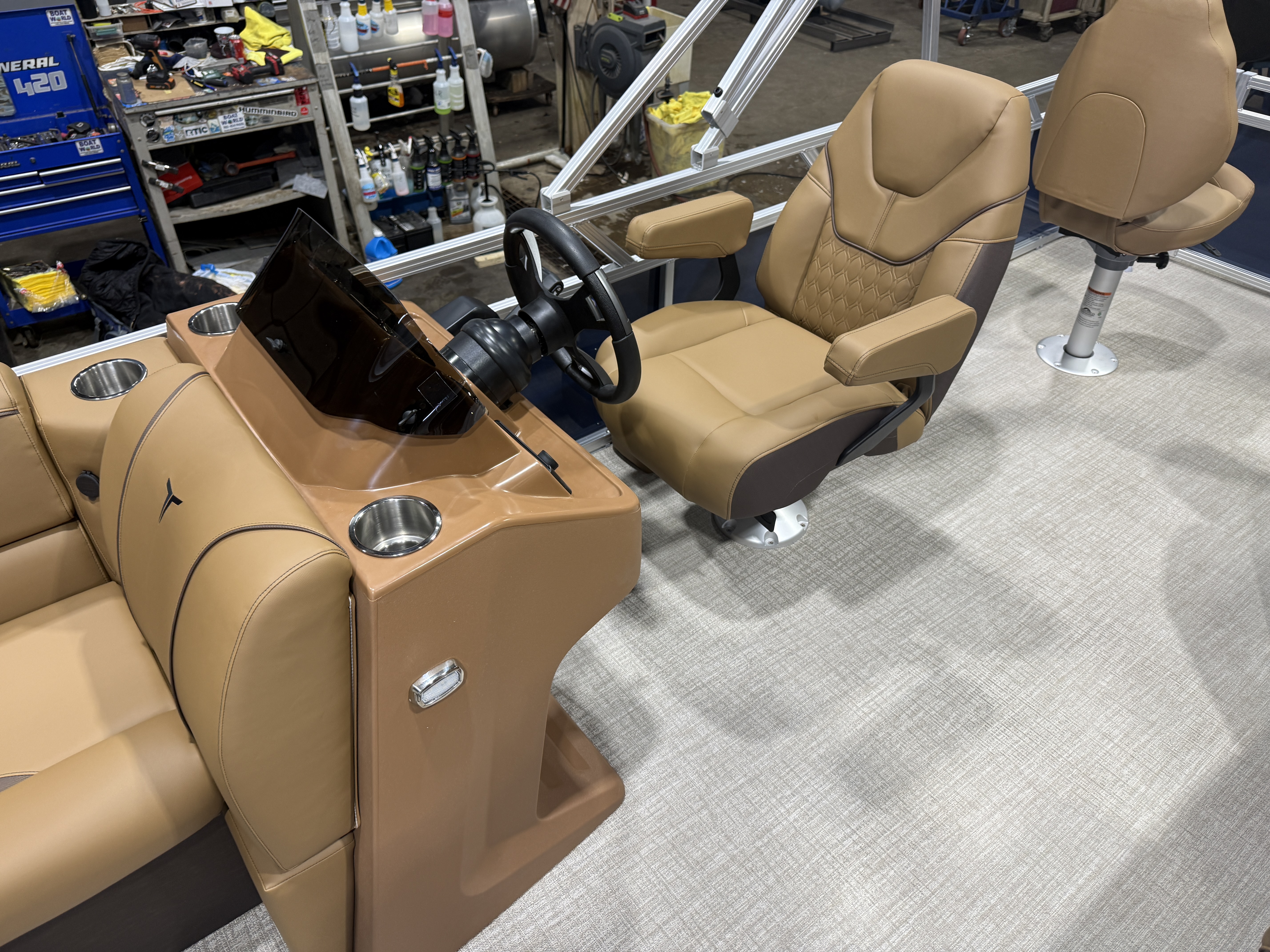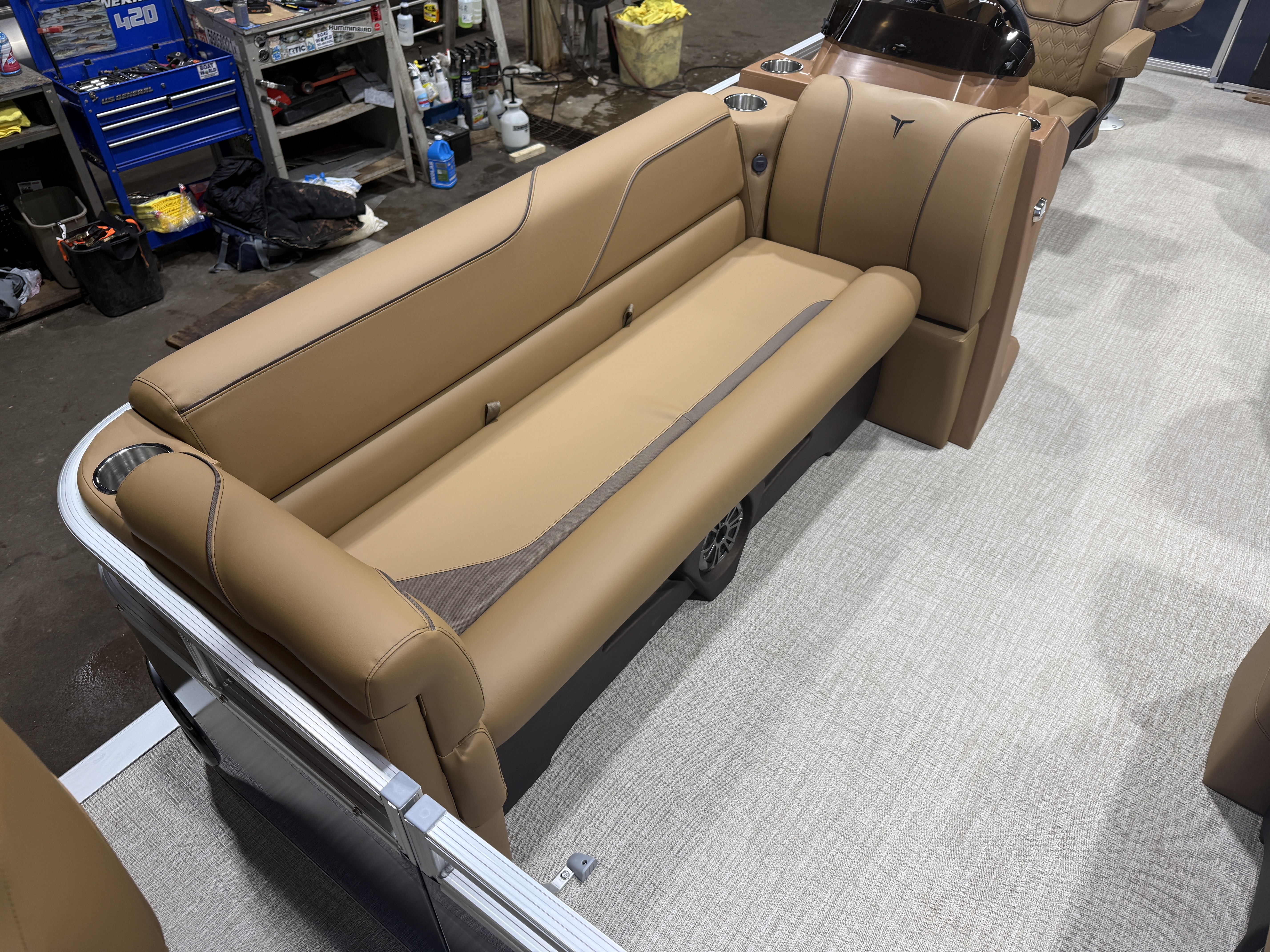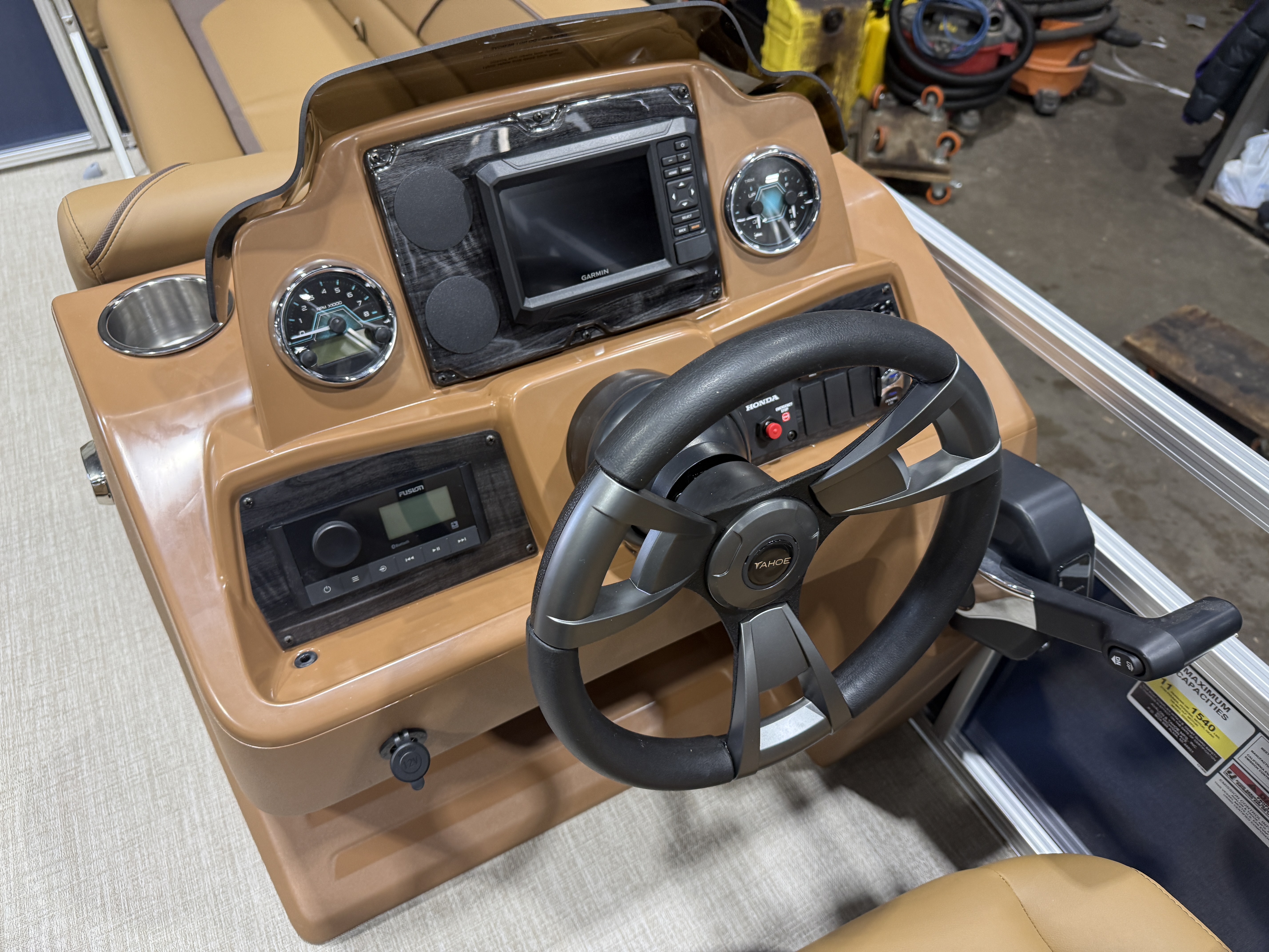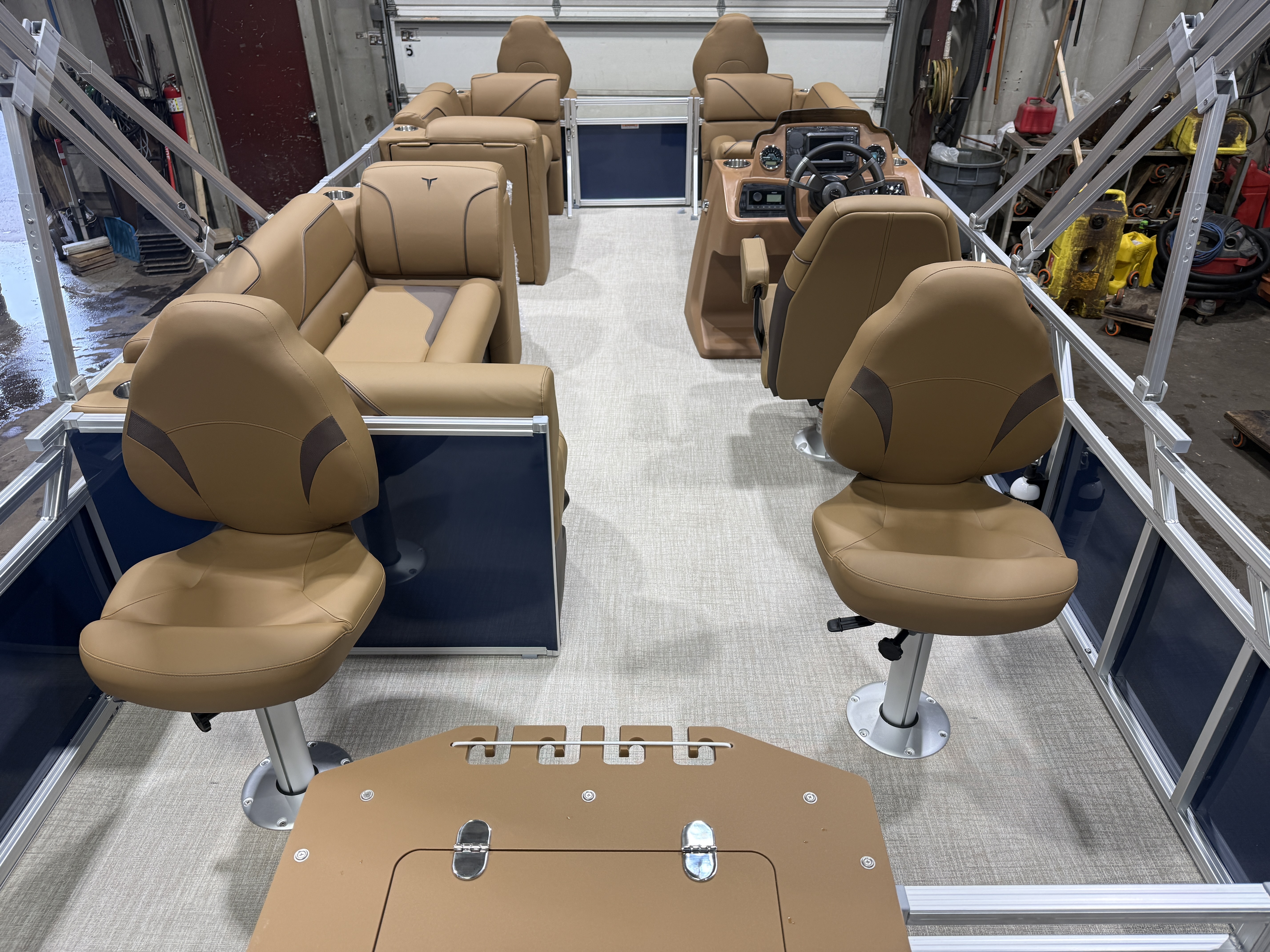 2026 Tahoe Sport 23E80 Fish & Cruise Pontoon & Honda 4-Stroke EFI. This 23' Fishing Pontoon Has A Front 2FT Bow Deck Extension With Two Fishing Seats & Seat Covers, Front Chaise Lounge Seating With Storage, Wrap Around Chaise Lounge Seating With More Storage, Reclining Commander's Captain's Seat With Slider, Two Rear Fishing Seats, Multiple Cup Holders, Sport Platinum Edition (Garmin 52CV GPS Depth Finder, 90 Degree Smoked Chrome Docklights, Polished Corner Caps, Platinum Edition Special Badging), Cognac Interior Vinyl Package w/Expresso Accent, Brushed Bronze Seat Cladding, Tilt Steering, Riptide Vinyl Flooring, 25" Tubes, Built In 25 Gas Tank, Trash Can In Lounge Arm, LED Nav Lights, 10' Bimini Top, Bluetooth Radio w/4 Speakers, Rear Live Well, Rod Holders, New Battery, Rear 4 Step Ladder, Rear Deck, Playpen Cover, Greywood Rectangle Table. Rated For 11 People.