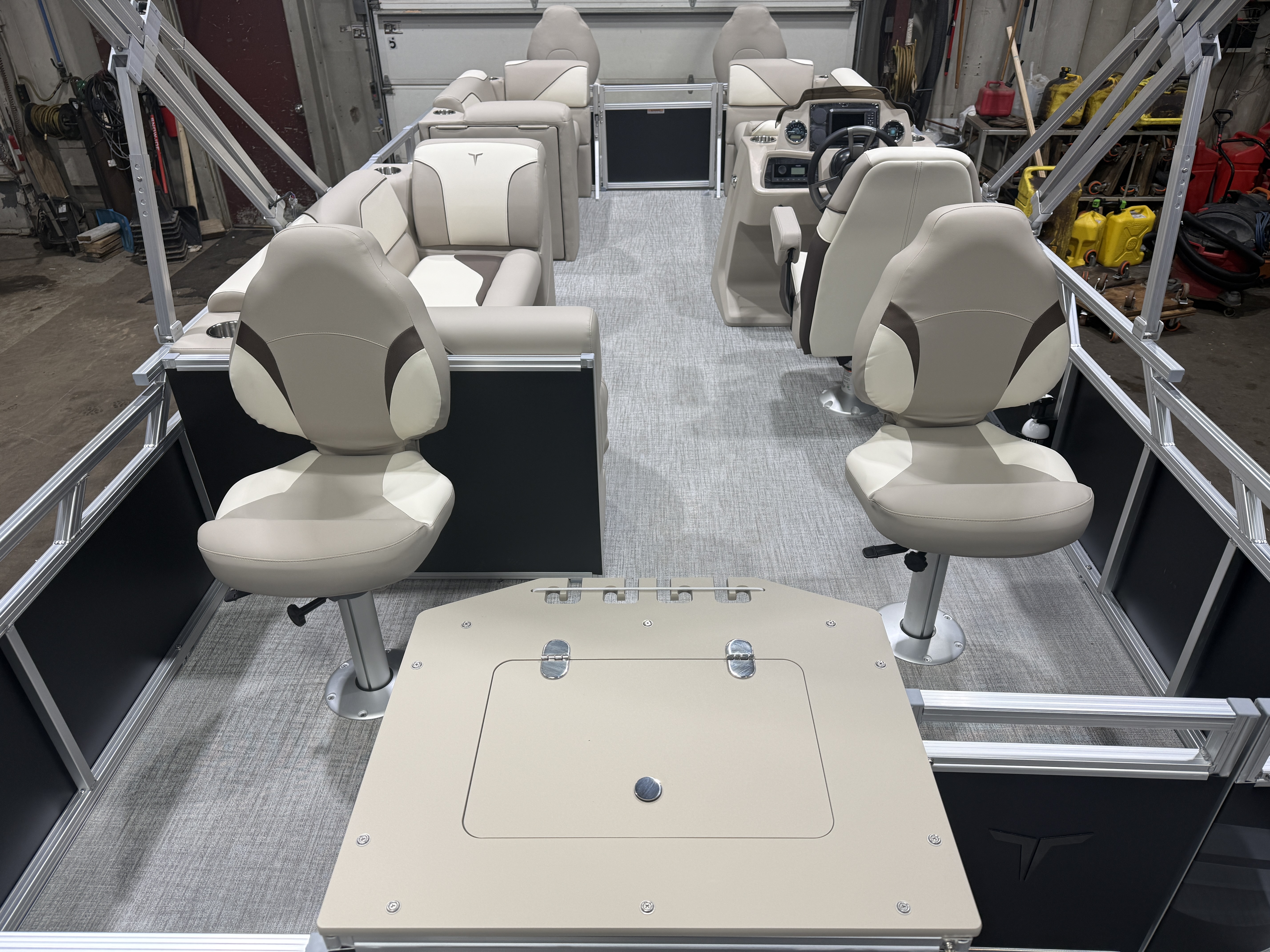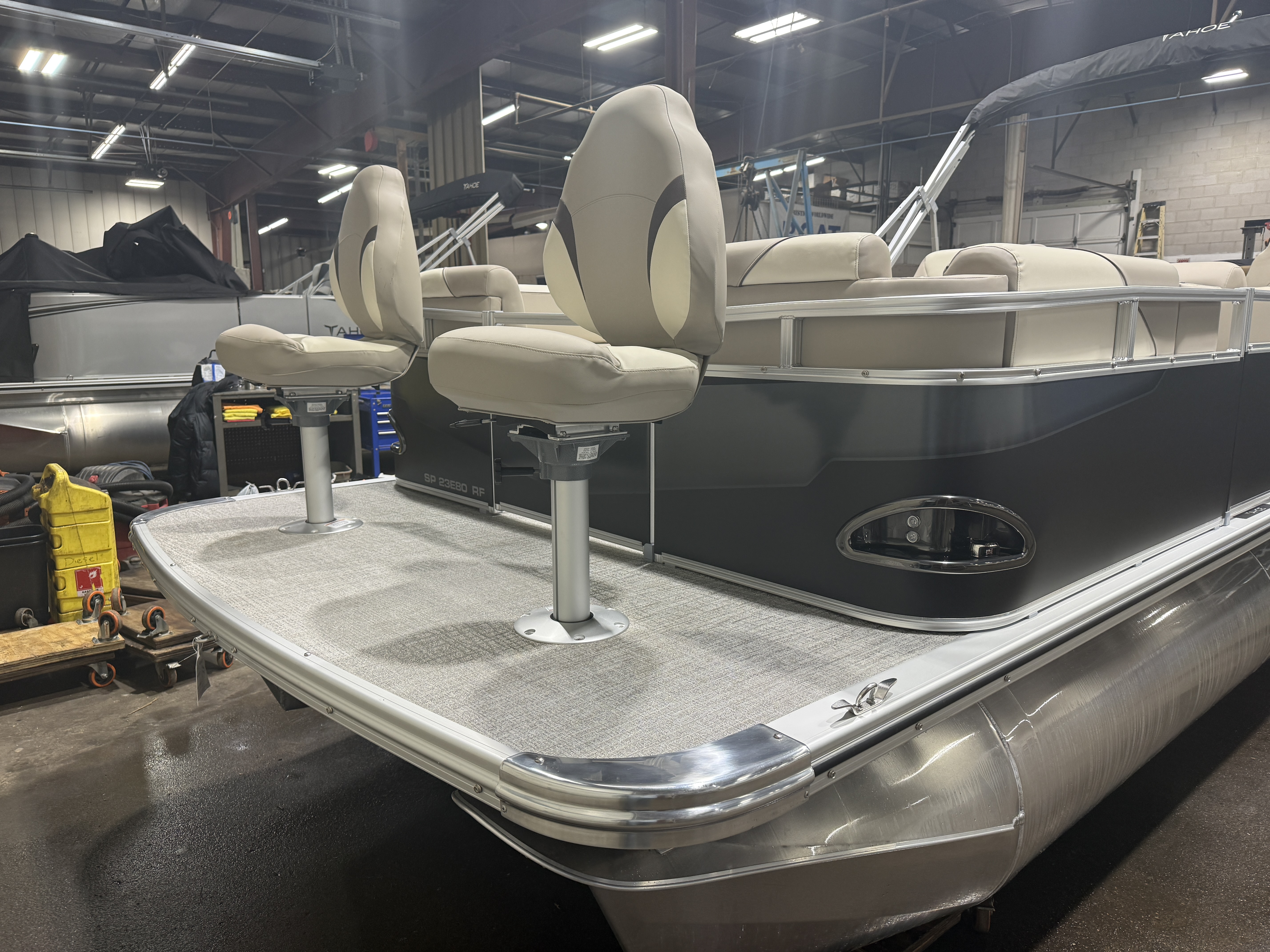 2026 Tahoe Sport 23E80 Fish & Cruise Pontoon & Honda 4-Stroke EFI. This 23' Matte Black Walls Fishing Pontoon Has A Front 2FT Bow Deck Extension With Two Fishing Seats & Seat Covers, Front Chaise Lounge Seating With Storage, Wrap Around Chaise Lounge Seating With More Storage, Reclining Commander's Captain's Seat With Slider, Two Rear Fishing Seats, Multiple Cup Holders, Sport Platinum Edition (Garmin 52CV GPS Depth Finder, 90 Degree Smoked Chrome Docklights, Polished Corner Caps, Platinum Edition Special Badging), Graphite Interior Vinyl Package w/Charcoal Accent, Charcoal Seat Cladding, Tilt Steering, Riptide Vinyl Flooring, 25" Tubes, Built In 25 Gas Tank, Trash Can In Lounge Arm, LED Nav Lights, 10' Bimini Top, Bluetooth Radio w/4 Speakers, Rear Live Well, Rod Holders, New Battery, Rear 4 Step Ladder, Rear Deck, Playpen Cover, Greywood Rectangle Table. Rated For 11 People.
