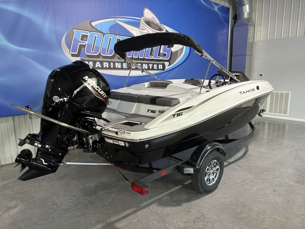 The 2026 TAHOE® T16 comes standard with a 60hp Mercury® ELPT FourStroke outboard motor and has a recommended maximum 75hp rating. This model is packaged with a trailer.