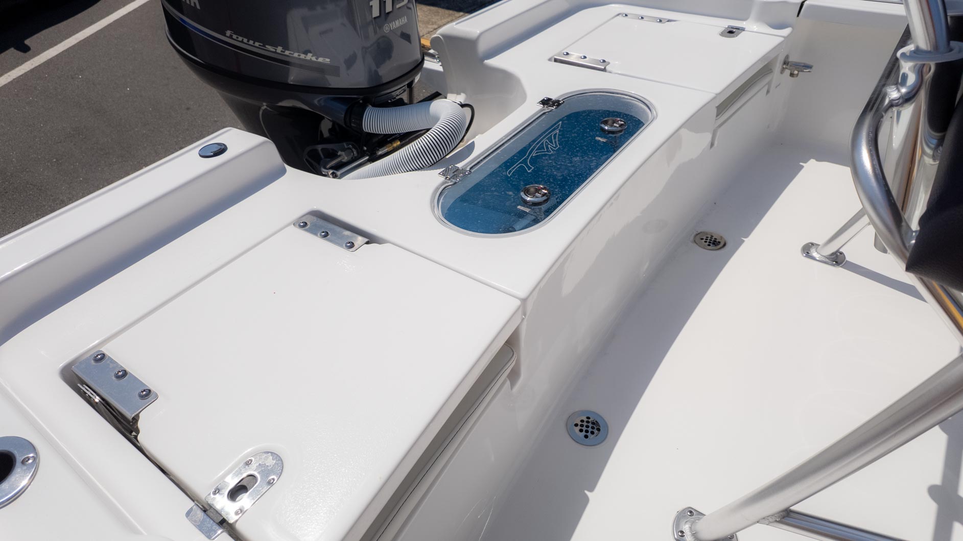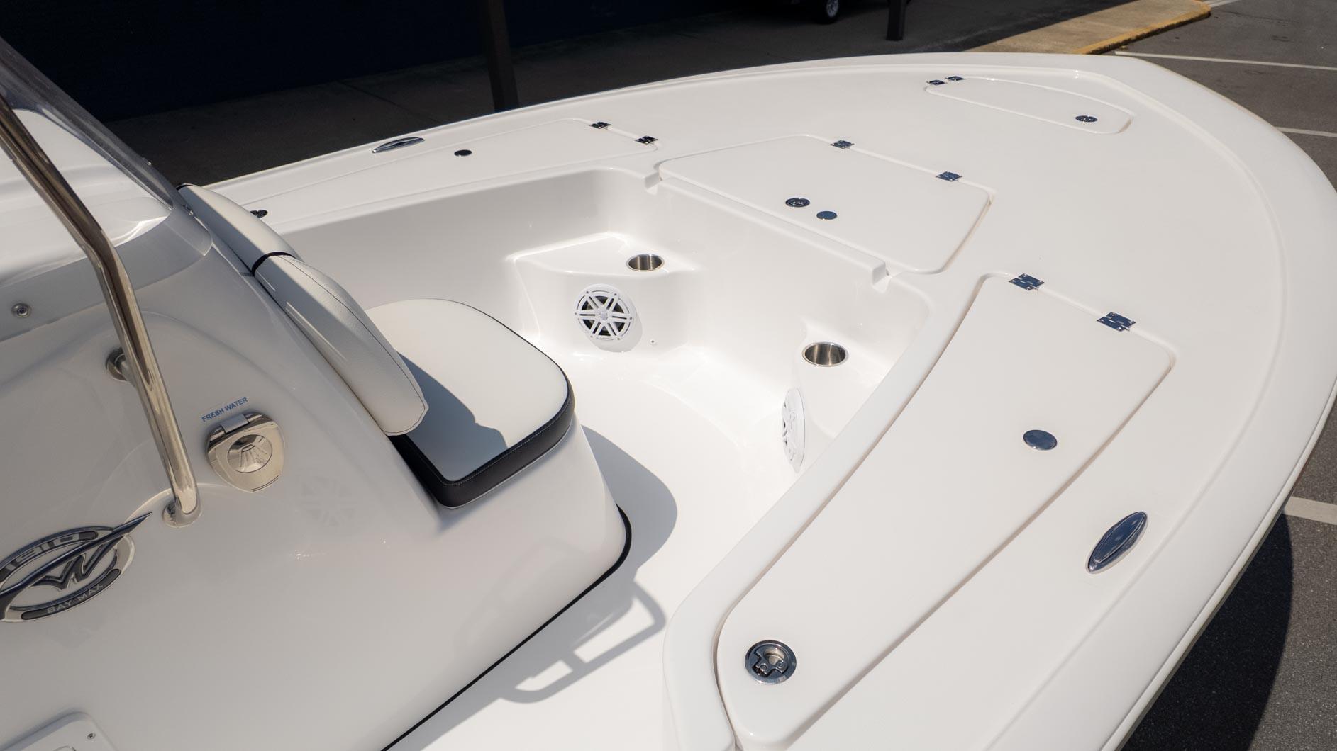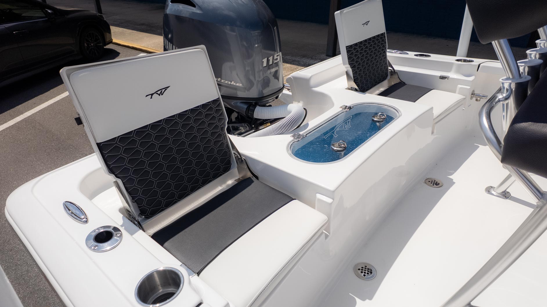 Fishing enthusiasts will appreciate the thoughtful design, including a 10-gallon insulated livewell located under the console seat and a 20-gallon insulated stern livewell. Plus, the 40-gallon port and starboard boxes come with rod storage to keep your gear organized. With a fiberglass swim platform and a three-step ladder, quick dips in the water are a breeze. For added fun, the JL MM 55 with four M3 JL speakers ensures you can enjoy your favorite tunes while you're out on the water. Whether you're fishing for the big one or just soaking up the sun, the 1910 BM, powered by a Yamaha F 115 XB, is your go-to vessel.