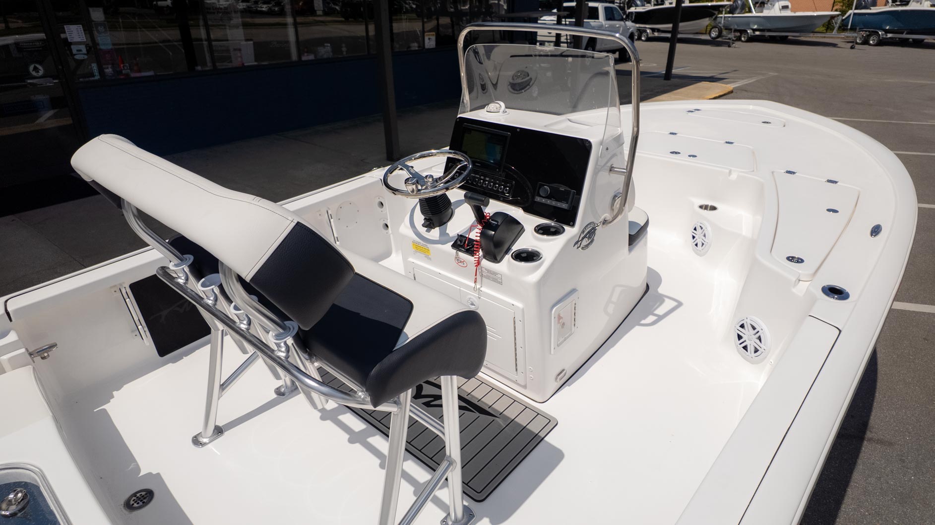 Designed with fun in mind, the 1910 BM features a layout that keeps everyone comfortable and ready for adventure. You'll find stern flip-up jump seats on both the port and starboard sides, providing plenty of room for guests to relax. For the captain, a leaning post with a removable backrest provides both comfort and support.