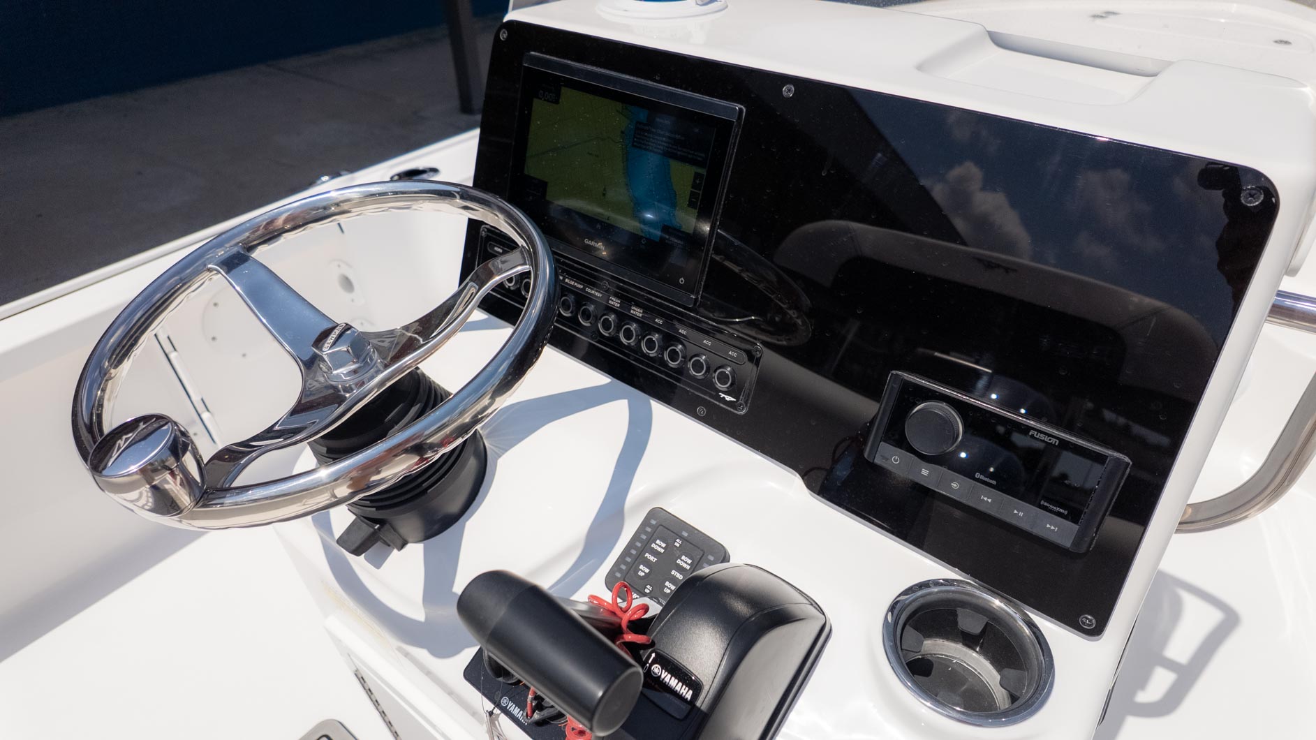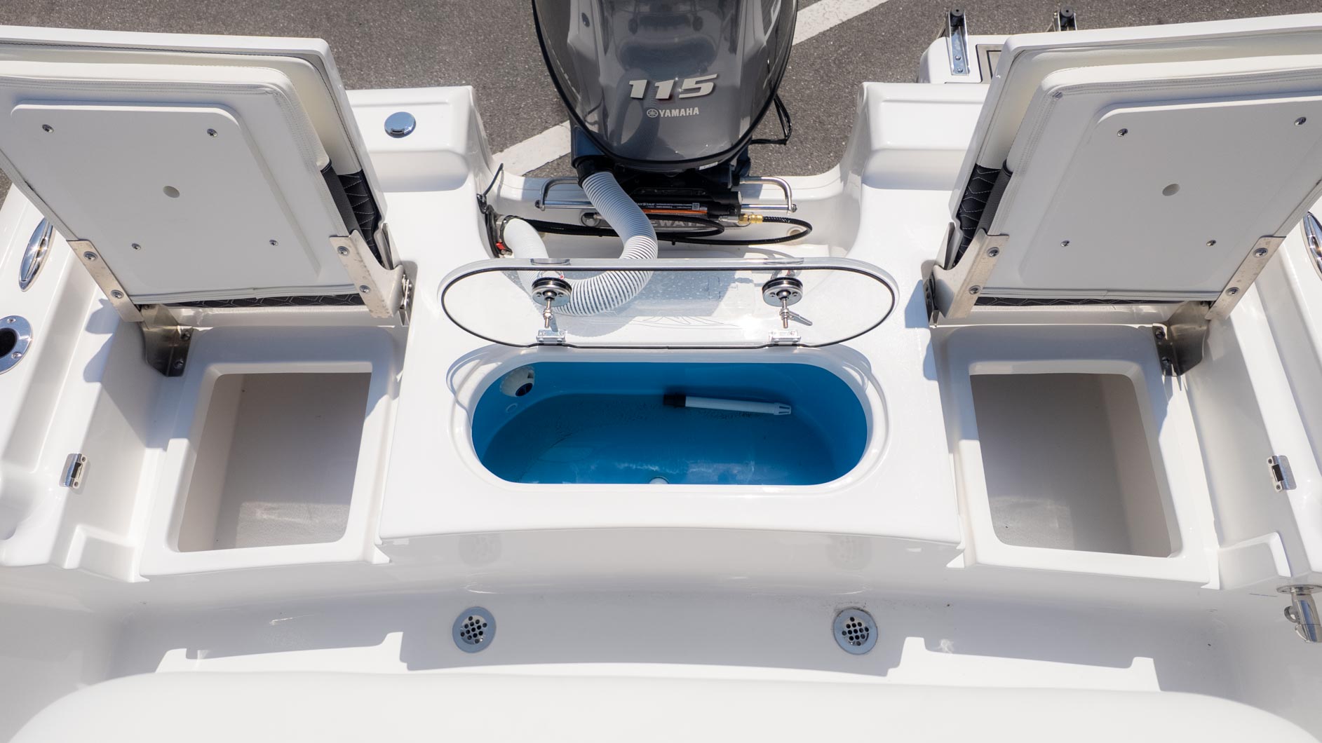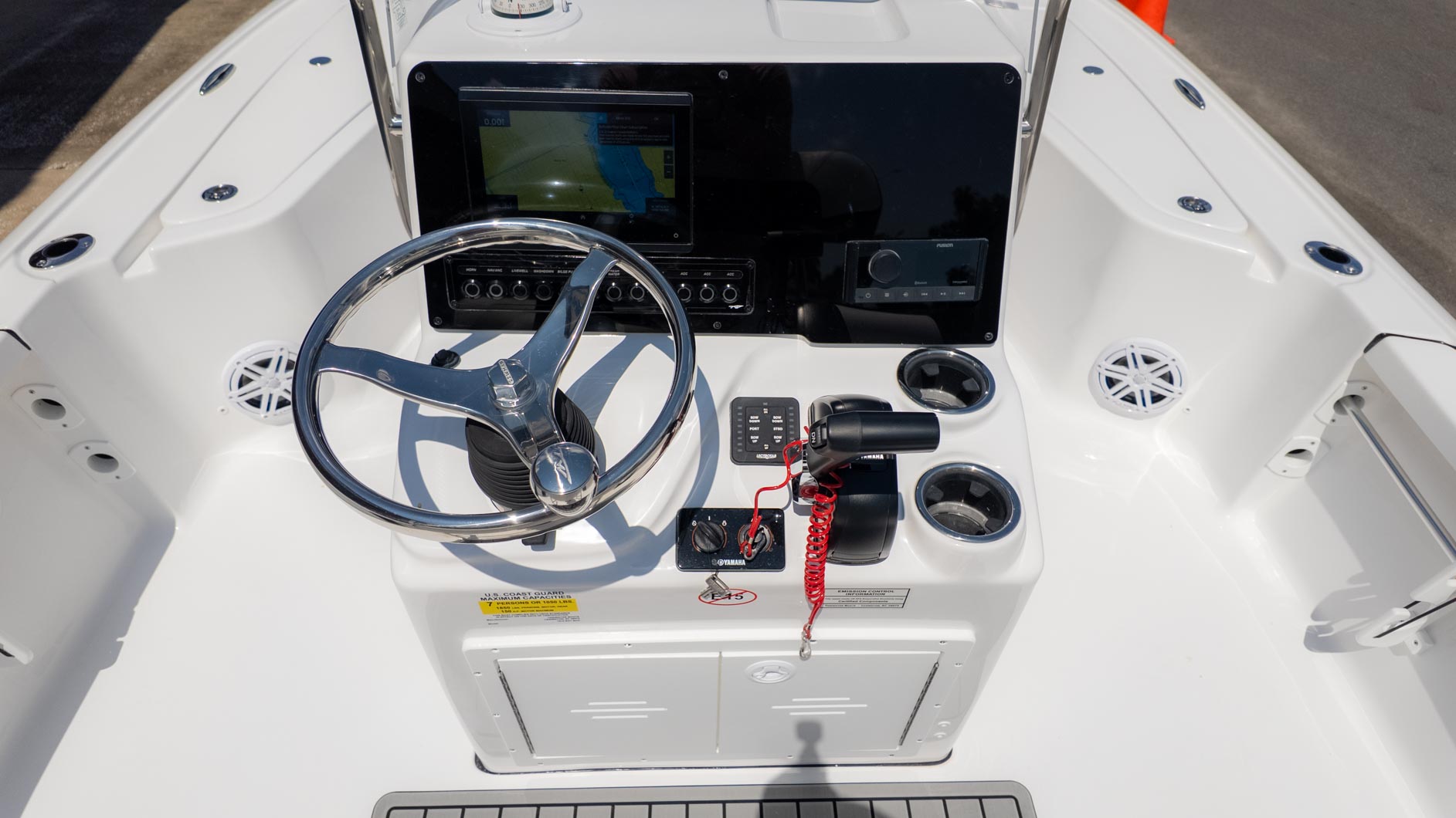 Fishing enthusiasts will appreciate the thoughtful design, including a 10-gallon insulated livewell located under the console seat and a 20-gallon insulated stern livewell. Plus, the 40-gallon port and starboard boxes come with rod storage to keep your gear organized. With a fiberglass swim platform and a three-step ladder, quick dips in the water are a breeze. For added fun, the JL MM 55 with four M3 JL speakers ensures you can enjoy your favorite tunes while you're out on the water. Whether you're fishing for the big one or just soaking up the sun, the 1910 BM, powered by a Yamaha F 115 XB, is your go-to vessel.