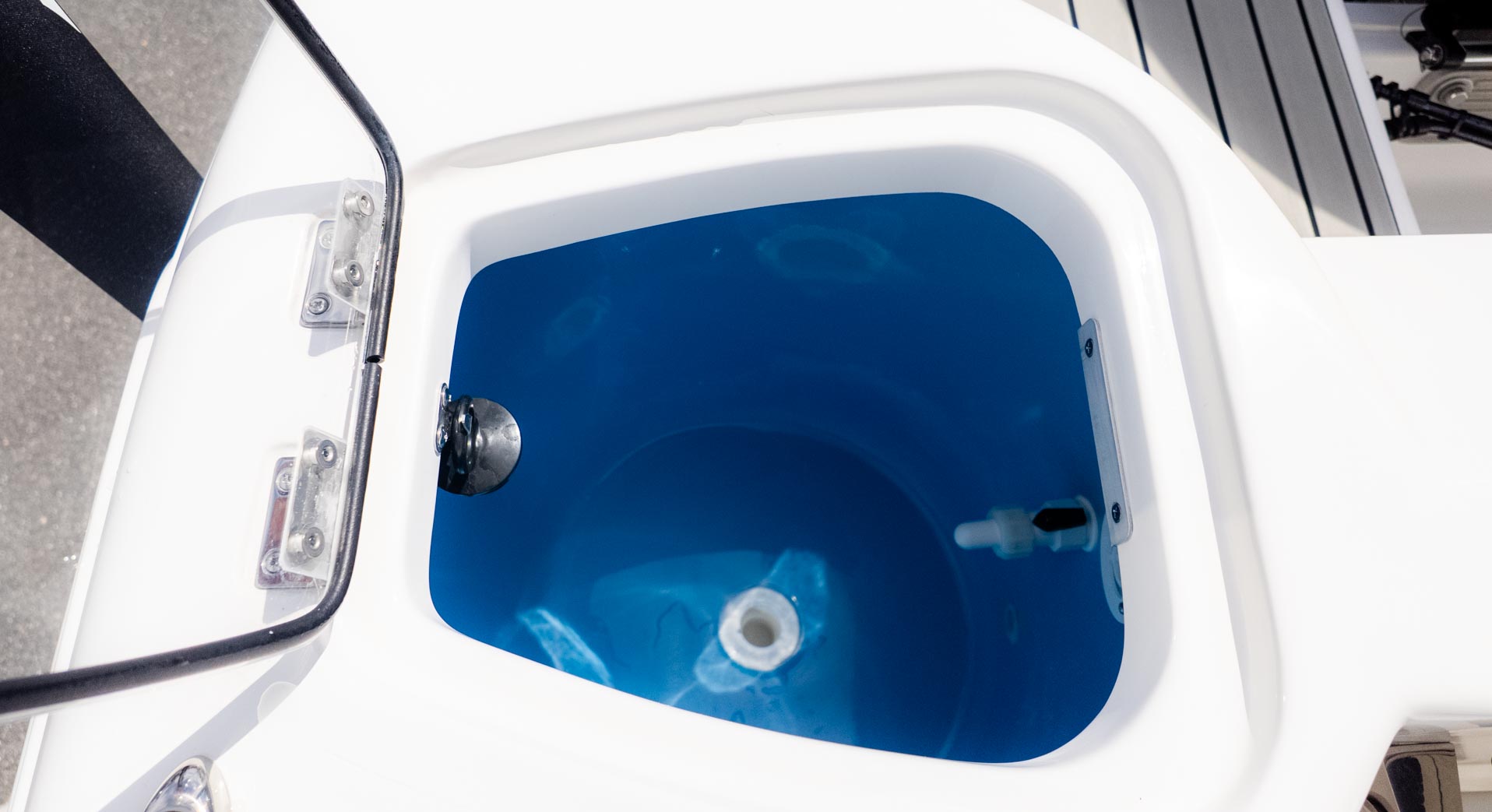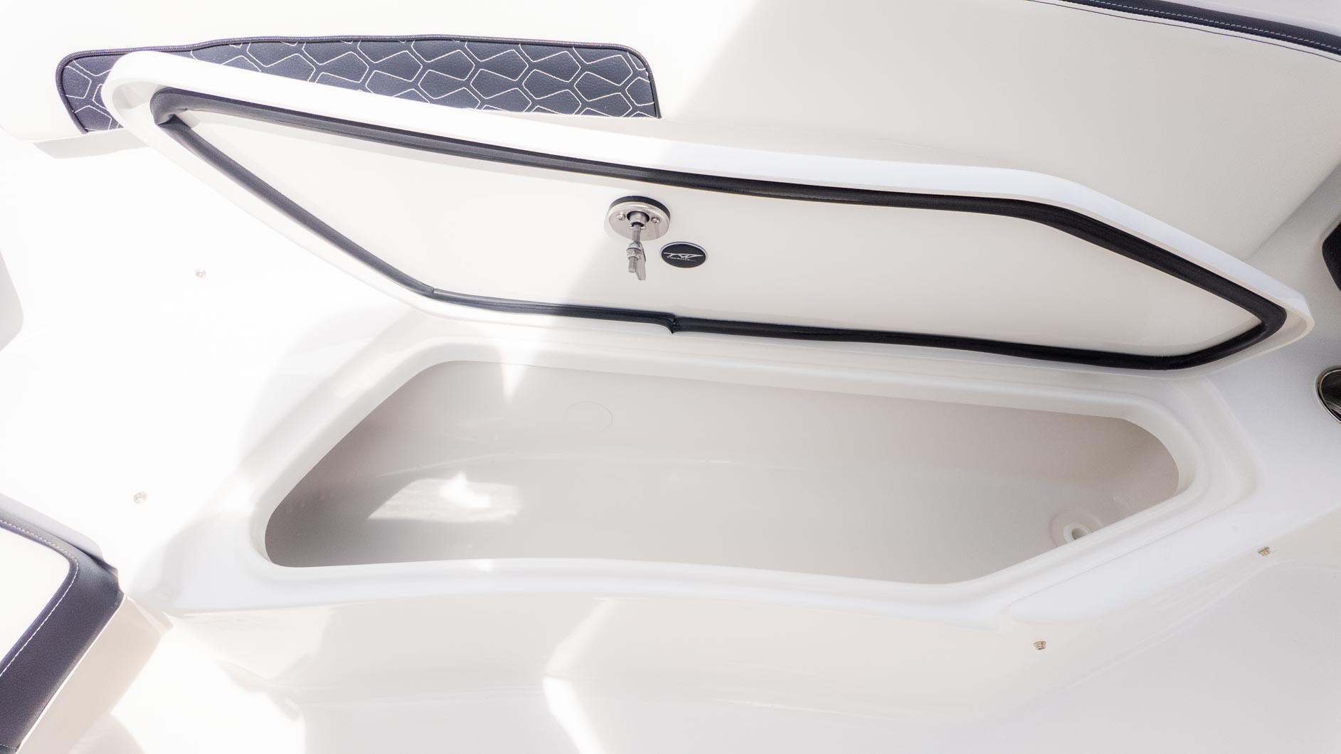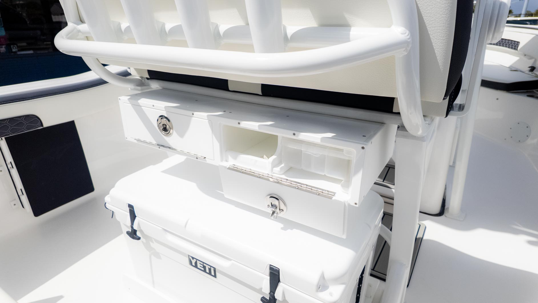 Imagine a day with a couple of your best friends on the water. The boat is equipped with a 26-gallon aerated livewell, perfect for keeping your bait fresh for a day of fishing. The large console with a companion footrest and a deluxe drop bolster leaning post with backrest ensures a comfortable ride. The bow has port and starboard bow boxes, each with 33 gallons of storage, keeping the deck clean and tidy.