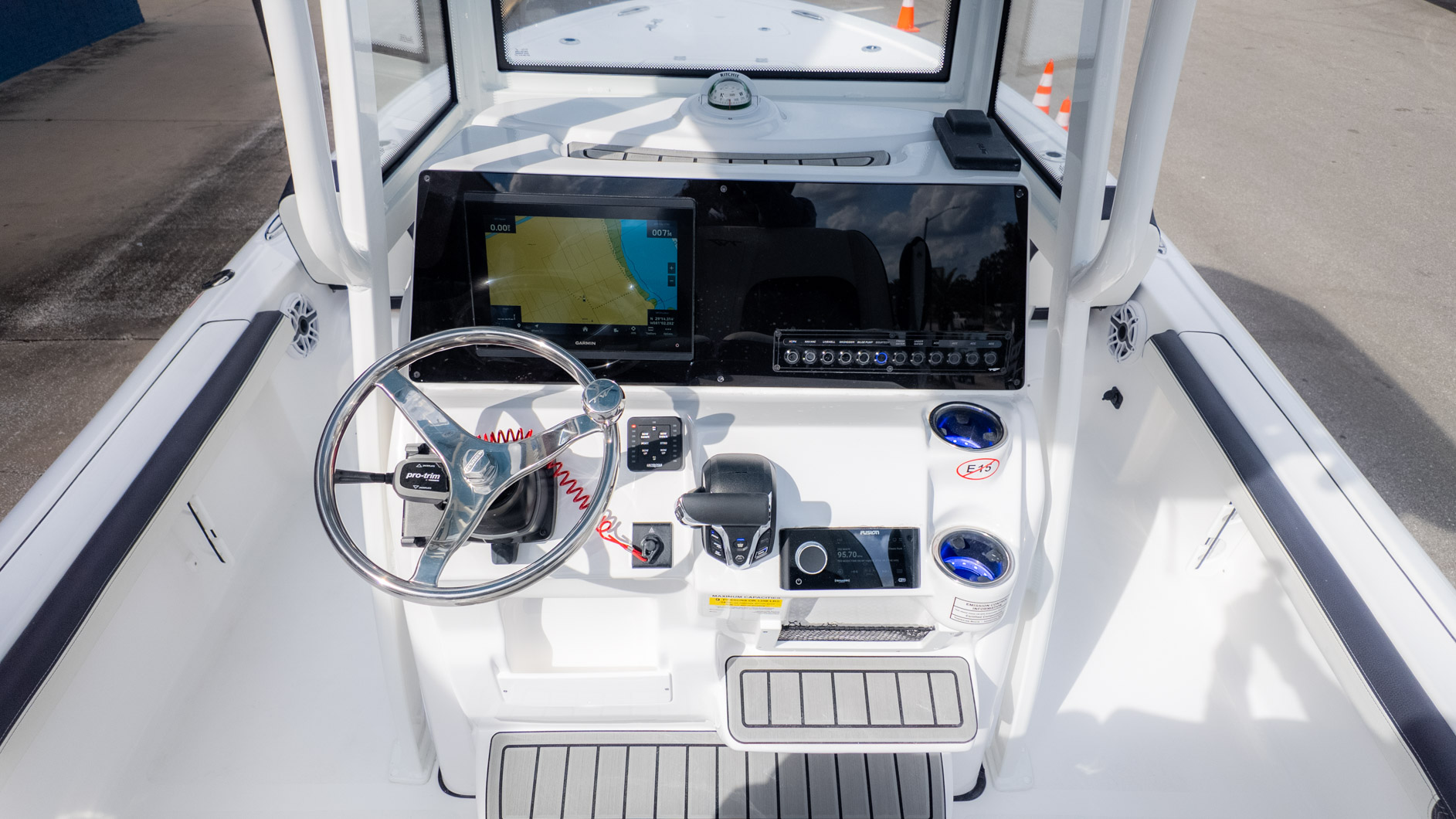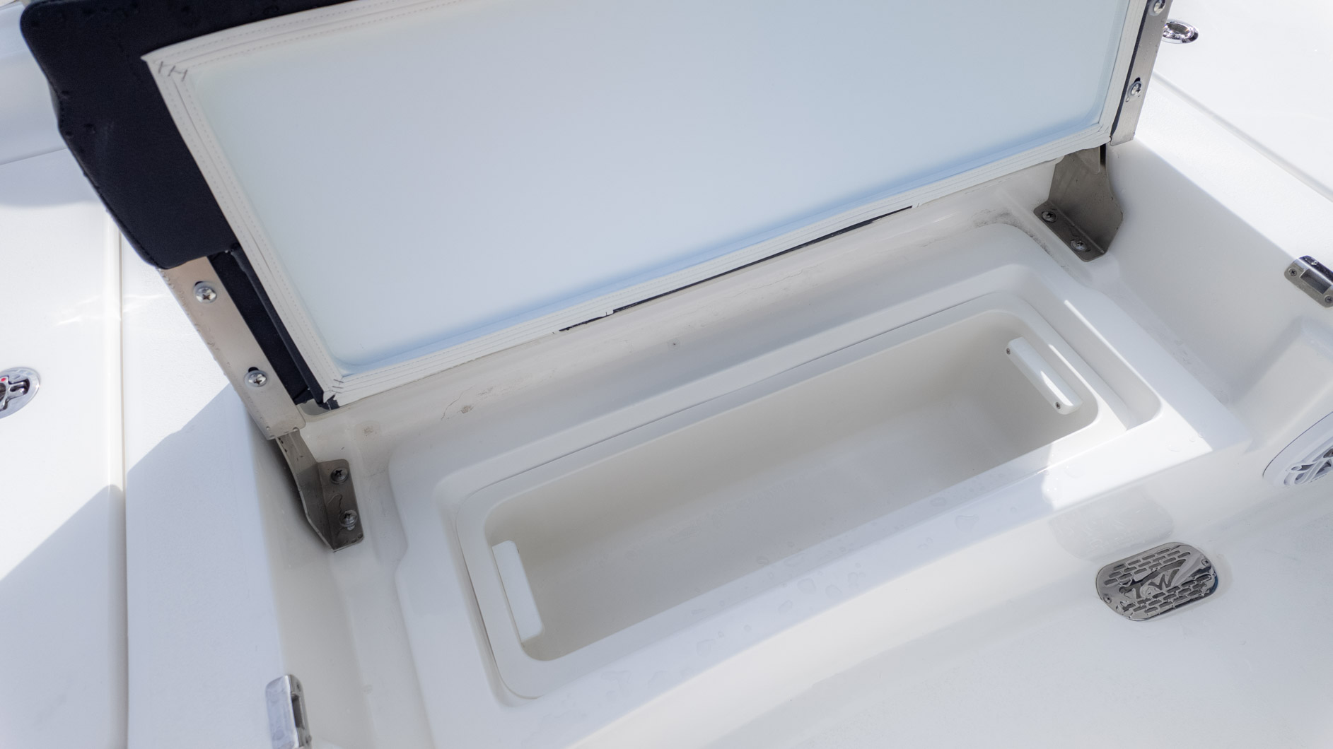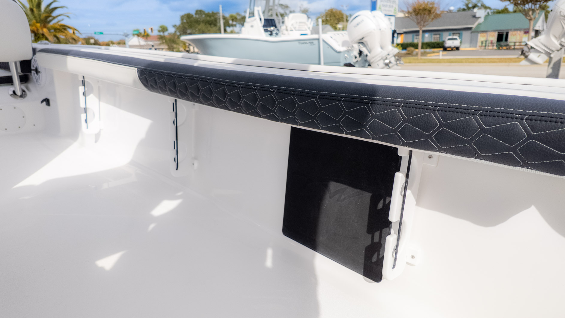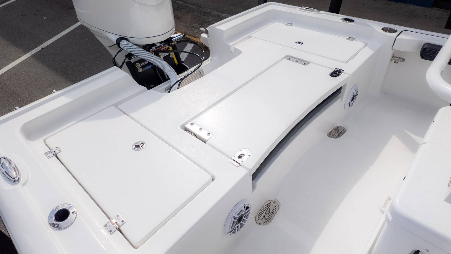 This boat is built for action, whether you're chasing the big ones or just enjoying the sun. You've got twin 30-gallon insulated stern livewells and an additional 12-gallon insulated bow livewell to keep your tournament catch fresh, or maybe just the day's refreshments chilled. For the serious fisherman, you'll appreciate the two extra pairs of stainless steel rod holders—one mid-bow and one bow in the deck —and the dedicated rod storage that can handle a 75-foot rod. Plus, the tackle storage integrated into the Deluxe Drop Bolster Leaning Post means less clutter and more fishing time.