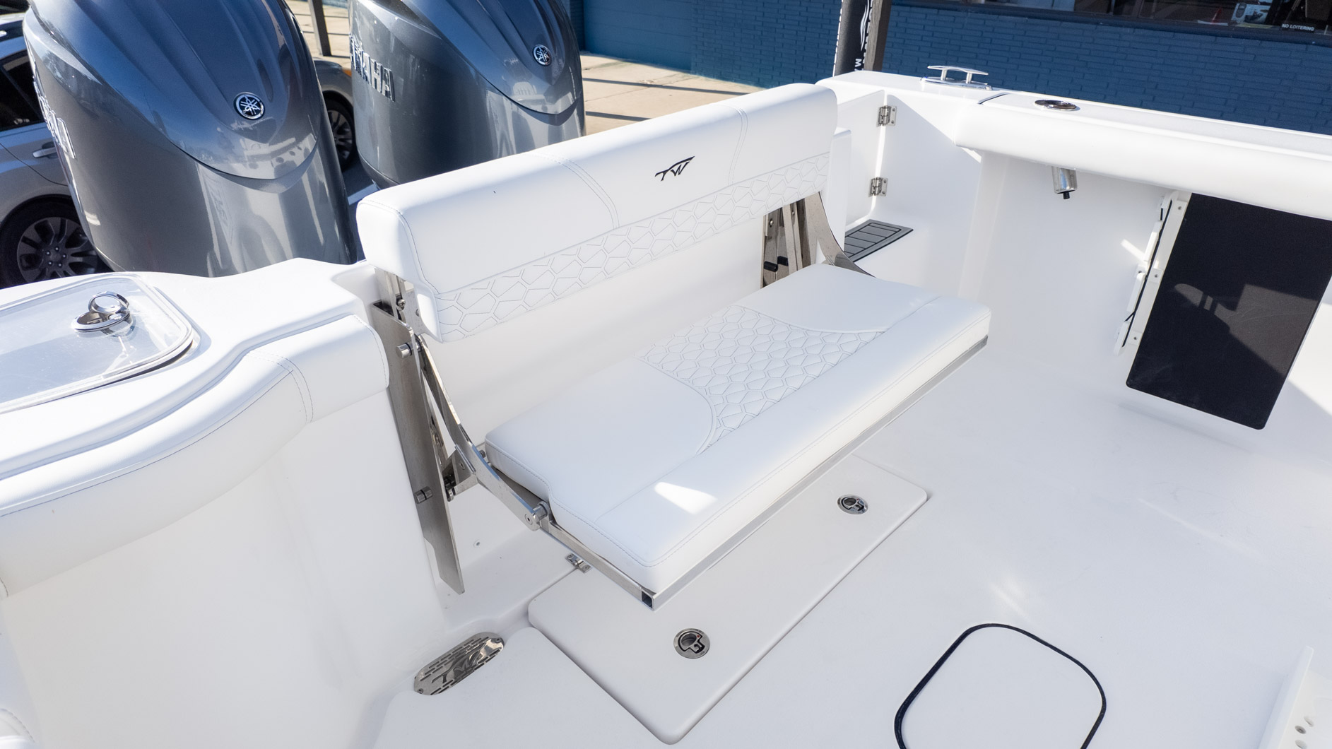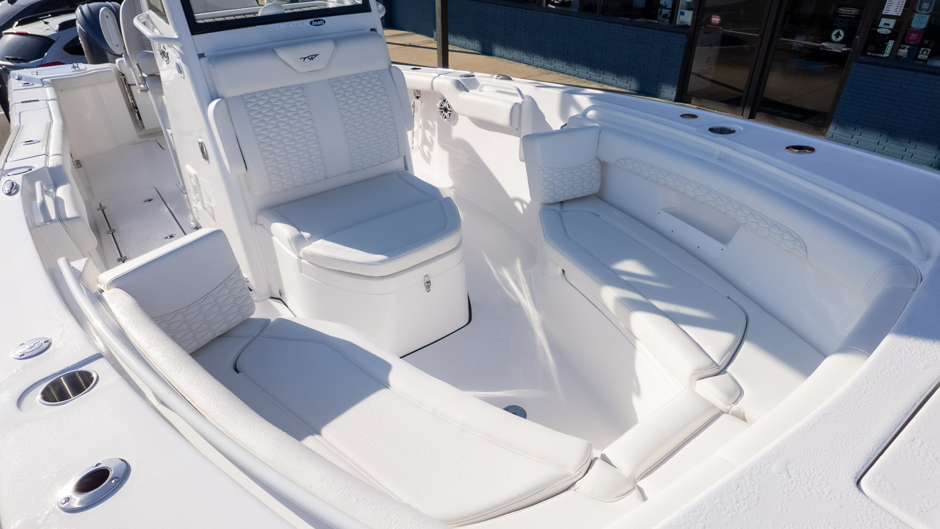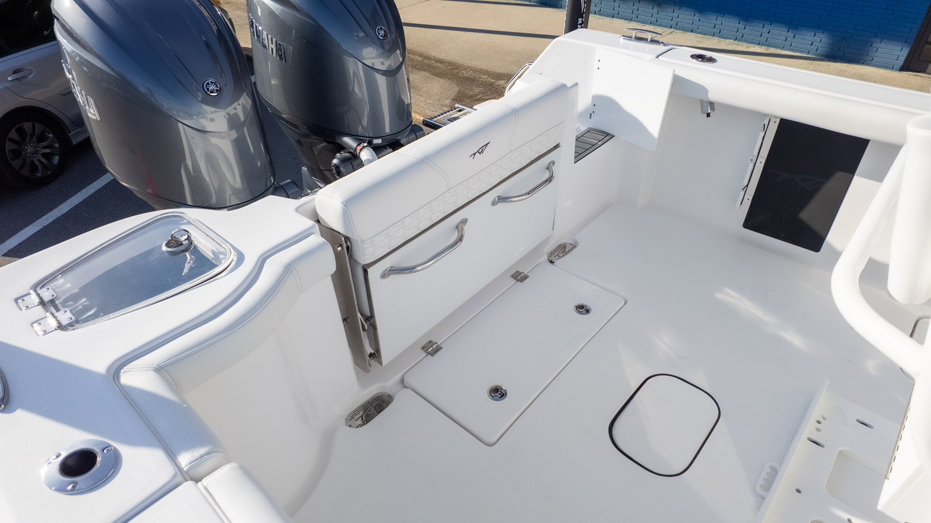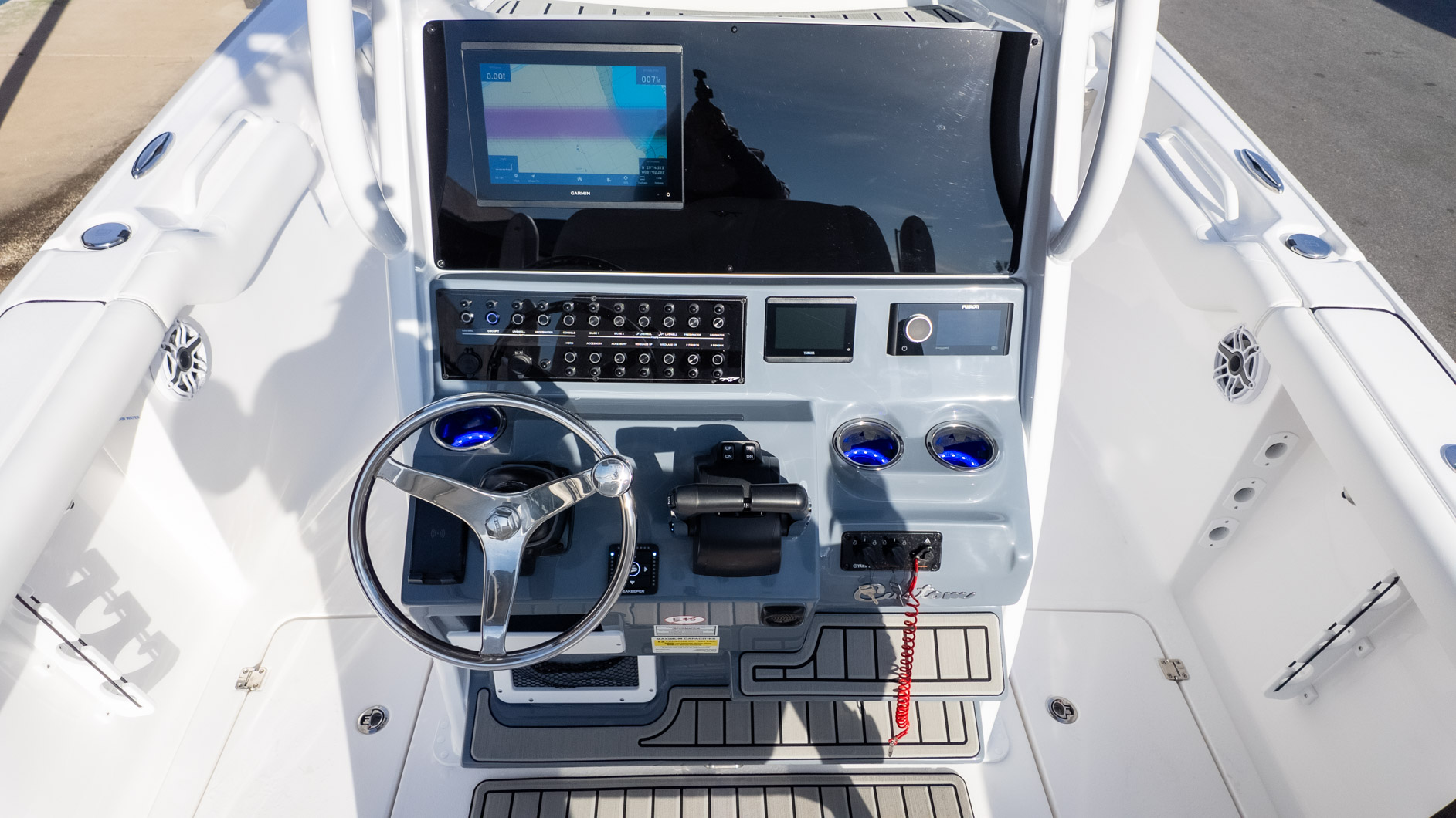 For the anglers, the twin 30-gallon macerated floor fish boxes and 28-gallon livewell mean business, while the extra bow rod holders ensure you’re always ready for the strike. When the rods are stowed, the vibe shifts instantly to entertainment. The premium JL Audio system, complete with subwoofers and an amp, sets the soundtrack, while the adjustable bow table with filler creates the ultimate alfresco dining spot. Use the dive door for easy dips in the turquoise water, then rinse off with the fresh water shower before settling into the fold-down transom seat. Powered by reliable Twin Yamaha engines and smoothed out by the SeaKeeper Ride system, this center console turns every outing into a masterclass in fun.