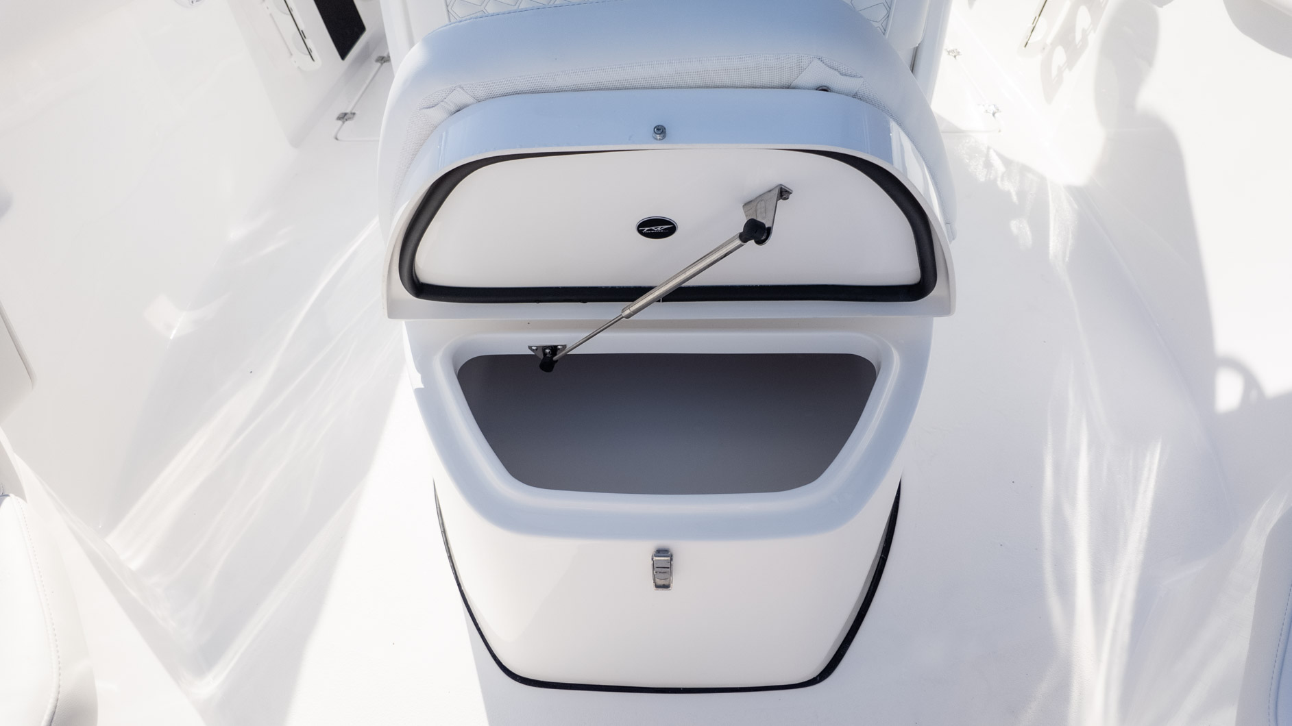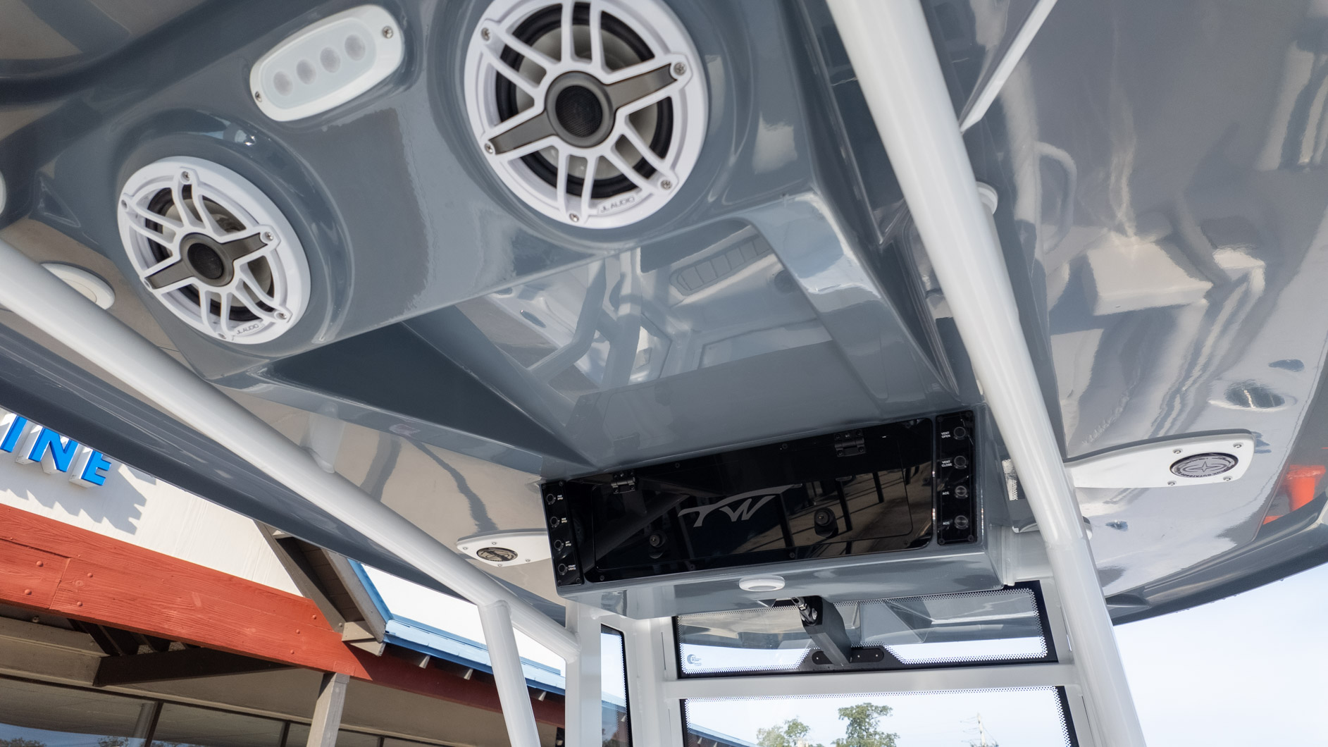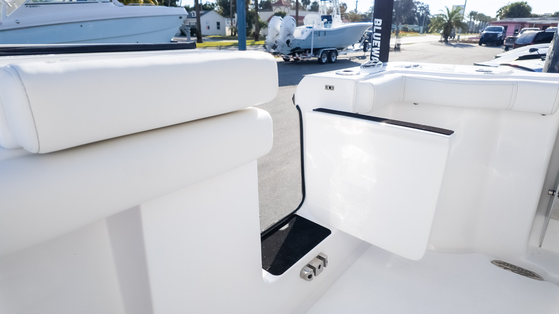 For the anglers, the twin 30-gallon macerated floor fish boxes and 28-gallon livewell mean business, while the extra bow rod holders ensure you’re always ready for the strike. When the rods are stowed, the vibe shifts instantly to entertainment. The premium JL Audio system, complete with subwoofers and an amp, sets the soundtrack, while the adjustable bow table with filler creates the ultimate alfresco dining spot. Use the dive door for easy dips in the turquoise water, then rinse off with the fresh water shower before settling into the fold-down transom seat. Powered by reliable Twin Yamaha engines and smoothed out by the SeaKeeper Ride system, this center console turns every outing into a masterclass in fun.
