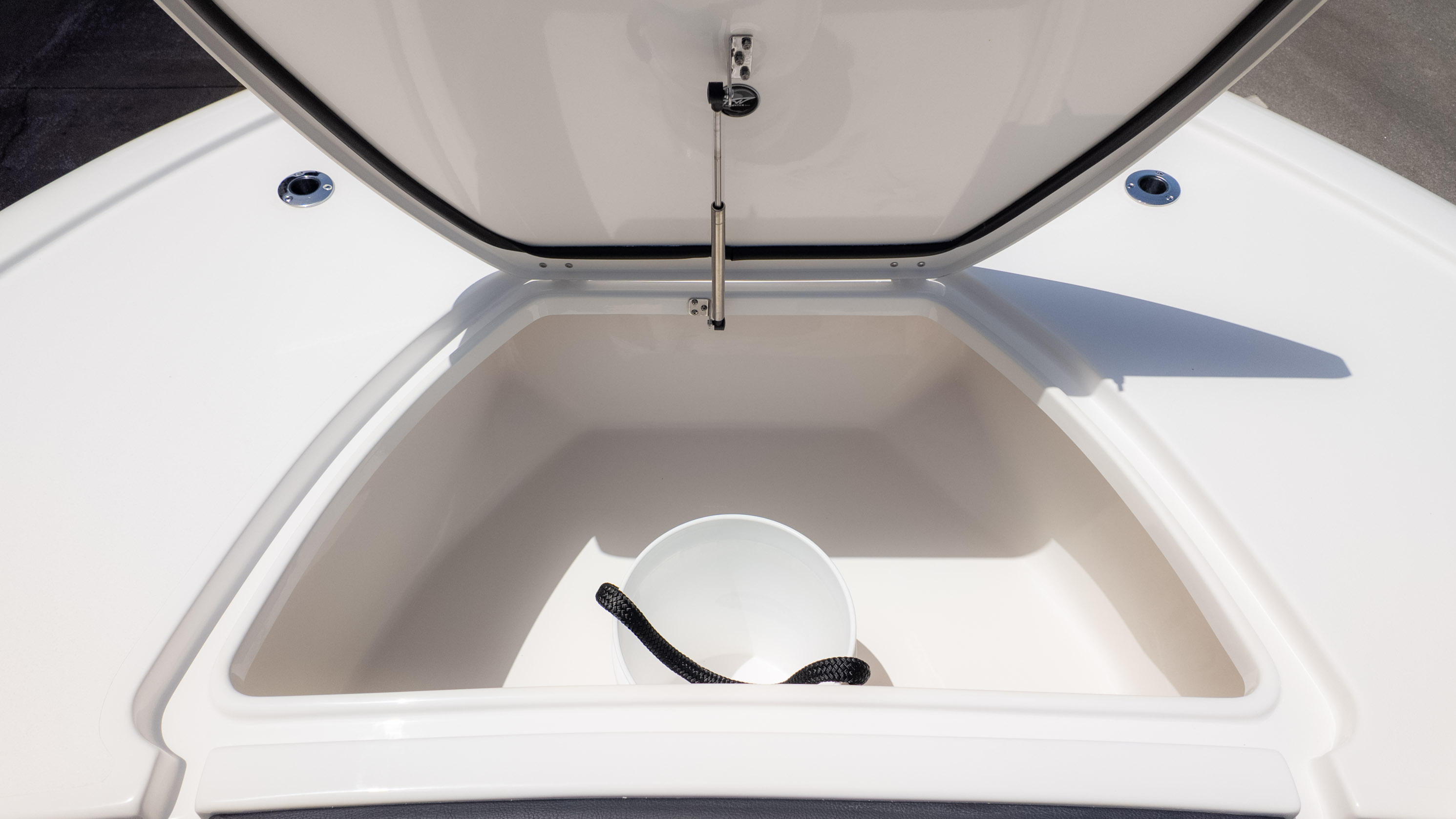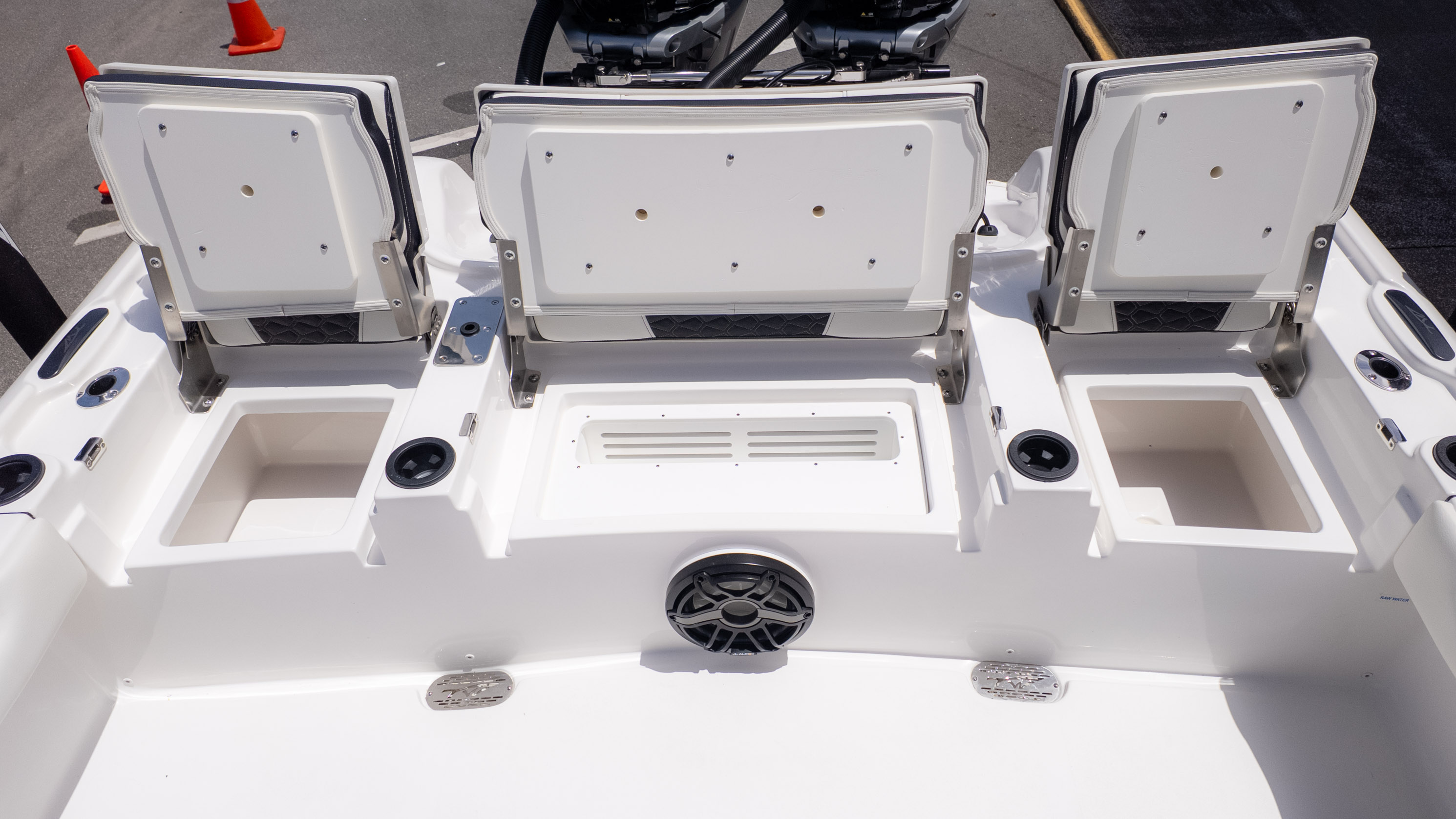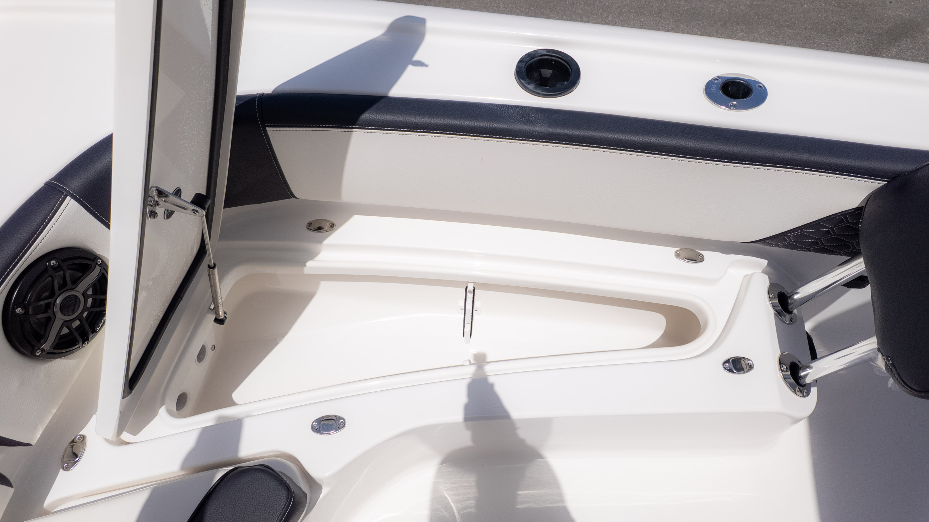 But it's not all about the catch! The 2700 CB also boasts amenities for ultimate comfort and good times. Picture lounging on the recessed bow seating with cushions and backrests or enjoying the stern flip-up bench and jump seats – perfect for socializing with friends and family. The fiberglass T-Top with a glass enclosure and a hardtop in black and white provides excellent shade and style. For the audiophiles, the JL Audio system with multiple speakers and an 8-channel amp promises a premium sound experience. Plus, with a freshwater shower and dual swim platforms with ladders, you can easily cool off and get back on board for more fun in the sun. This boat is truly built for making memories on the water, whether you're reeling in a trophy or simply enjoying the cruise with the power of the Verado.