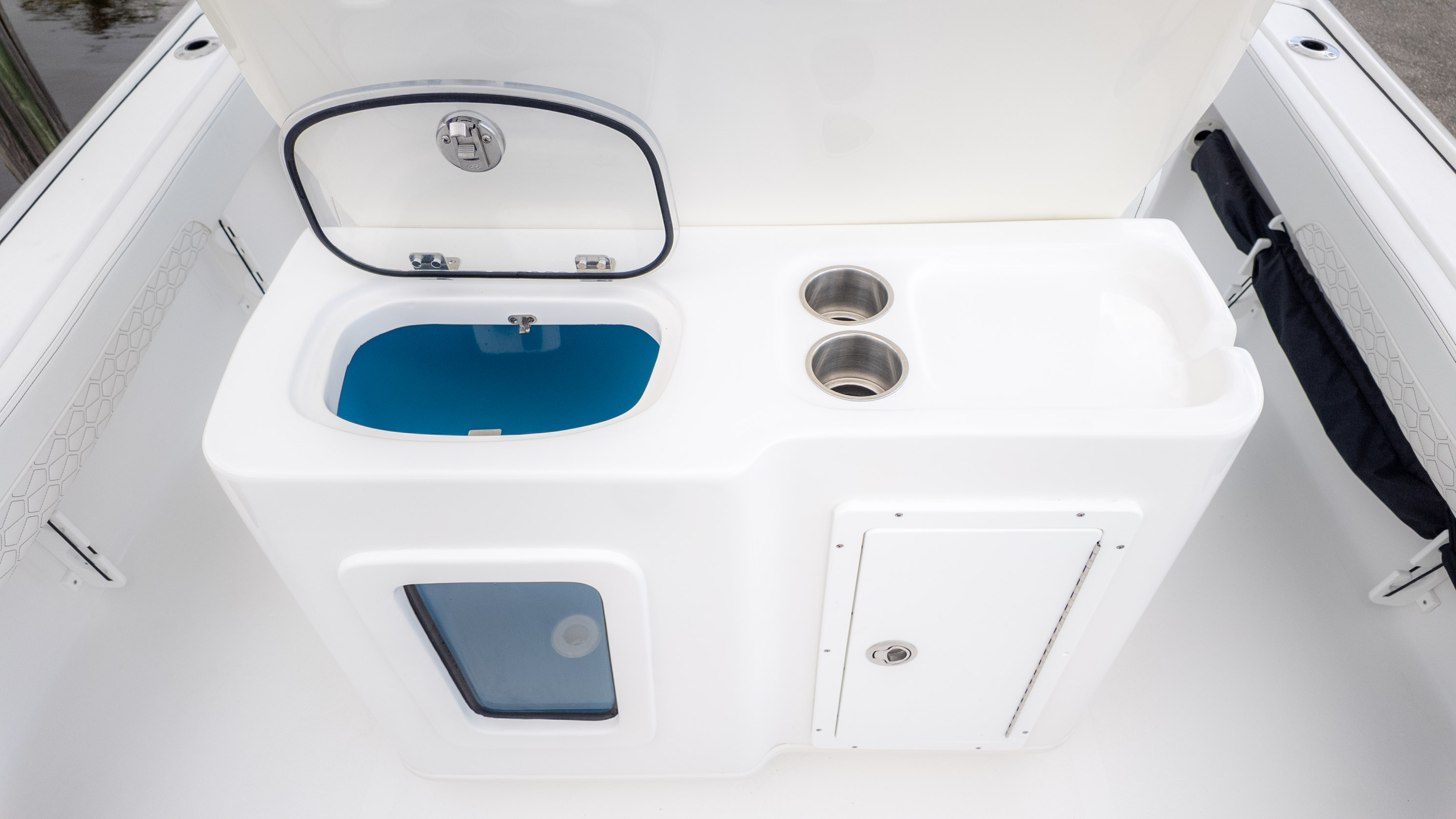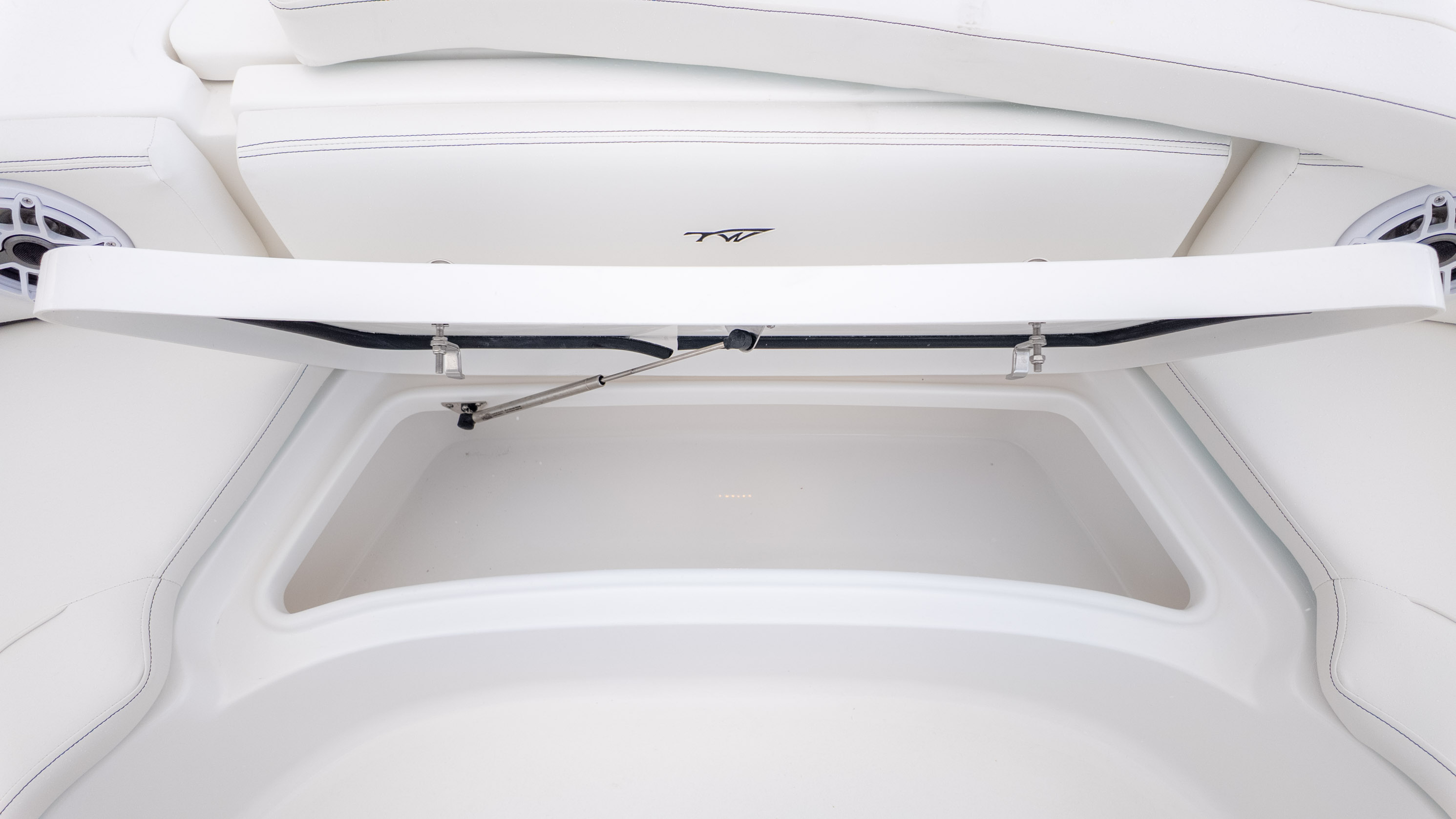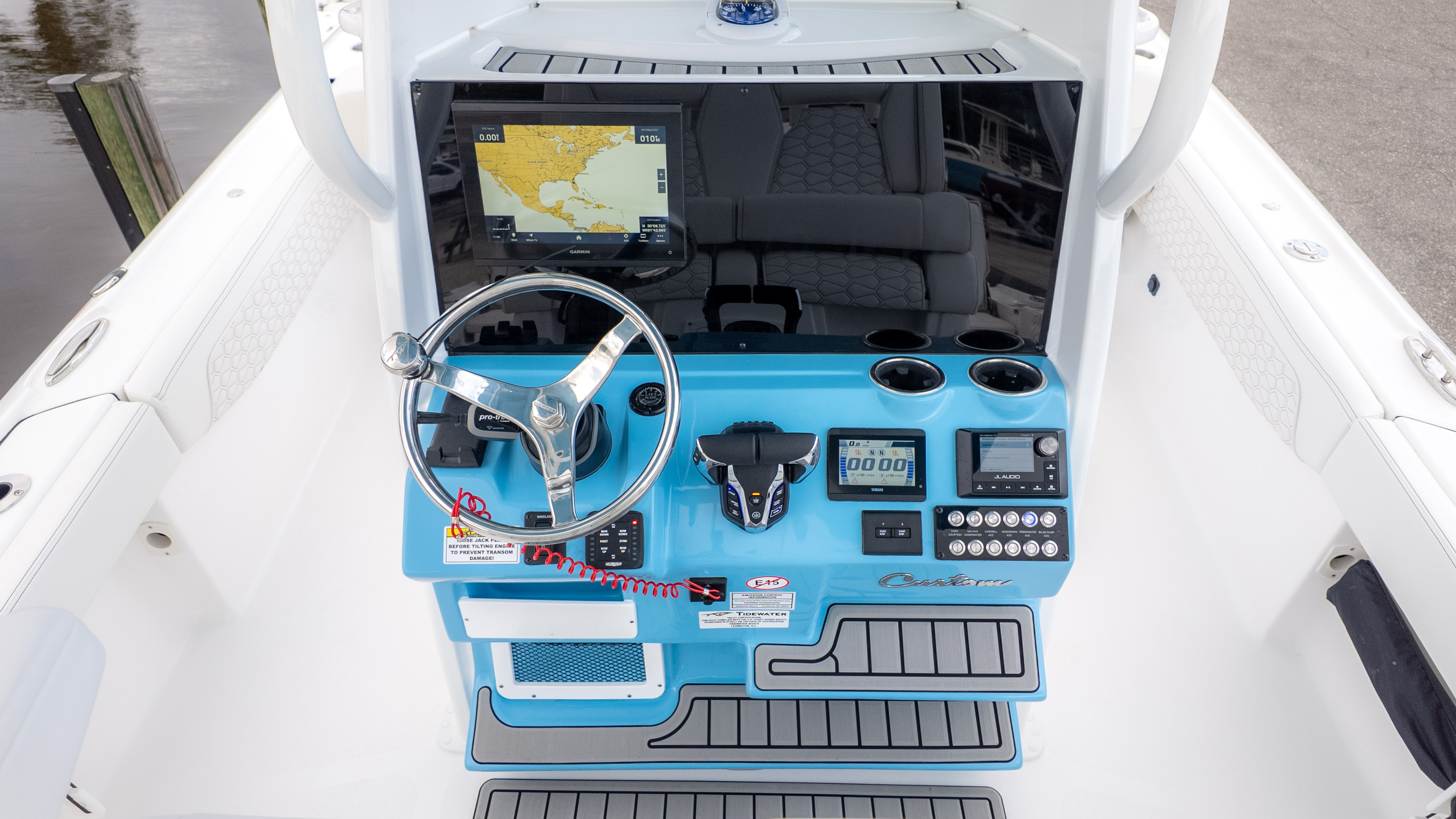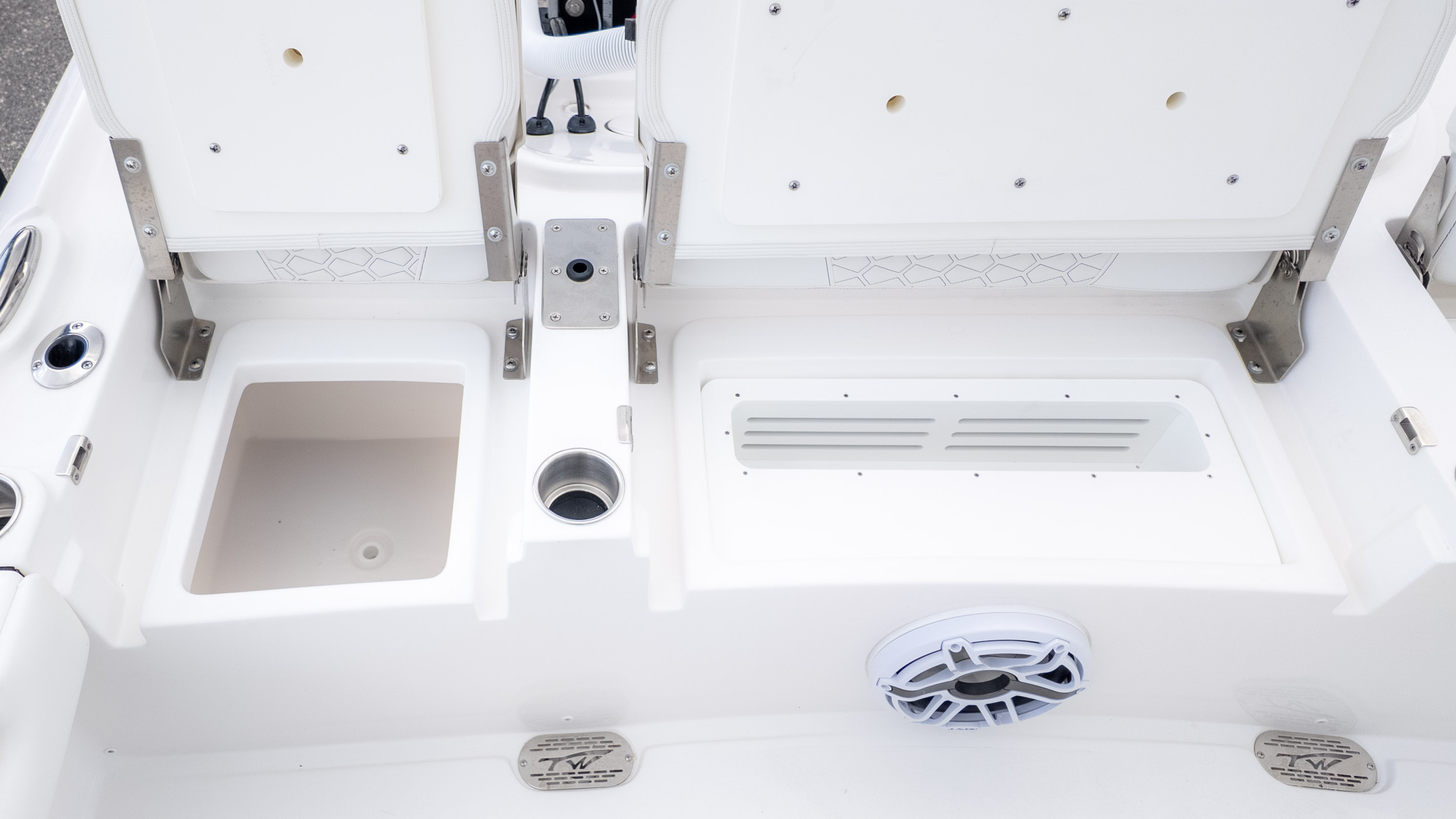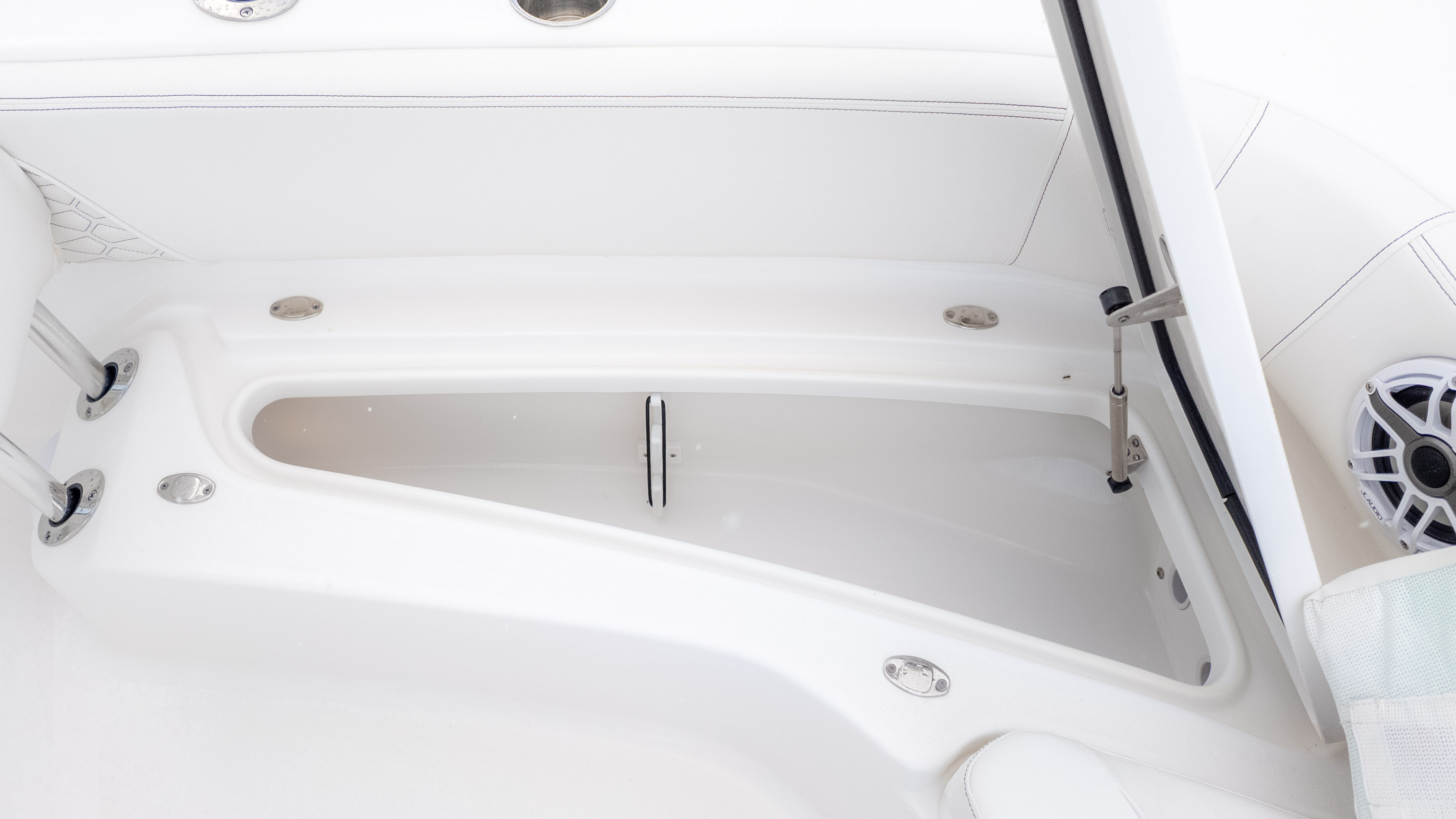 It's truly a party on the water, especially with the JL MM 105 sound system featuring six M6 JL Speakers and a 6-channel amp, plus an M6 JL 10" Sub to really get the tunes pumping! For the angler, there's a fantastic Fiberglass Super Deluxe Livewell Aquarium with a Tackle Center, and even a 26-gallon insulated livewell with tackle storage and a freshwater shower. Don't forget the King Fish Rod Holders on the T-Top!