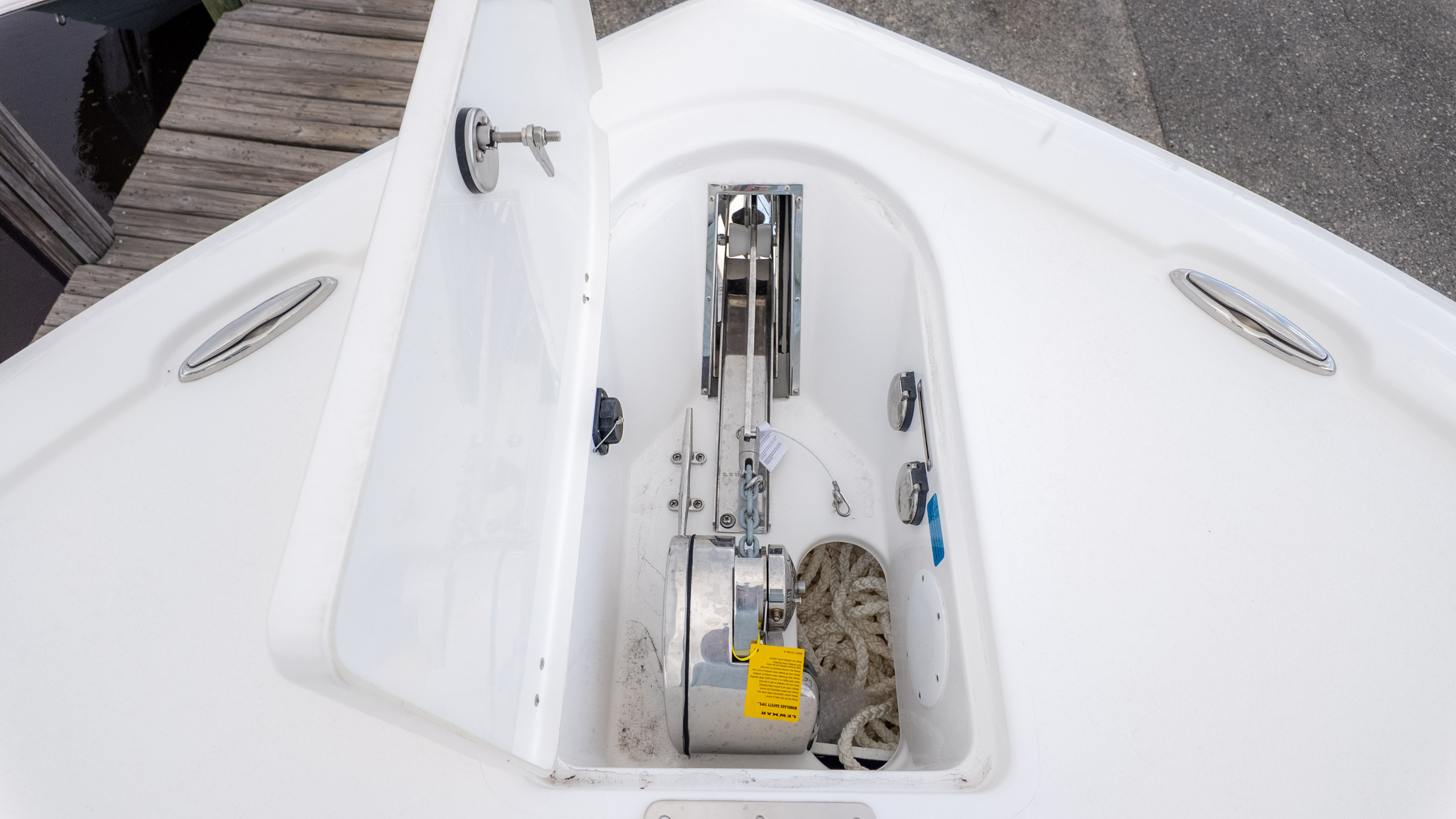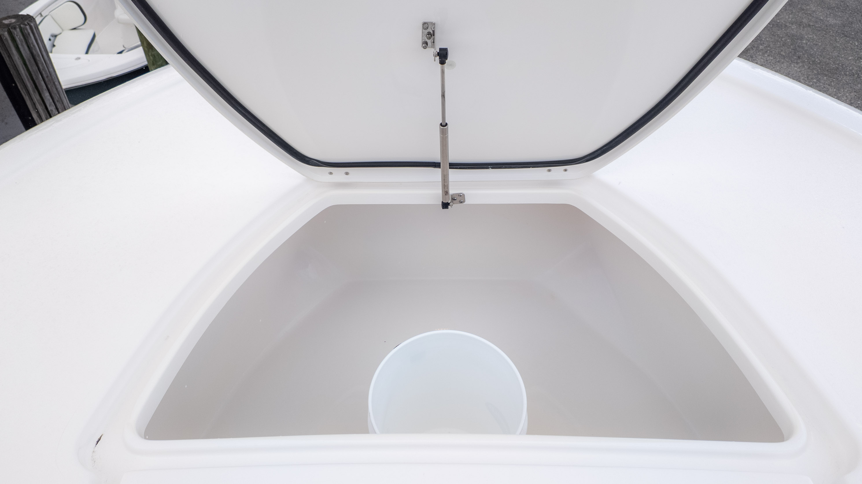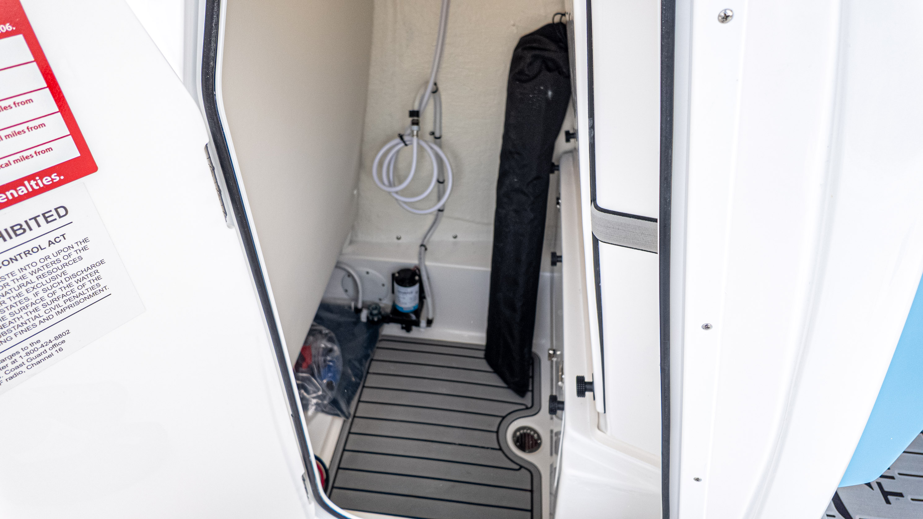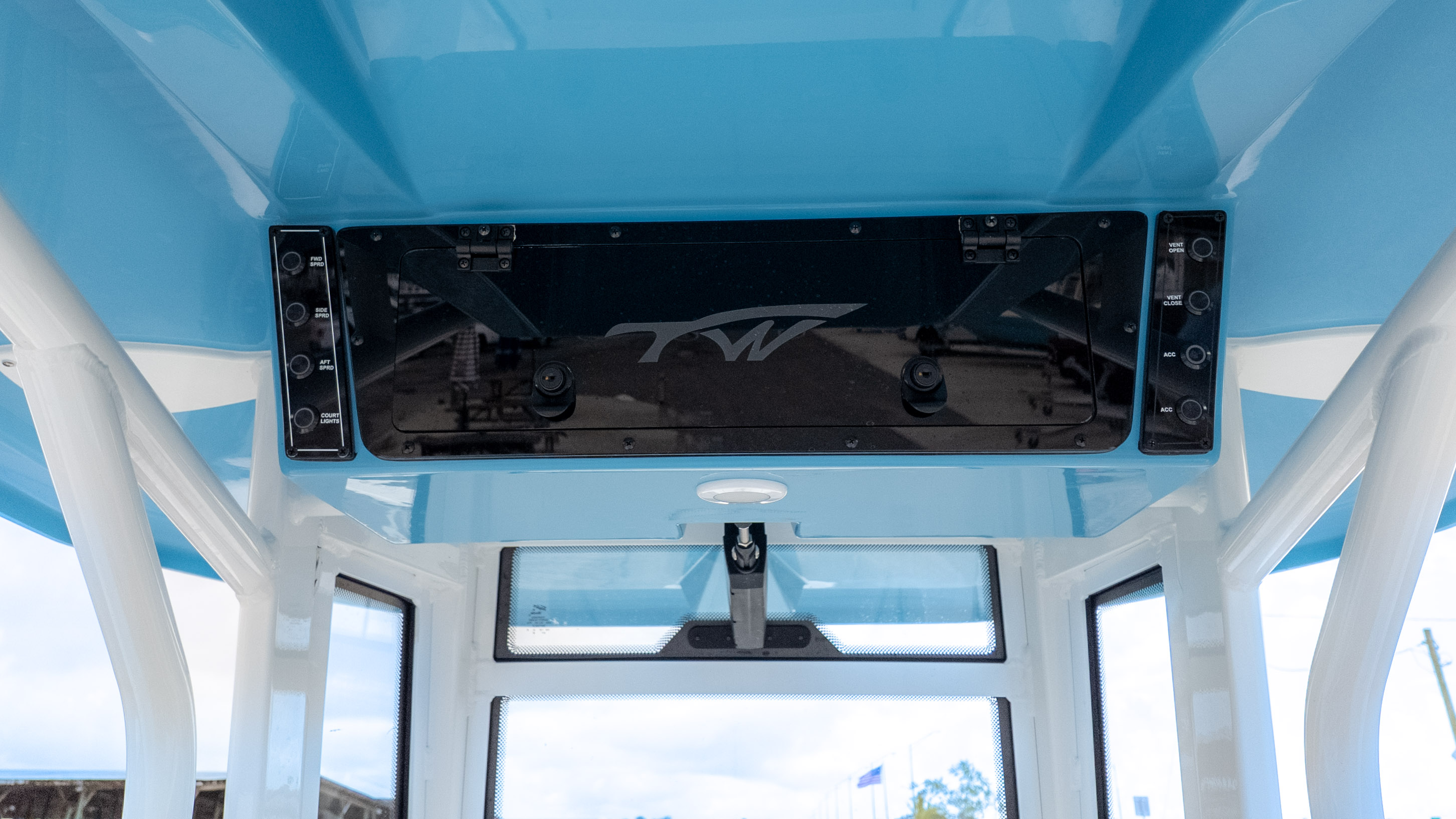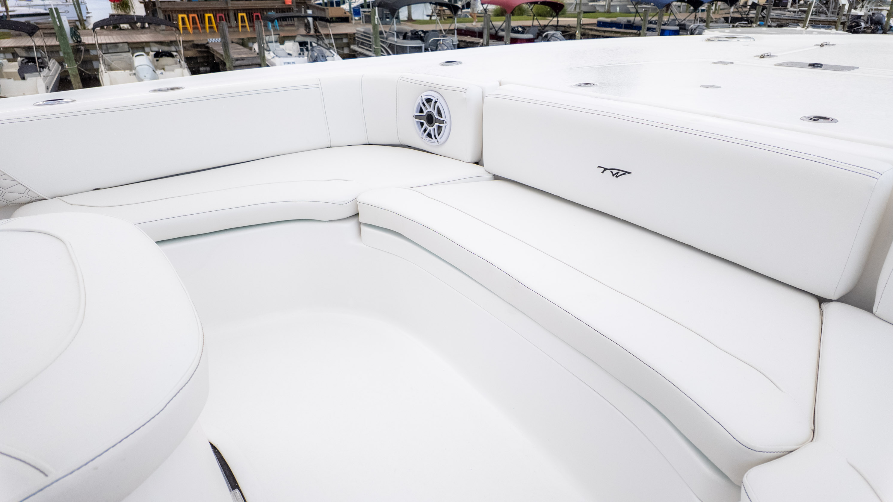 It's truly a party on the water, especially with the JL MM 105 sound system featuring six M6 JL Speakers and a 6-channel amp, plus an M6 JL 10" Sub to really get the tunes pumping! For the angler, there's a fantastic Fiberglass Super Deluxe Livewell Aquarium with a Tackle Center, and even a 26-gallon insulated livewell with tackle storage and a freshwater shower. Don't forget the King Fish Rod Holders on the T-Top!
