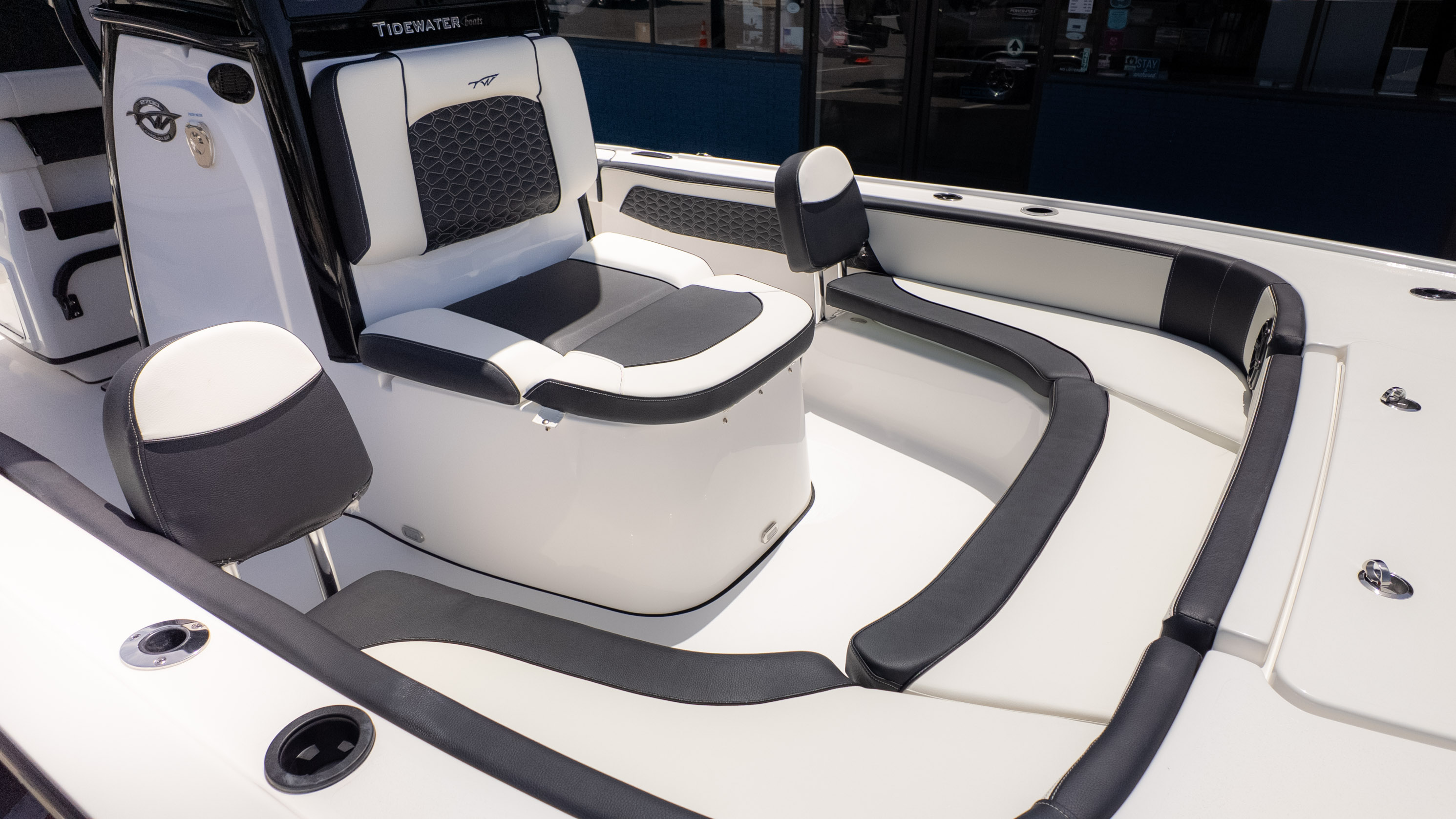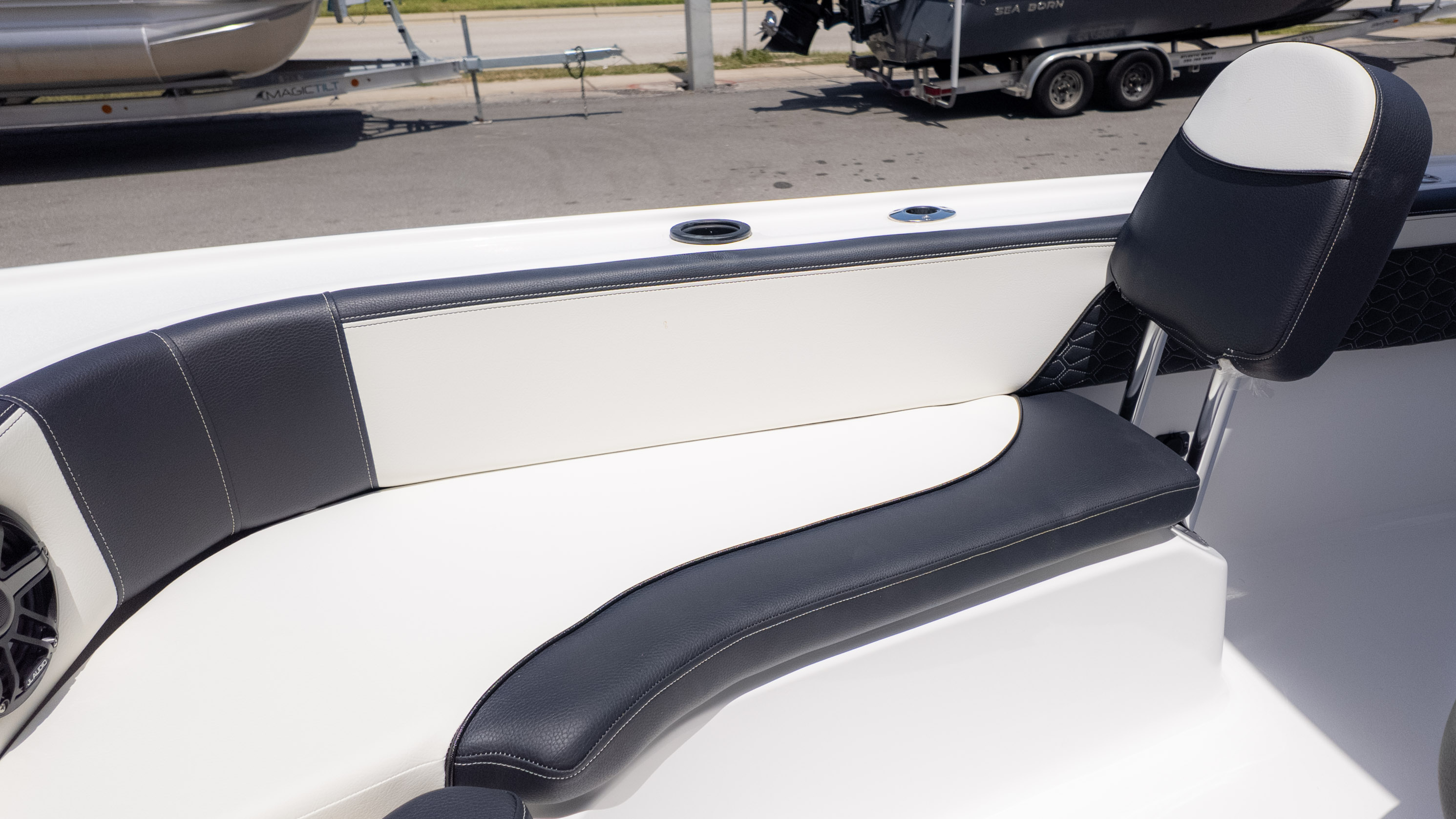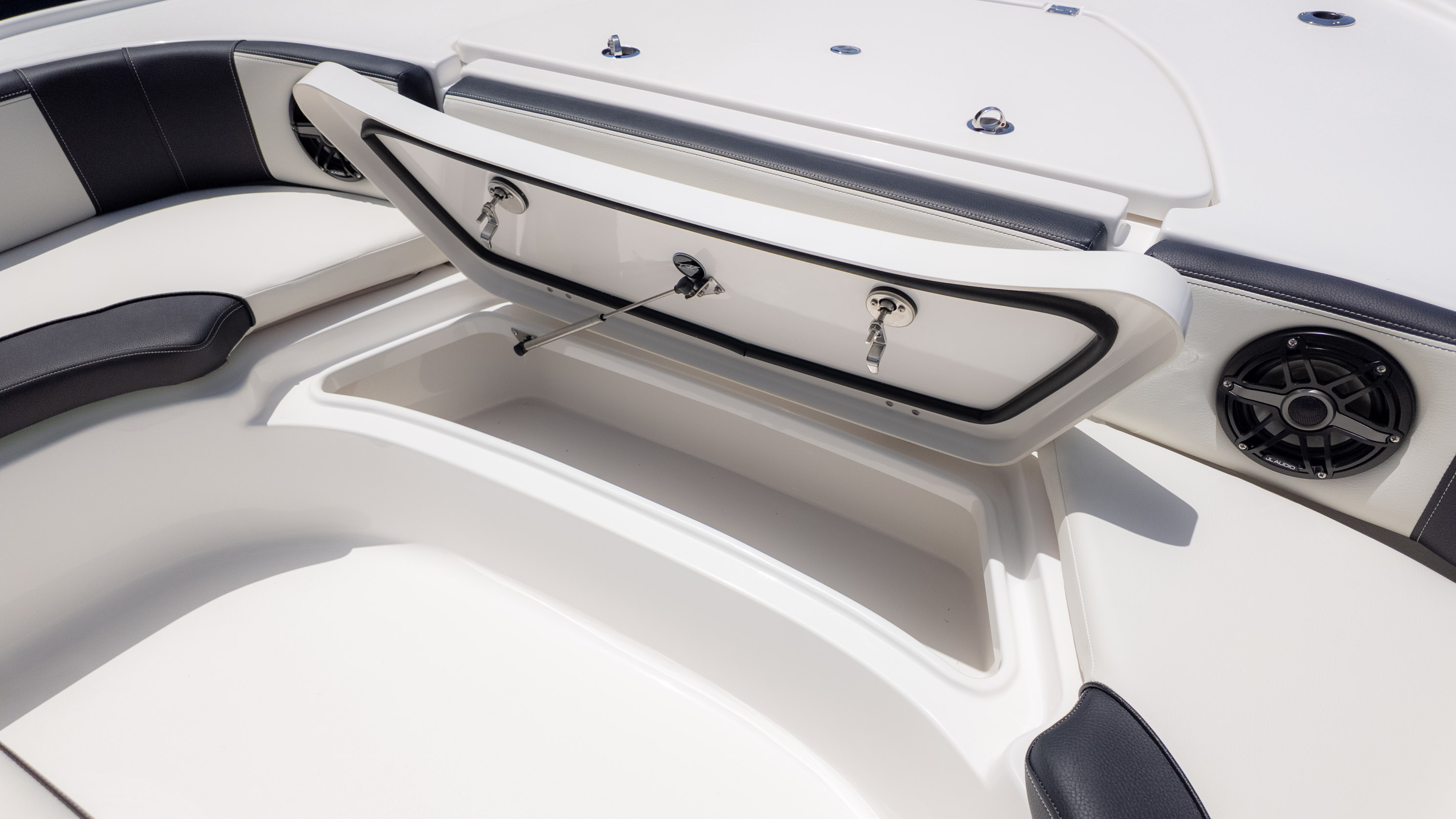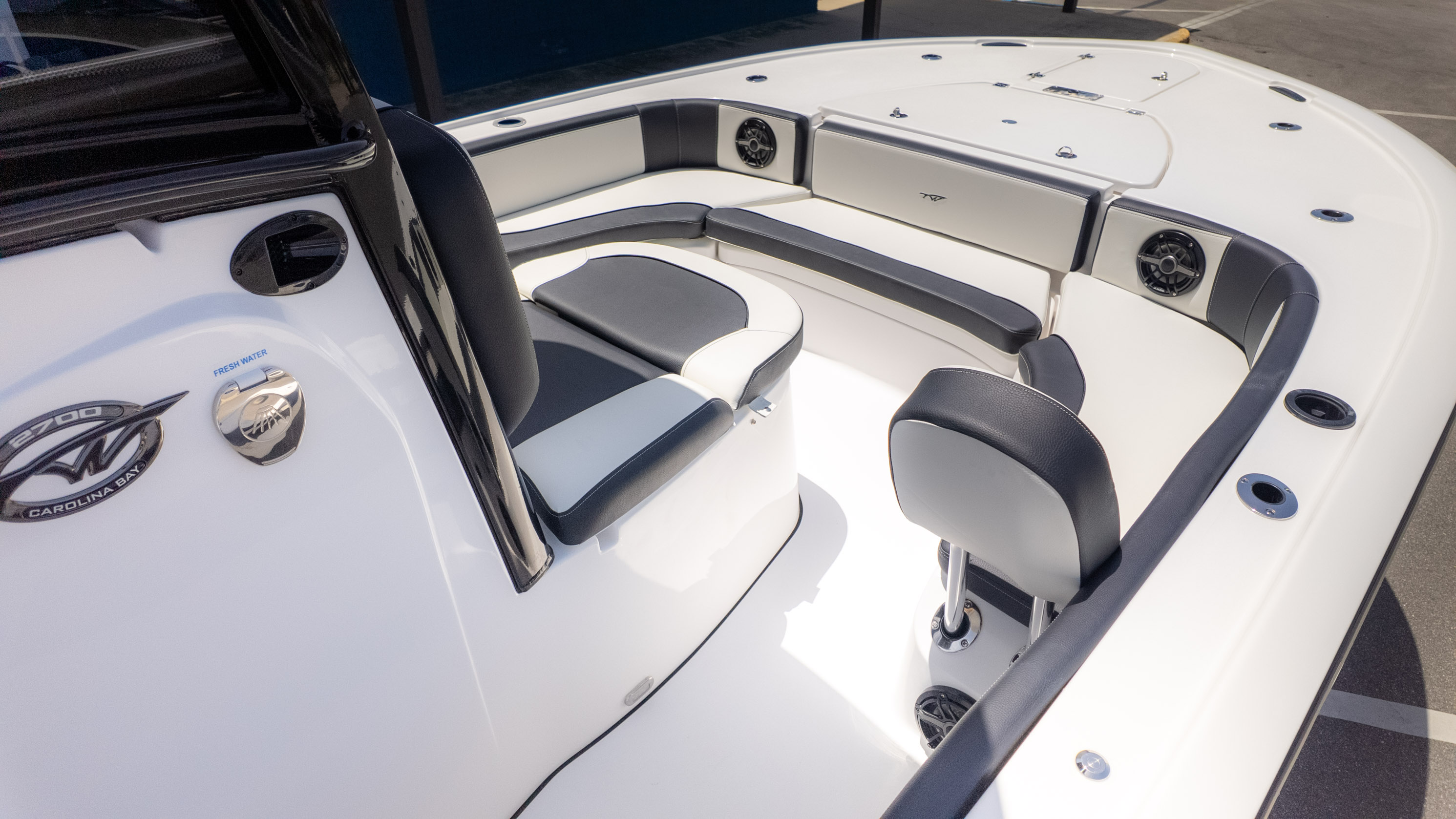But it's not all about the catch! The 2700 CB also boasts amenities for ultimate comfort and good times. Picture lounging on the recessed bow seating with cushions and backrests or enjoying the stern flip-up bench and jump seats – perfect for socializing with friends and family. The fiberglass T-Top with a glass enclosure and a hardtop in black and white provides excellent shade and style. For the audiophiles, the JL Audio system with multiple speakers and an 8-channel amp promises a premium sound experience. Plus, with a freshwater shower and dual swim platforms with ladders, you can easily cool off and get back on board for more fun in the sun. This boat is truly built for making memories on the water, whether you're reeling in a trophy or simply enjoying the cruise with the power of the Verado.