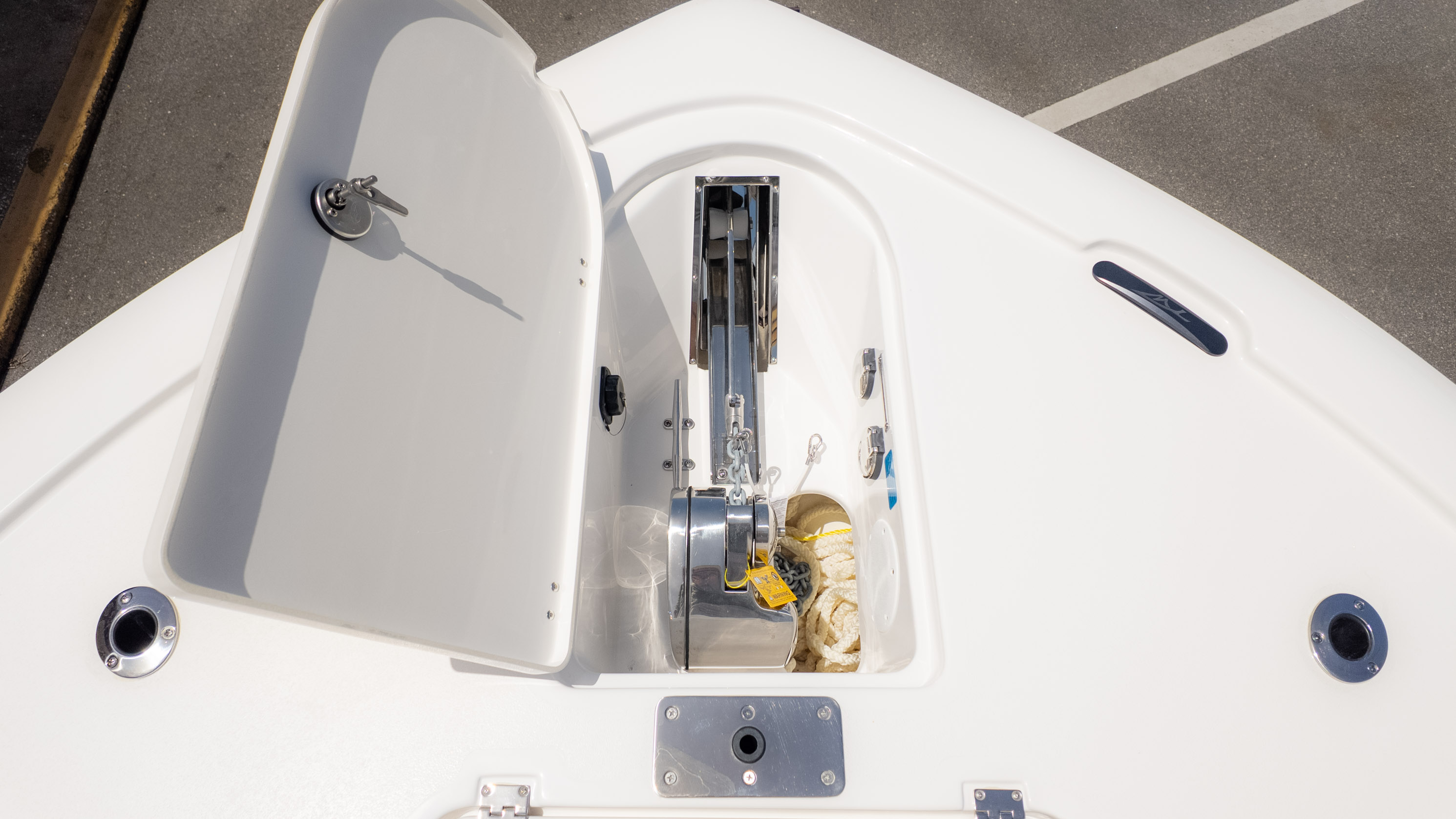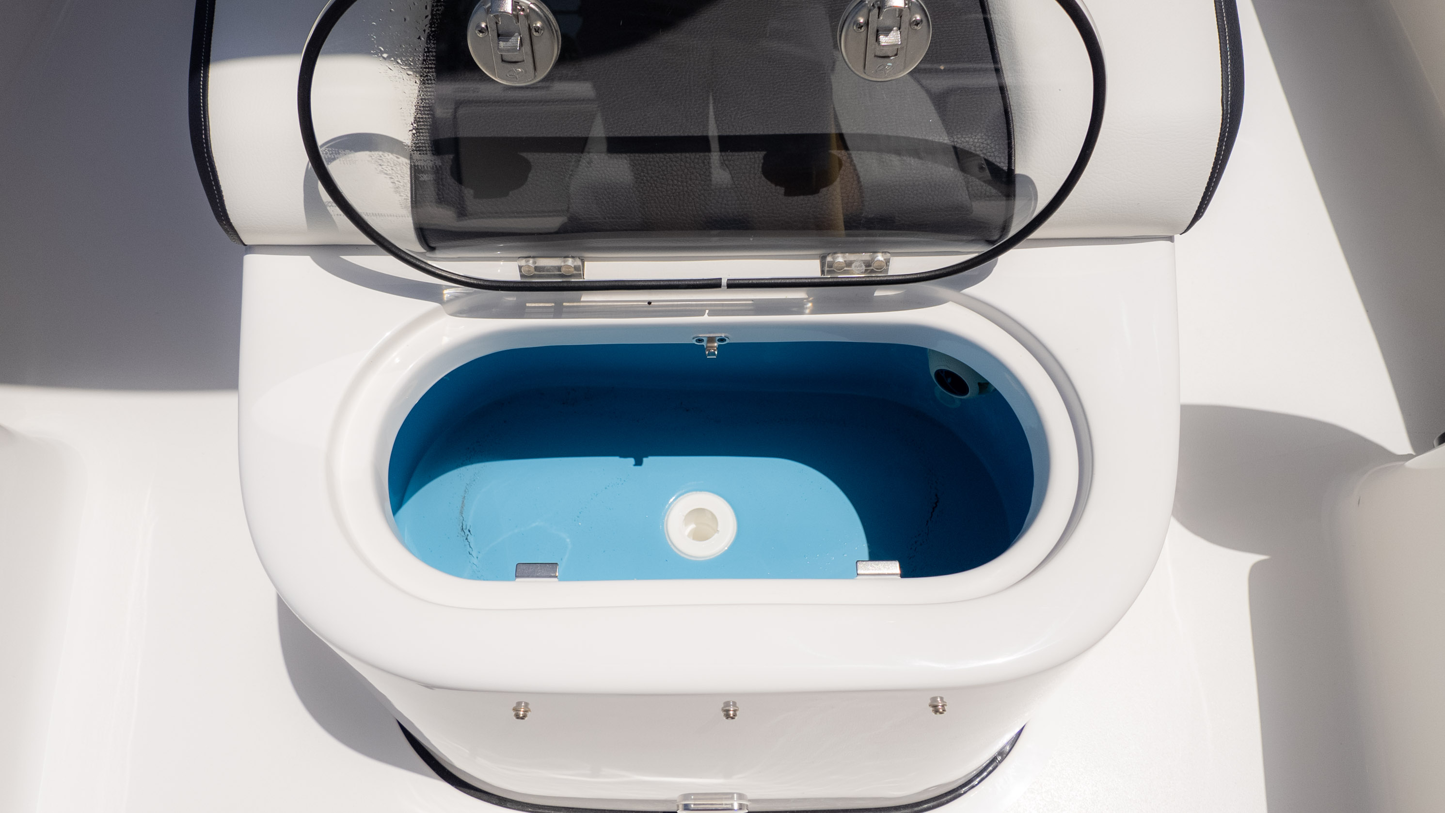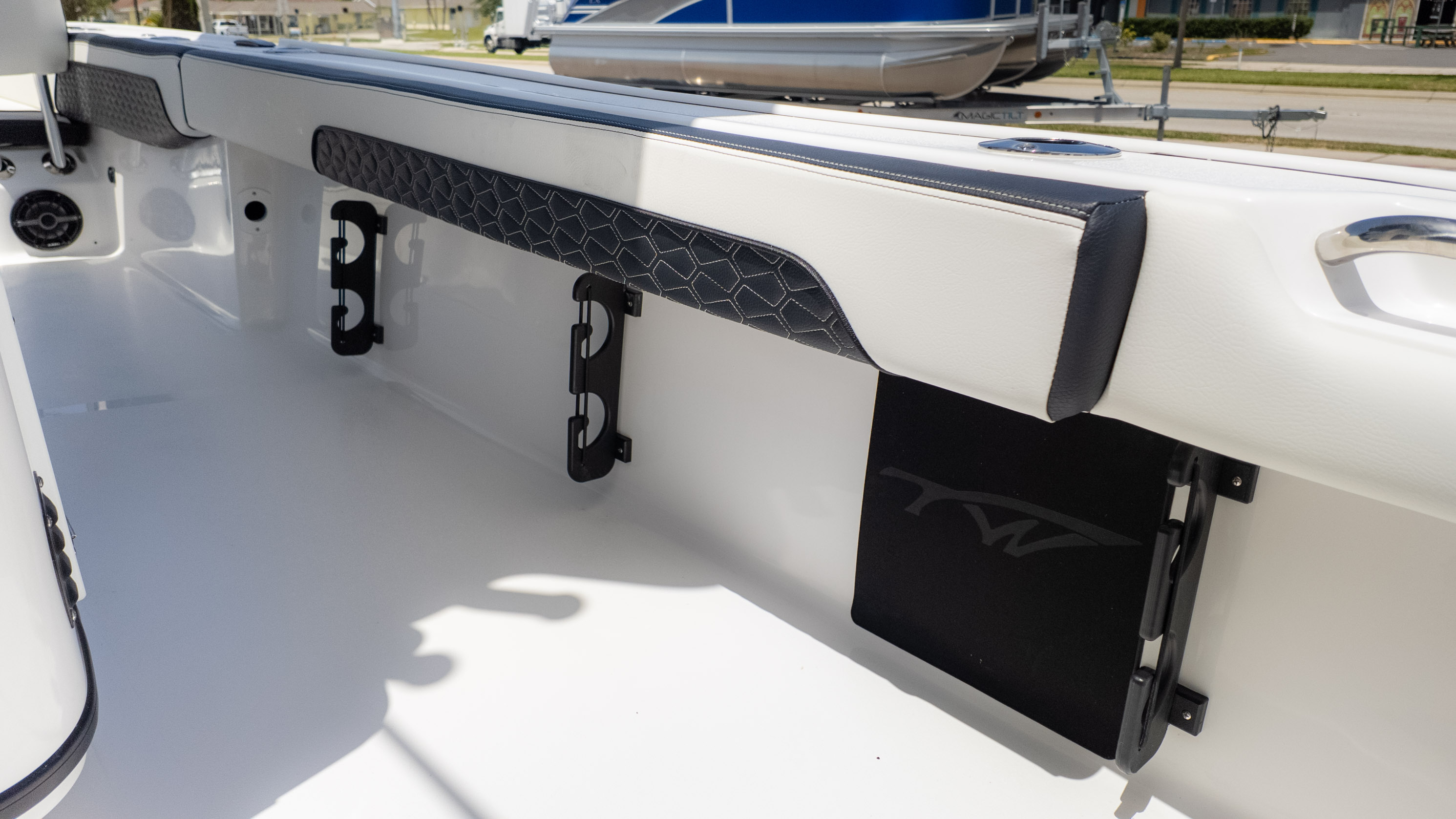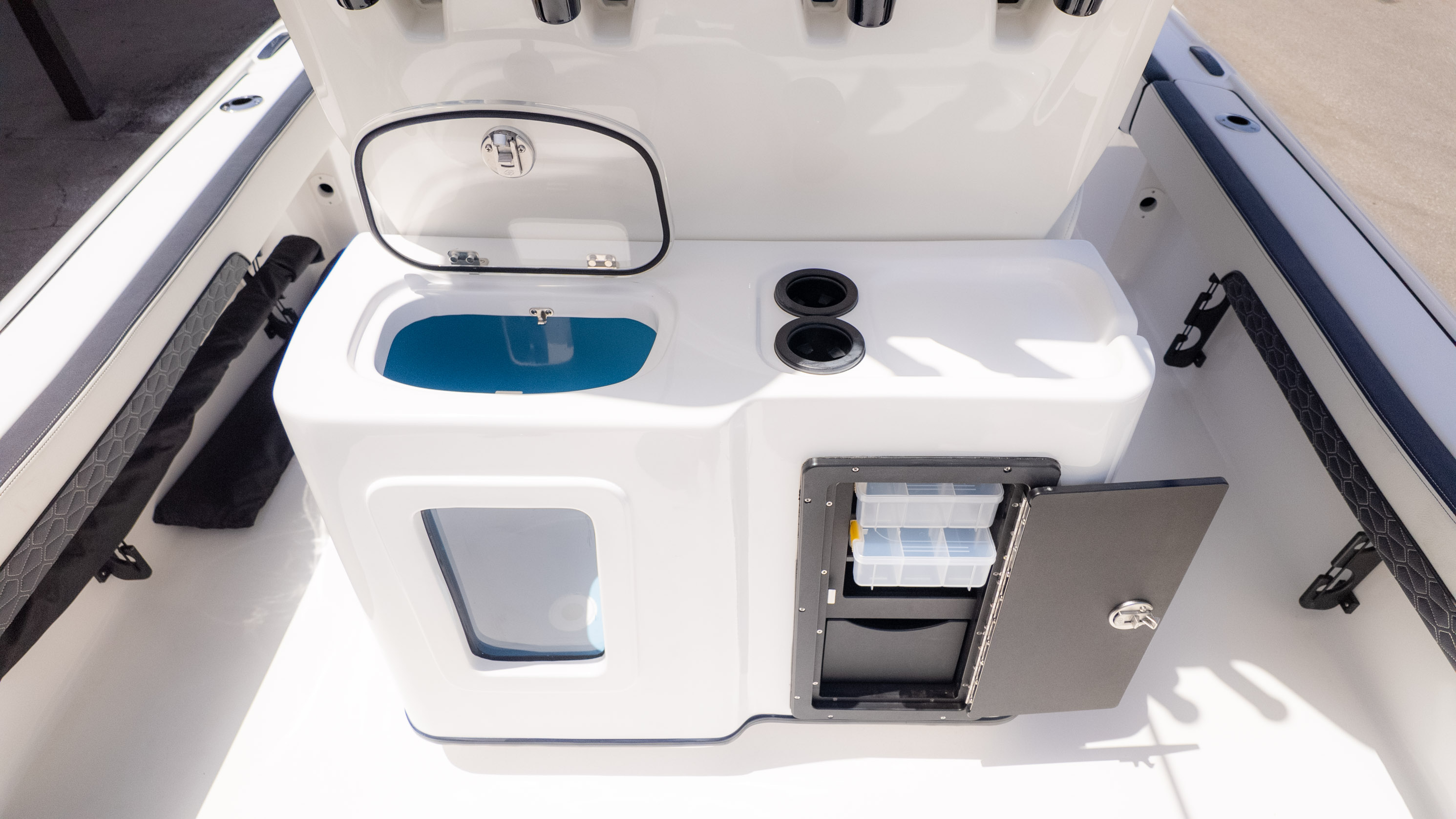 But it's not all about the catch! The 2700 CB also boasts amenities for ultimate comfort and good times. Picture lounging on the recessed bow seating with cushions and backrests or enjoying the stern flip-up bench and jump seats – perfect for socializing with friends and family. The fiberglass T-Top with a glass enclosure and a hardtop in black and white provides excellent shade and style. For the audiophiles, the JL Audio system with multiple speakers and an 8-channel amp promises a premium sound experience. Plus, with a freshwater shower and dual swim platforms with ladders, you can easily cool off and get back on board for more fun in the sun. This boat is truly built for making memories on the water, whether you're reeling in a trophy or simply enjoying the cruise with the power of the Verado.