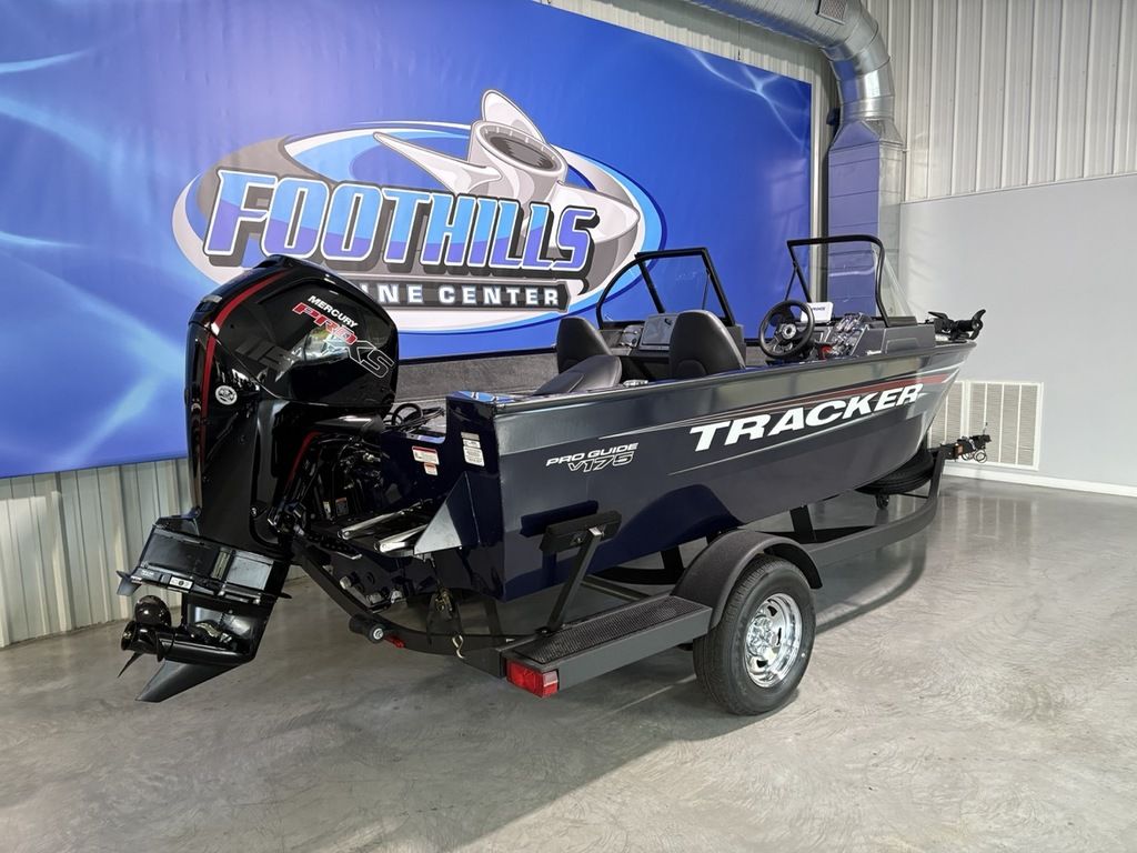 2025 Tracker® Boats Pro Guide™ V-175 Combo Package Whether the day calls for fishing, tubing, skiing, cruising or all of the above, the TRACKER PRO GUIDE™ V-175 Combo delivers the versatility and amenities to make it happen. Measuring 17’ 7” in length and 8’ 1” in width, the V-175 Combo has exceptional stability for cruising and casting. Storage is perfect for rods and tackle or watersports gear. A growling Mercury® FourStroke engine has the pep to knock down rollers and pop up a wakeboarder with ease. The back deck serves are a solid casting platform when down, and when up adds a pair of seats covered in premium marine-grade vinyl. The console is shrouded by a wraparound walk-thru windshield and carries a full complement of gauges, a fishfinder, and easy, responsive steering. Whether you're a seasoned angler or a family looking for a versatile watercraft, the TRACKER PRO GUIDE™ V-175 Combo delivers on both performance and comfort, making it a popular choice among all water lovers.