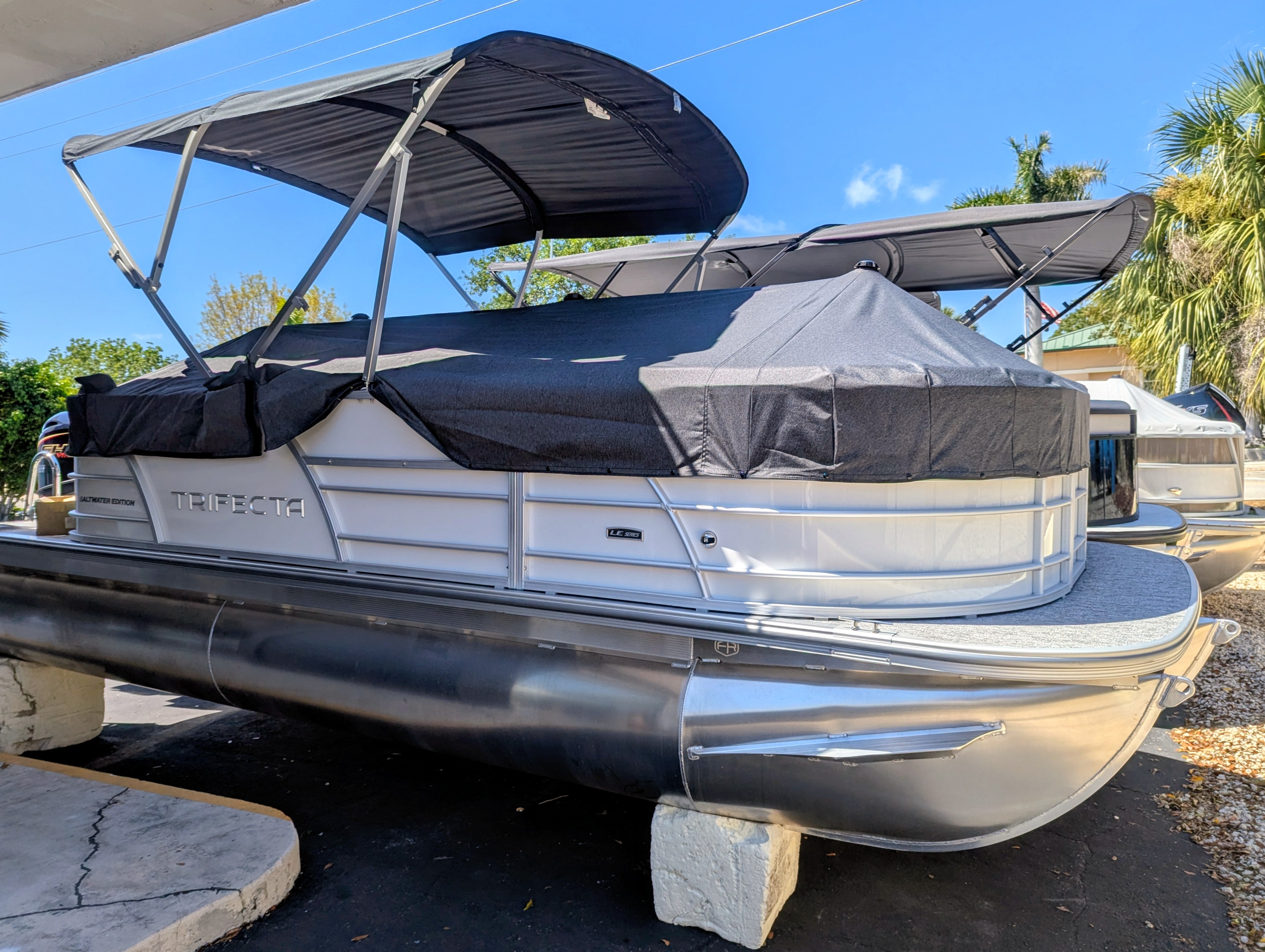 Options: Silver Rail, Saltwater Edition Package, Saltwater Decal, & Anode, Panel 1: Pearl White, Panel 2: Pearl White, Furniture Base : Granite, Furniture Accent : Black Onyx, 25" Shaft Transom, Flooring Coastal Concrete, Power Electric Bimini Top, Mooring Cover, Canvas Color: Black, Yamaha Mechanical Pre-Rig, Premium Polymer Helm, Lowrance Hook 5 Display, SS Steering Wheel w/ Knob, HD Folding Table, Sundeck Privacy Hoop & Curtain