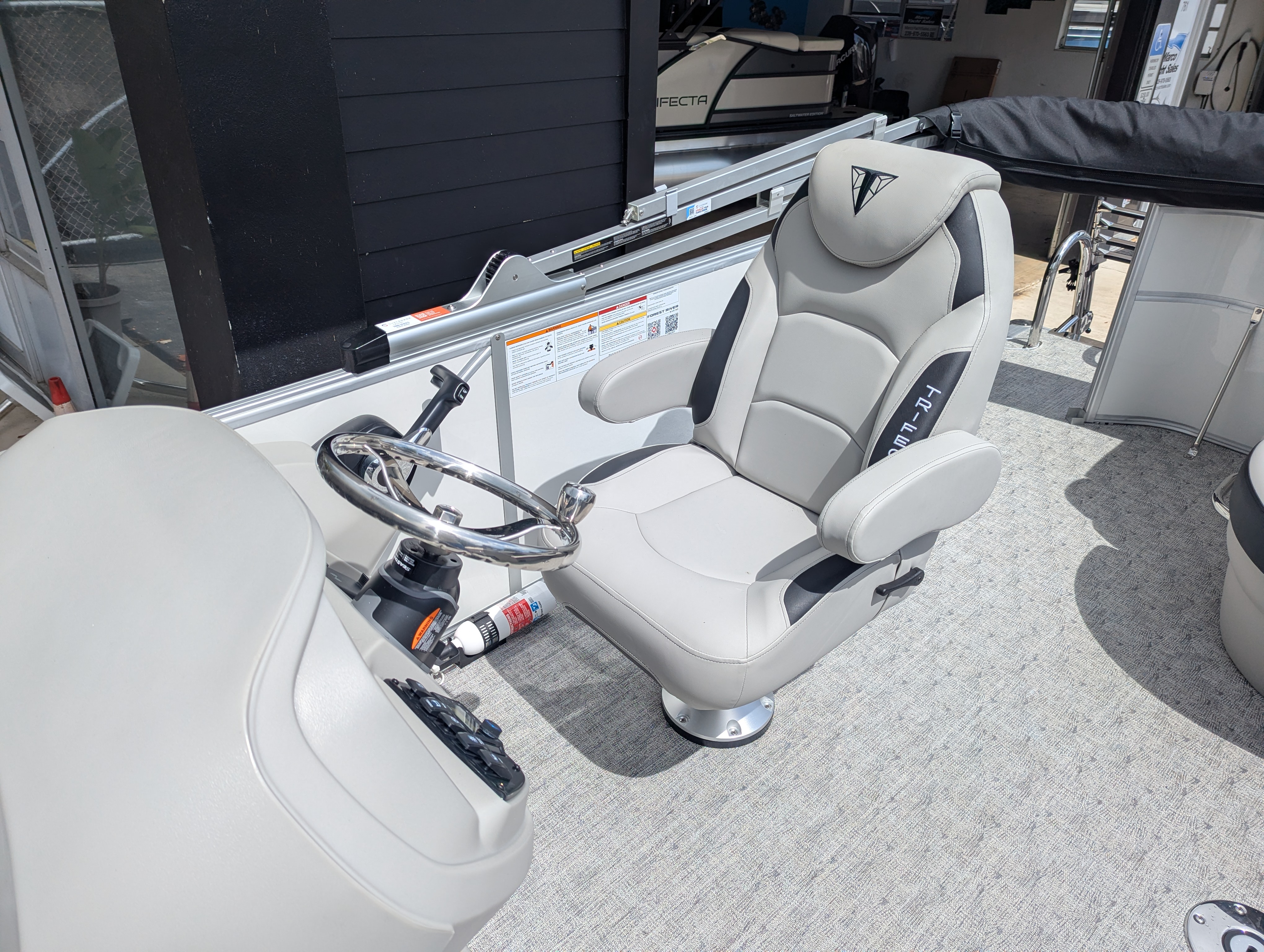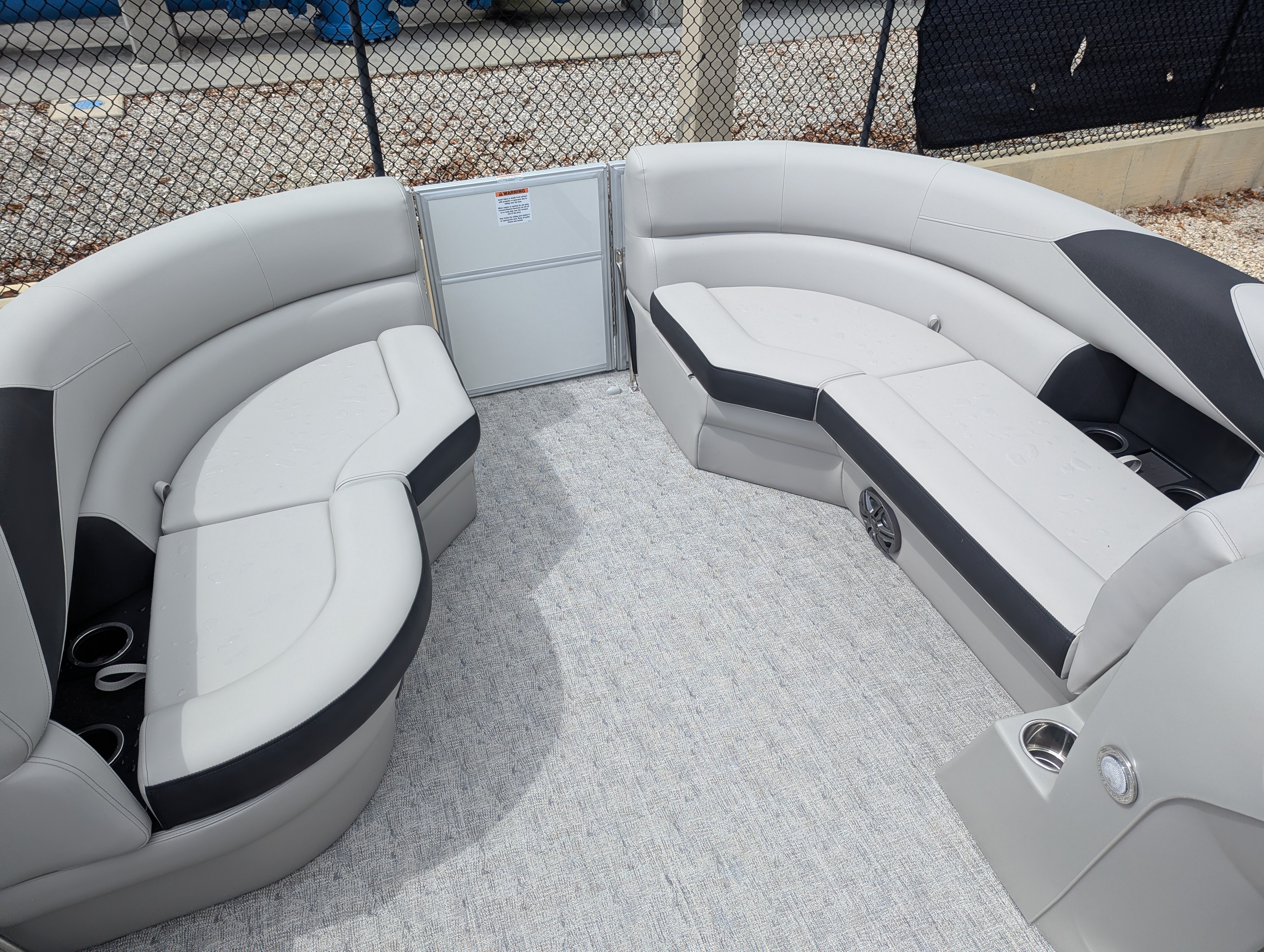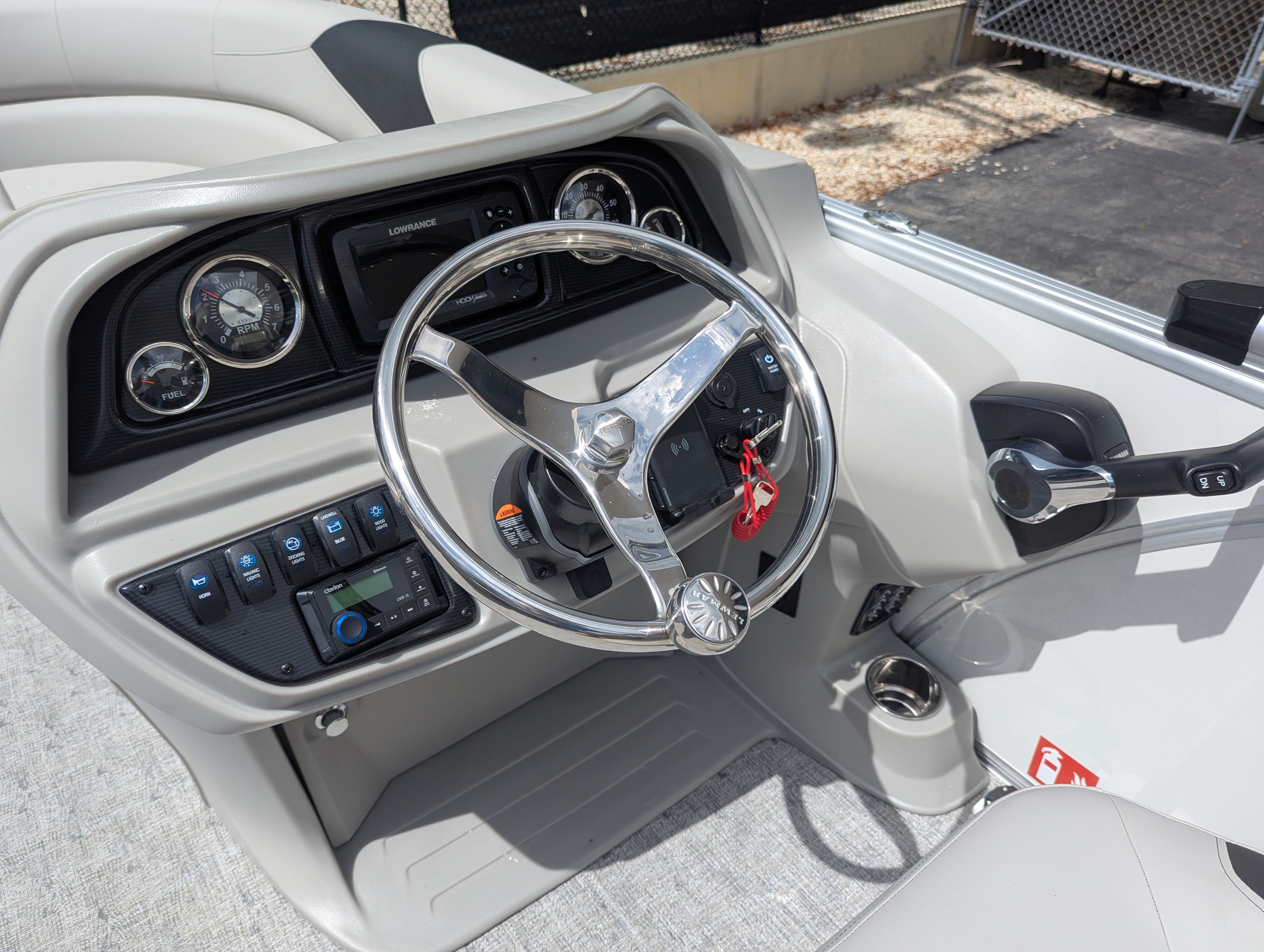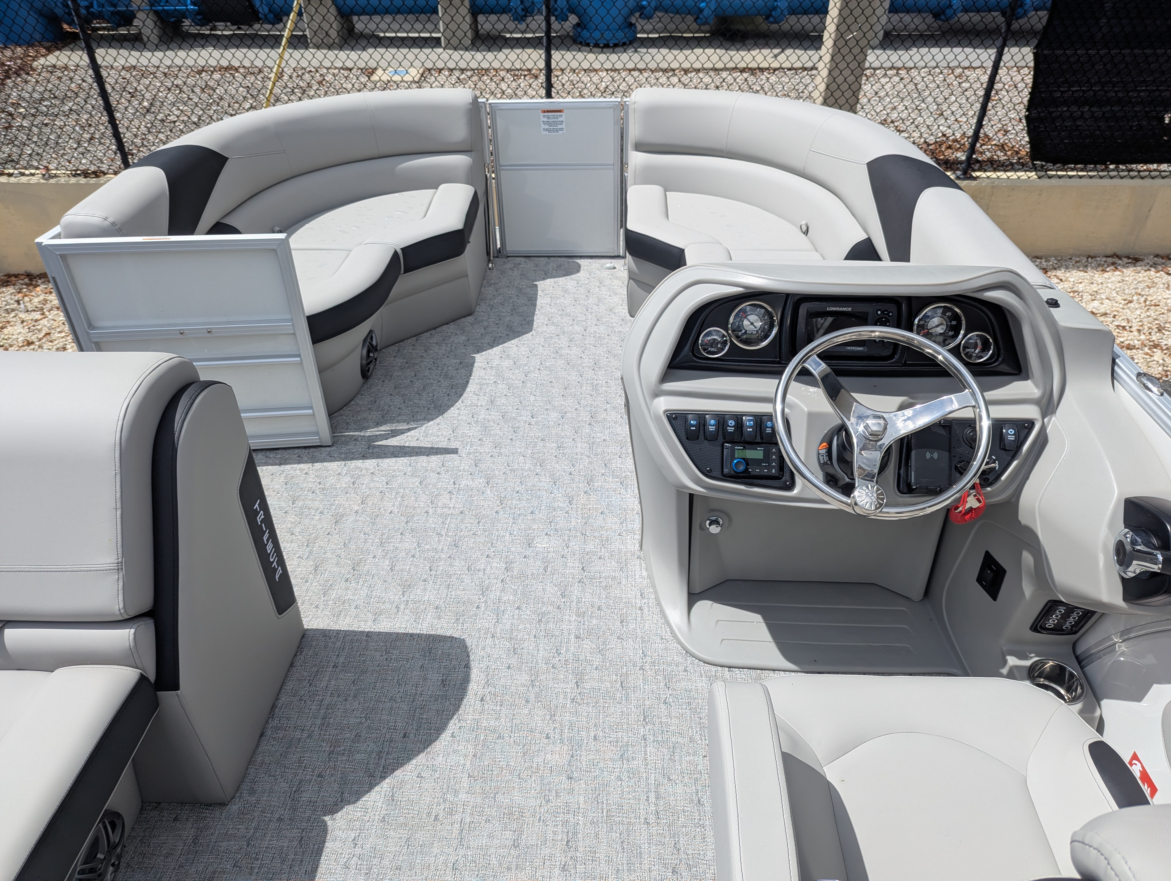 Standard Features: 28 Gallon, Direct Fill Fuel Tank, (4) Clarion Speakers w/ Protective Inside Covers, 10' Power Electric Bimini Top, Raised Logos, Factory Installed Playpen Cover, Fuel/Water Separator, Full Rail Panels, Integrated Stainless Steel Cup Holders, Stainless Steel Ski Tow Bar, Vinyl Wrapped Furniture Bases, Steel Framed E Coated Mid Back Reclining Helm Chair, Helm Seat Slider, Stainless Steel Telescoping Ladder, Waterproof Electrical Wiring Harness w/ Deutsch Connectors, Table Floor Base (Table optional), Stainless Steel Rail Braces.