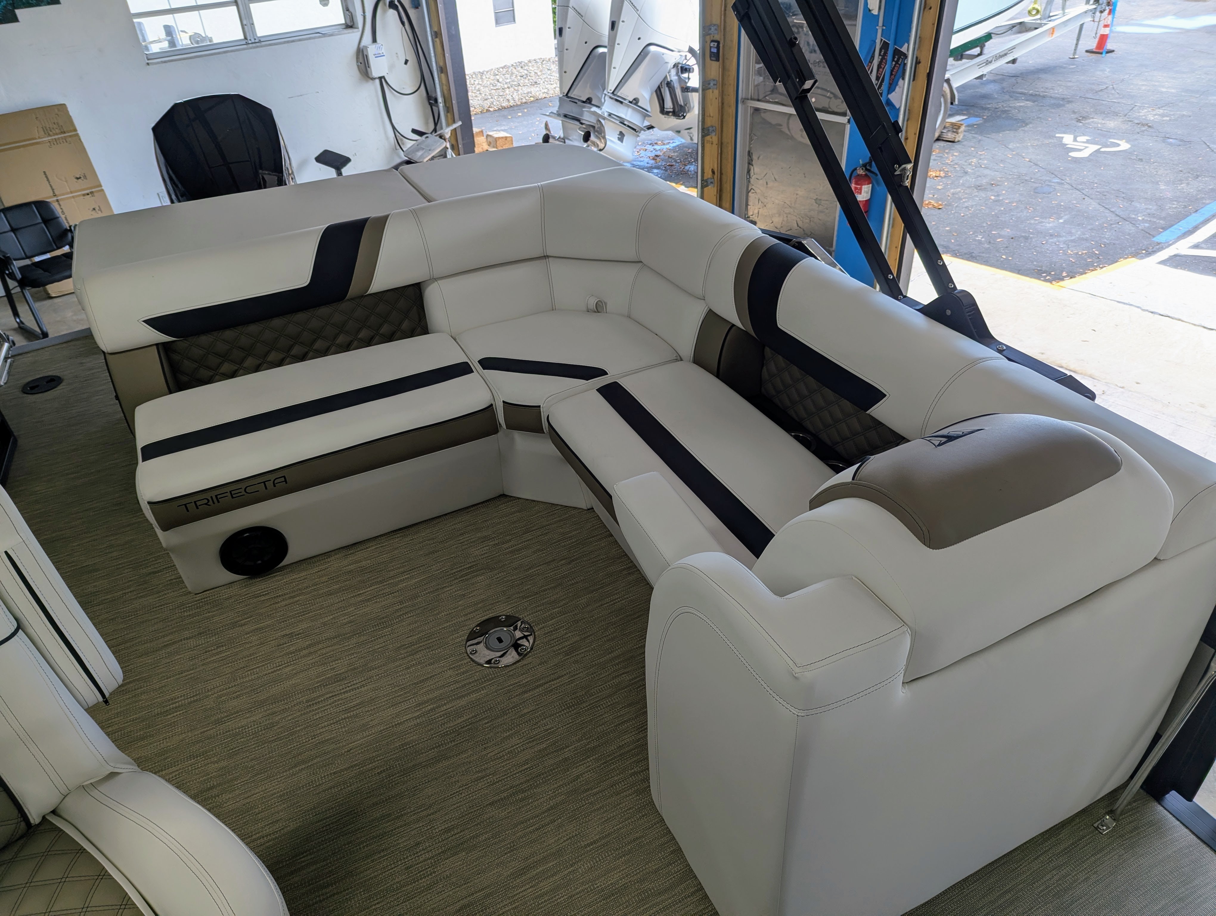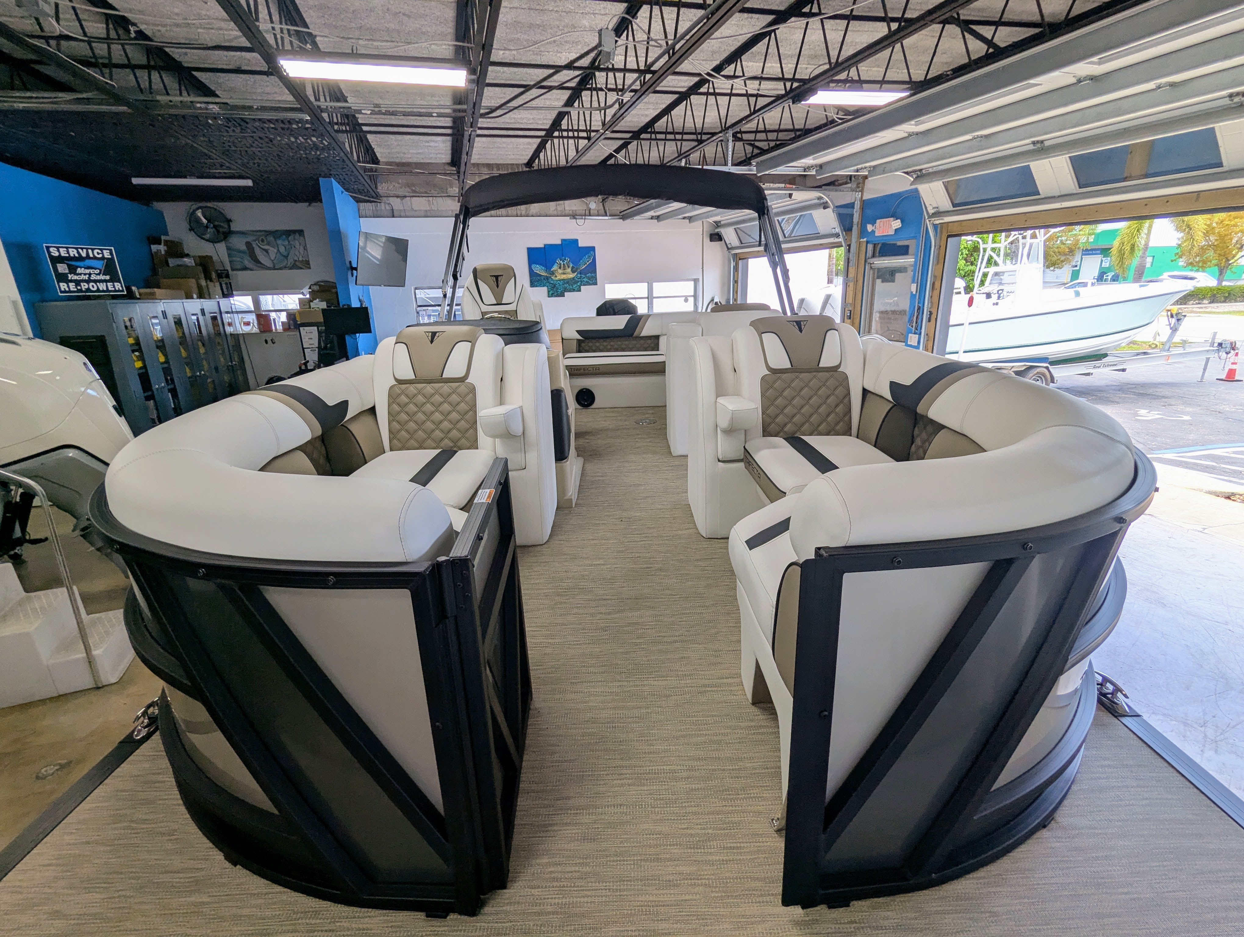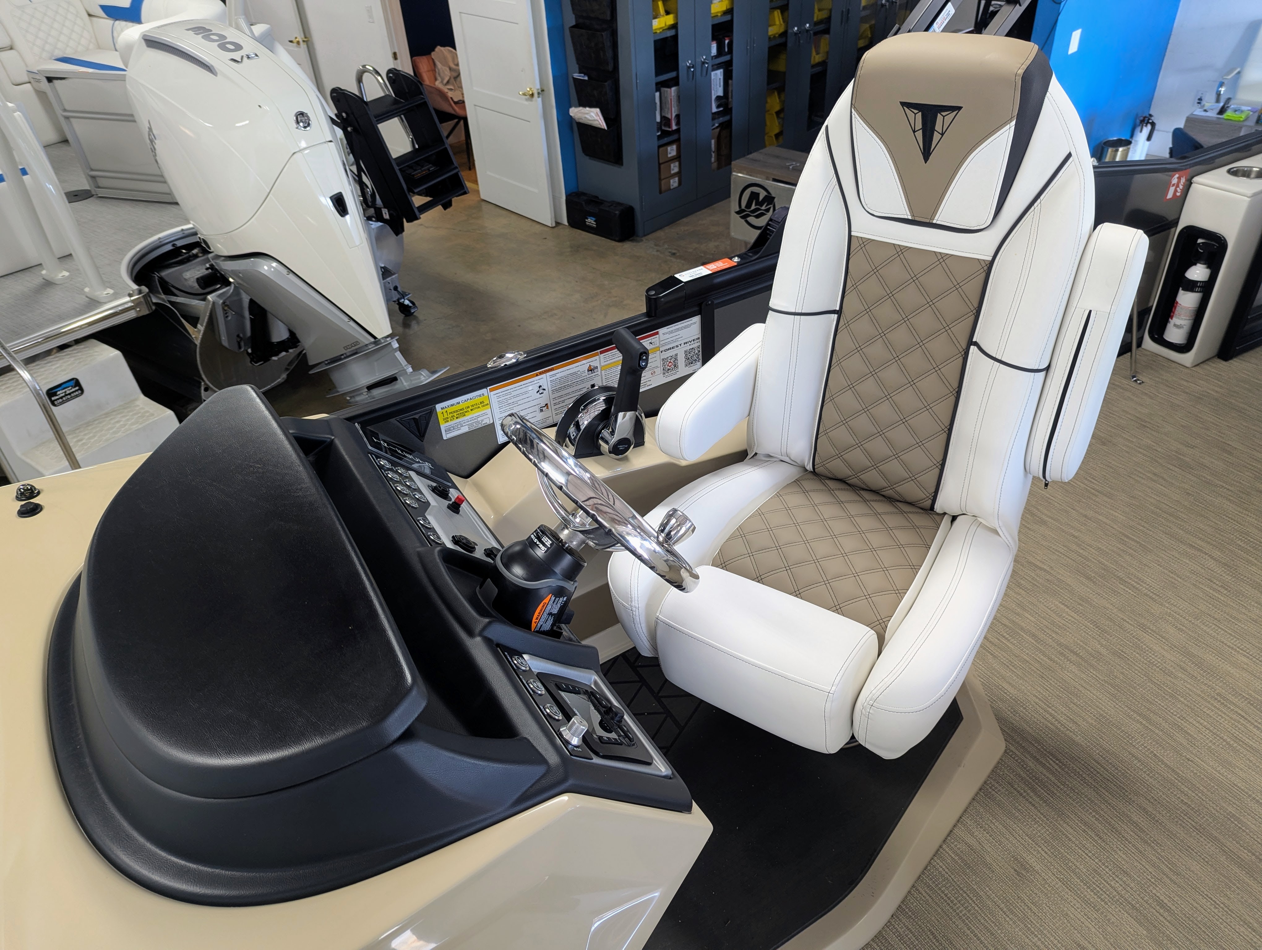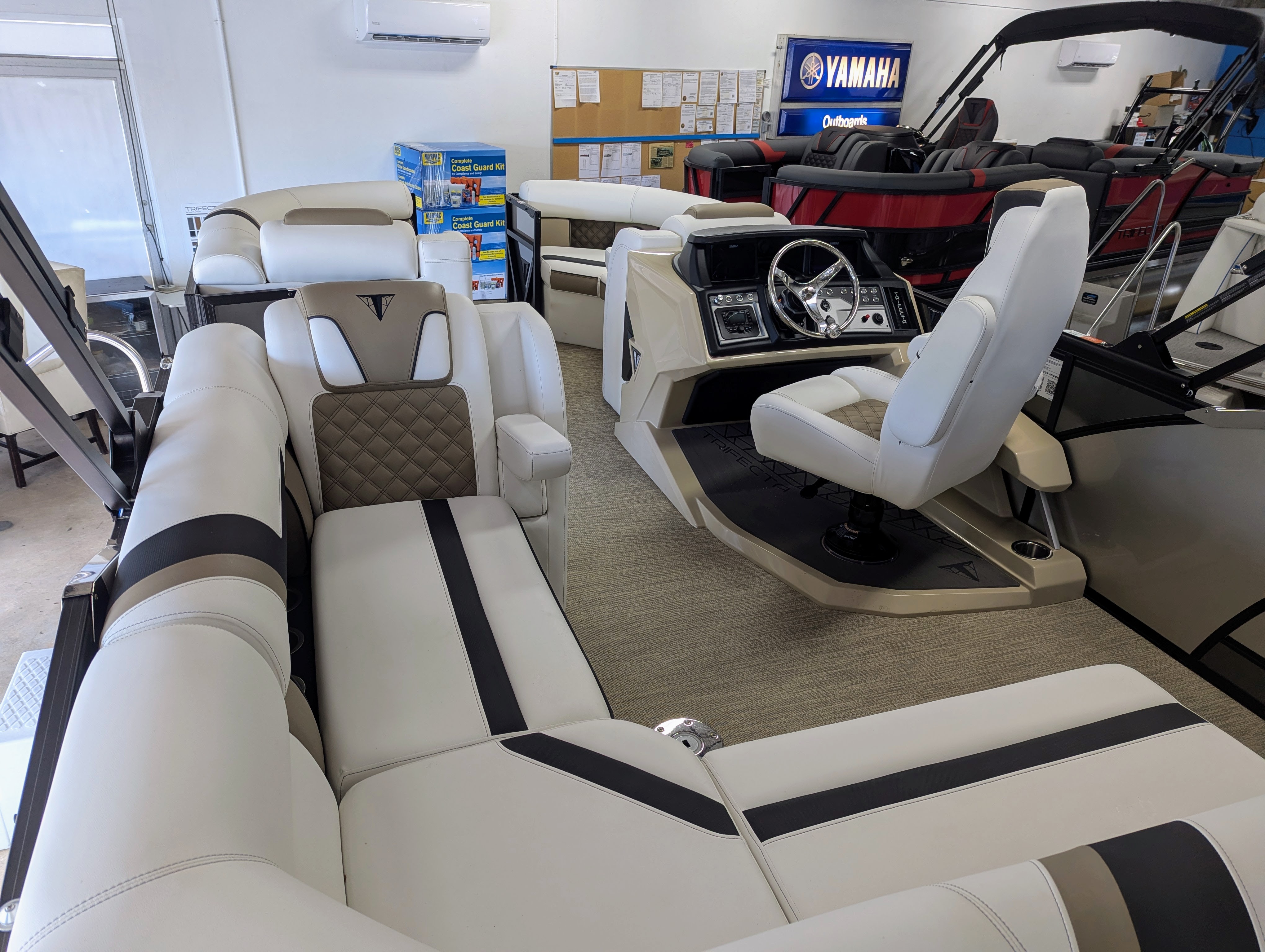 Options: Saltwater Edition Package, Panel 1: Platinum Panel 2: Charcoal No Rail Stripe Furniture Base : Alpine / Latte TT Secondary Base: Truffle Furniture Accent : Black Onyx 25" Shaft Transom Latte Wicker Flooring, Helm Latte,Power Electric Bimini Top, Standard Mooring Cover, Canvas Color: Black, Power Assist Steering Pump, Mercury Mechanical Pre-Rig,Standard Helm, Twin Simrad Electronics,High Back Chair w/ Bolster, HD Folding Table, Dual Battery Switch & Charger, SS Pop Up Cleats (Qty 4).