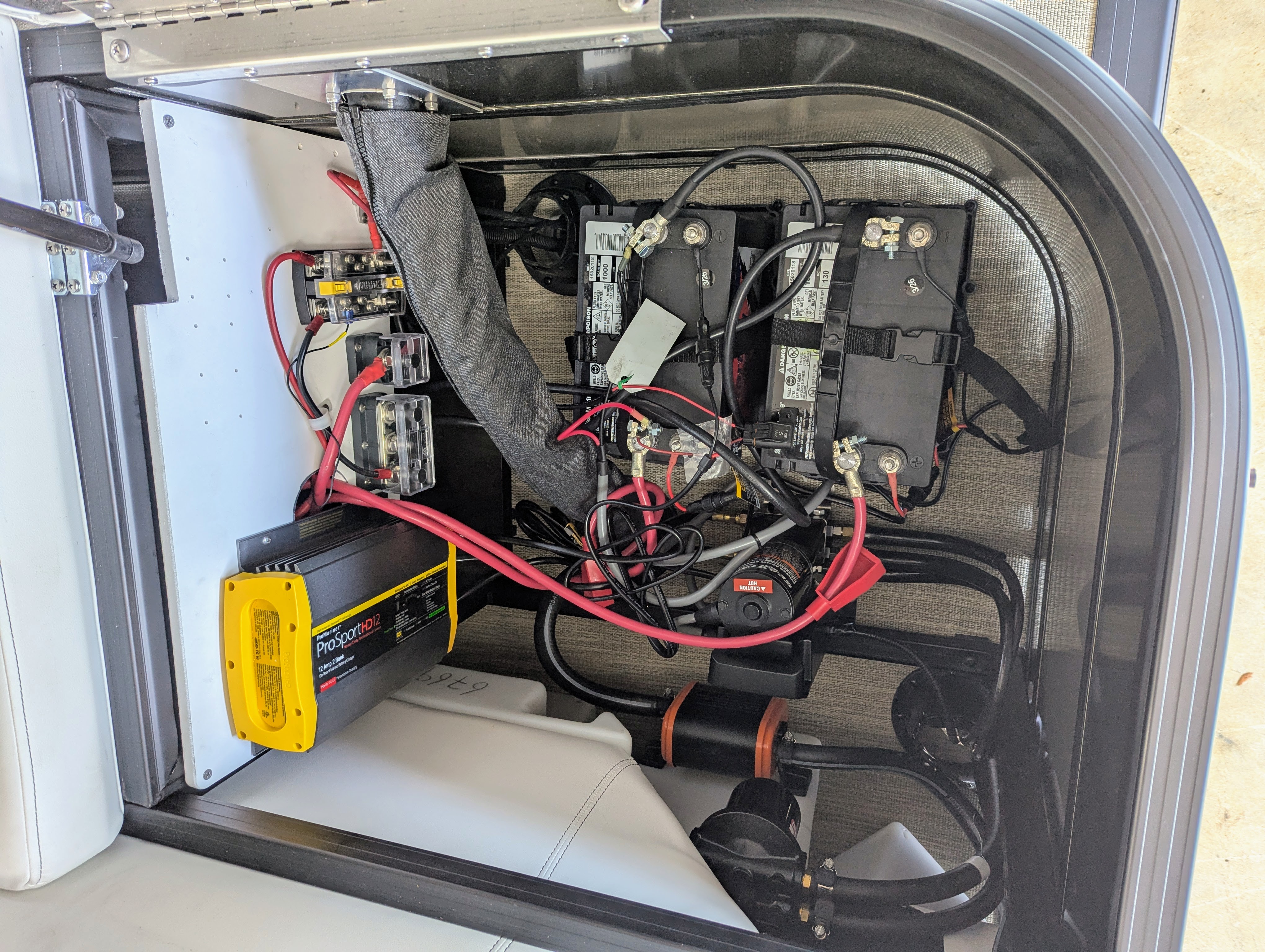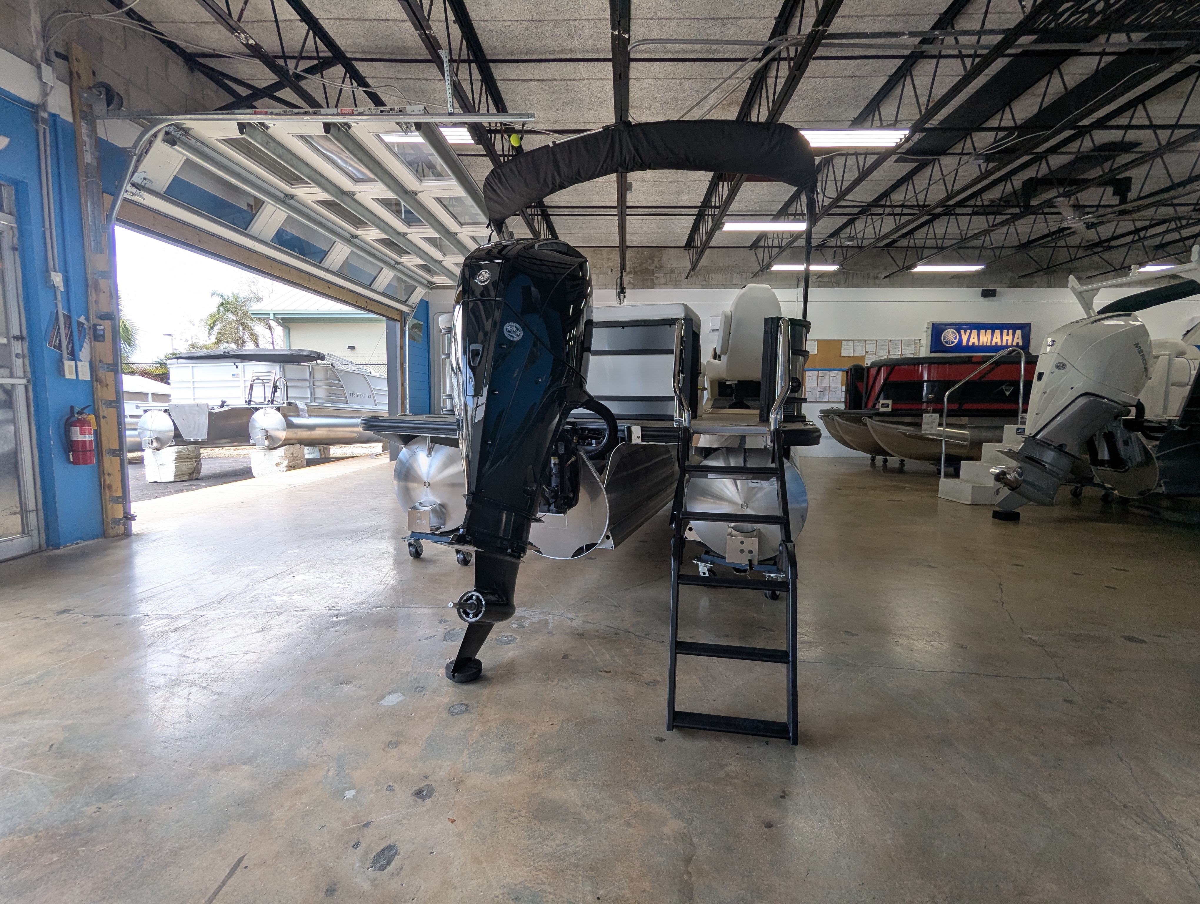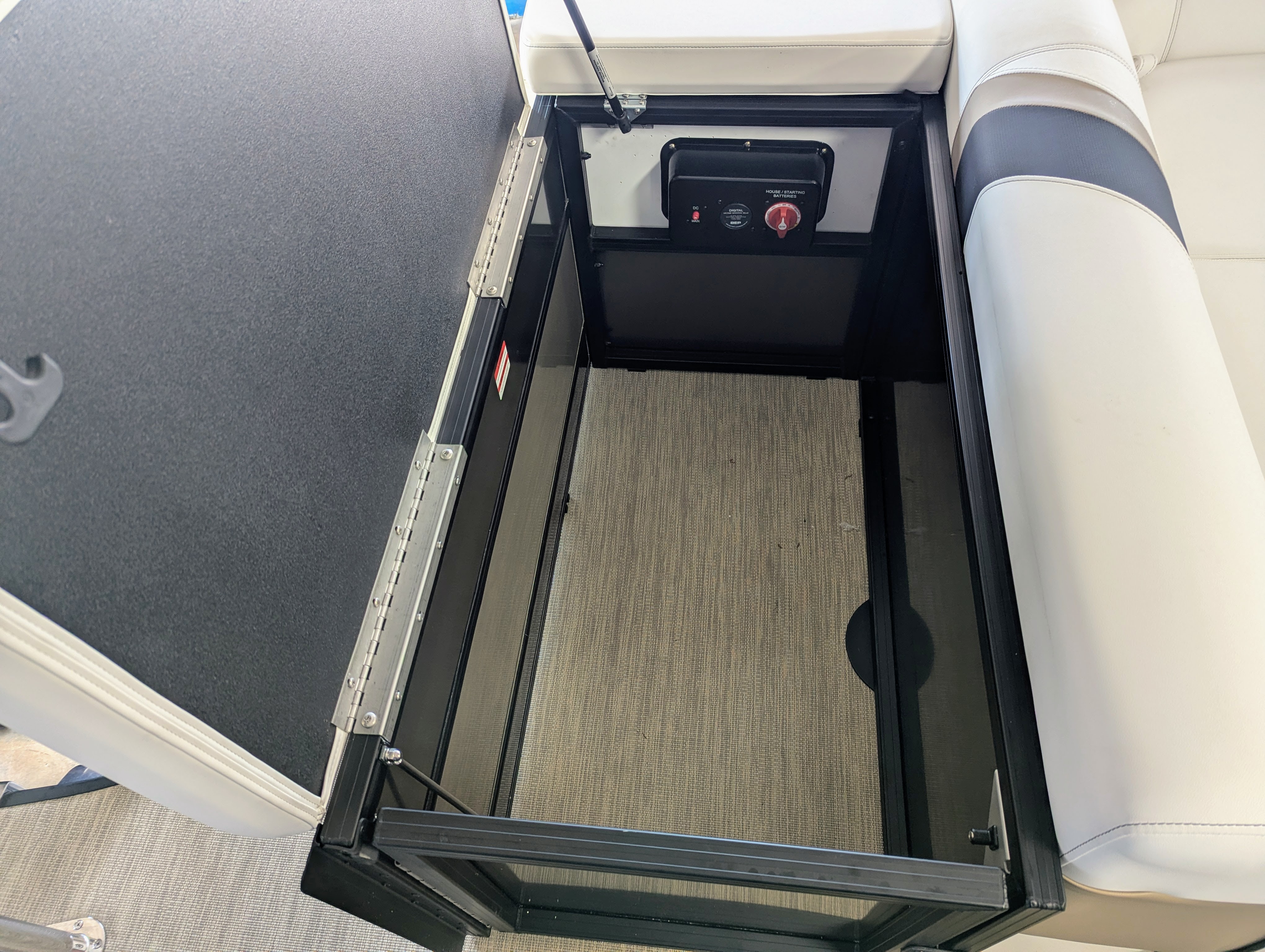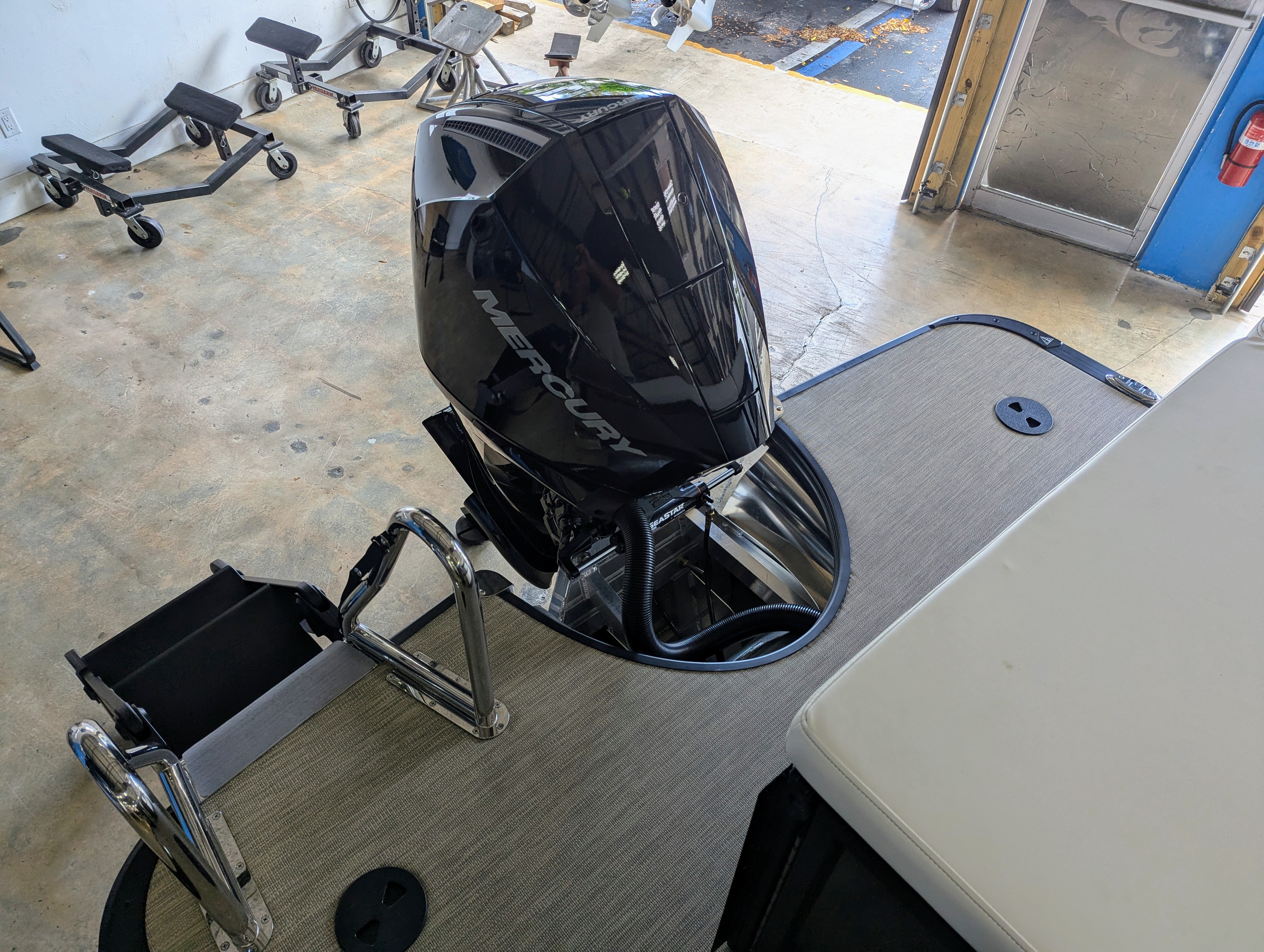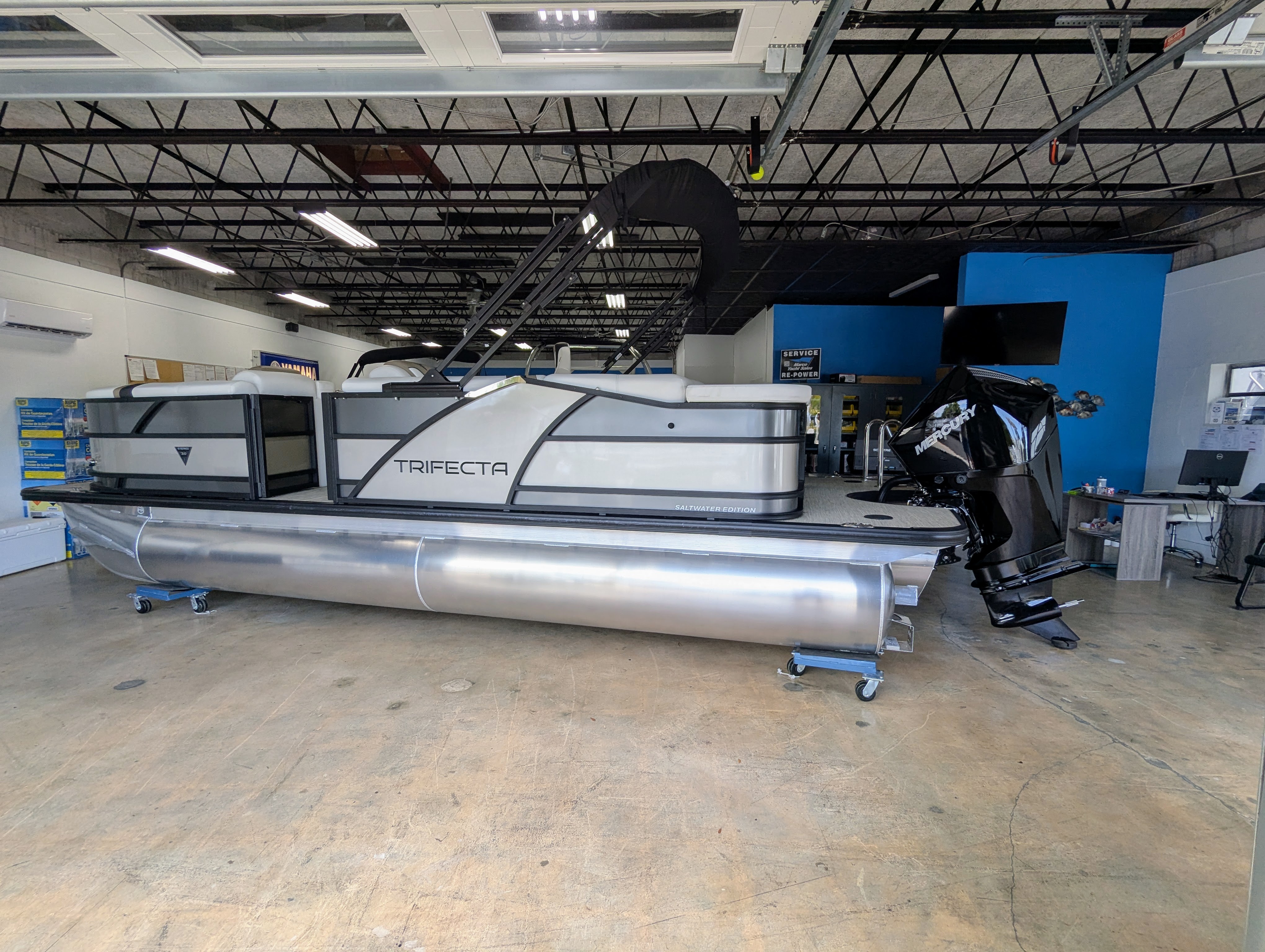 Options: Saltwater Edition Package, Panel 1: Platinum Panel 2: Charcoal No Rail Stripe Furniture Base : Alpine / Latte TT Secondary Base: Truffle Furniture Accent : Black Onyx 25" Shaft Transom Latte Wicker Flooring, Helm Latte,Power Electric Bimini Top, Standard Mooring Cover, Canvas Color: Black, Power Assist Steering Pump, Mercury Mechanical Pre-Rig,Standard Helm, Twin Simrad Electronics,High Back Chair w/ Bolster, HD Folding Table, Dual Battery Switch & Charger, SS Pop Up Cleats (Qty 4).
