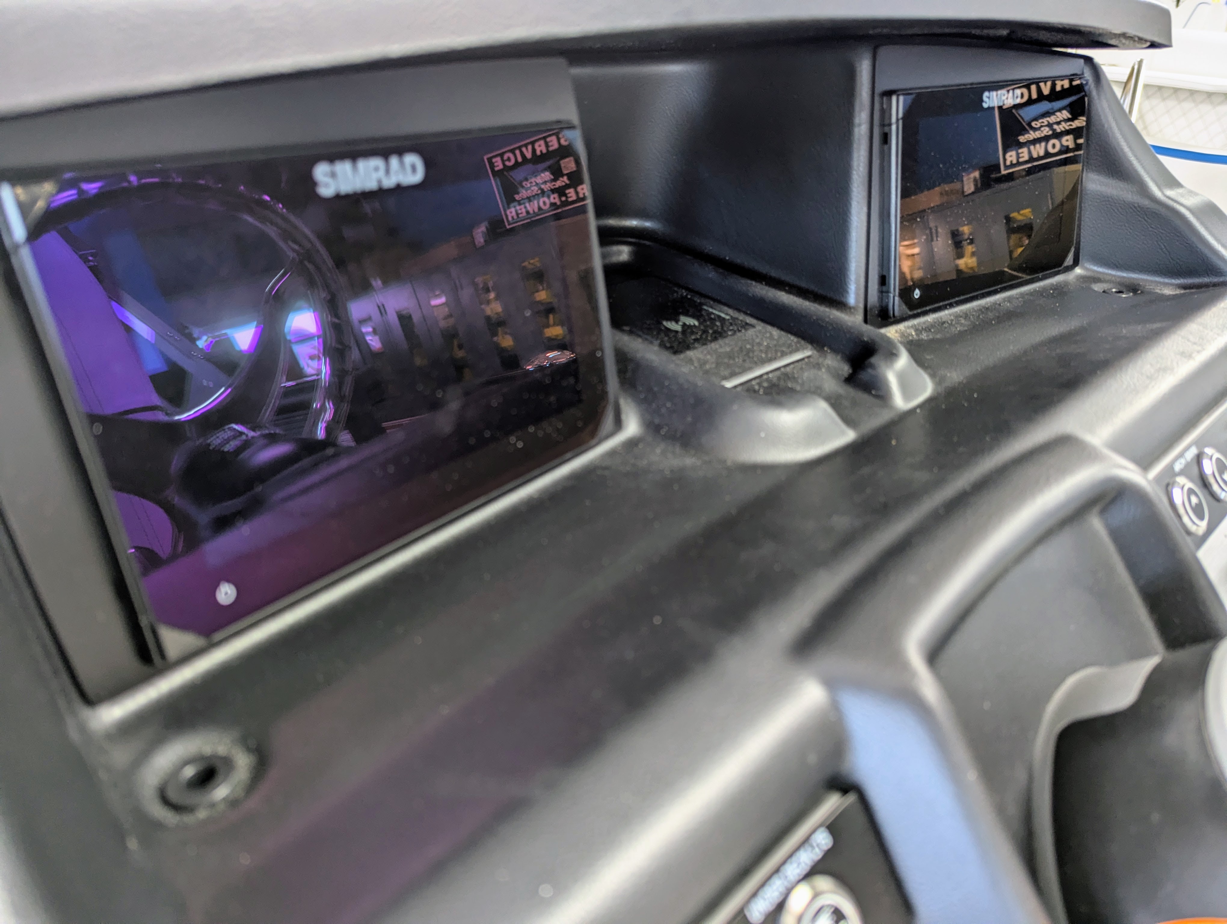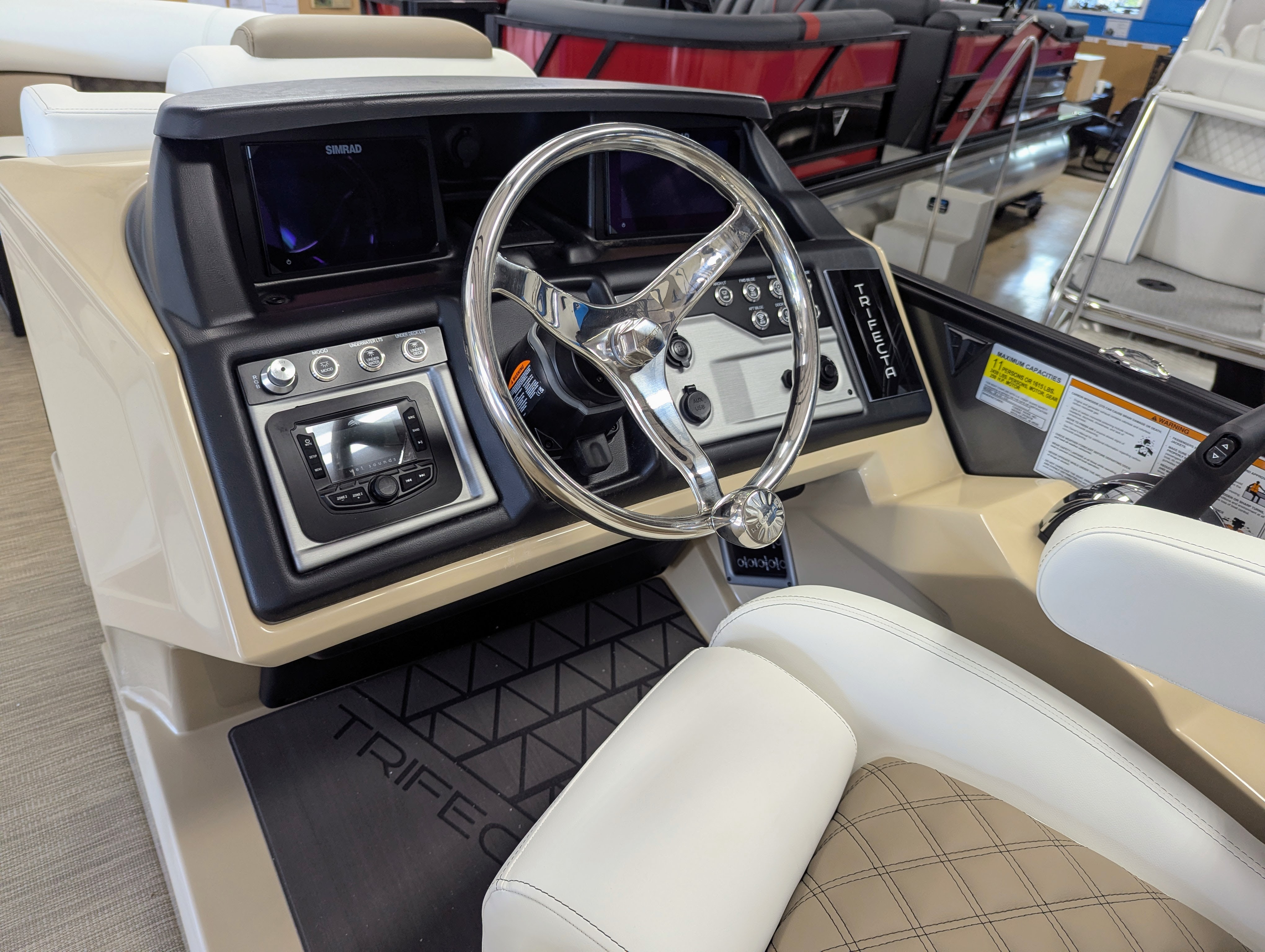 Standard Options: AQR Gate System, Twin Simrad NSX007 7" Displays, NYTCRUZ (Automatic Nav/Anchor Light), Infinite Reclining High Back Helm Chairs, Waterproof Electrical Wiring Harness w/ Deutsch Connectors, Raised Logos, LED Docking Lights, Double Arm Hinges for Easy Access to Seat Storage, Exterior D-Rail Design on Rails' Factory Installed Playpen Cover, Fuel / Water Separator, Full Rail Panels, Integrated Stainless Steel Cup Holders, Wireless Phone Charging & Mount, Stainless Steel Telescoping Ladder, Stern Stainless Steel Corners, Tilt Steering, Transducer Bracket on Port & Starboard Tubes, Integrated / Lighted USB-A , USB-C Charging, Vinyl Wrapped Furniture Bases, Wet Sounds Flush Mount MC-2 Source Head Unit, (4) Recon 6" Wet Sound Purple Lighted Speakers, Wet Sounds Transom Remote, Stainless Steel Rail Braces, RGB LED Floor, Table & Seat Base Lights, Built in helm riser with binnacle arm, Chaise lid w/ folding billet arm rest.