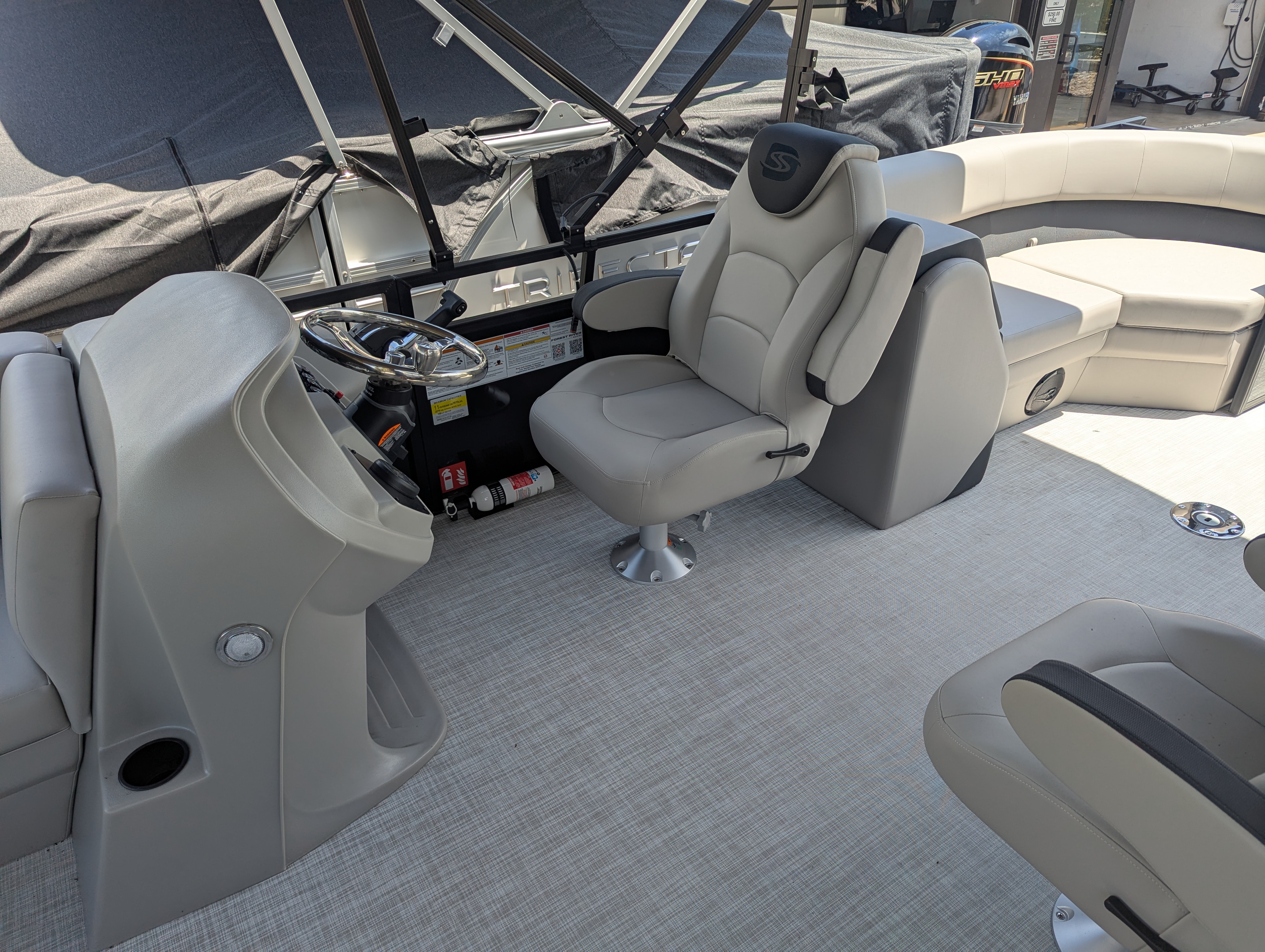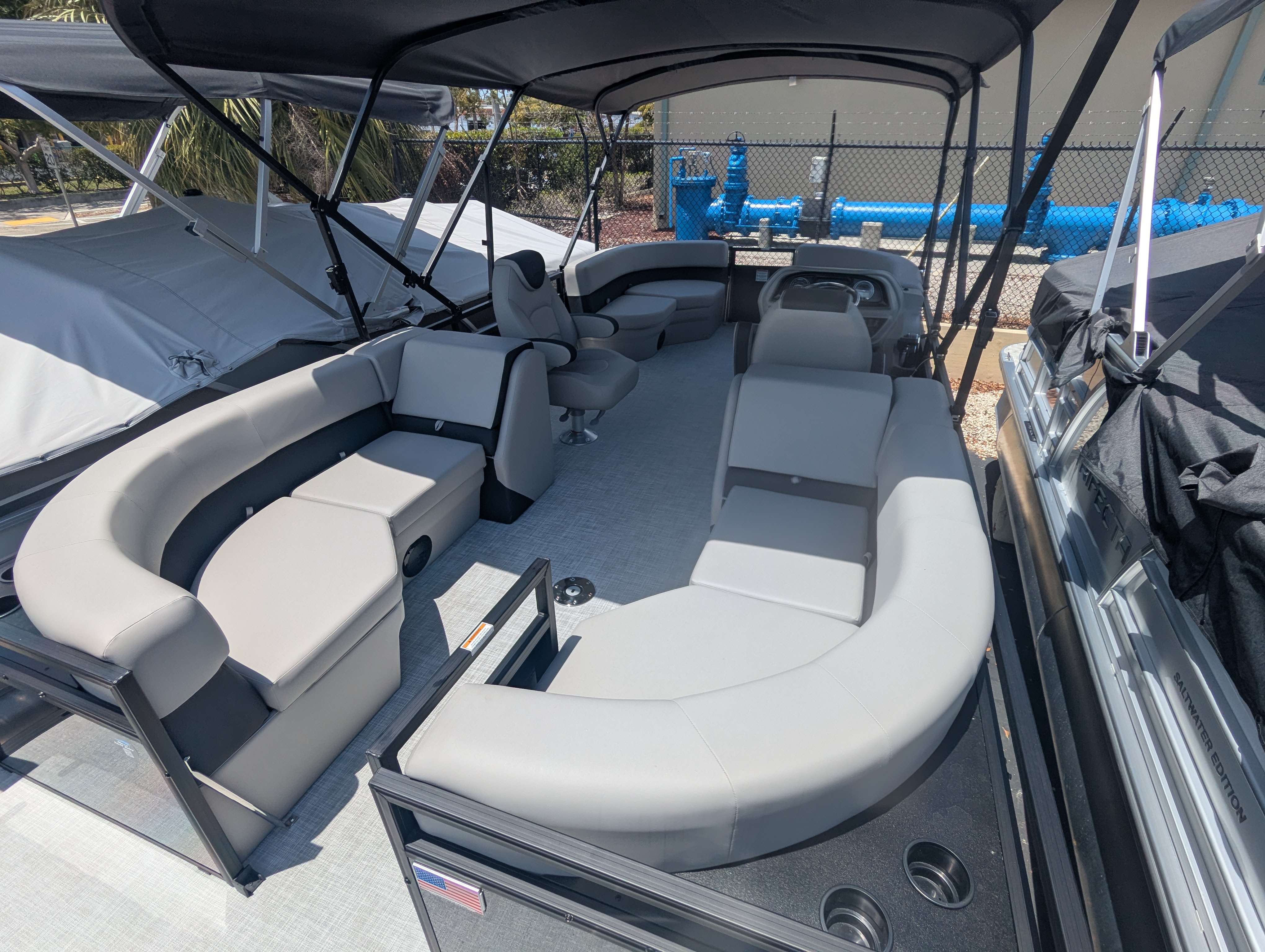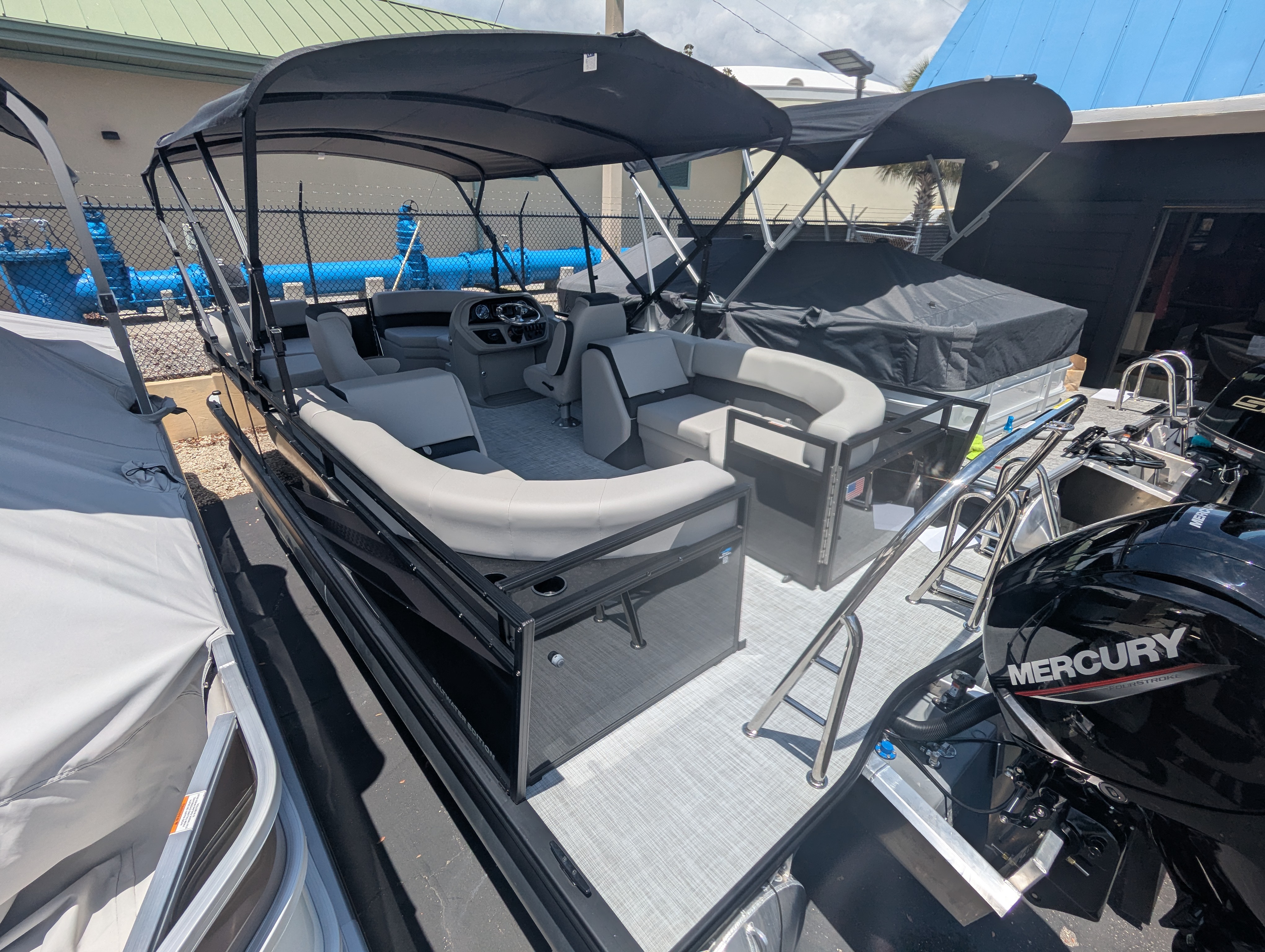 OPTIONS: 2.75 Performance Package, Salt Water Edition, Trim Level:Midnight, Panel 1:Black Onyx, Ski Tow, Furniture Base:Stoneware, Flooring:Shoreline Haze, Canvas Color:Coal, Bimini:Manual Double Bimini, Mercury Mechanical Pre-Rig, Premium Polymer Helm, Lowrance Hook 5 Display, Seastar Hydraulic Steering, Tilt Steering, HD Table and Base, (2) Portable Cupholders, Lippert Ladder, 25" transom, Sprortsman Power Pole