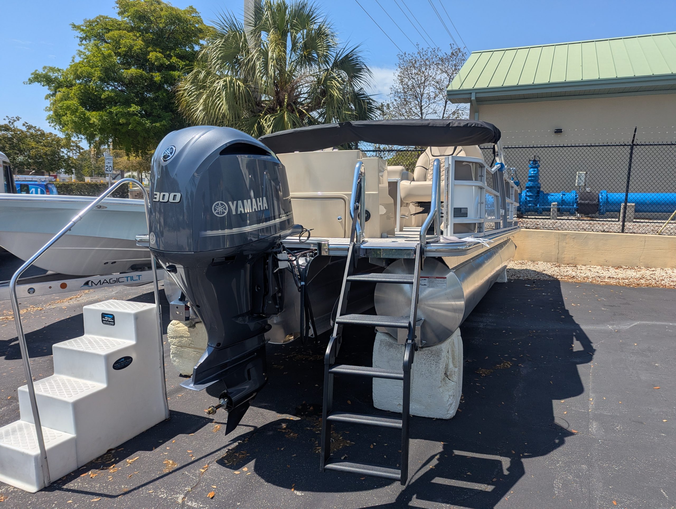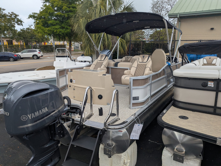 OPTIONS: Silver Rail, Panel 1: Diamond Ice, Panel 2: Bronze, Panel 3: White, Furniture Base : Latte TT, Secondary Base: Truffle, Furniture Accent : Black Onyx, 25" Shaft Transom, Latte Standard, Helm Latte, Power Electric Bimini Top, Mooring Cover Gray, Yamaha Power Assist Steering Pump, Yamaha Mechanical Pre-Rig, Standard Helm, SS Steering Wheel w/ Knob, High Back Chair w/ Bolster, HD Folding Table, 2 High Back Captain's Chairs, IPO Sundeck, Horizontal Rod Locker, Trolling Motor Outlet & Half Gate, Dual Battery Switch & Charger, Cleats (Qty 4), Stainless Steel Rub Rail Insert.