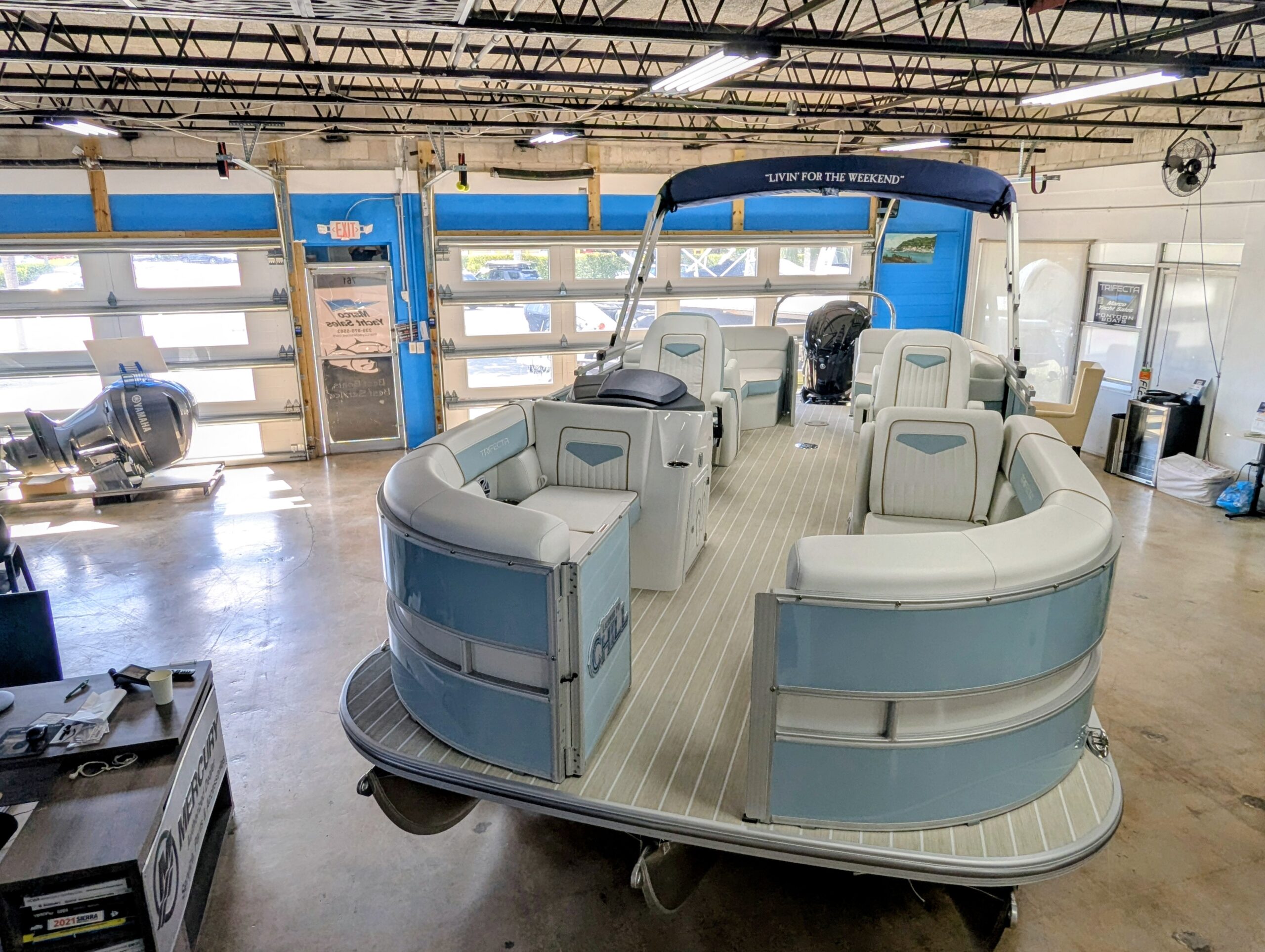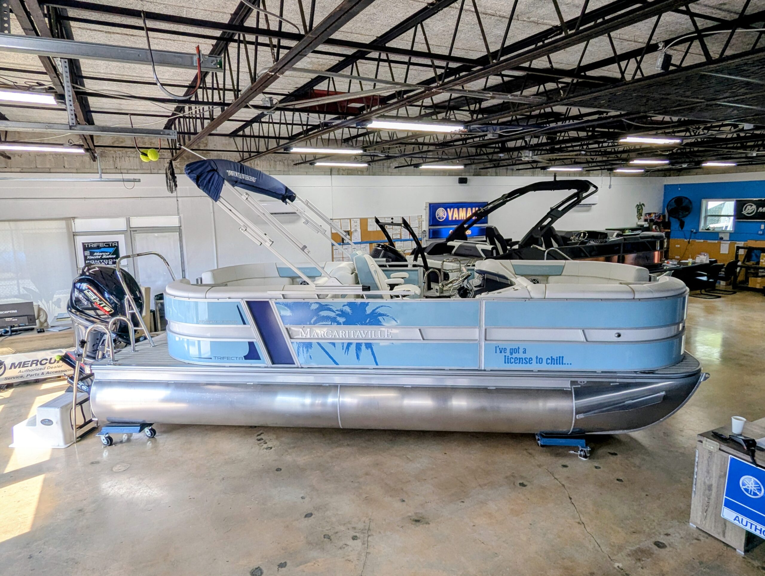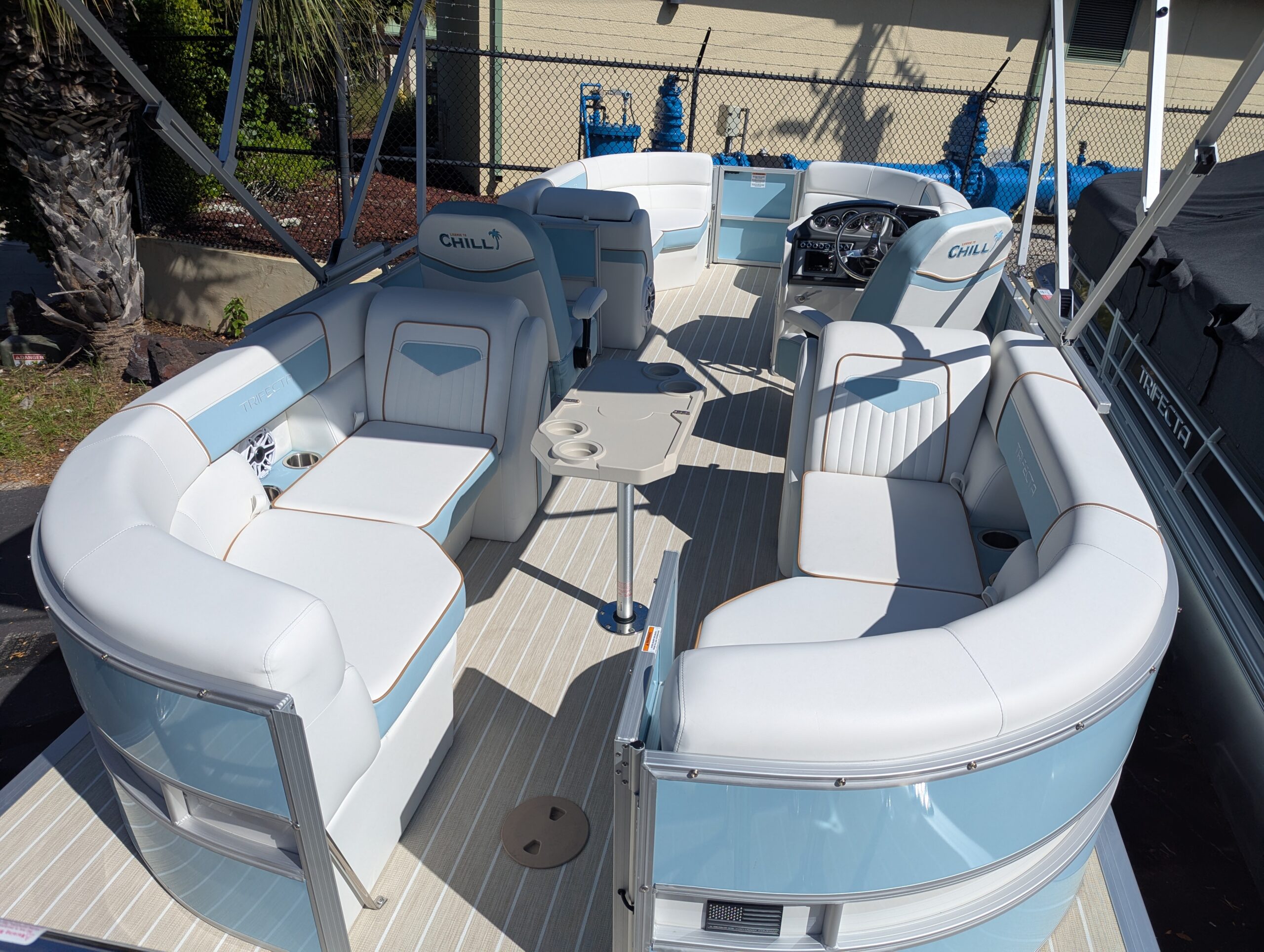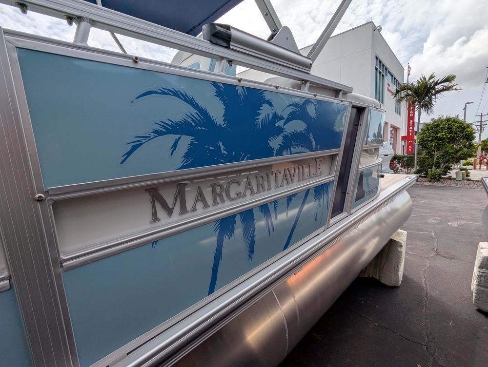 Trifecta LICENSED TO CHILL - CHASSIS/DECK CONSTRUCTION White custom furniture, Special "Licensed to Chill" lighting, Custom Logos, layout and design. Raised exterior panels with Buffett palm logos * MADE IN THE USA *