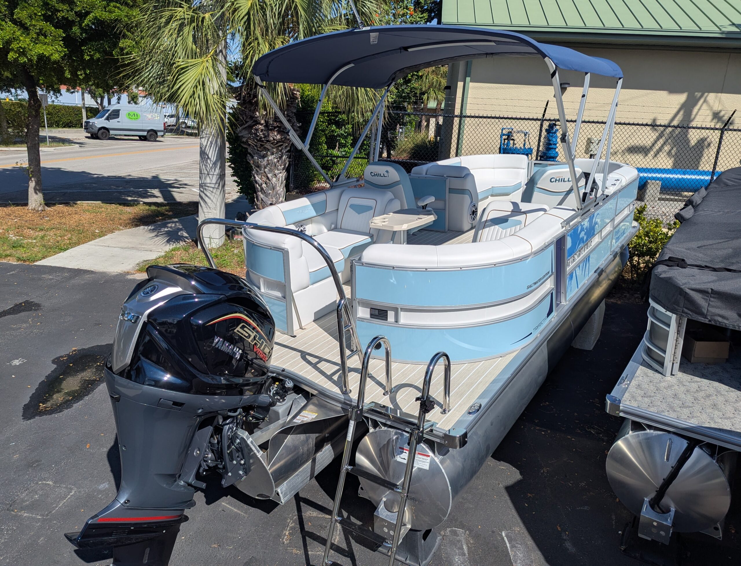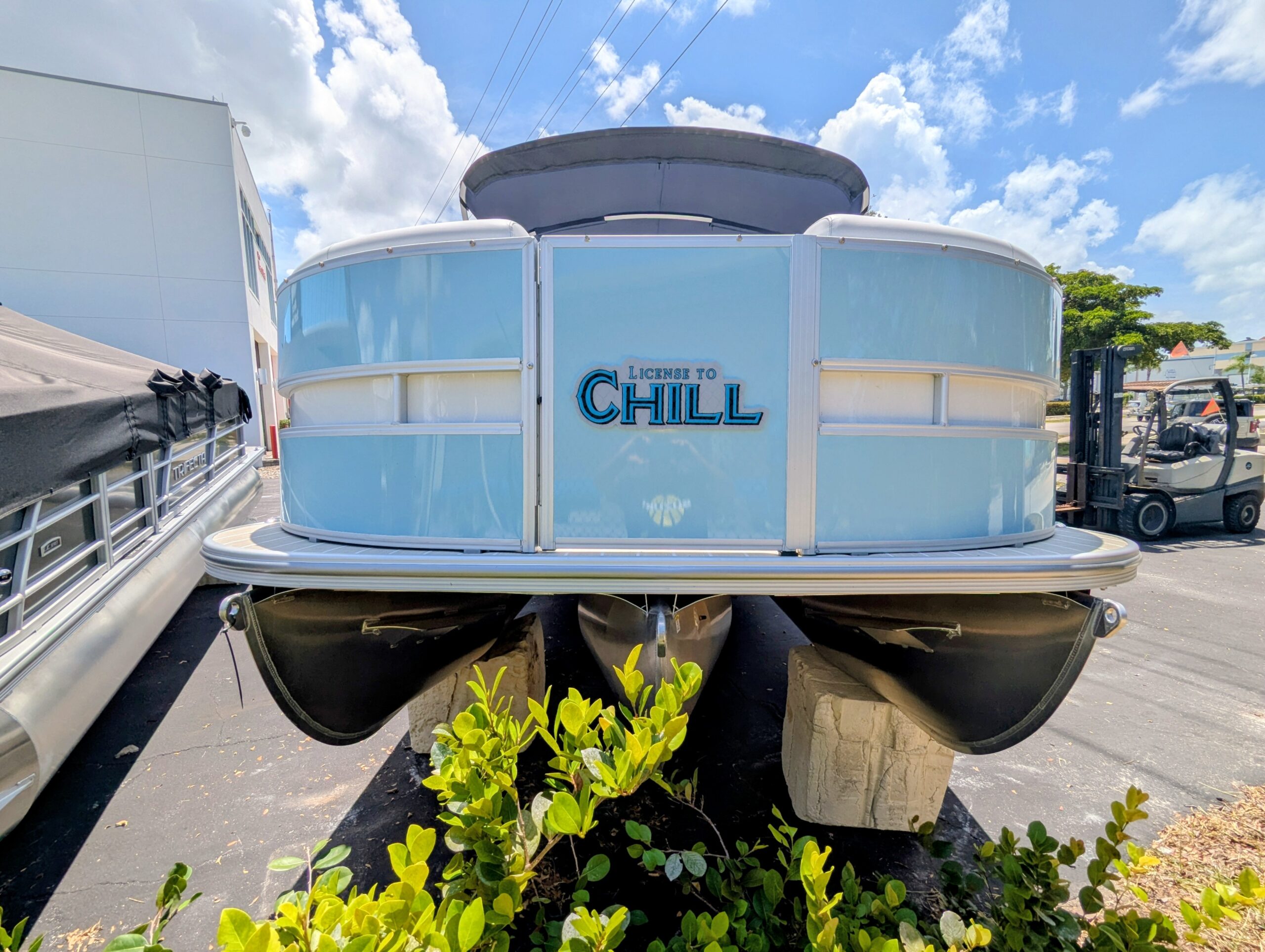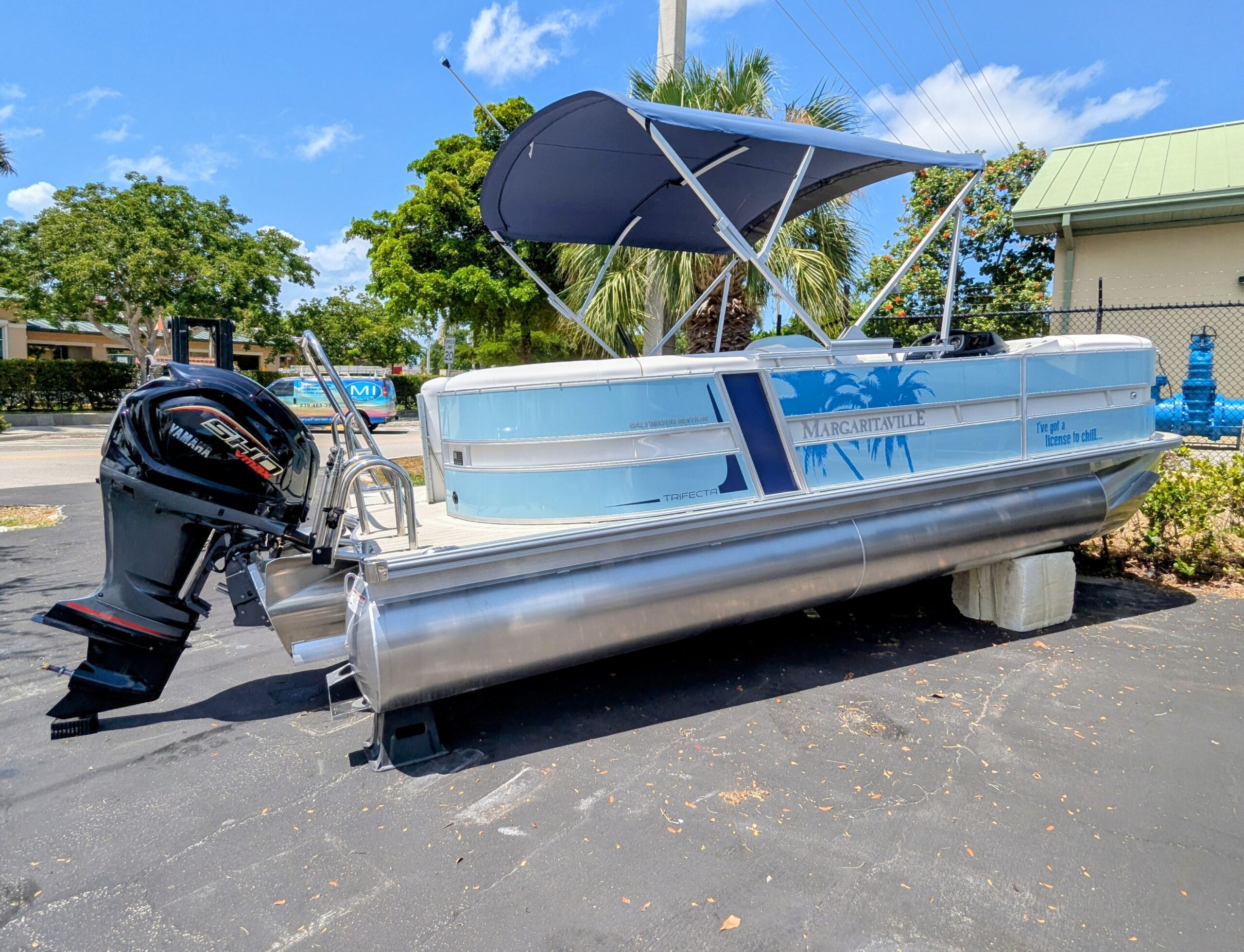 Trifecta LICENSED TO CHILL - CHASSIS/DECK CONSTRUCTION White custom furniture, Special "Licensed to Chill" lighting, Custom Logos, layout and design. Raised exterior panels with Buffett palm logos * MADE IN THE USA *
