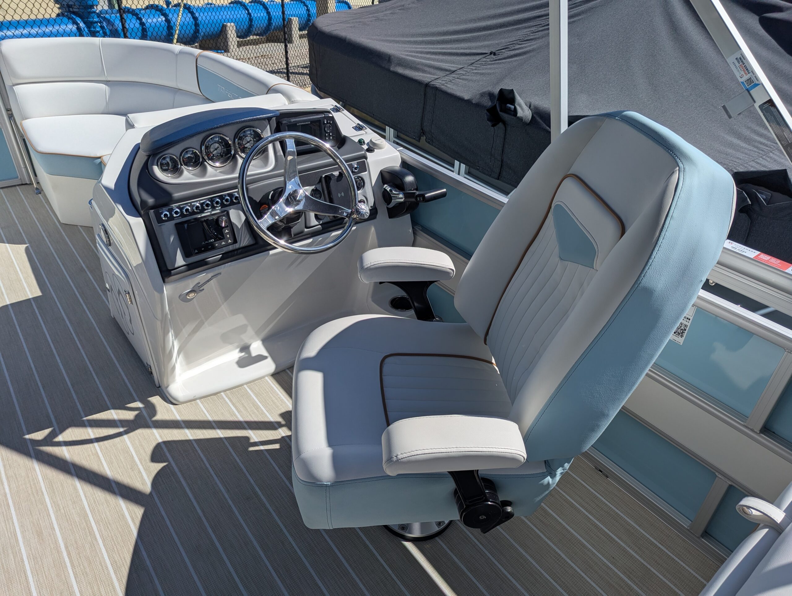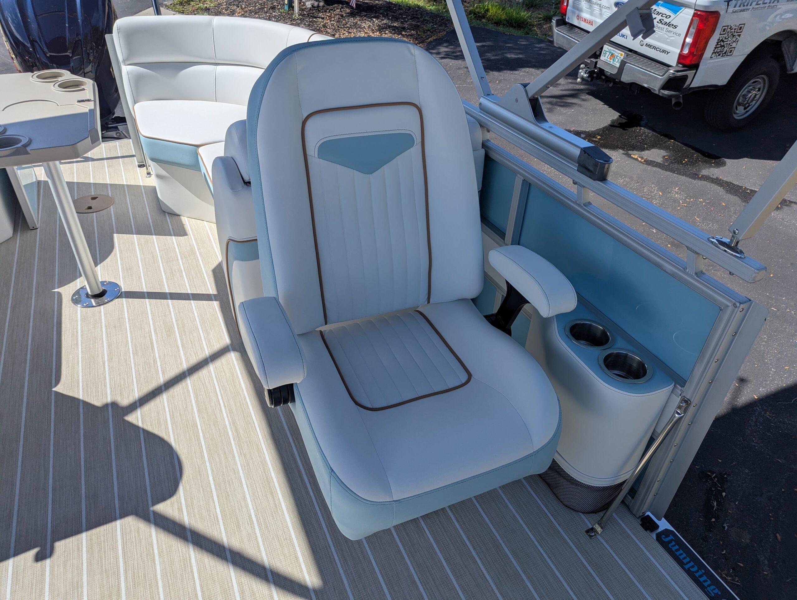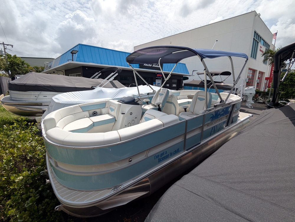 OPTIONS: Saltwater Package, Panel 1: Coral, Panel 2: Coral, Furniture Base : Salt Coral, 25" Shaft Transom, Beach Wood Teak, Power Electric Bimini Top, Standard Mooring Cover Deep Sea Blue, Power Assist Steering Pump, Fiberglass Helm, Lowrance Hook 5 Display, Folding Table, Dual Battery Switch & Charger, SS Pop Up Cleats (Qty 4),Safety Net, Ski Tow Bar, SS WHEEL W/KNOB.