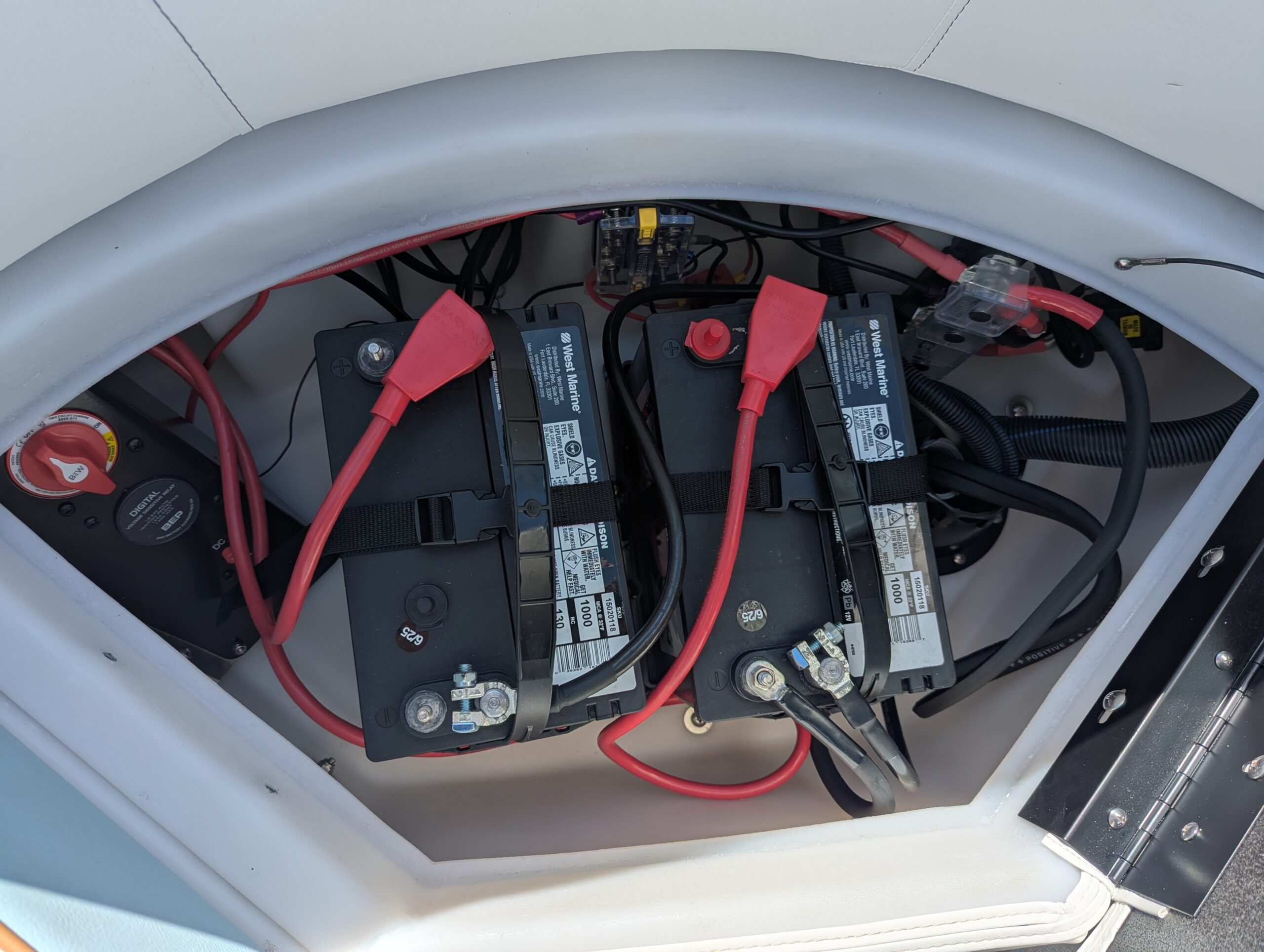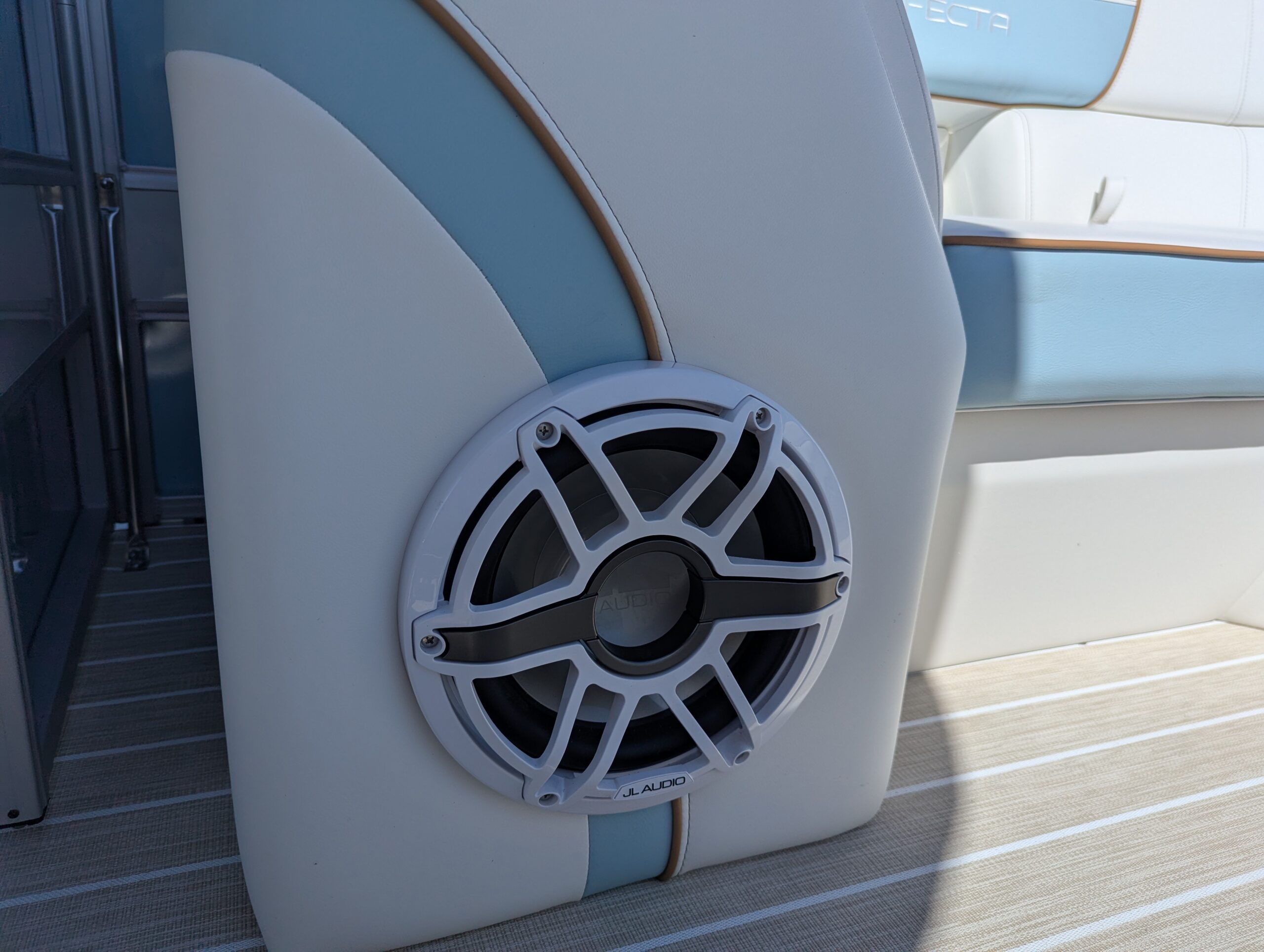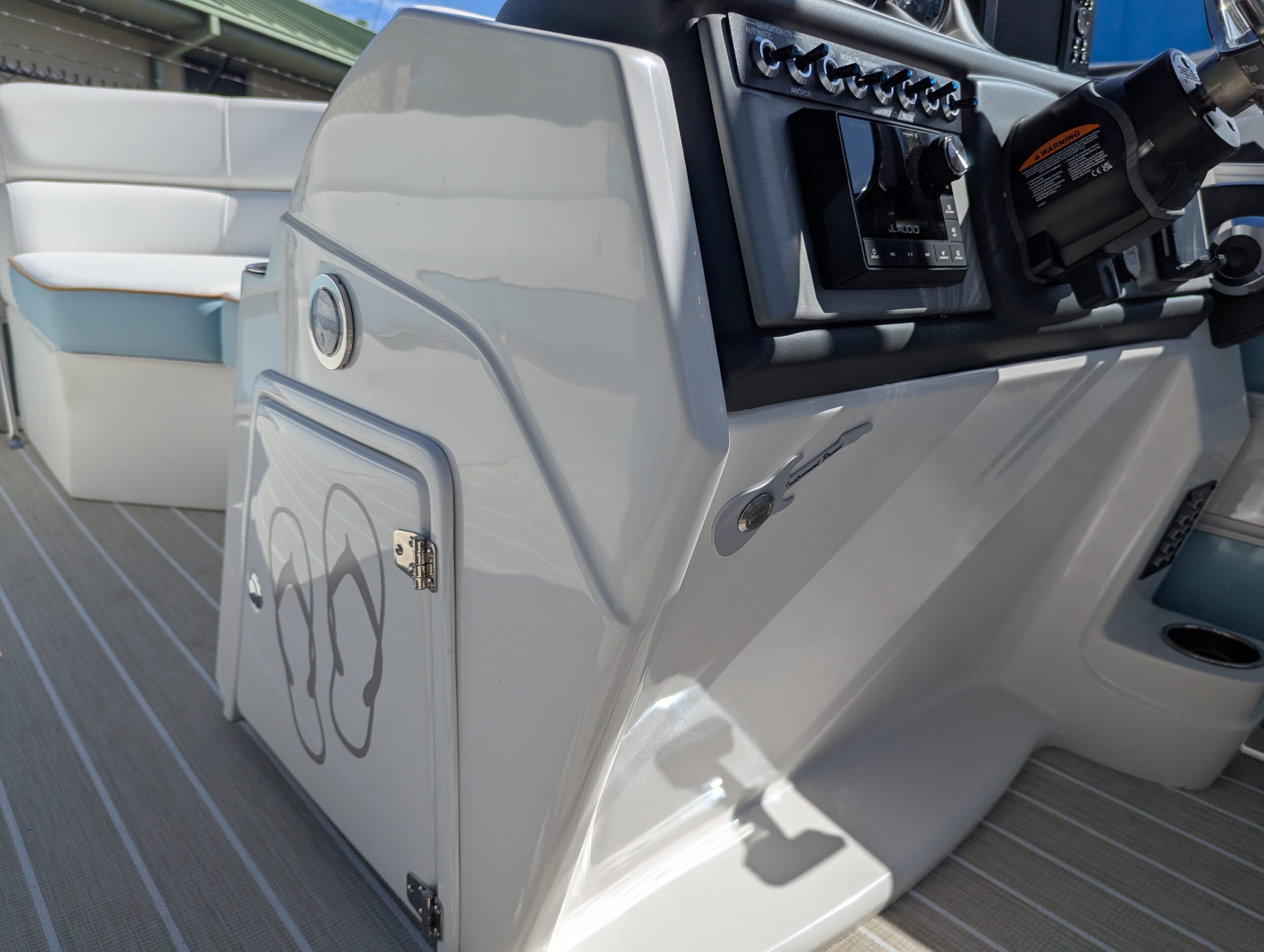OPTIONS: Saltwater Package, Panel 1: Coral, Panel 2: Coral, Furniture Base : Salt Coral, 25" Shaft Transom, Beach Wood Teak, Power Electric Bimini Top, Standard Mooring Cover Deep Sea Blue, Power Assist Steering Pump, Fiberglass Helm, Lowrance Hook 5 Display, Folding Table, Dual Battery Switch & Charger, SS Pop Up Cleats (Qty 4),Safety Net, Ski Tow Bar, SS WHEEL W/KNOB.
