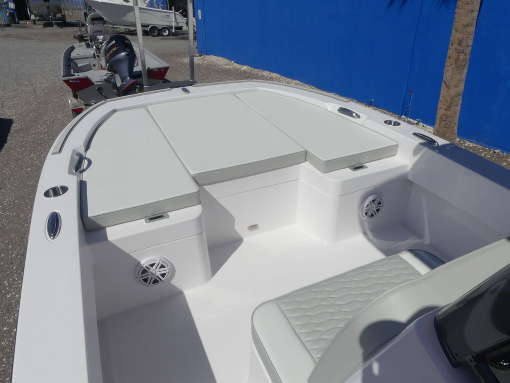 Amenities: A 60-quart cooler is integrated into the forward console seat, while a freshwater washdown system and a telescopic swim ladder make post-swim cleanup a breeze.