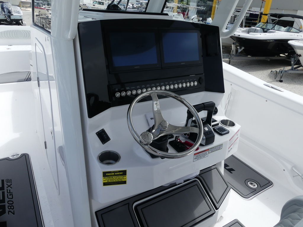For anglers, the 280 GFX does not disappoint: ample in-deck insulated fish boxes, live-wells, rod-holders, tackle center options and a wide-open cockpit for working the rails.
