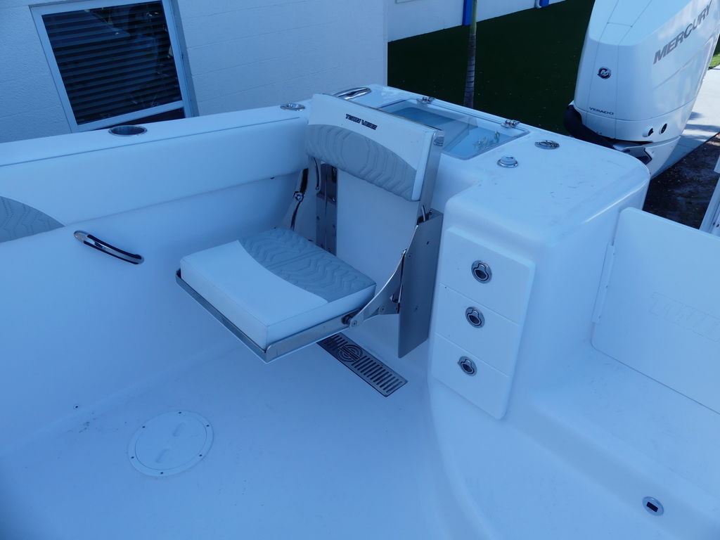 - Premium helm seating w/ arm rests upholstered with marine grade material