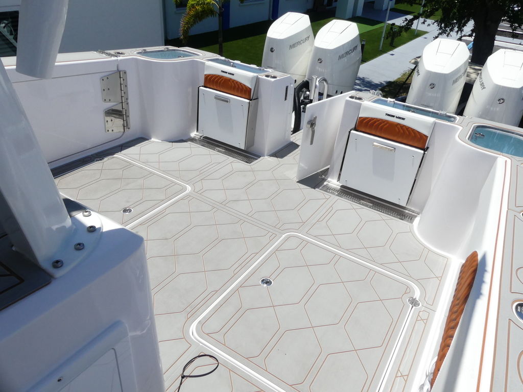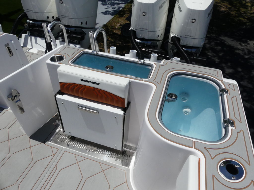 Storage? No shortage: 2,500 quarts of insulated storage, including twin 475-quart coffin boxes and twin 700-quart in-floor fish boxes with macerators.