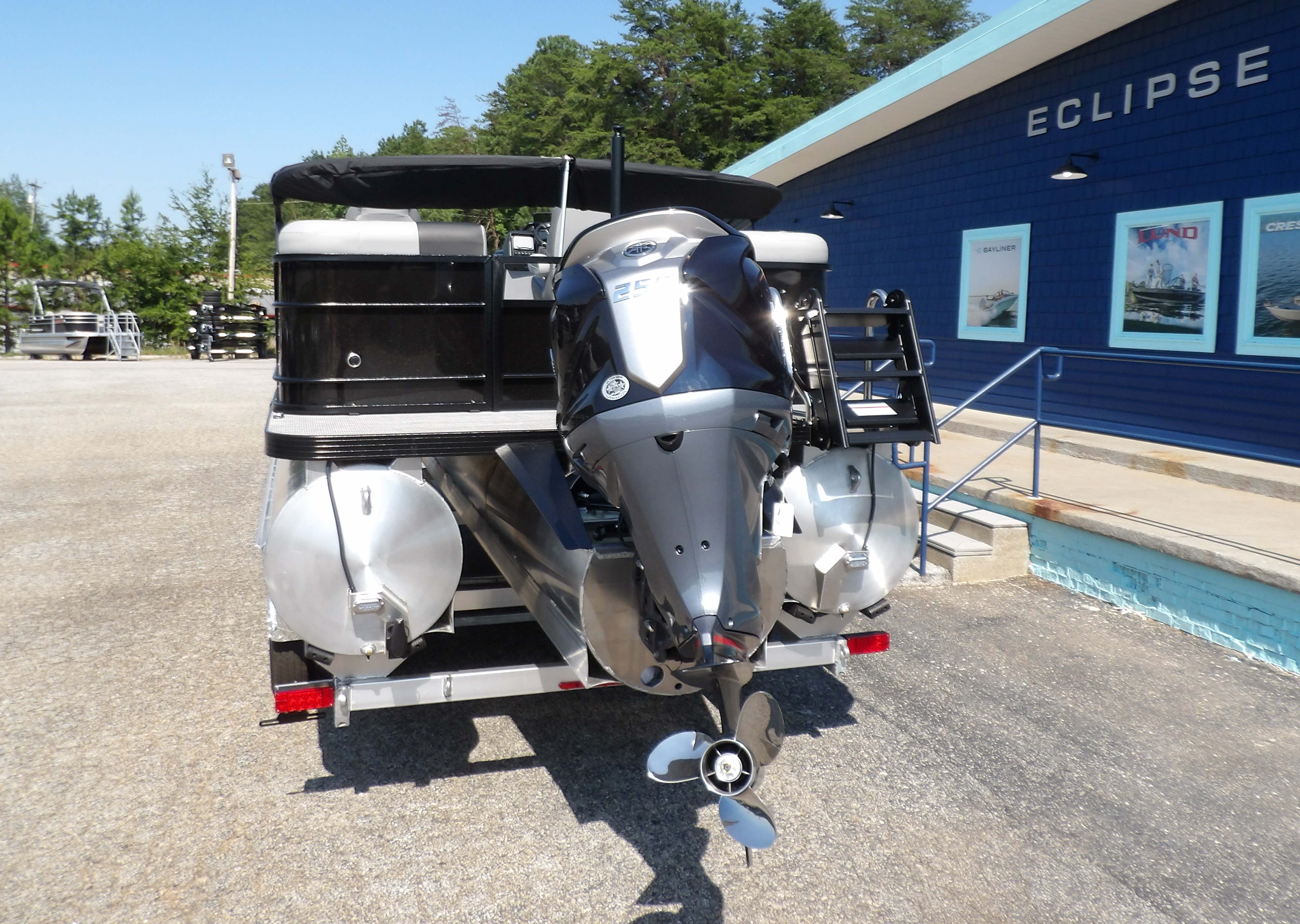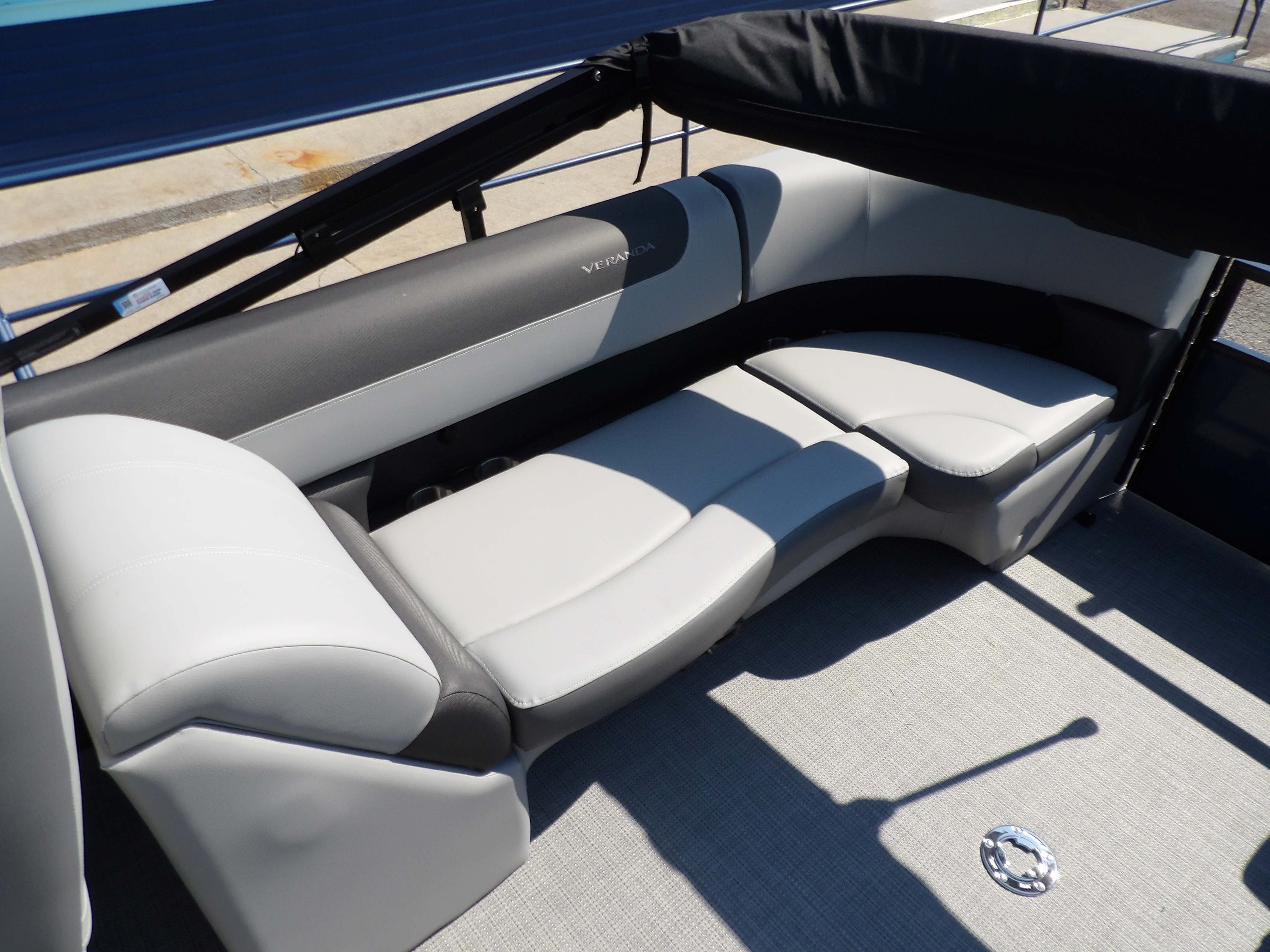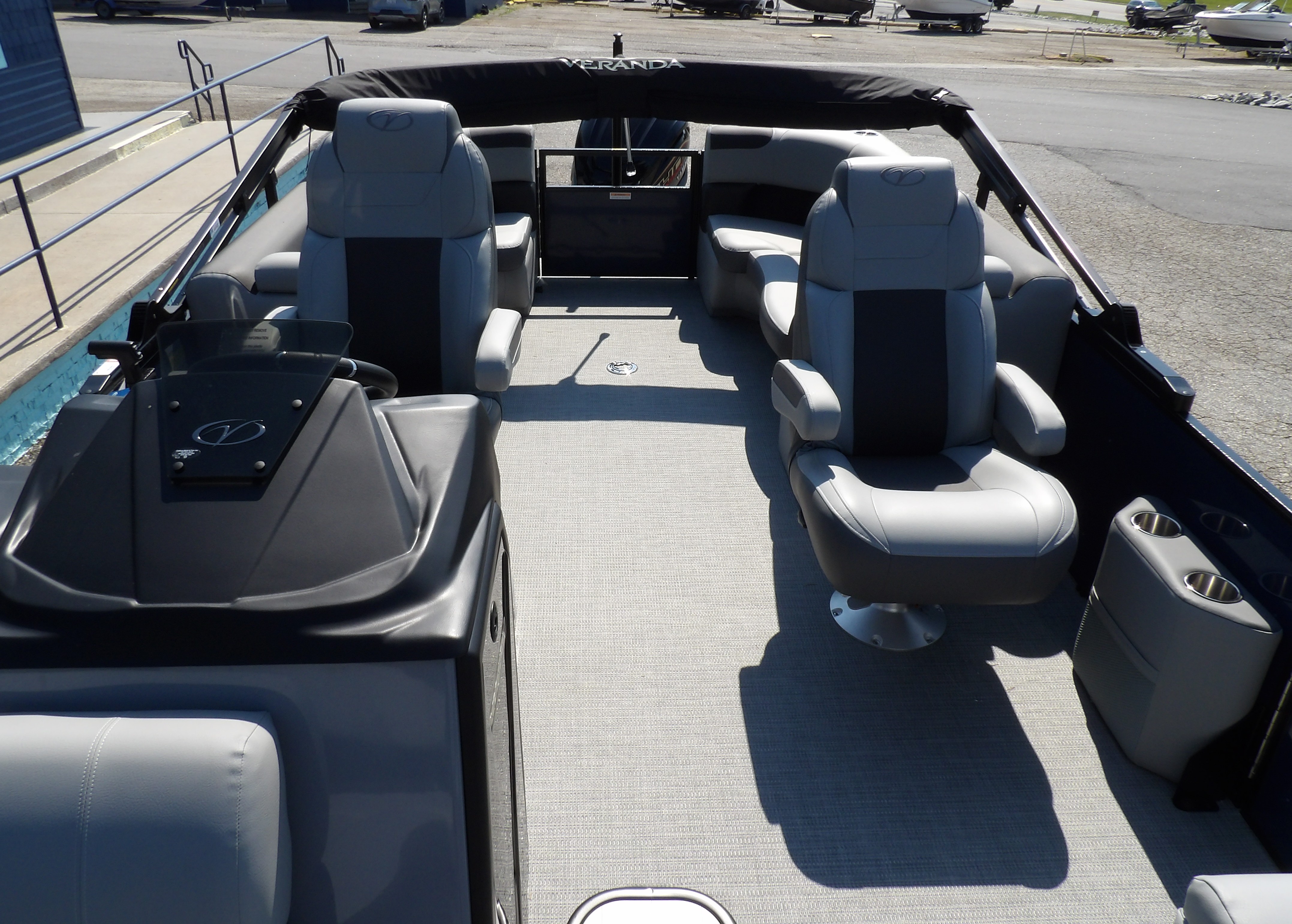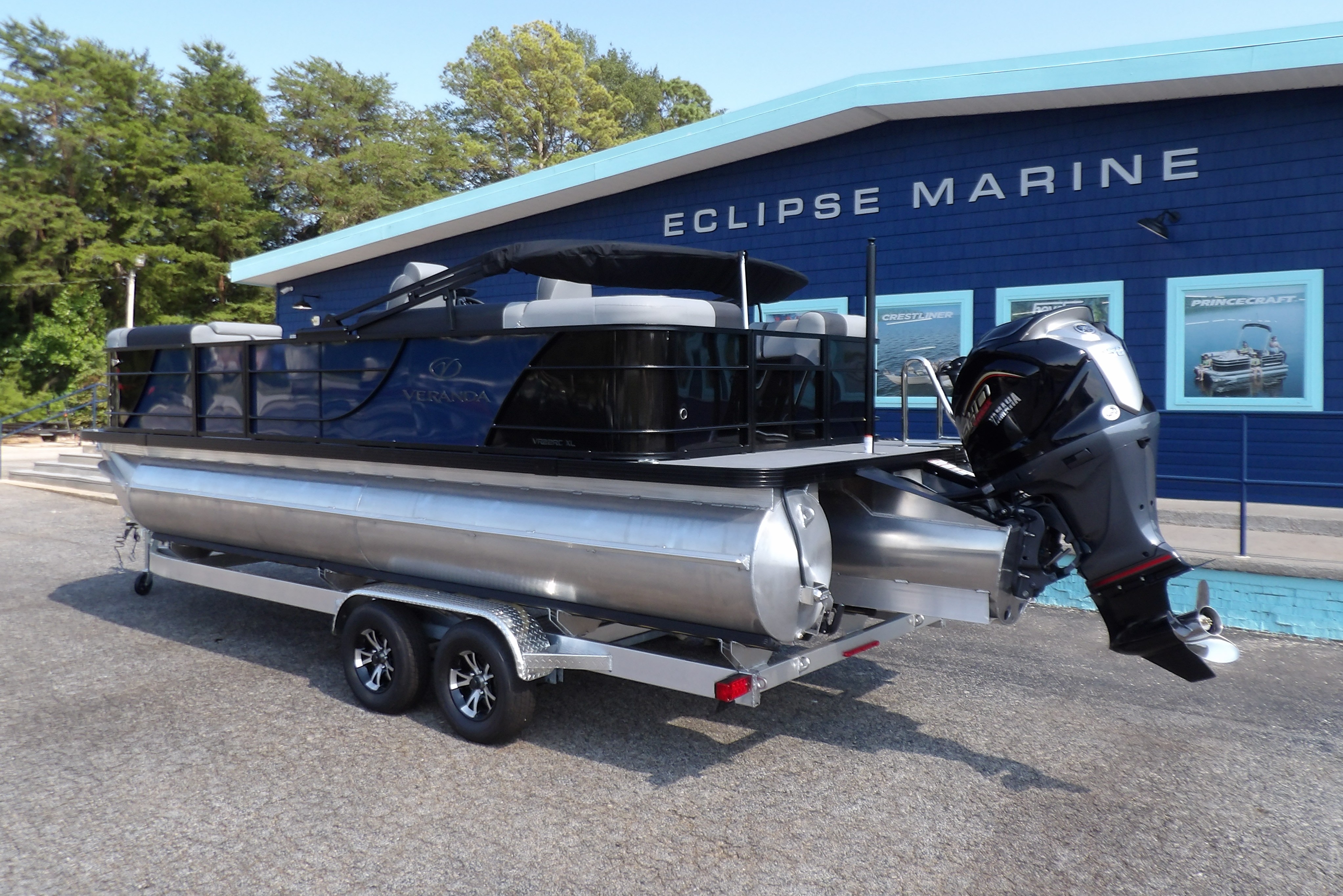 This new 2026 Veranda VR22RC Relax series boat in beautiful Black & Indigo Blue 2-Tone was updated & upgraded for the 2025 model year. This boat received new interior and exterior touches and a new helm just to name a few. This Veranda VR22RC comes with all the standard features of the Relax series plus these added options: big power from a 250 HP Yamaha SHO Four Stroke outboard, the XL package which includes larger 27" toons, a power bimini, two-tone paint option, in-floor storage, console shift panel with fire extinguisher & cell phone holders, adjustable pedestals and digital gauges. This also has the woven floor upgrade, side keels & easy step ladder. This well optioned Veranda is looks just as good cruising pulling tubers & skiers as it does simply parked in your favorite cove enjoying the South Carolina summer. This Tritoon can be delivered to your dock on the water or we have a selection of trailers available for purchase. For more details, the latest in pricing and incentives give us a call at Eclipse Marine Seneca (864) 653-6767 or stop in and see us at 305 US Hwy 123 bypass Seneca, SC. Deck Length: 289 in. (7300 mm)