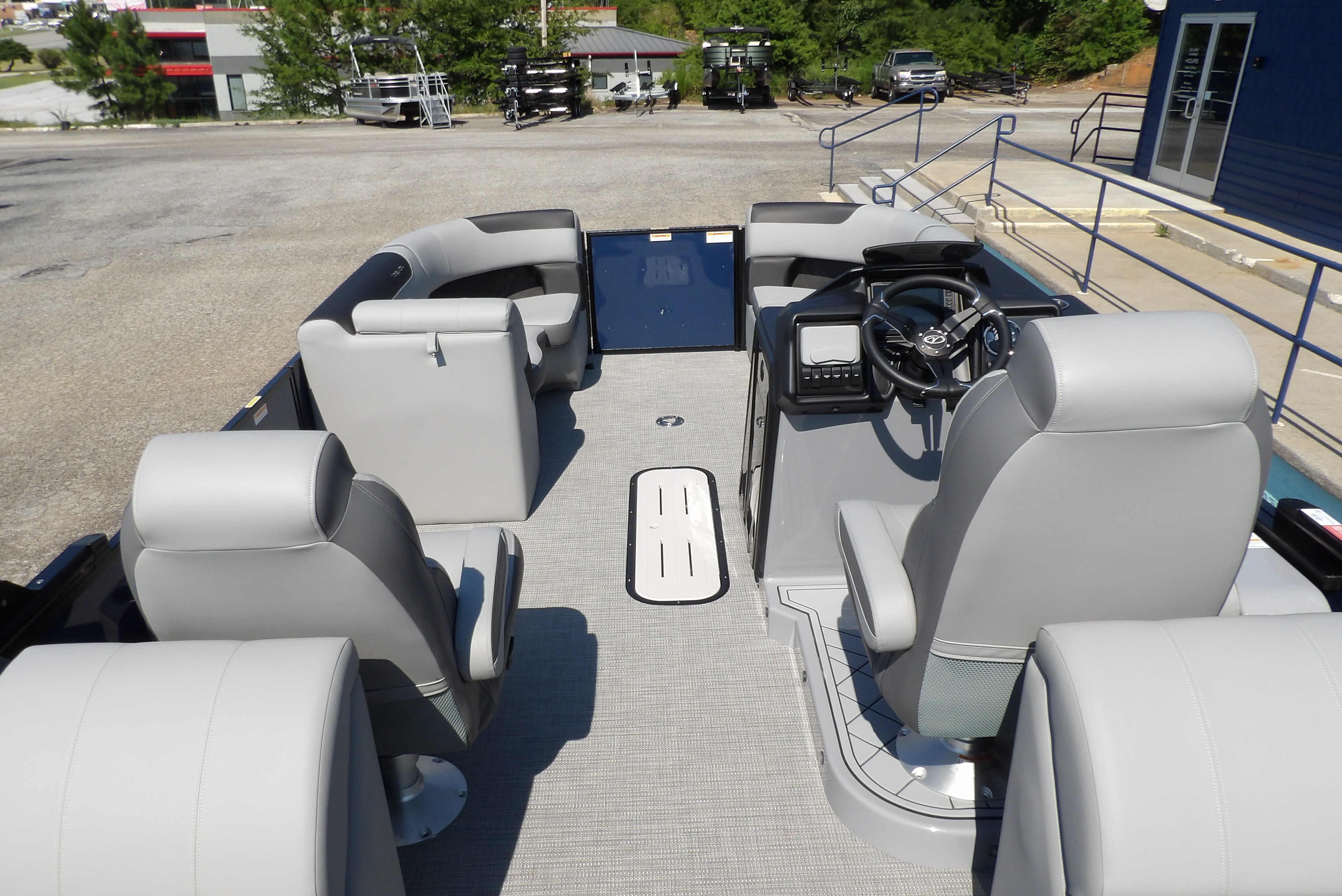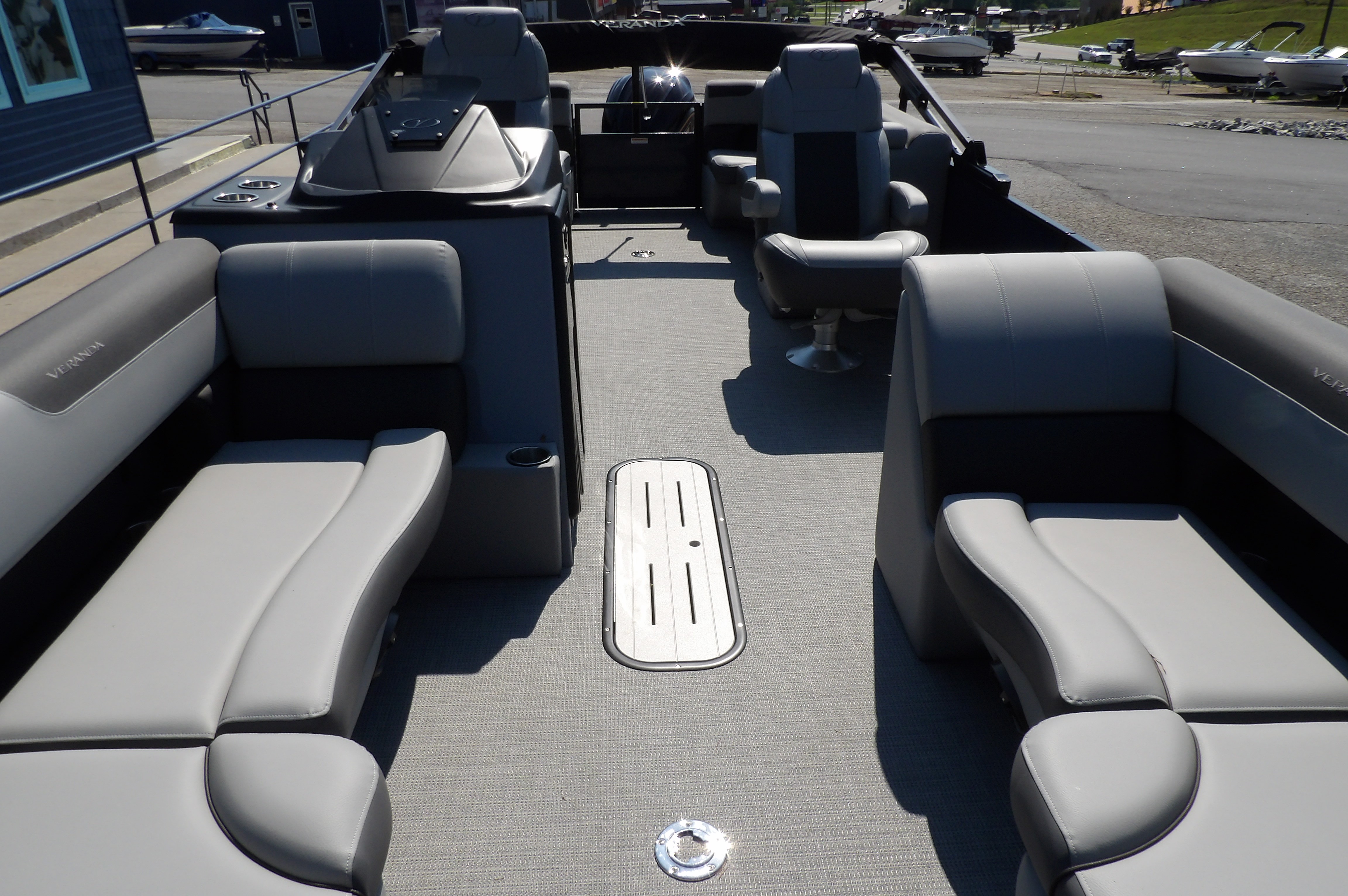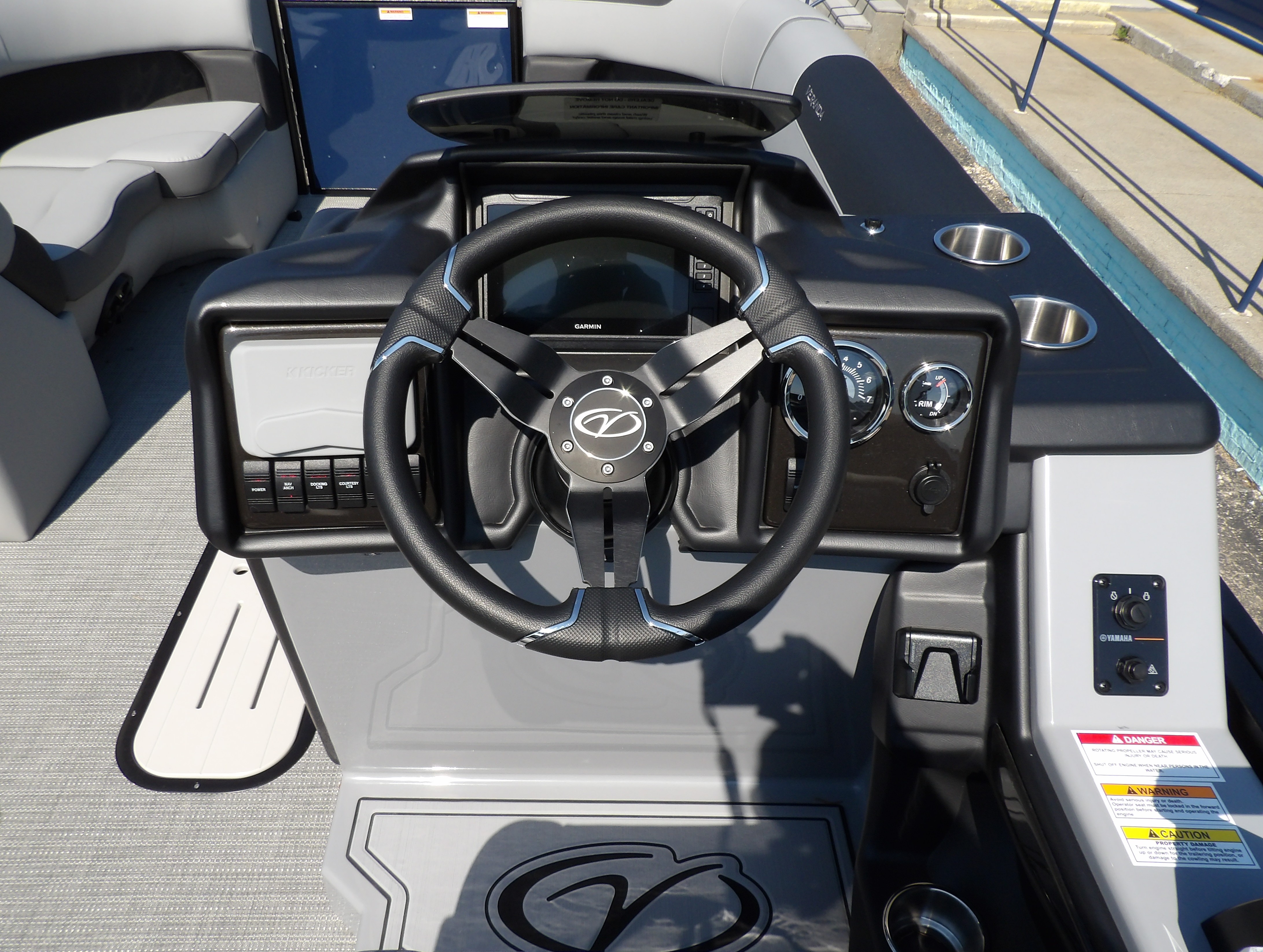This new 2026 Veranda VR22RC Relax series boat in beautiful Black & Indigo Blue 2-Tone was updated & upgraded for the 2025 model year. This boat received new interior and exterior touches and a new helm just to name a few. This Veranda VR22RC comes with all the standard features of the Relax series plus these added options: big power from a 250 HP Yamaha SHO Four Stroke outboard, the XL package which includes larger 27" toons, a power bimini, two-tone paint option, in-floor storage, console shift panel with fire extinguisher & cell phone holders, adjustable pedestals and digital gauges. This also has the woven floor upgrade, side keels & easy step ladder. This well optioned Veranda is looks just as good cruising pulling tubers & skiers as it does simply parked in your favorite cove enjoying the South Carolina summer. This Tritoon can be delivered to your dock on the water or we have a selection of trailers available for purchase. For more details, the latest in pricing and incentives give us a call at Eclipse Marine Seneca (864) 653-6767 or stop in and see us at 305 US Hwy 123 bypass Seneca, SC. Deck Length: 289 in. (7300 mm)