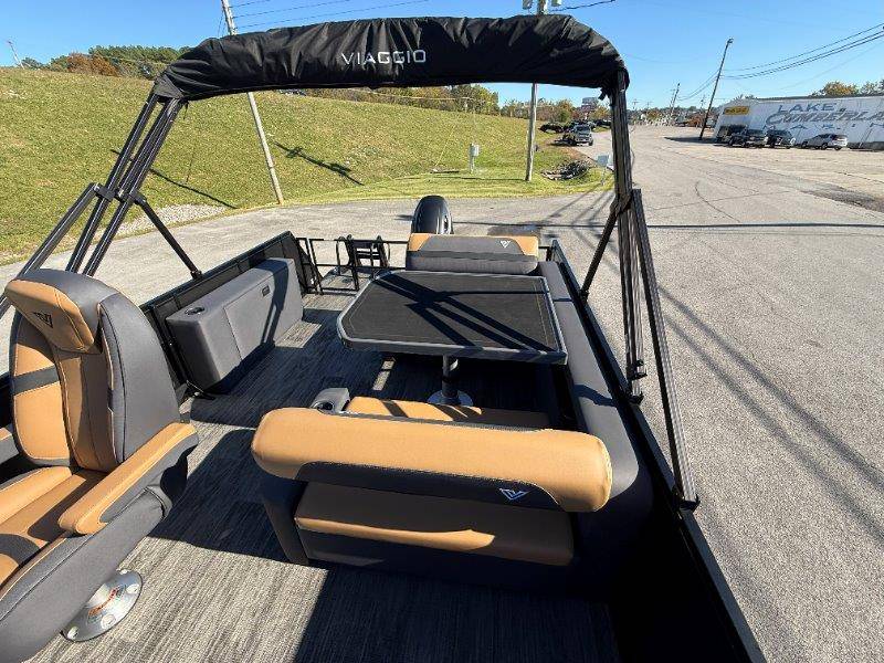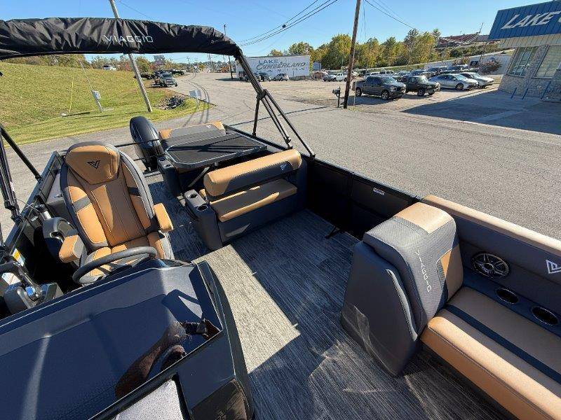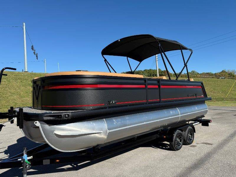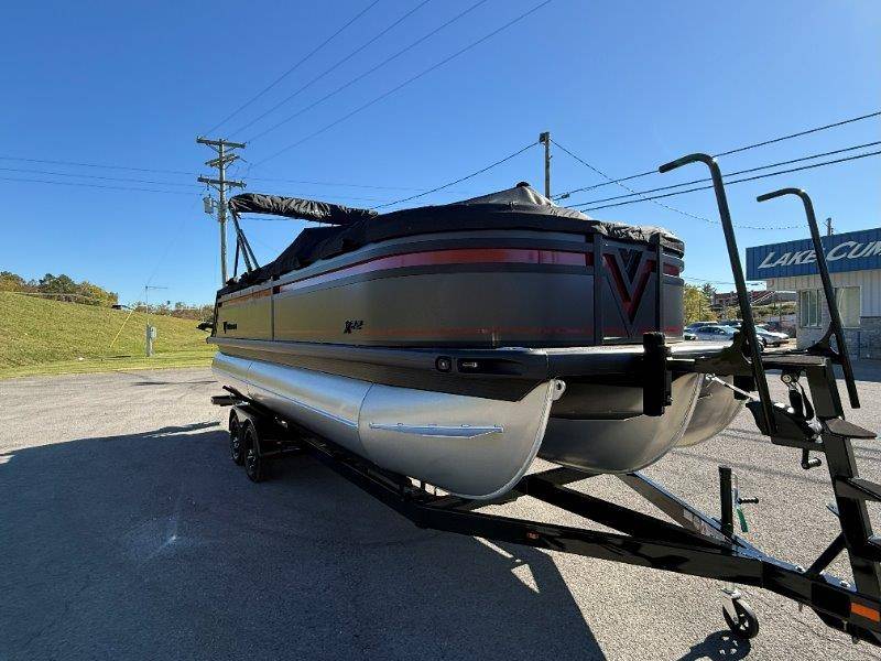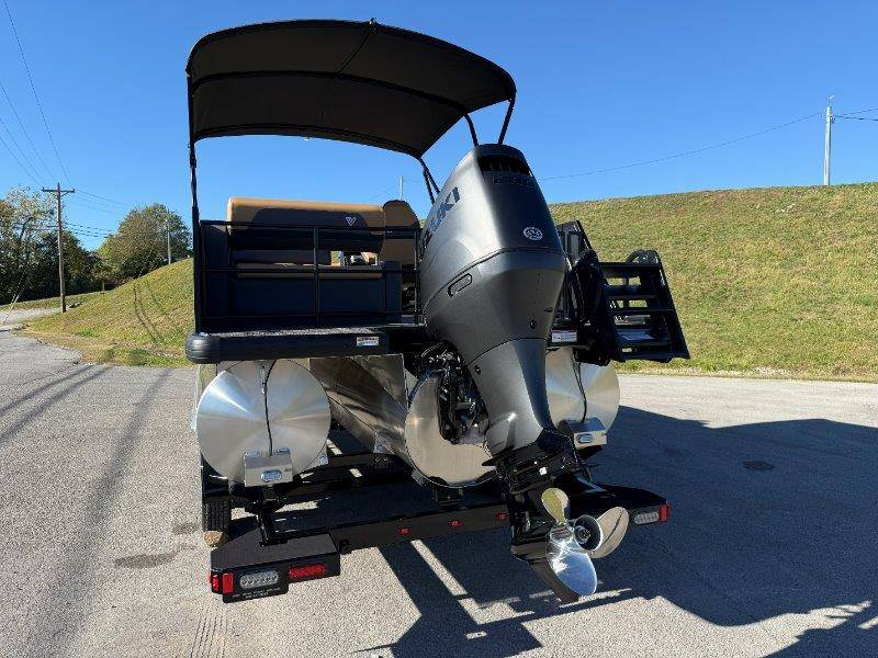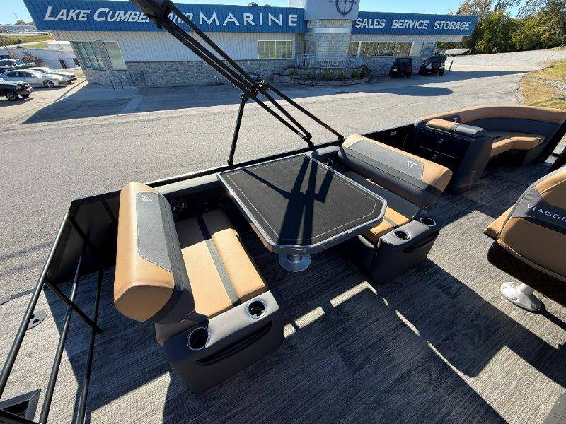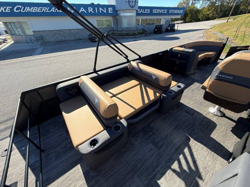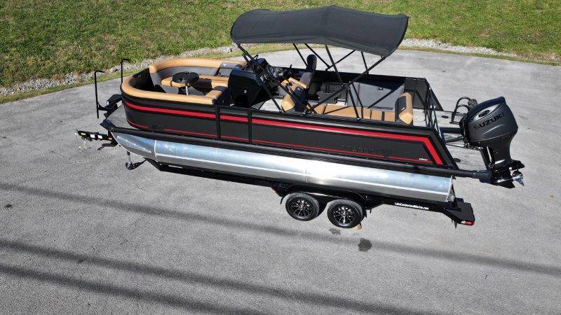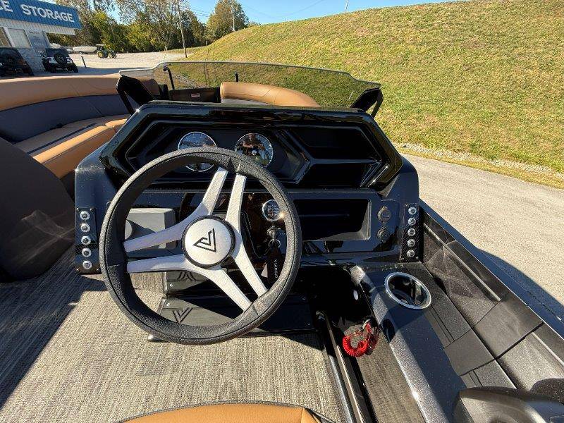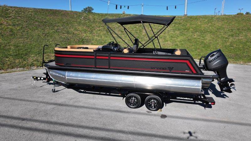 2026 Viaggio Lago X22D Standard Features 2' Extended Swim Deck Fuel Tank Size: Bi-Toon = 26 gal | Tripletoon = 58 gal 0.100 Gauge Metal on Tubes Integrated Corner Cap Navigation Lights w/Stainless Steel Cleats Stainless Steel Retractable Ladder 2" Extrusion Rail Design Black Anodized Rails Blackout Decals or Black w/Chrome Decals Fiberglass Helm 5" Viaggio Multifunctional Gauges | GPS Speed, Tach, Fuel, Trim, & LED Display Dash w/Backlit Push Button Switches Glass Windscreen Gussi Italia Molino Steering Wheel Master Power Switch Clarion Audio System 6.5" 50W Speakers x4 Black Round Table Kit w/Removable Table Post Integrated Cupholders w/Dual Port USB Chargers & Lumbar Speakers Premium Black Canvas Crib Cover w/In-Rail Clip System Vented Pole Holders & Extendable Aluminum Poles RGB Exterior Light Package · Table Holder · Three Drawer Chaise Storage · ACR Battery Management System · Suzuki Pre-Rig · 22' Tripletoon (27") Performance Pkg - Seastar. Sealed Strakes, PF Shield · Tube Protectant · Pontoon Side Keel (Port & Starboard) · Flooring, Lakeport Plank Shadow 18' - 22' · Integrated LED Docking Lights w/Stainless Flip-Up Cleats · Black Fencing · Carerra Red Metallic Stripe · Wireless Charging in Helm · Seastar Power Assist Steering (Recommended for 200HP+) · Engine Hang & Rig w/Prop (SS) · RGB Interior Light Package · Cognac Night w/Black Painted Helm · Lillipad Stern Boarding Ladder w/ Ghost Mounts