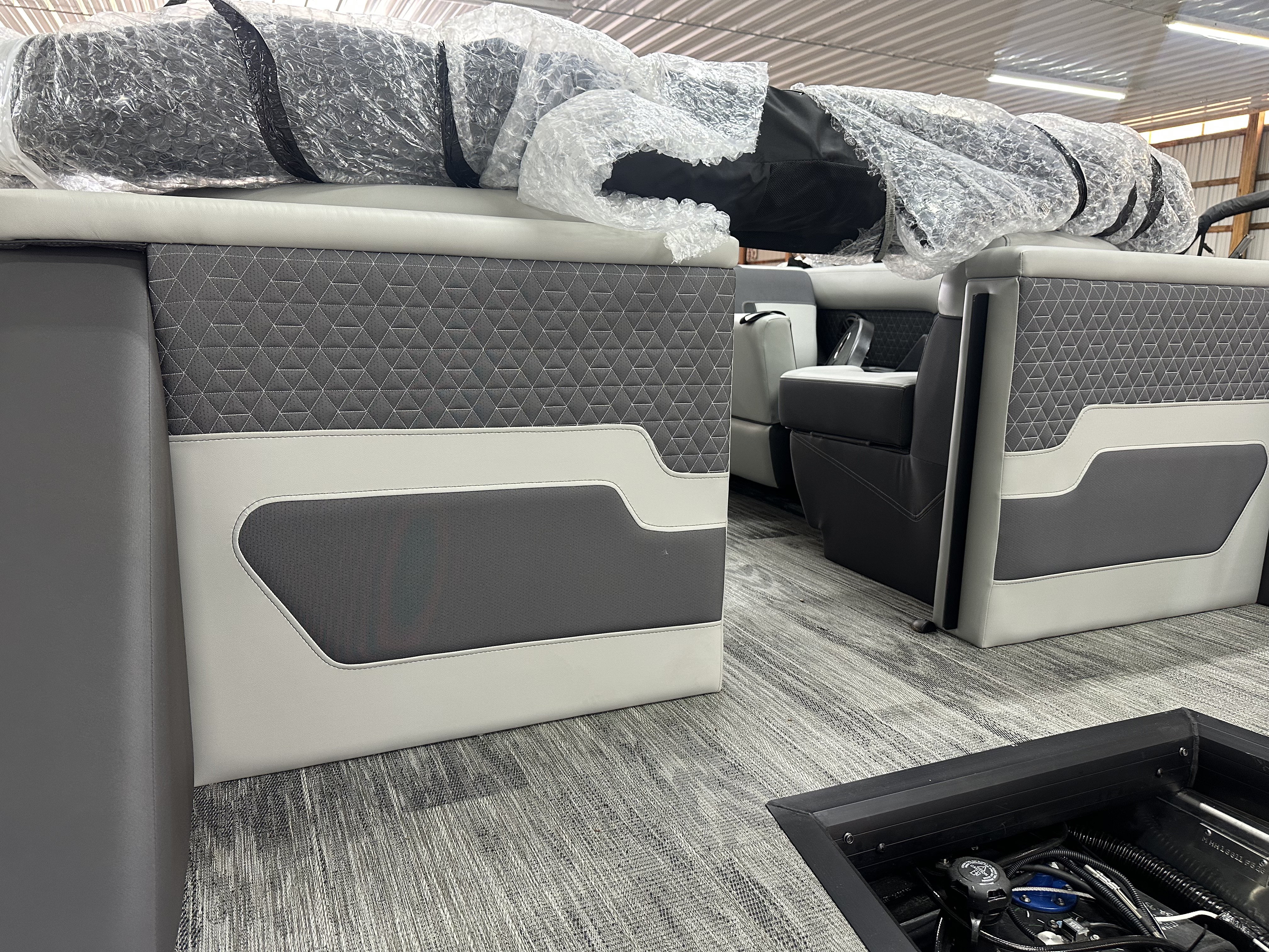 Upgrades include: Tube Protectant, Pontoon Side Keel (Port & Starboard), Honda Pre-Rig, Digital Display Add On - Honda , 22' Tripletoon (25") Performance Pkg - Seastar Sealed Strakes PF Shield , Center Toon In-Floor Storage, Flooring Lakeport Plank Flint 18' - 22', Silver Fencing , Silver Metallic Stripe, Wireless Charging in Helm, Seastar Hydraulic Steering, Leon Greyson (Grey) Night, Seat Slider - Captain or Mate Chairs , Upgrade AFT Pods, Lillipad Stern Boarding Ladder