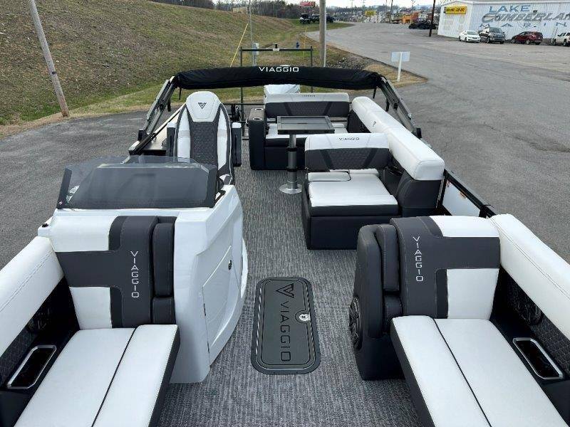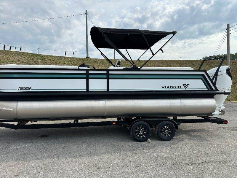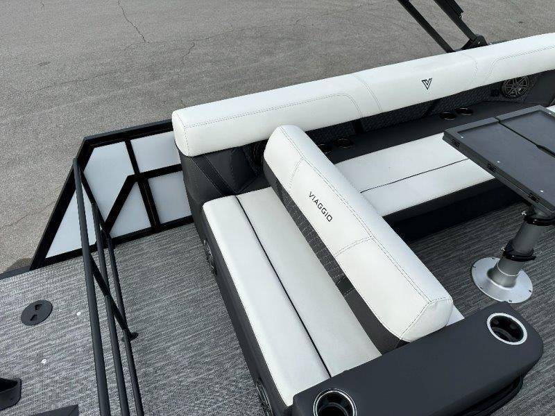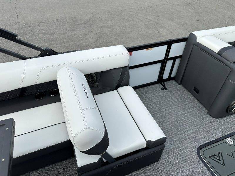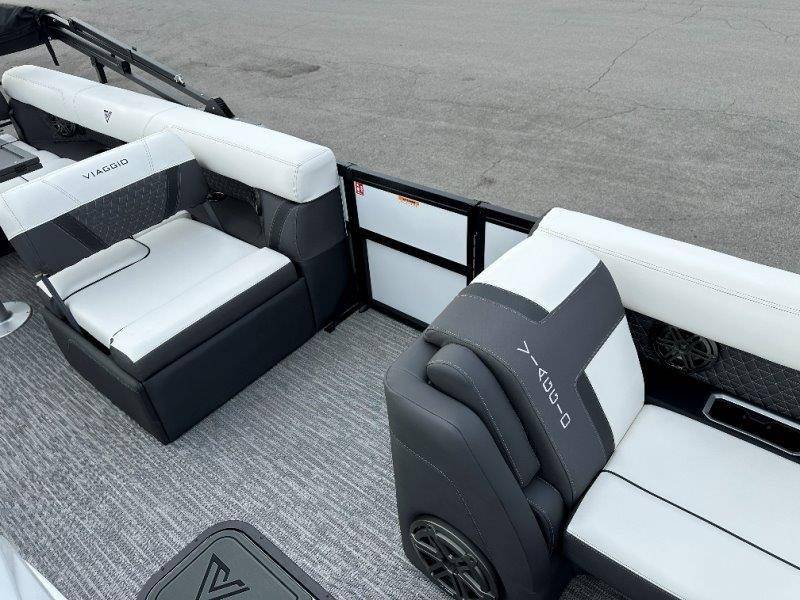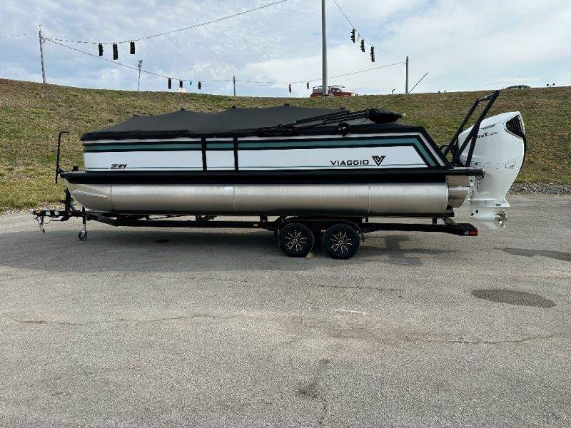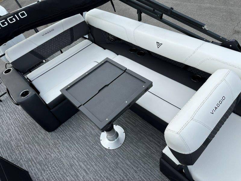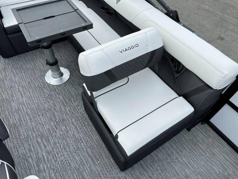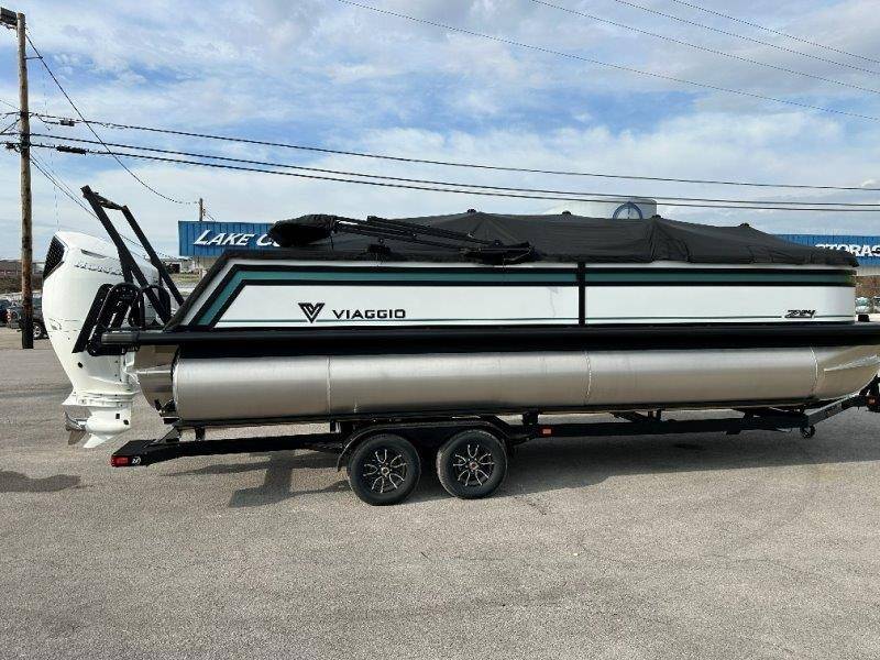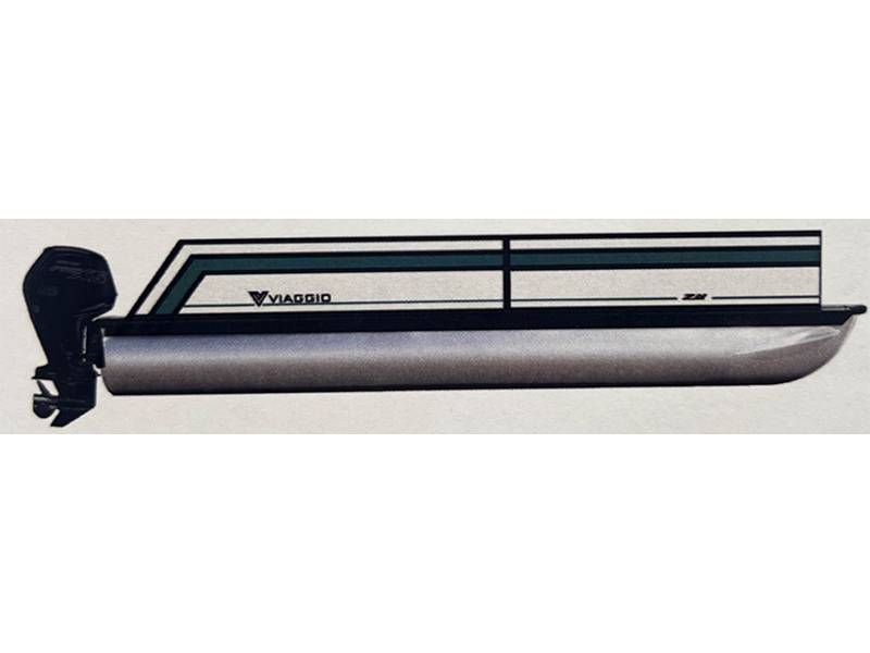 2026 Viaggio Lago Z24B Standard Features OPTIONS 2' Extended Swim Deck Fuel Tank Size: Bi-Toon = 26 gal | Tripletoon = 58 gal 0.100 Gauge Metal on Tubes Integrated Corner Cap Navigation & Docking Lights w/Stainless Pull-Up Cleats 5 Step REVO Lillipad Ladder Ghost Mounts Pre-Drilled 2" Extrusion Rail Design Black Anodized Rails Vision Gate | Bow Only Blackout Graphics or Black w/Chrome Graphics Fiberglass Helm 3" Raised Helm Platform w/Snap Removable Slip Resistant Lago Z Foam Mat 5" Viaggio Digital Gauges|GPS Speed, Tach, Fuel, Trim, & LED Display Custom Molded Dash Panel w/Backlit Resettable Push Buttons Glass Windscreen Imperiale Steering Wheel Simrad NSX7 Flush-Mount Digital Display Master Power Switch JL Audio System w/HTML User Interface & Volume Control Knob 6.5" M3 60W Speakers x4 200W 2-Channel Amplifier w/M3 10" Subwoofer LED Interior Lights Including Cup Holders, Speakers, Tables & Seat Bases, Raised Helm EGIS ACR Battery Management System Armrest Built Into All Chaise Lounges Custom Vinyl Wrapped AFT Design w/Wings Premium Black Canvas Crib Cover w/In-Rail Clip System | Vented Pole Holders & Extendable Aluminum Poles · Black Graphics · Castle Anthracite Flooring (Grey) 22' - 24' · Brite White Grey Night w/White Painted Helm · RGB Interior Light Package · Lillipad Stern Boarding Ladder w/ Ghost Mounts · Lillipad Ghost Mounts x3 (Pre-Installed) · Xtreme Ski Tow Bar (Black) - 51" · Engine Hang & Rig w/Prop (SS) - 350hp+ · Honda iST Digital & Adapter (115-350HP) · 24' Tripletoon (27") Performance Pkg - Seastar. Sealed Strakes, PF Shield · Center Toon In-Floor Storage · White Fencing · Aruba Metallic Stripe · Power Bimini w/Speed Struts · Wireless Charging in Helm · Seastar Power Assist Steering (Recommended for 200HP+) · RGB Exterior Light Package · M3 AFT Speakers