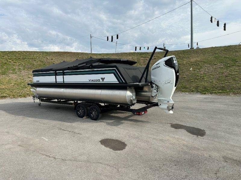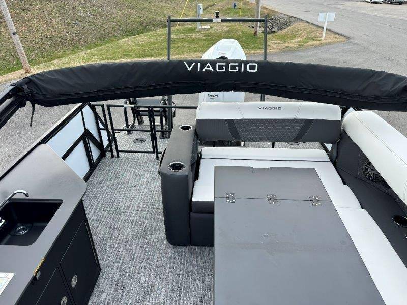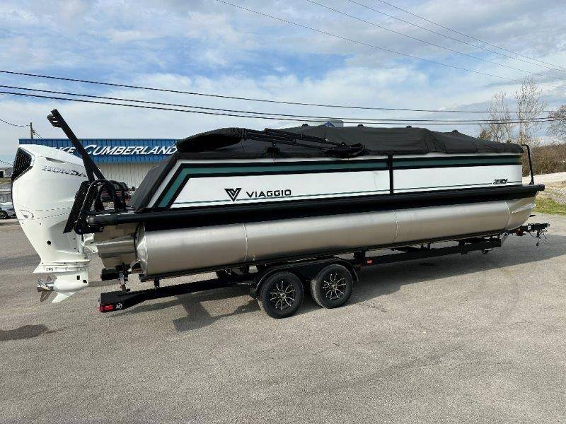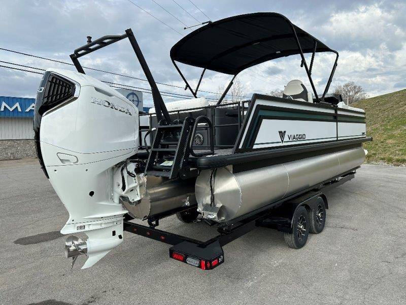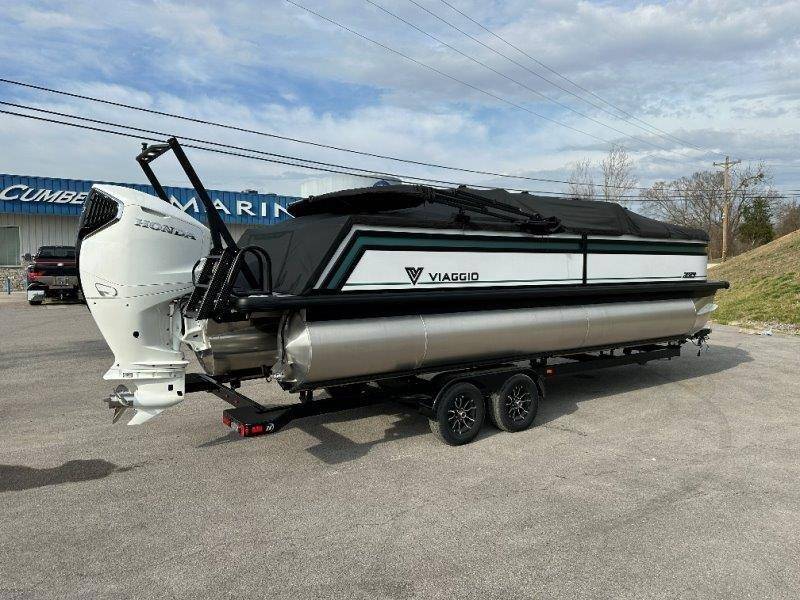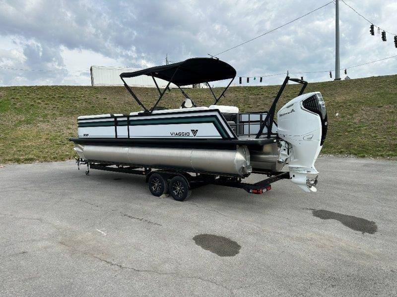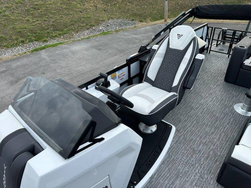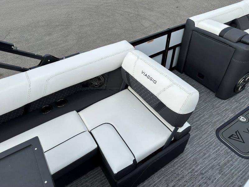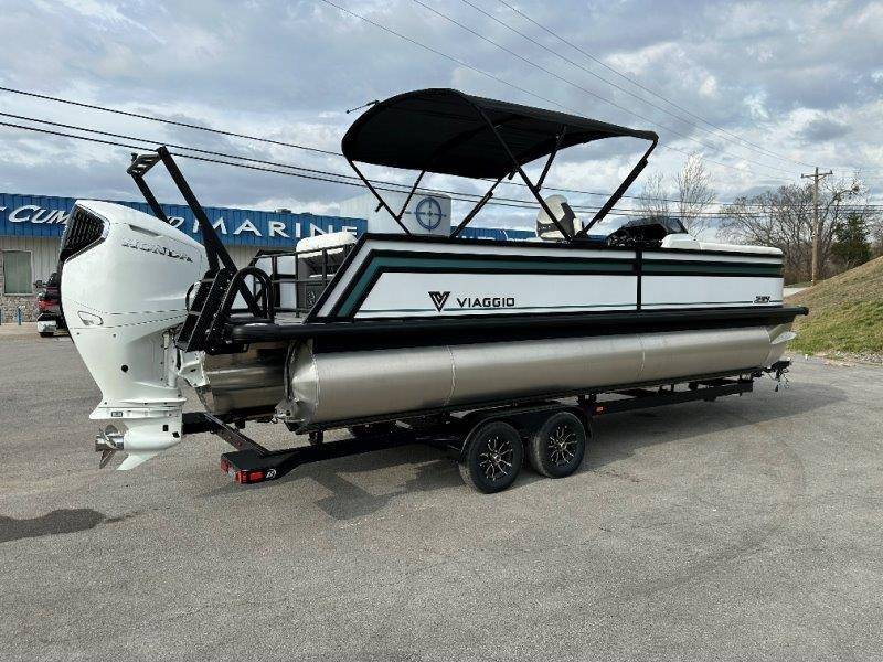 2026 Viaggio Lago Z24B Standard Features OPTIONS 2' Extended Swim Deck Fuel Tank Size: Bi-Toon = 26 gal | Tripletoon = 58 gal 0.100 Gauge Metal on Tubes Integrated Corner Cap Navigation & Docking Lights w/Stainless Pull-Up Cleats 5 Step REVO Lillipad Ladder Ghost Mounts Pre-Drilled 2" Extrusion Rail Design Black Anodized Rails Vision Gate | Bow Only Blackout Graphics or Black w/Chrome Graphics Fiberglass Helm 3" Raised Helm Platform w/Snap Removable Slip Resistant Lago Z Foam Mat 5" Viaggio Digital Gauges|GPS Speed, Tach, Fuel, Trim, & LED Display Custom Molded Dash Panel w/Backlit Resettable Push Buttons Glass Windscreen Imperiale Steering Wheel Simrad NSX7 Flush-Mount Digital Display Master Power Switch JL Audio System w/HTML User Interface & Volume Control Knob 6.5" M3 60W Speakers x4 200W 2-Channel Amplifier w/M3 10" Subwoofer LED Interior Lights Including Cup Holders, Speakers, Tables & Seat Bases, Raised Helm EGIS ACR Battery Management System Armrest Built Into All Chaise Lounges Custom Vinyl Wrapped AFT Design w/Wings Premium Black Canvas Crib Cover w/In-Rail Clip System | Vented Pole Holders & Extendable Aluminum Poles · Black Graphics · Castle Anthracite Flooring (Grey) 22' - 24' · Brite White Grey Night w/White Painted Helm · RGB Interior Light Package · Lillipad Stern Boarding Ladder w/ Ghost Mounts · Lillipad Ghost Mounts x3 (Pre-Installed) · Xtreme Ski Tow Bar (Black) - 51" · Engine Hang & Rig w/Prop (SS) - 350hp+ · Honda iST Digital & Adapter (115-350HP) · 24' Tripletoon (27") Performance Pkg - Seastar. Sealed Strakes, PF Shield · Center Toon In-Floor Storage · White Fencing · Aruba Metallic Stripe · Power Bimini w/Speed Struts · Wireless Charging in Helm · Seastar Power Assist Steering (Recommended for 200HP+) · RGB Exterior Light Package · M3 AFT Speakers