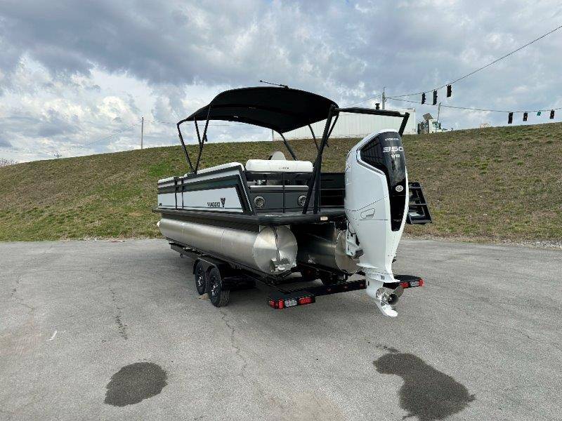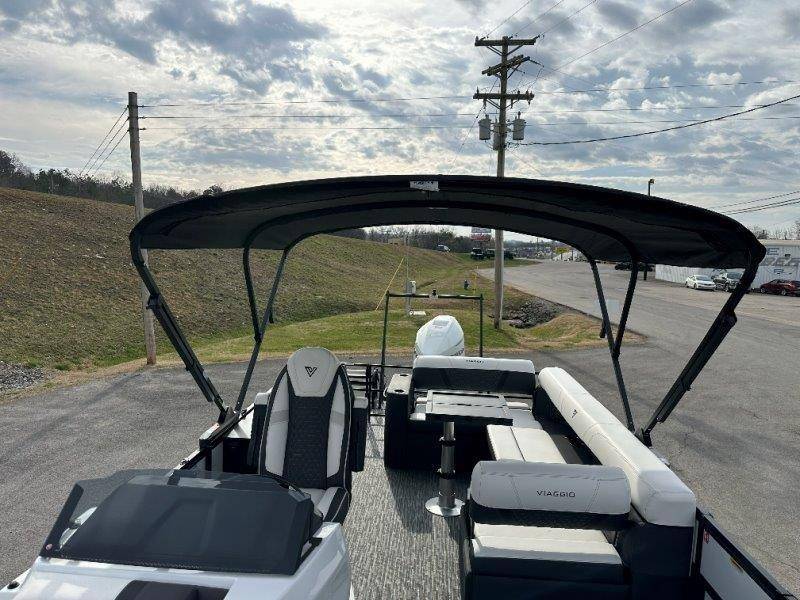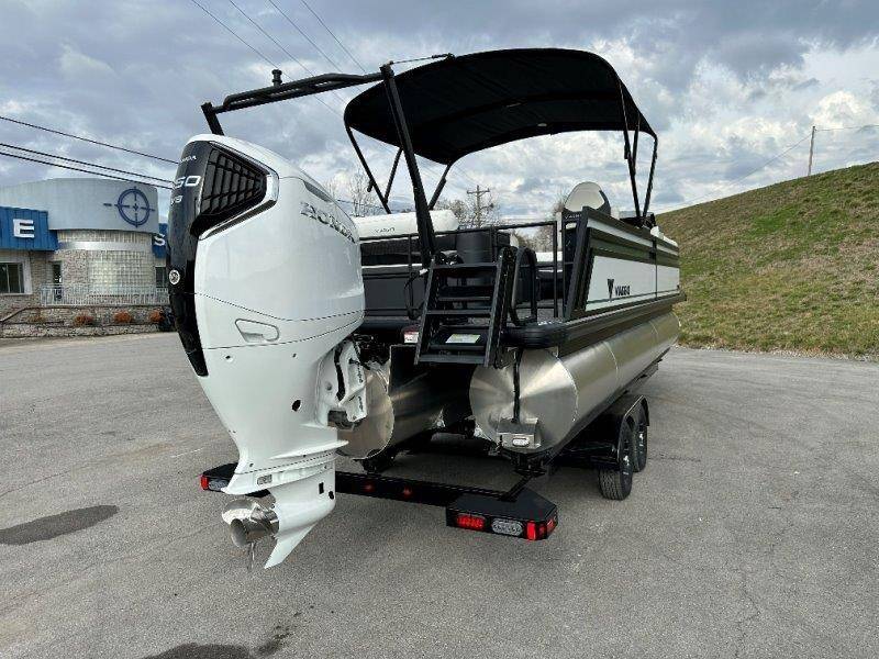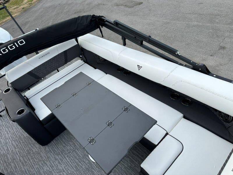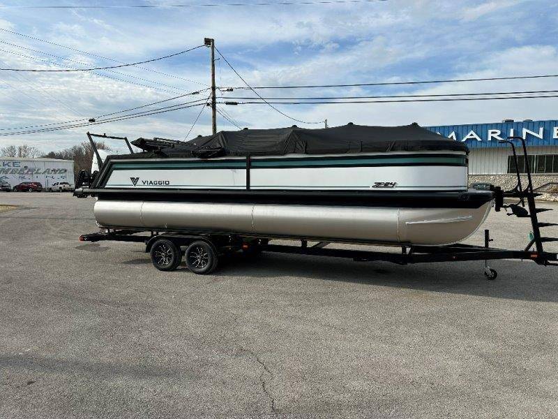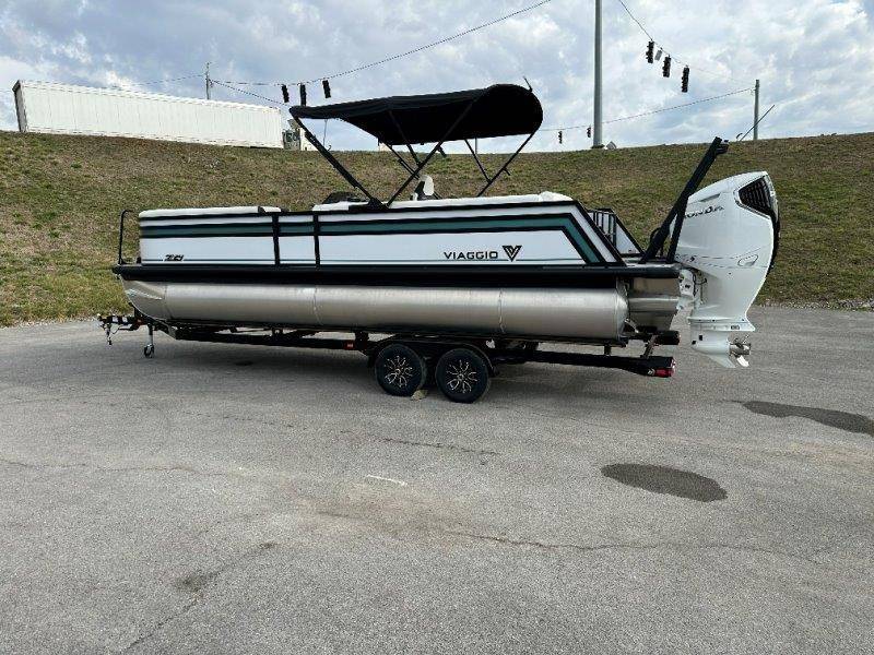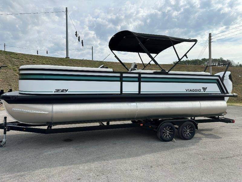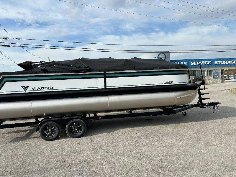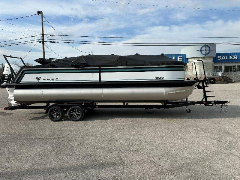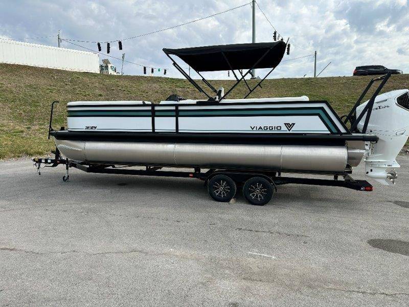 2026 Viaggio Lago Z24B Standard Features OPTIONS 2' Extended Swim Deck Fuel Tank Size: Bi-Toon = 26 gal | Tripletoon = 58 gal 0.100 Gauge Metal on Tubes Integrated Corner Cap Navigation & Docking Lights w/Stainless Pull-Up Cleats 5 Step REVO Lillipad Ladder Ghost Mounts Pre-Drilled 2" Extrusion Rail Design Black Anodized Rails Vision Gate | Bow Only Blackout Graphics or Black w/Chrome Graphics Fiberglass Helm 3" Raised Helm Platform w/Snap Removable Slip Resistant Lago Z Foam Mat 5" Viaggio Digital Gauges|GPS Speed, Tach, Fuel, Trim, & LED Display Custom Molded Dash Panel w/Backlit Resettable Push Buttons Glass Windscreen Imperiale Steering Wheel Simrad NSX7 Flush-Mount Digital Display Master Power Switch JL Audio System w/HTML User Interface & Volume Control Knob 6.5" M3 60W Speakers x4 200W 2-Channel Amplifier w/M3 10" Subwoofer LED Interior Lights Including Cup Holders, Speakers, Tables & Seat Bases, Raised Helm EGIS ACR Battery Management System Armrest Built Into All Chaise Lounges Custom Vinyl Wrapped AFT Design w/Wings Premium Black Canvas Crib Cover w/In-Rail Clip System | Vented Pole Holders & Extendable Aluminum Poles · Black Graphics · Castle Anthracite Flooring (Grey) 22' - 24' · Brite White Grey Night w/White Painted Helm · RGB Interior Light Package · Lillipad Stern Boarding Ladder w/ Ghost Mounts · Lillipad Ghost Mounts x3 (Pre-Installed) · Xtreme Ski Tow Bar (Black) - 51" · Engine Hang & Rig w/Prop (SS) - 350hp+ · Honda iST Digital & Adapter (115-350HP) · 24' Tripletoon (27") Performance Pkg - Seastar. Sealed Strakes, PF Shield · Center Toon In-Floor Storage · White Fencing · Aruba Metallic Stripe · Power Bimini w/Speed Struts · Wireless Charging in Helm · Seastar Power Assist Steering (Recommended for 200HP+) · RGB Exterior Light Package · M3 AFT Speakers