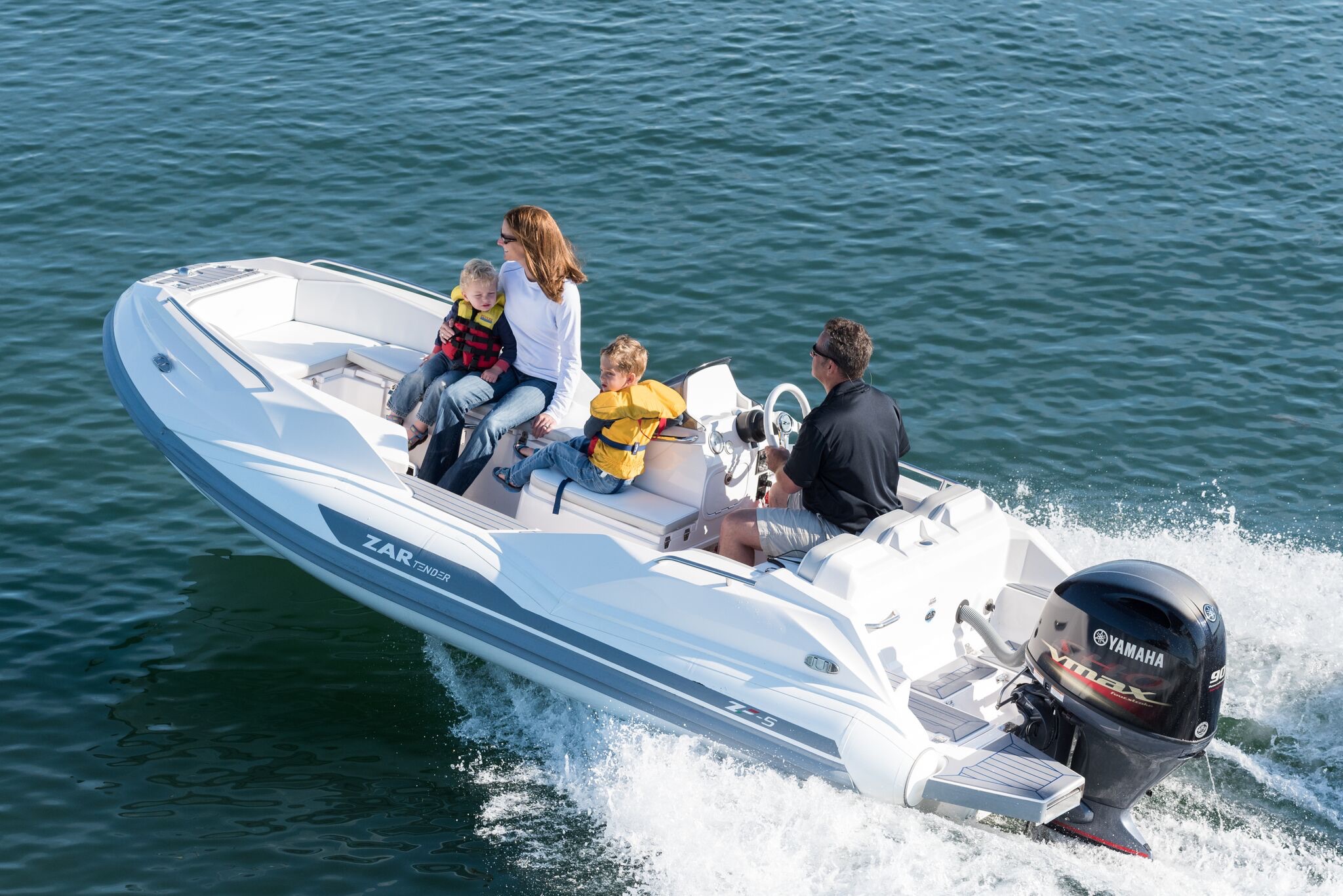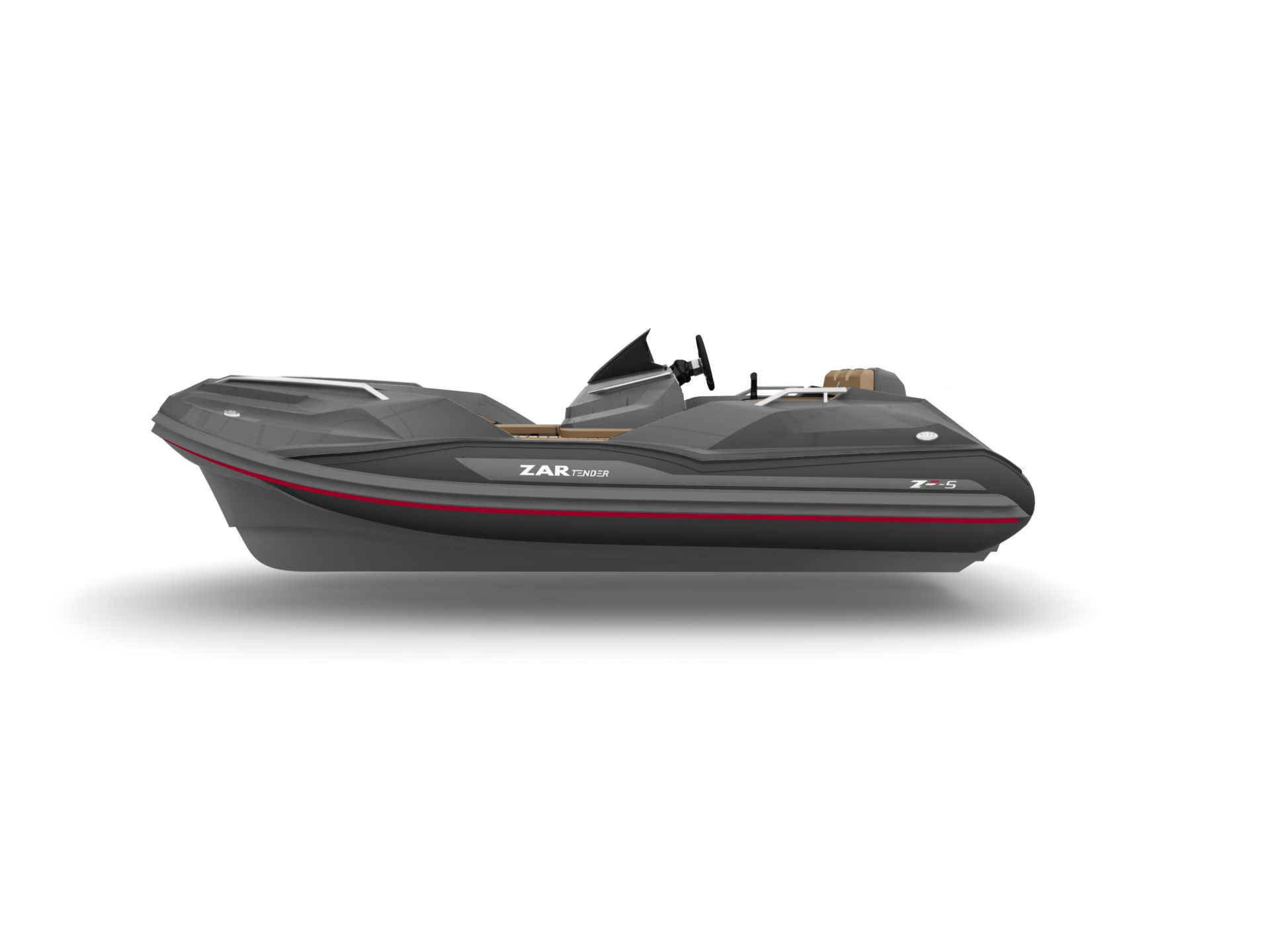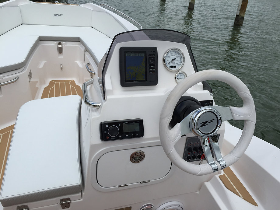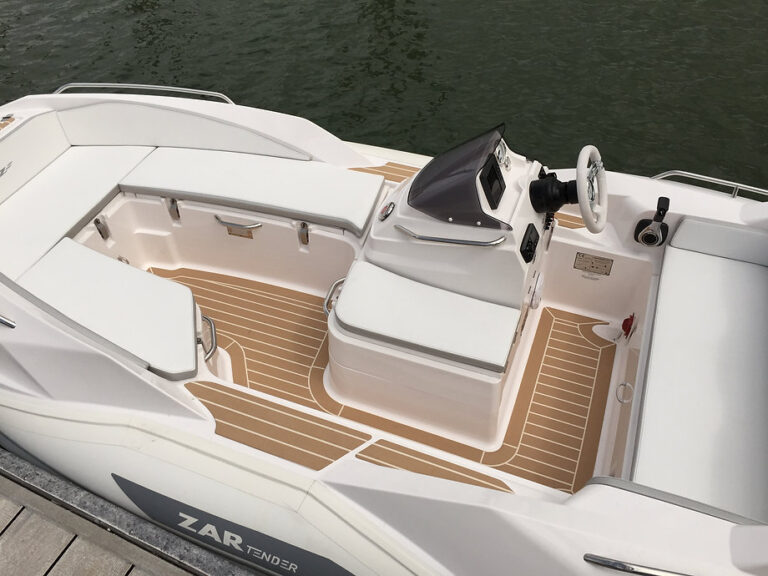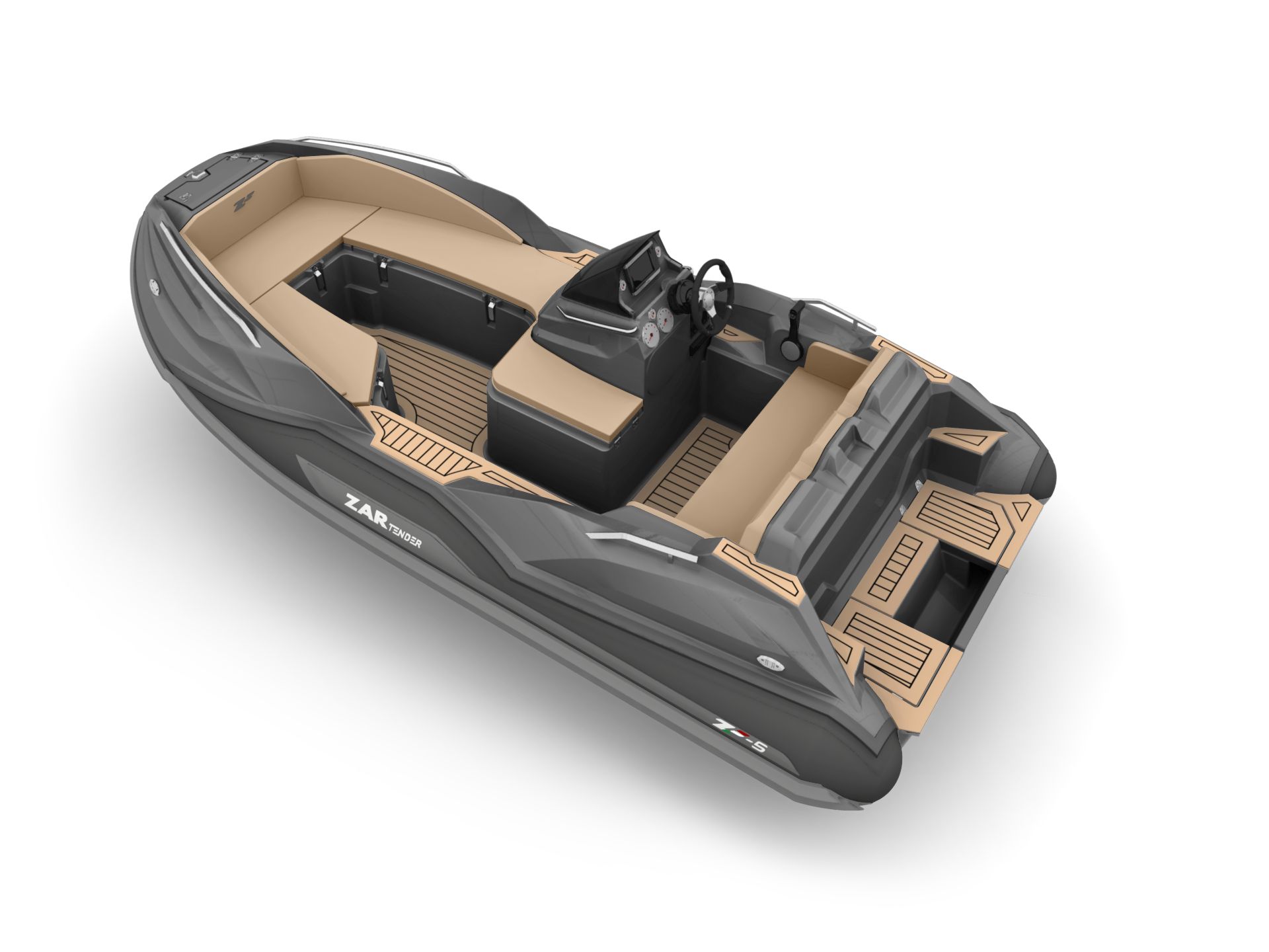 The ZAR ZF-5 Tender is revolutionizing what the traditional yacht tender is supposed to be. Pushing the boundaries in every way, this 15 foot tender seats 9 people in seats and gets on plane with 9 adults rigged with a 70hp motor. You must compare the ZAR ZF-5 with a comparable boat of at least 17 feet in length. Superior handling, superior ride quality, superior quality, superior in every way! The ZAR ZF-5 Tender has a open deck plan with a full walk through to the U-shaped seating in the bow. A true anchor locker and true swim platform with integrated swim ladder add to the luxury touches you have come to know from ZAR. The seating all has storage beneath giving the ZF-5 the absolute most storage of any comparable boat of the same size. The ride is the best part! With the ZAR hull, the ZF-5 is the best running, best performing, driest, most comfortable ride with more seating and double the storage of any competing boat of the same size.
